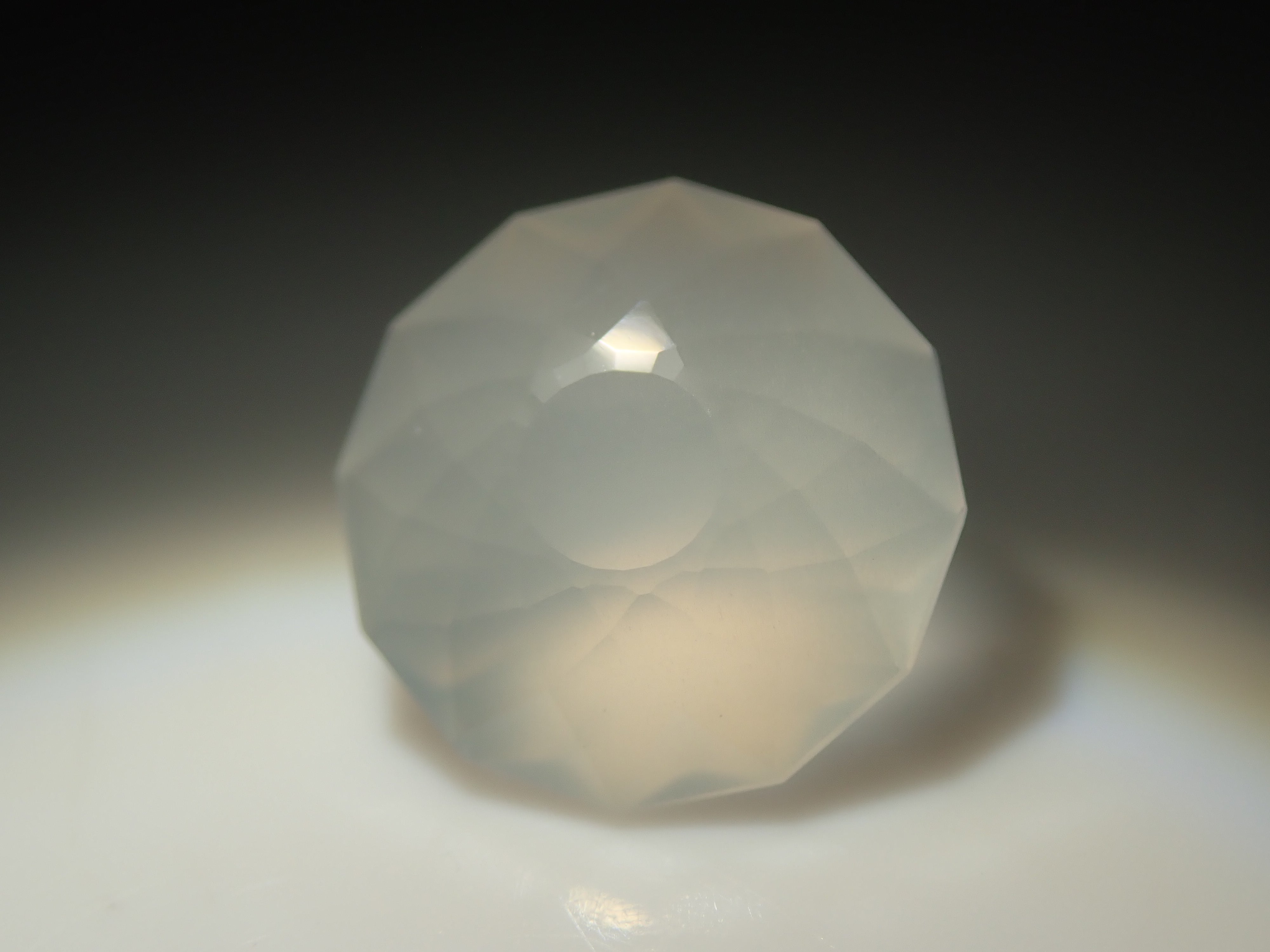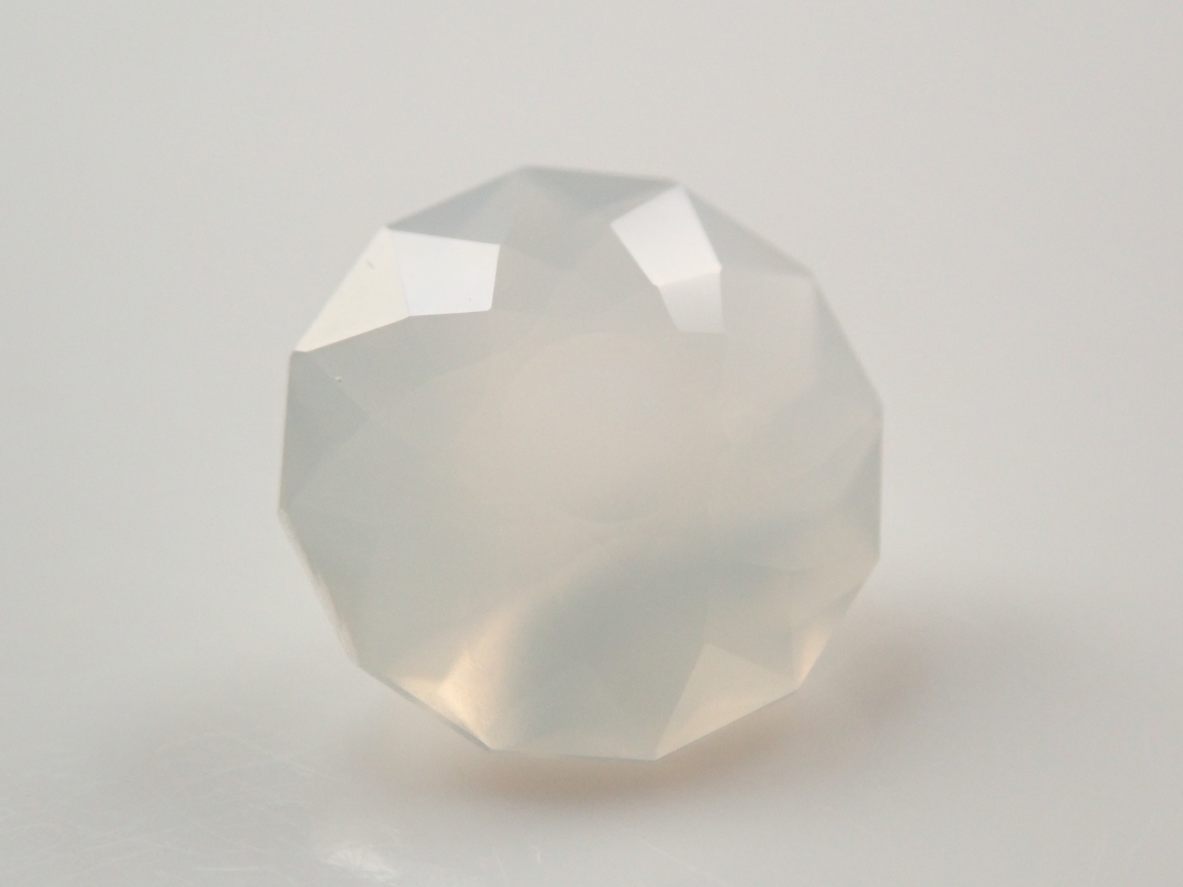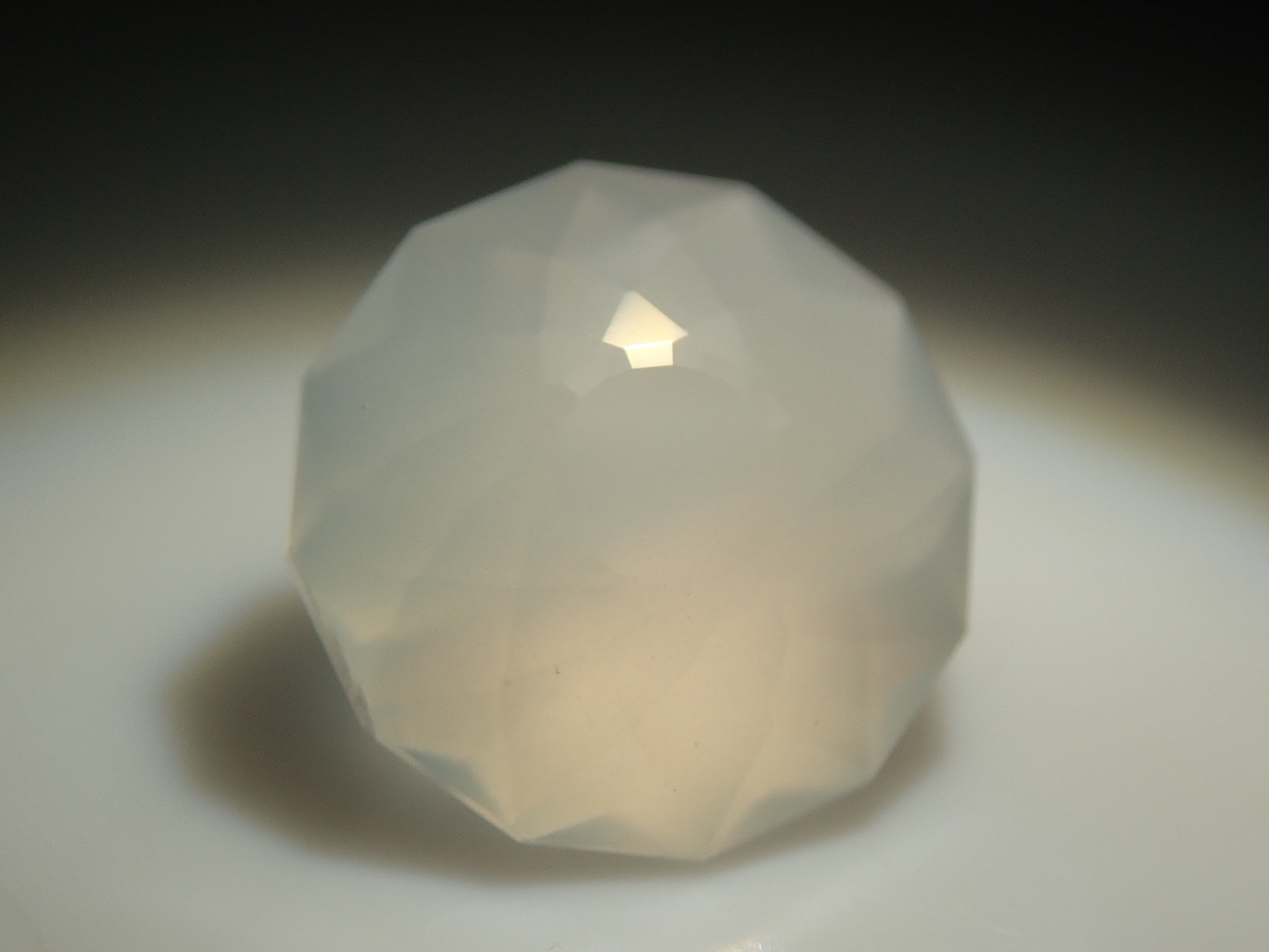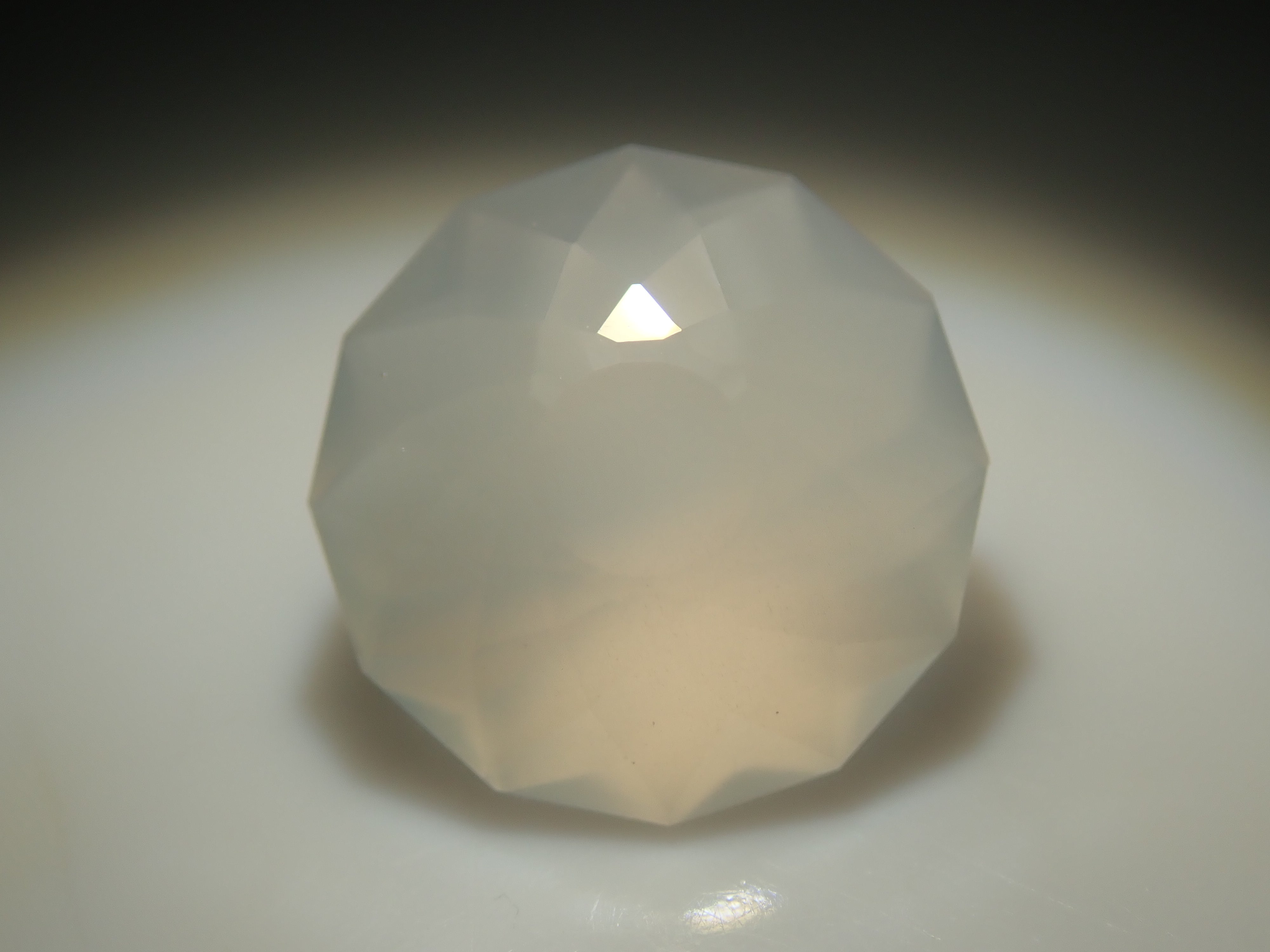 聚光燈照在月光石中央。這種明亮的光學效果,類似月光,是月光石的一大特徵。這張照片是用筆型電筒拍攝的。由斯里蘭卡拋光師桑傑(Sanjay)拋光。