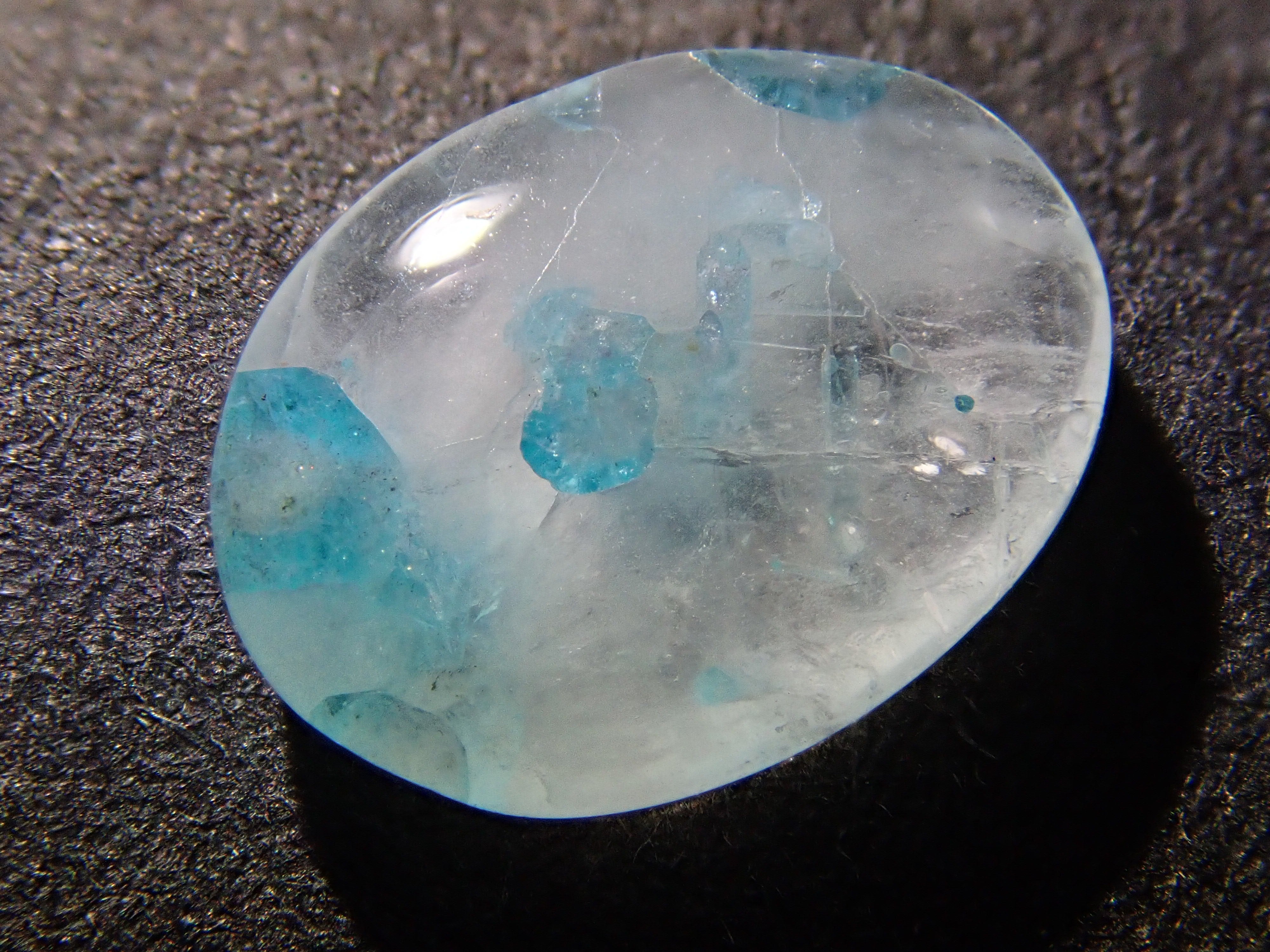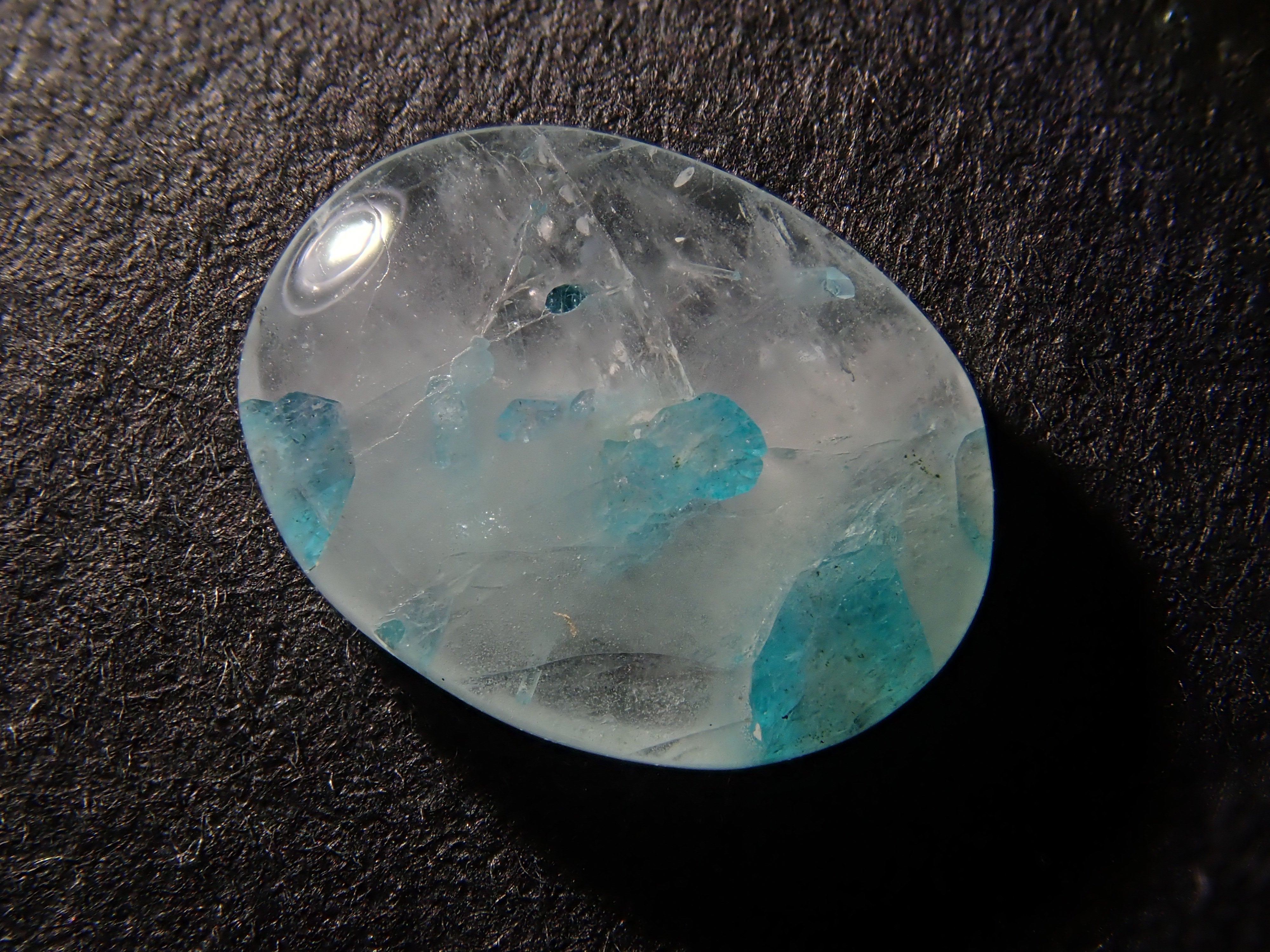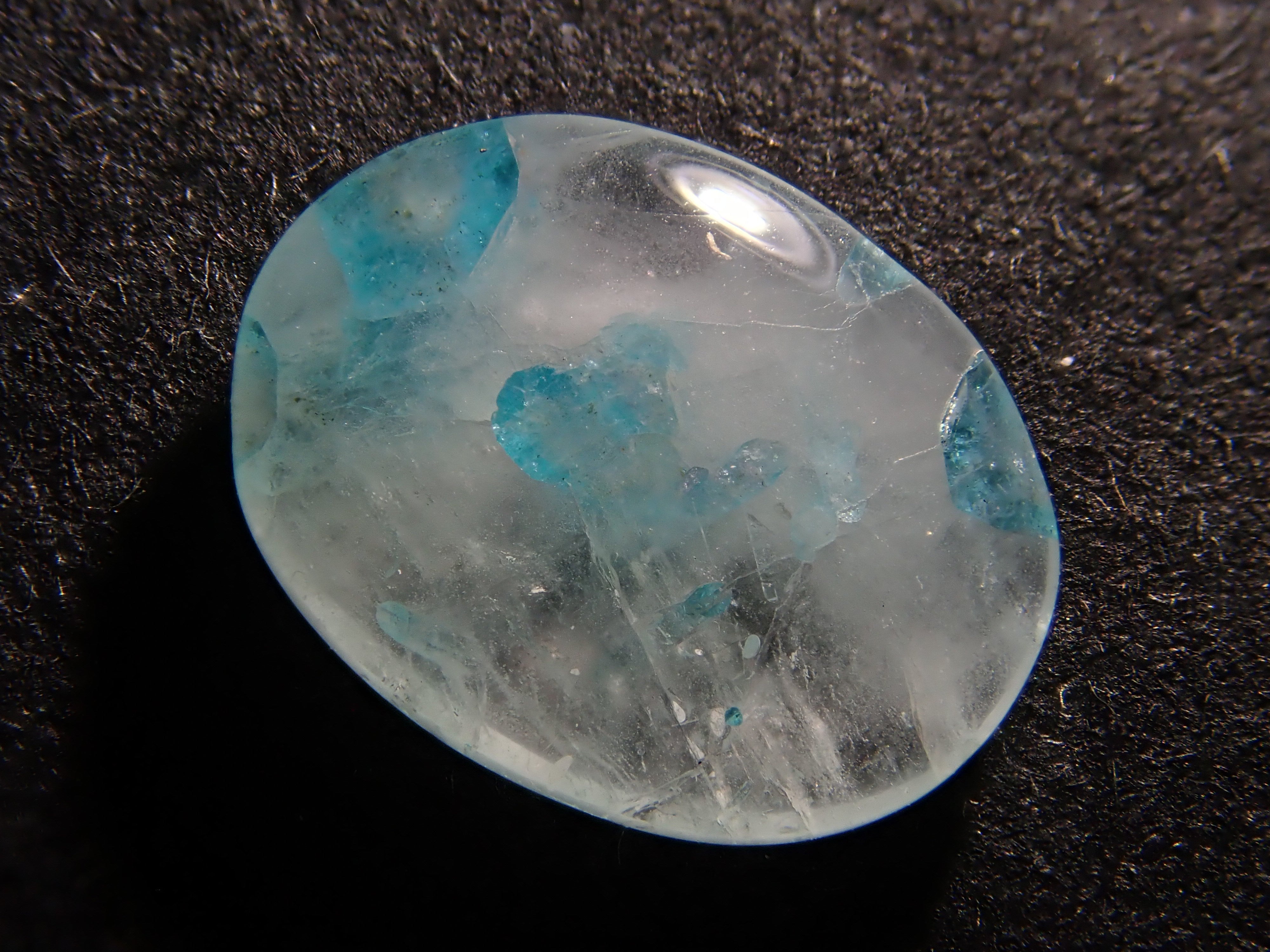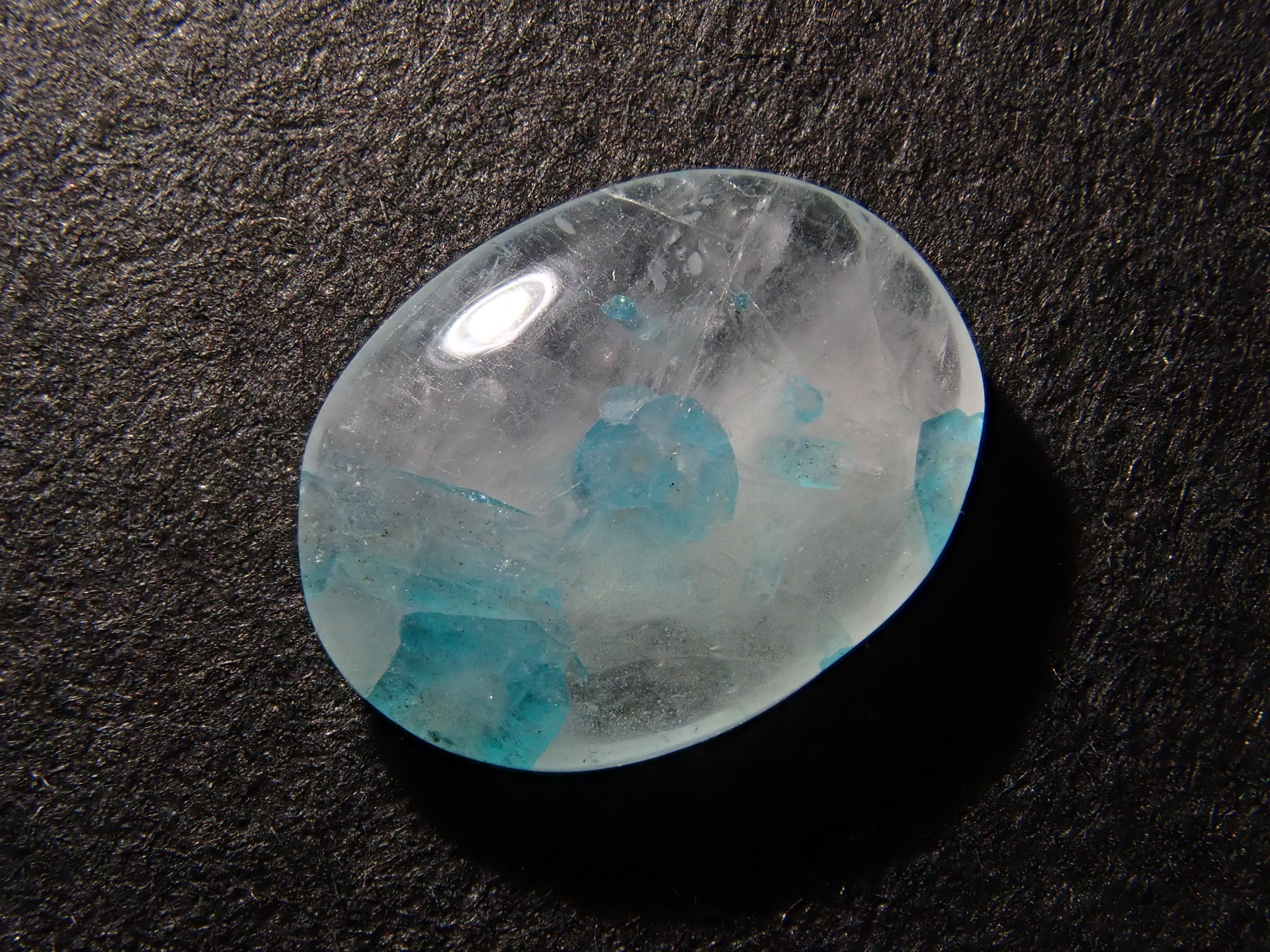 帕拉伊巴石英圓潤可愛,宛如大理石。它清爽的色彩令人聯想到夏日的景象。巴西帕拉伊巴碧璽擁有加勒比海般美麗的色彩,與透明至乳白色的石英交相輝映,令人聯想到海浪拍打潔白沙灘的景象。凝視著它,彷彿能聞到大海的氣息,聽到海浪的聲音。這顆裸石是從巴西帕拉伊巴碧璽礦主手中直接購得的。