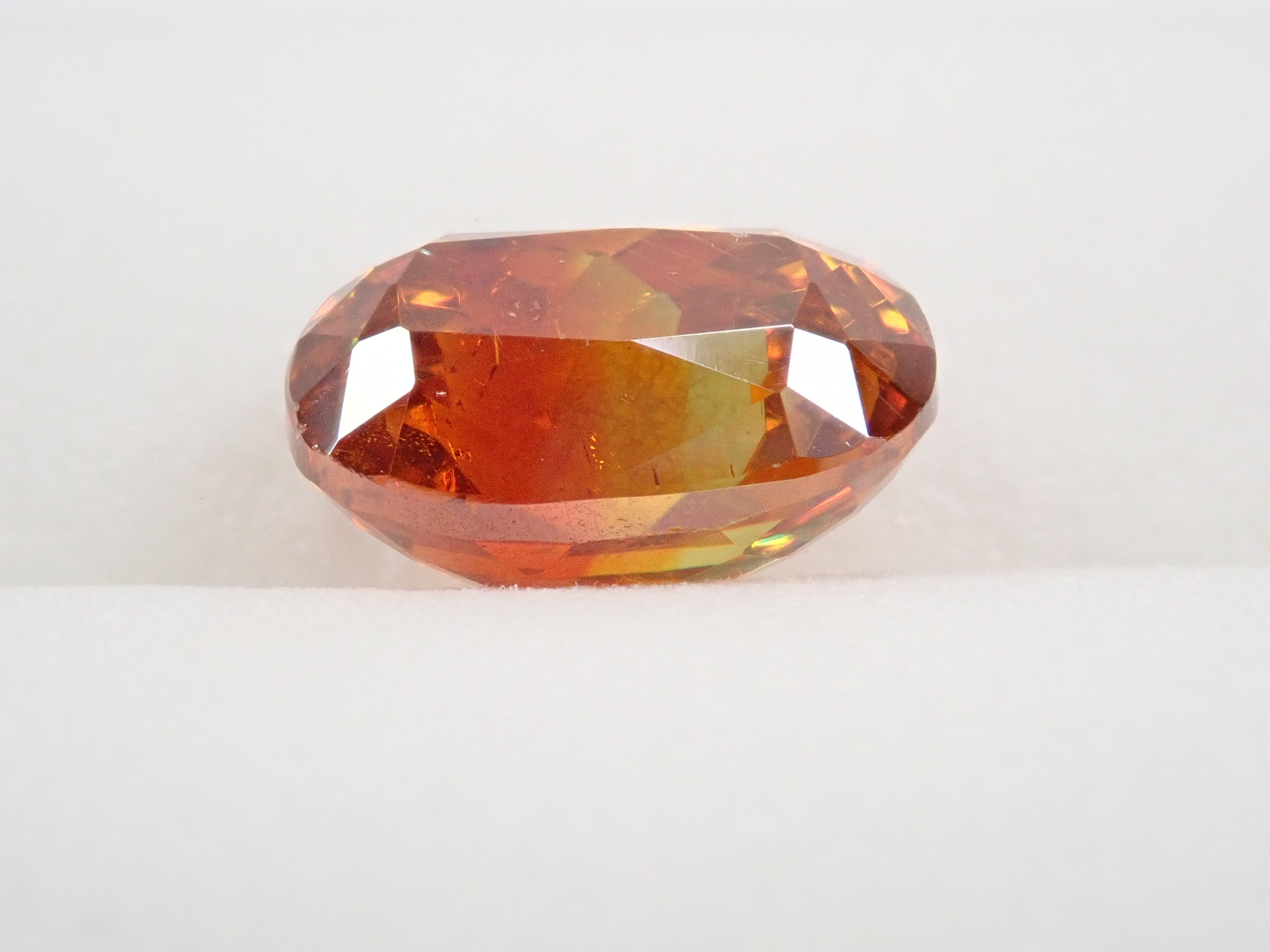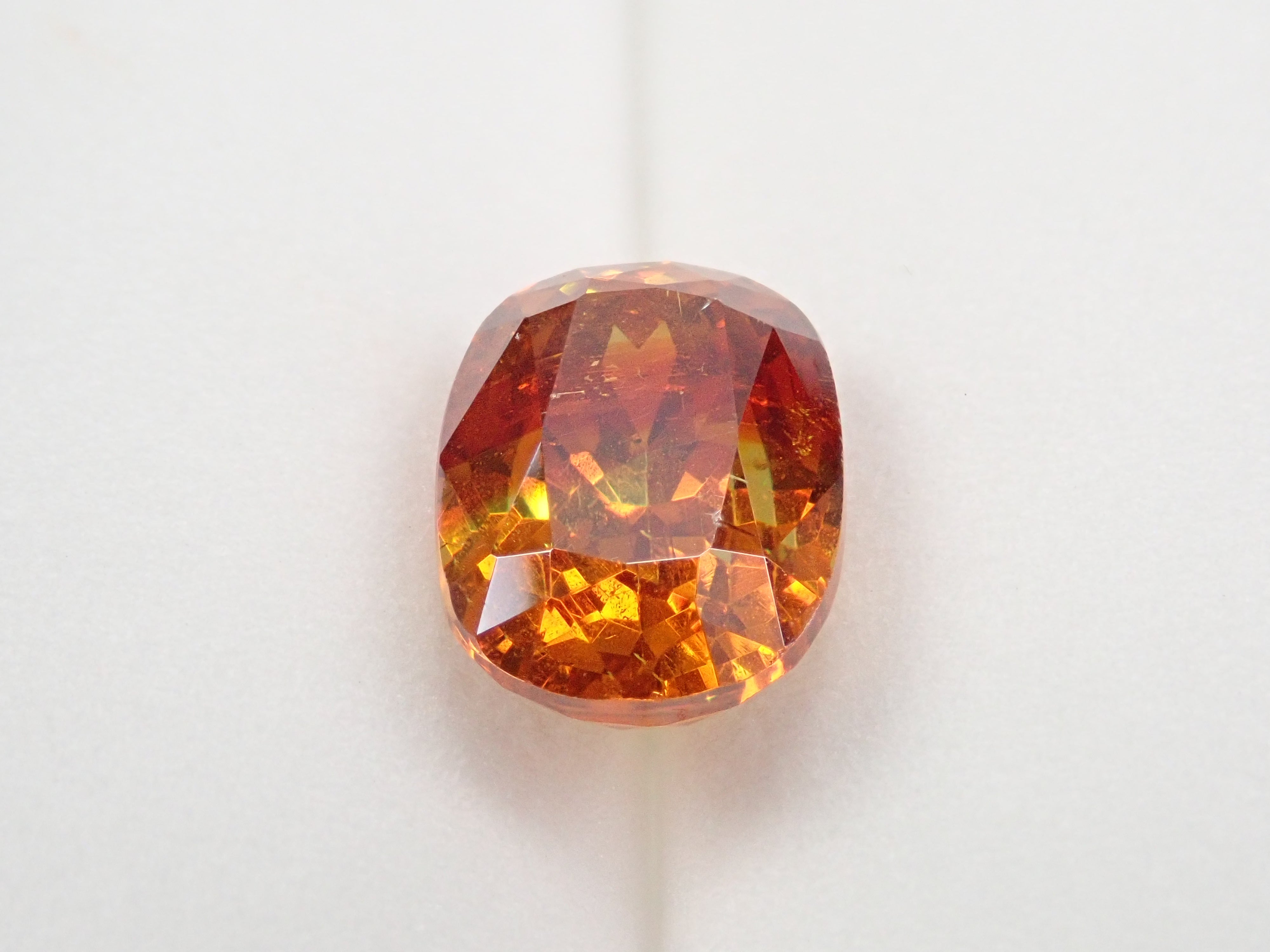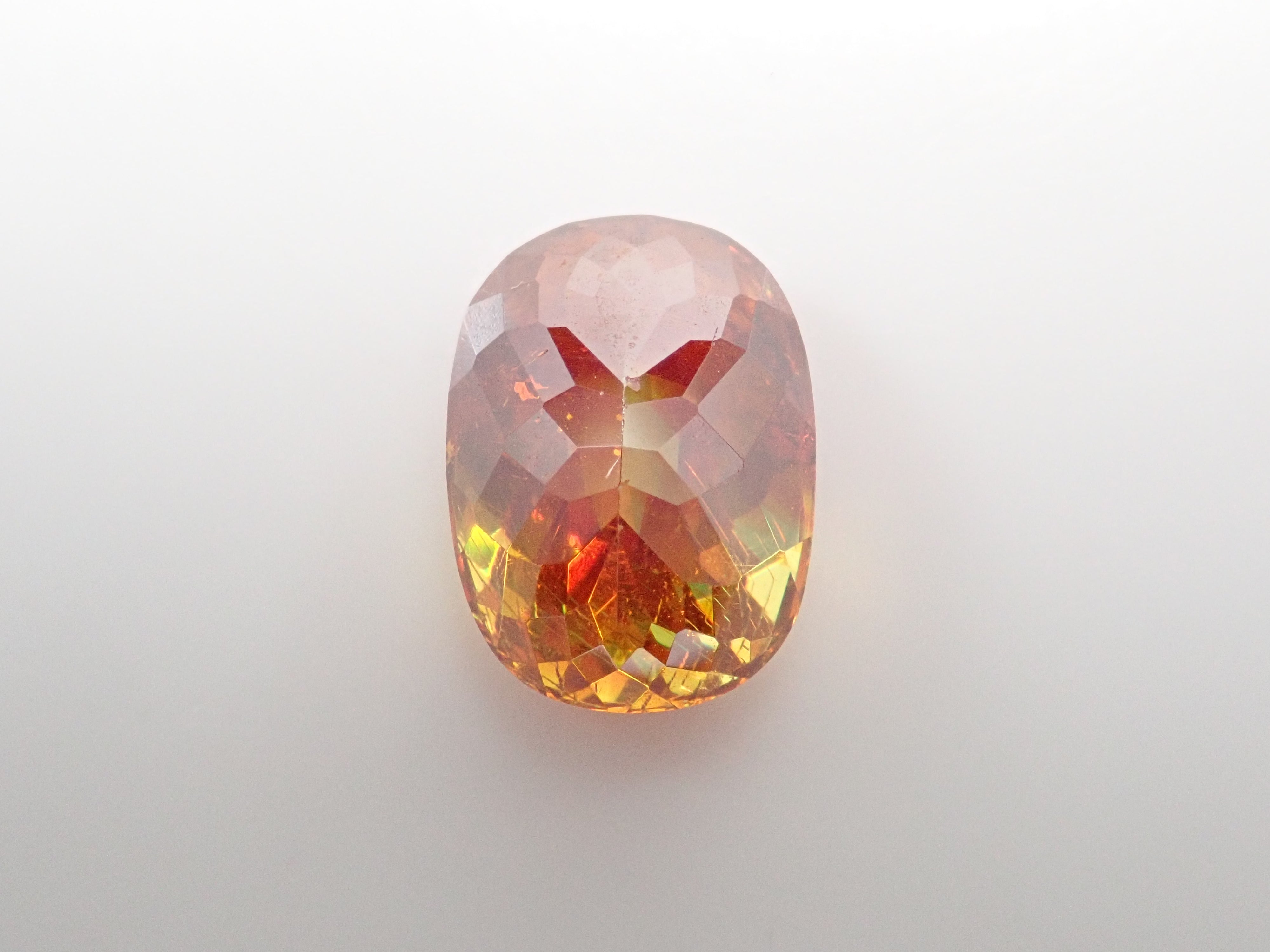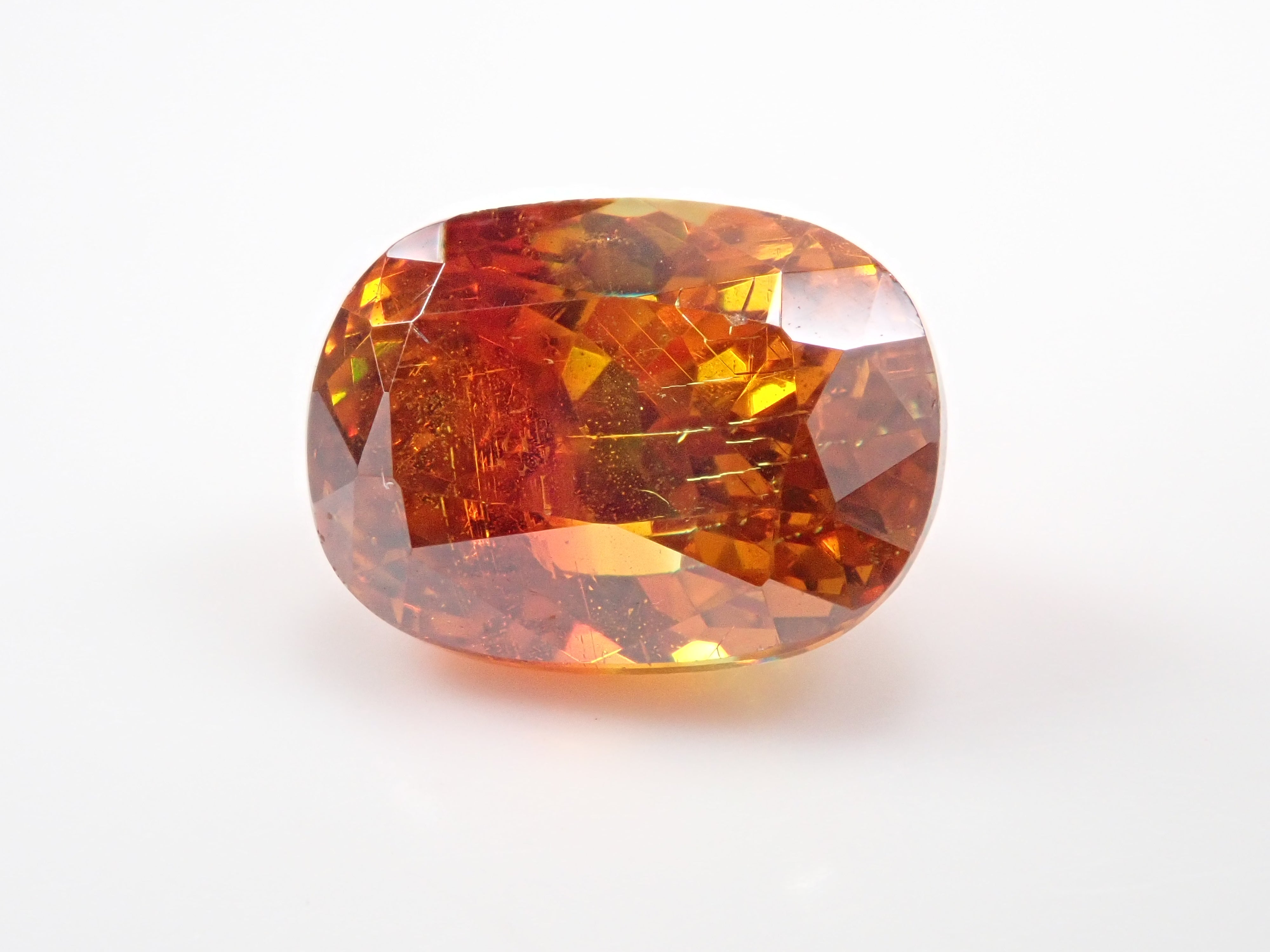 閃鋅礦的色散率幾乎是鑽石的四倍,並能展現出絢麗的火彩。據說,它是稀有寶石之一,流通量很小,在市場上並不常見。其底色為黃色、橘色、綠色等,火彩可呈現多種顏色,如黃色、棕色、橘色、紅色和綠色。這是一顆產自西班牙的5.289克拉裸石,透明度極高,為雙色閃鋅礦。