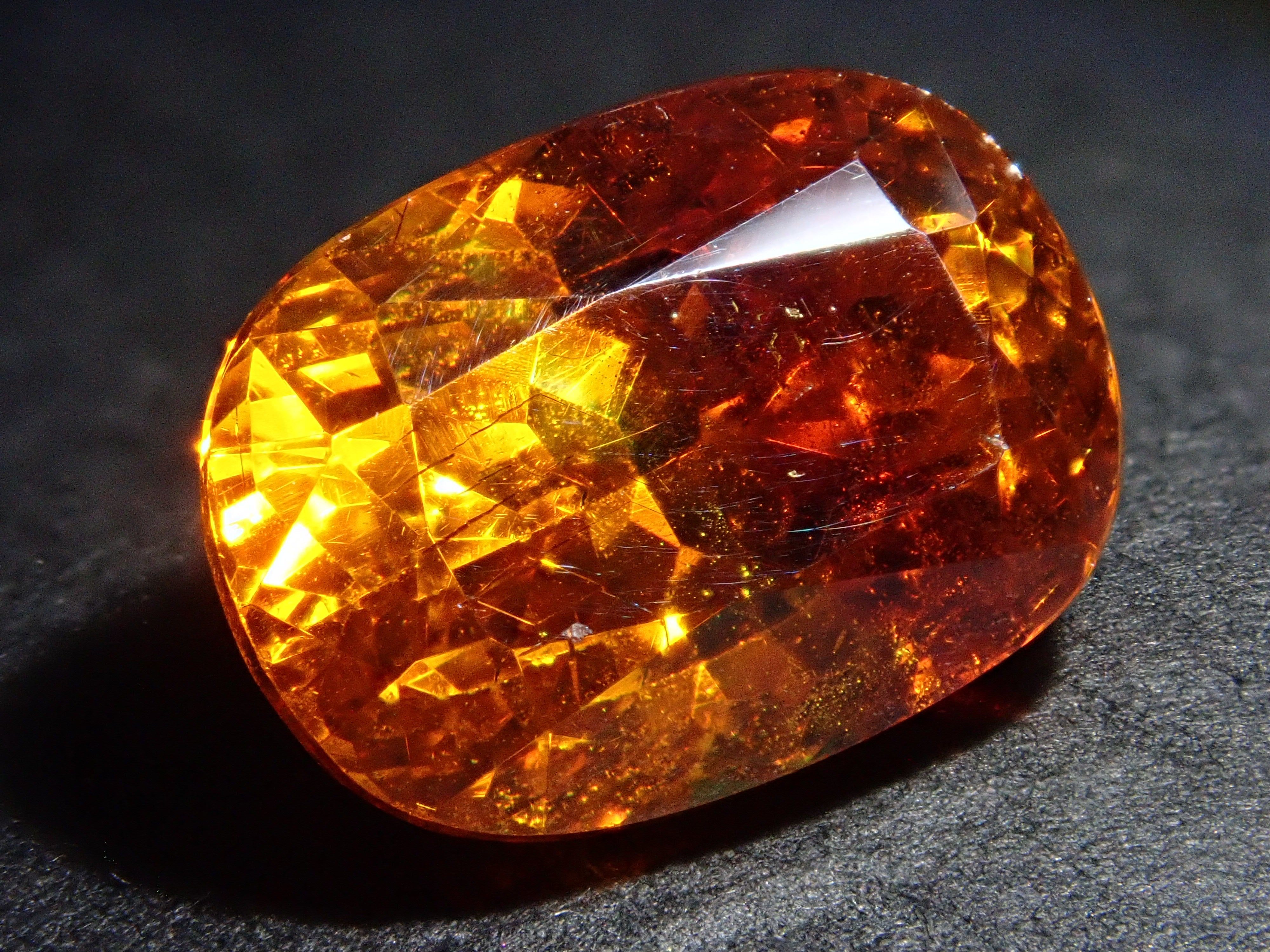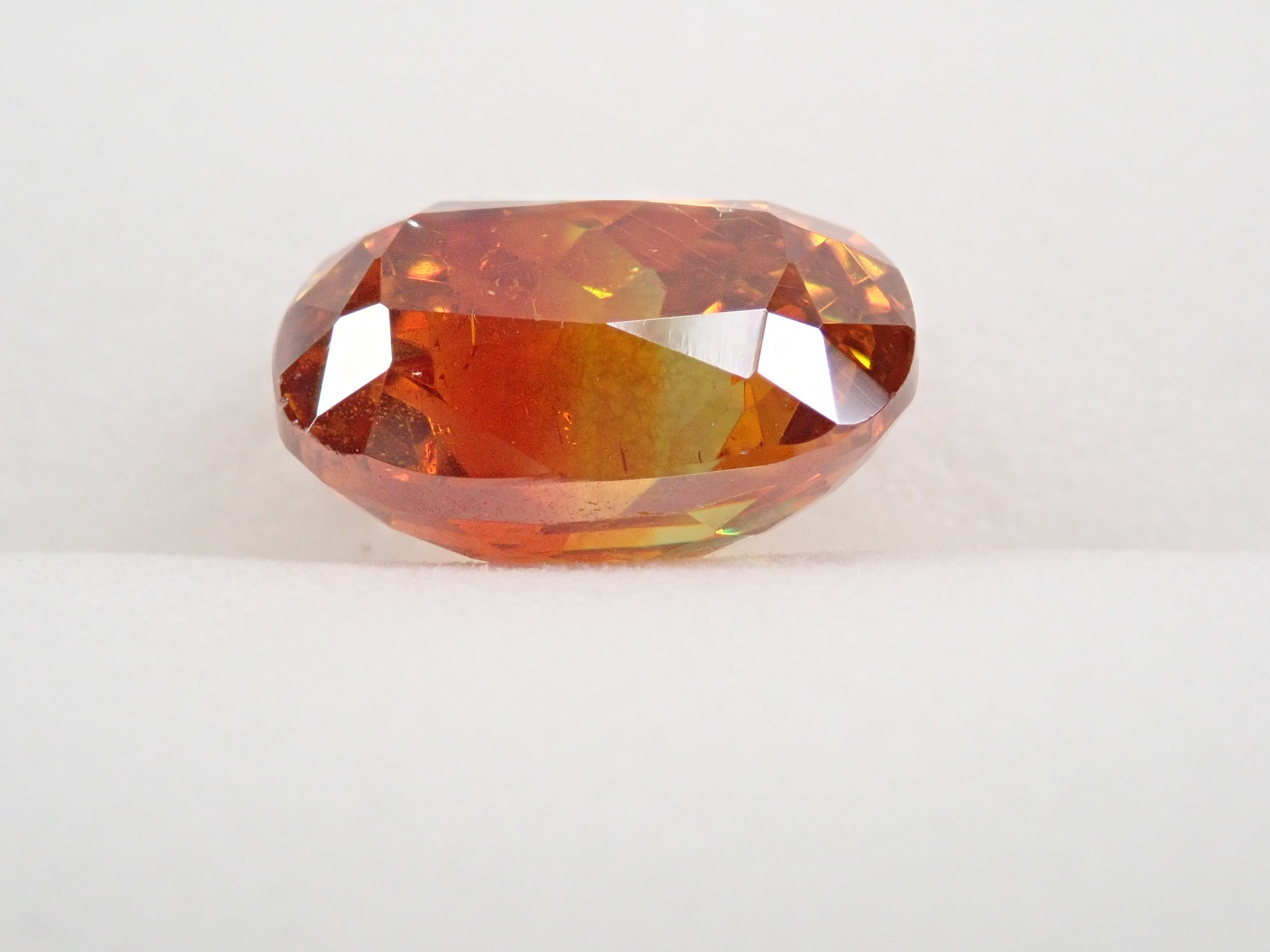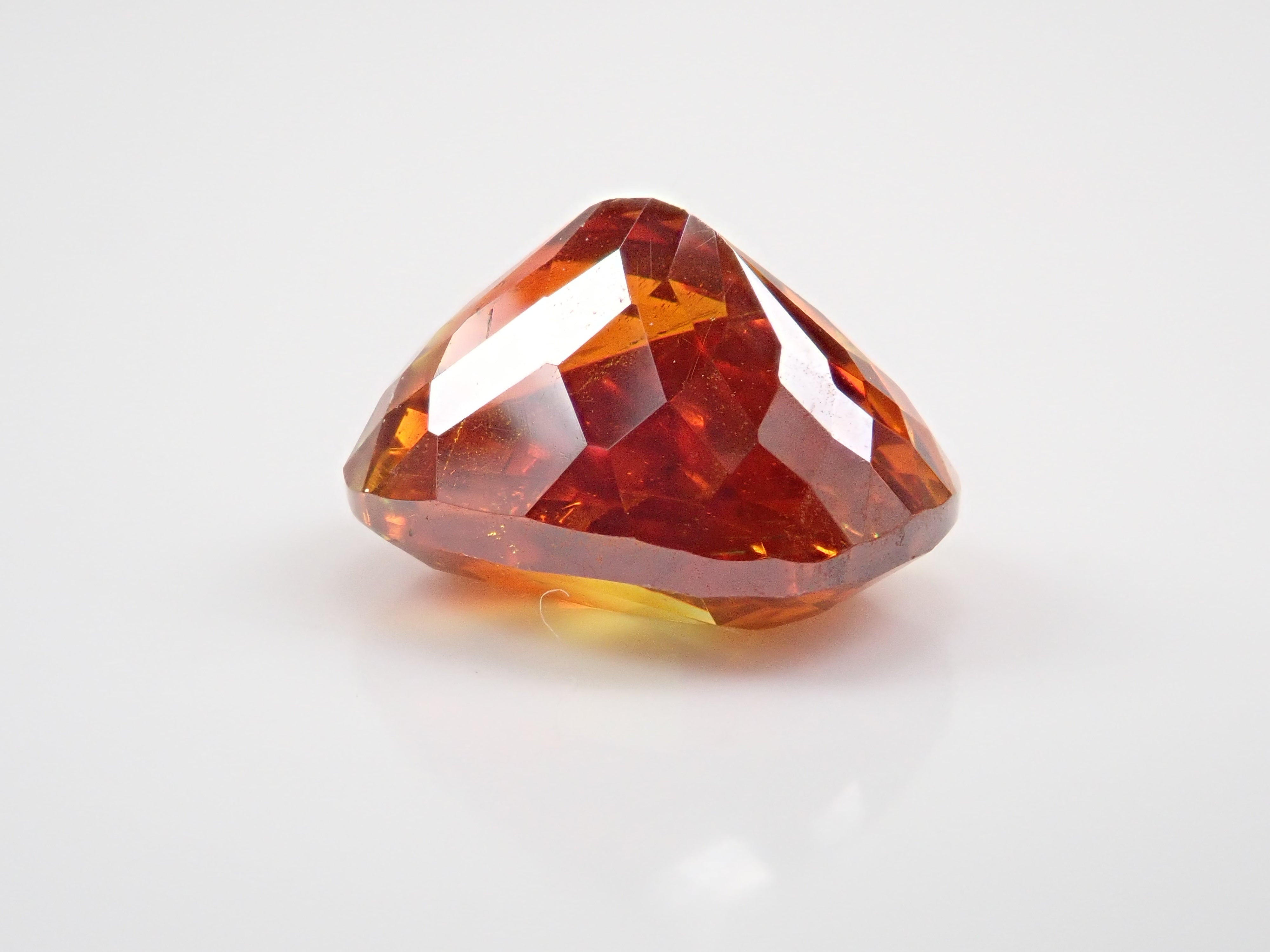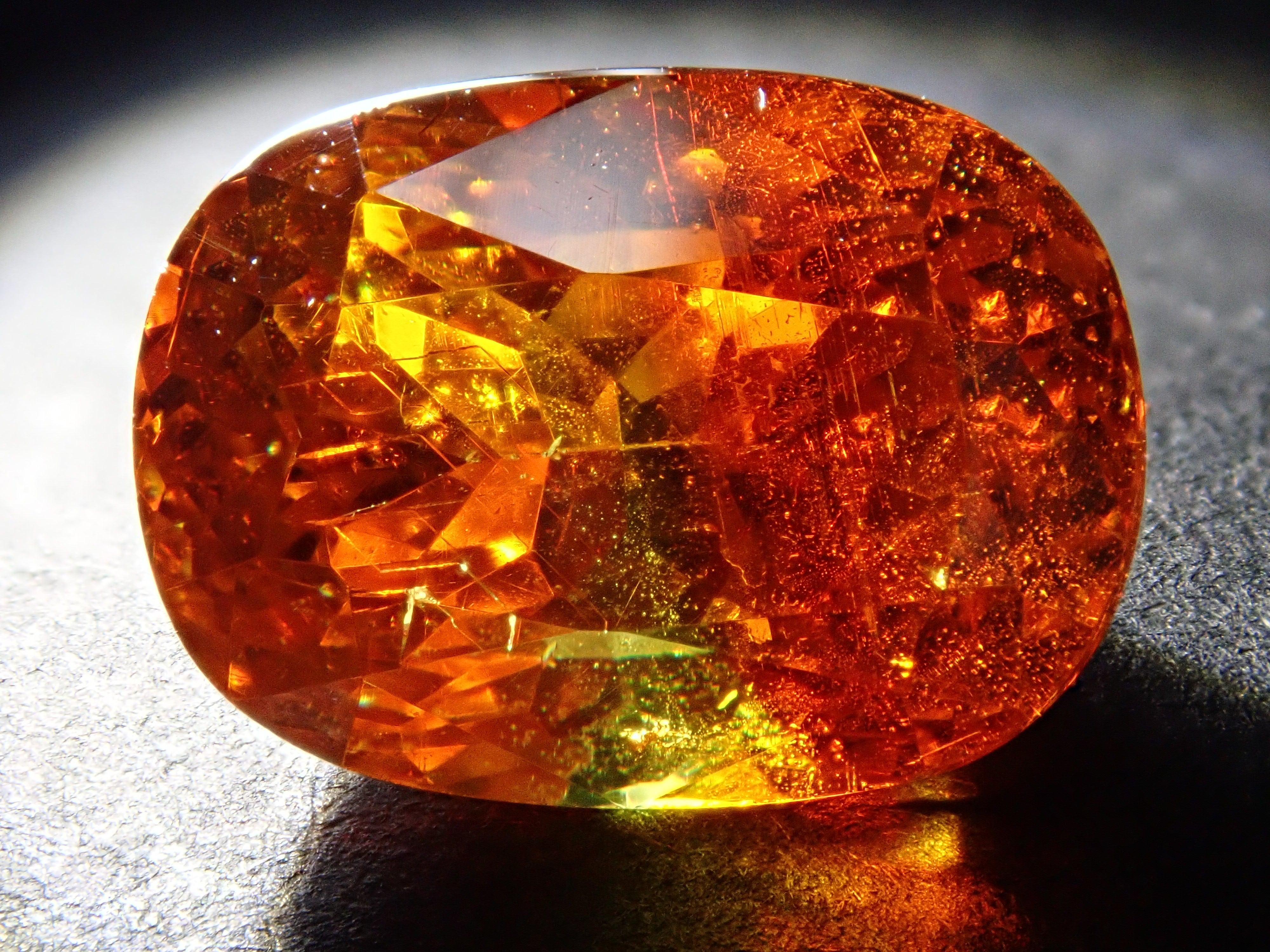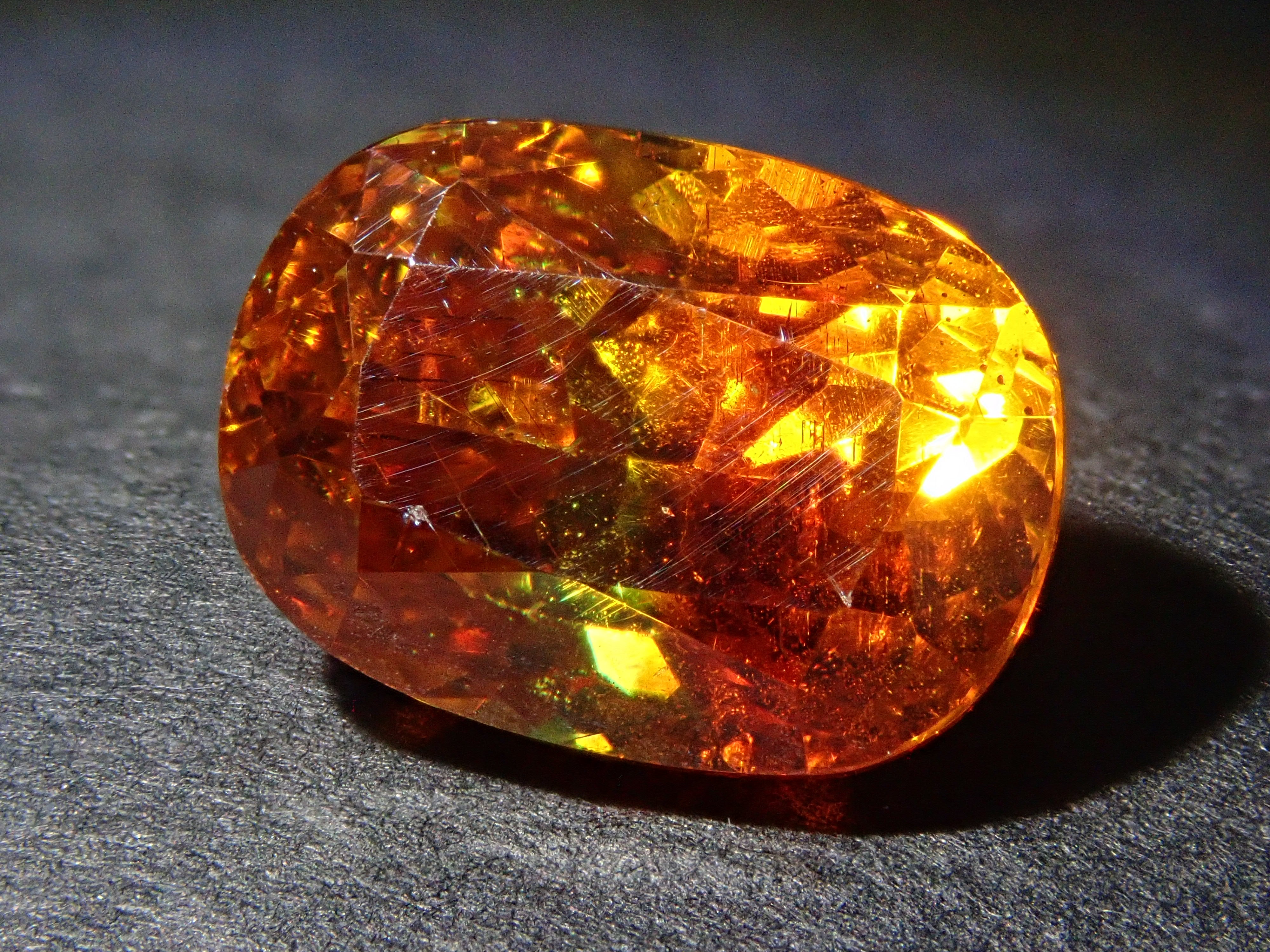 閃鋅礦的色散率幾乎是鑽石的四倍,並能展現出絢麗的火彩。據說,它是稀有寶石之一,流通量很小,在市場上並不常見。其底色為黃色、橘色、綠色等,火彩可呈現多種顏色,如黃色、棕色、橘色、紅色和綠色。這是一顆產自西班牙的5.289克拉裸石,透明度極高,為雙色閃鋅礦。