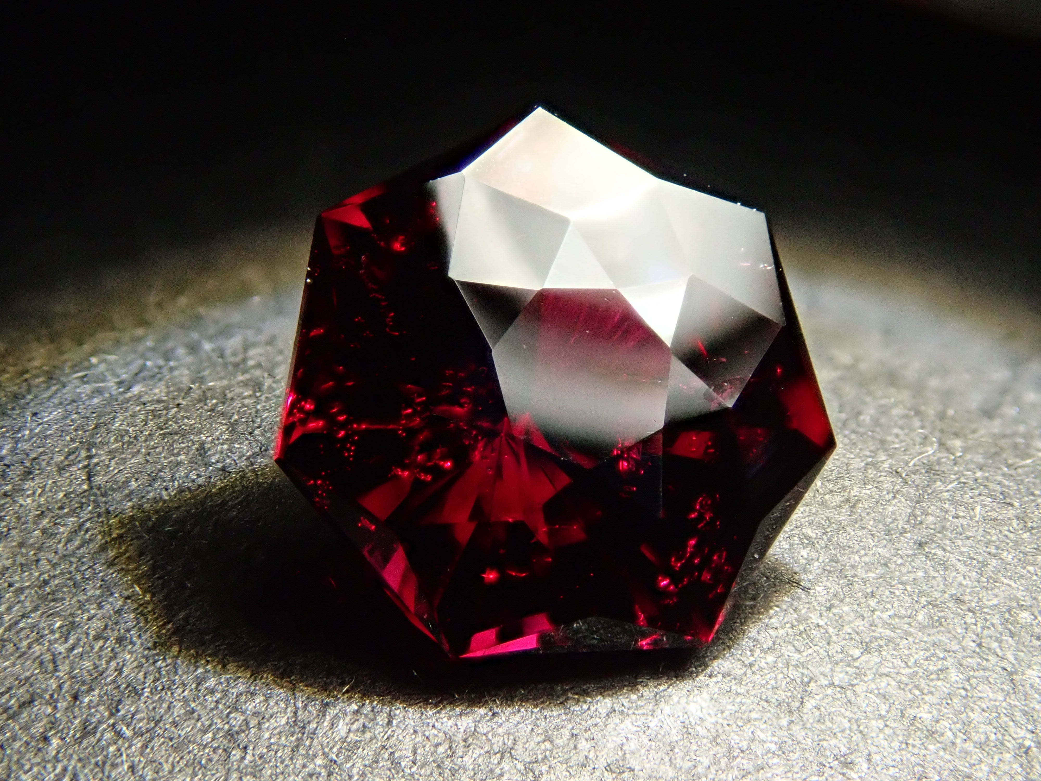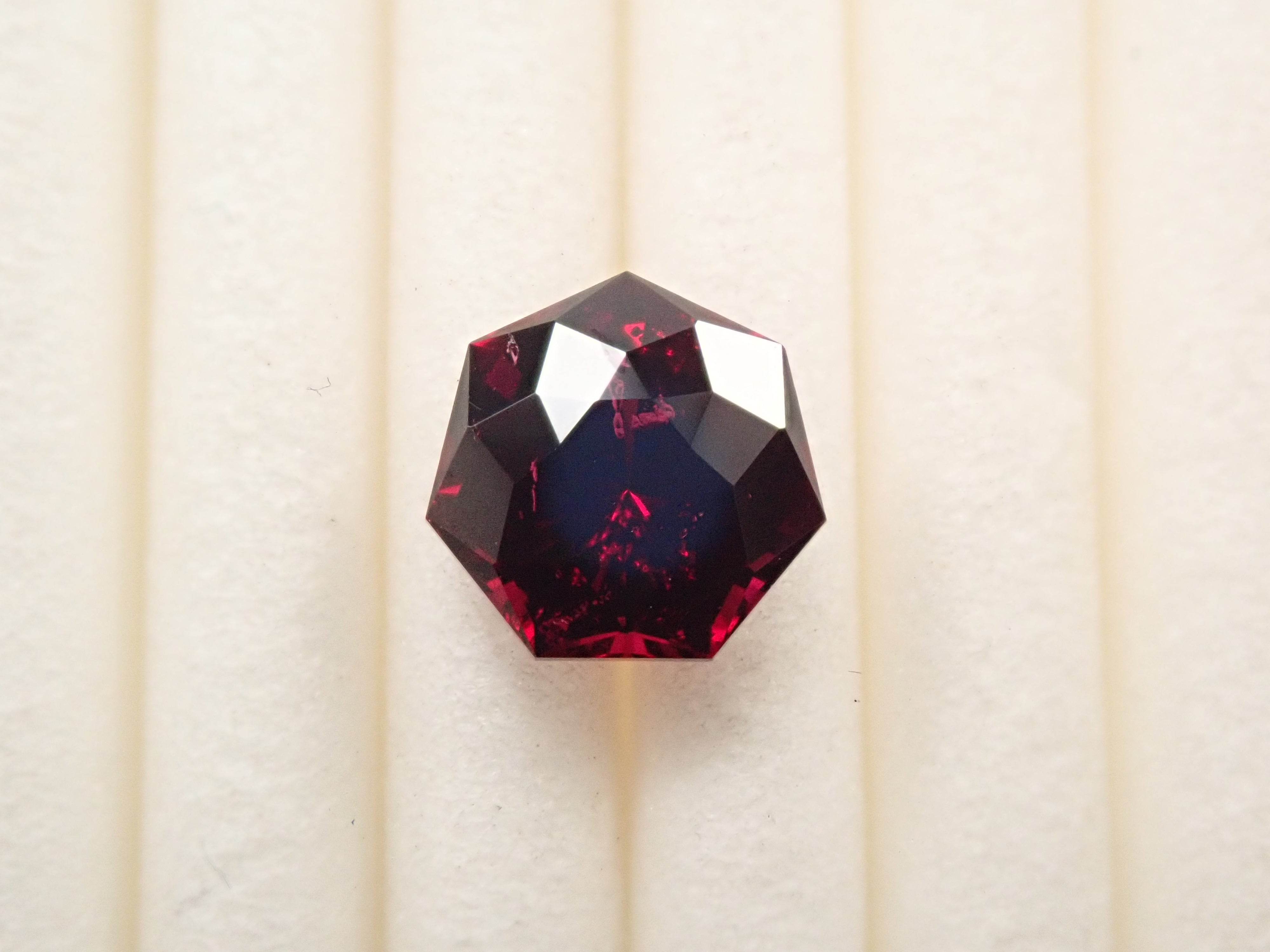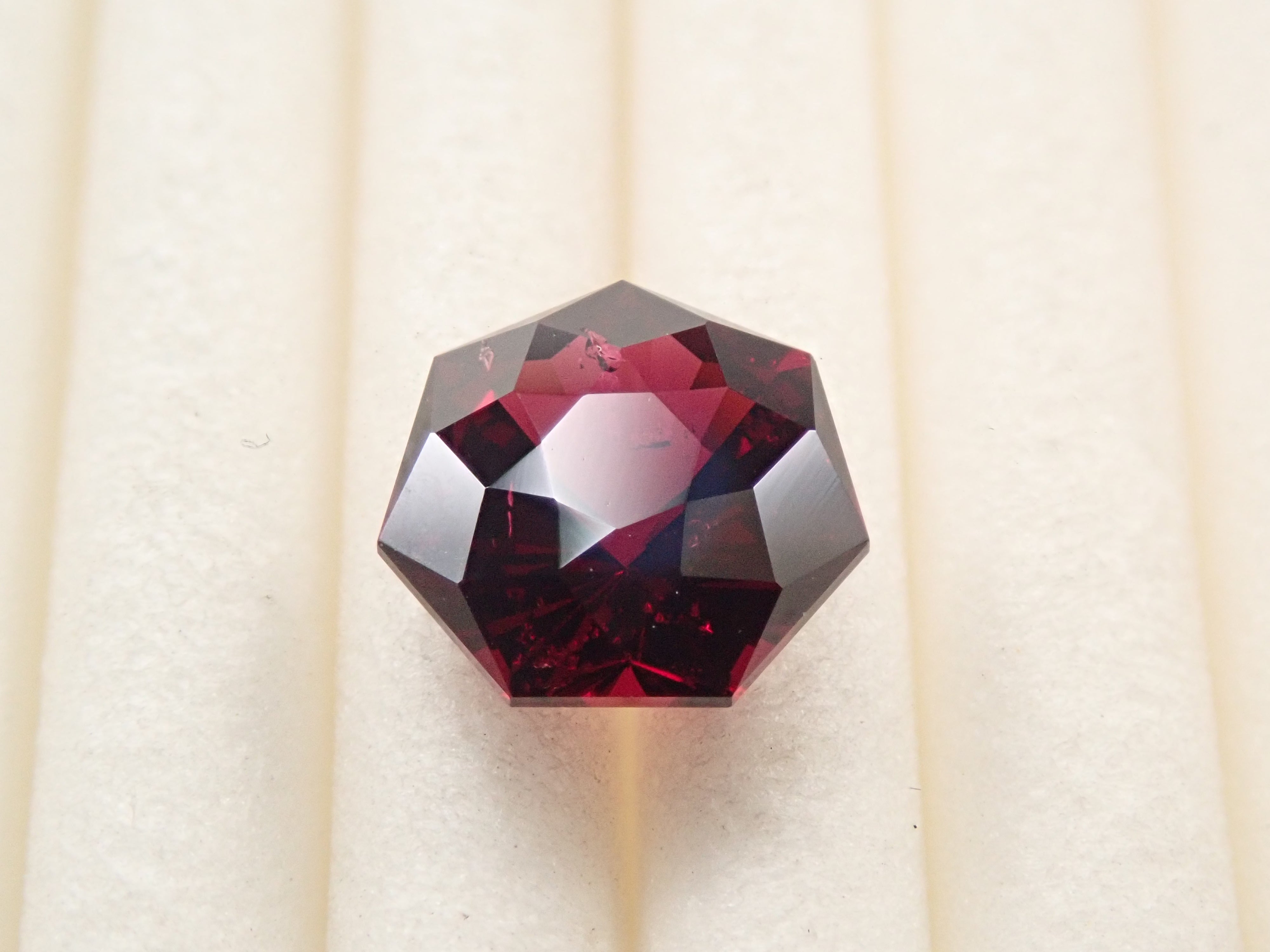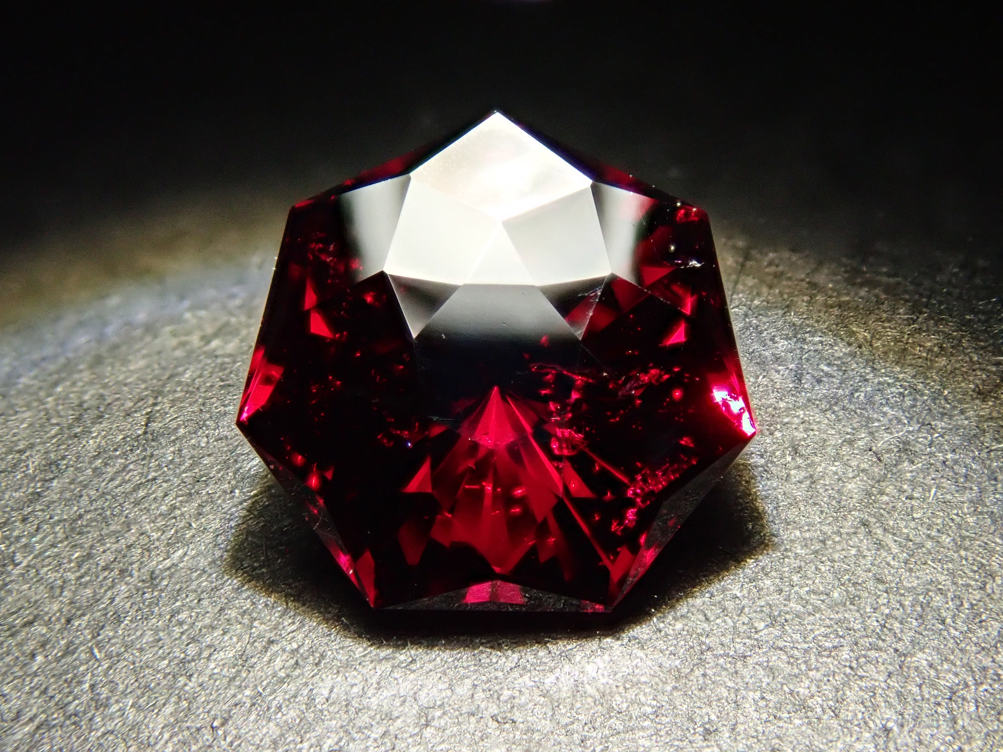石榴石是著名的一月誕生石。它的顏色多種多樣,包括紅色、黃色、橙色和綠色。其中最受歡迎的紅色石榴石是「鐵鋁榴石」。它的特徵是深紅色。這顆鐵鋁榴石由斯里蘭卡切割師桑傑切割而成。