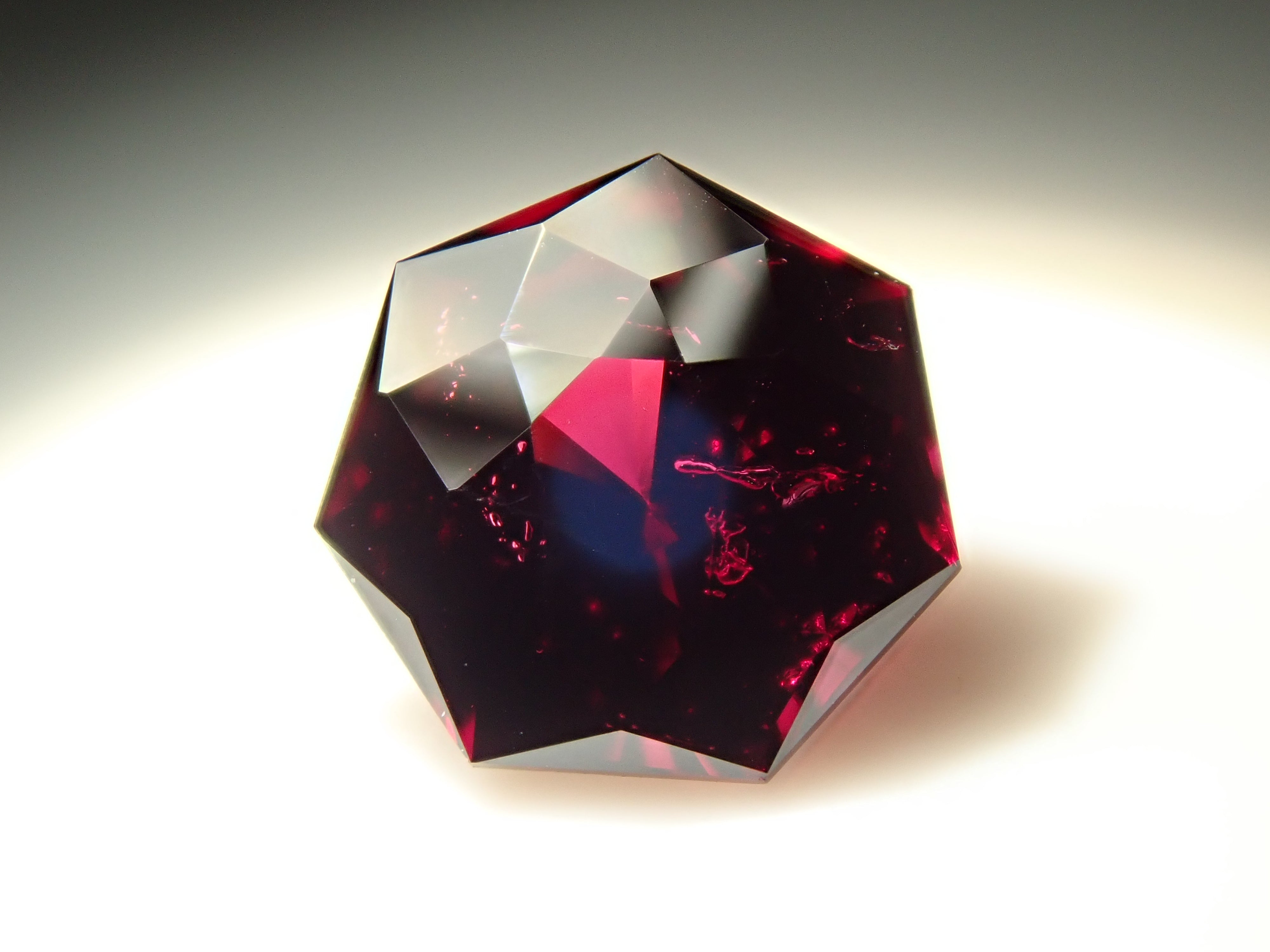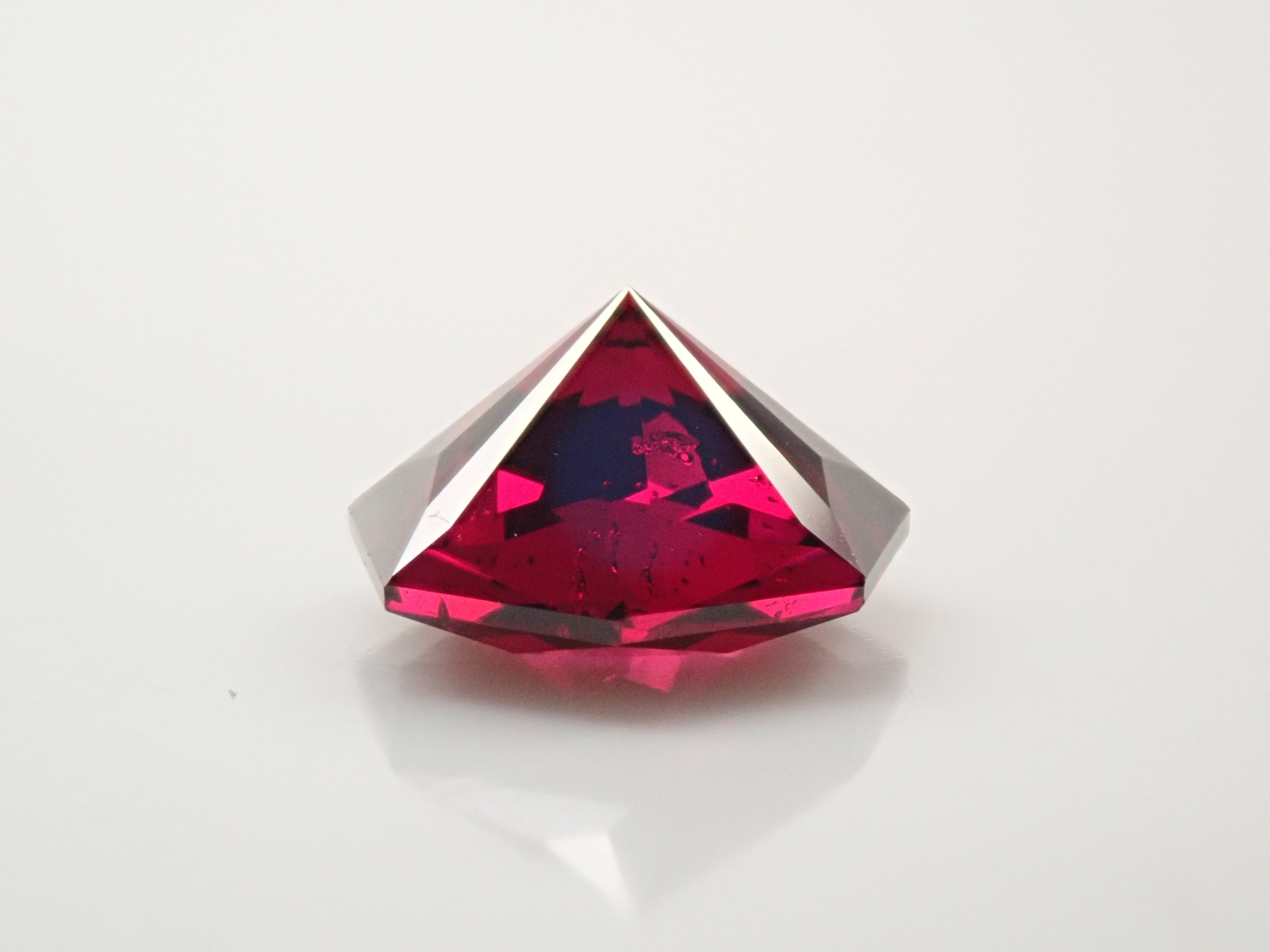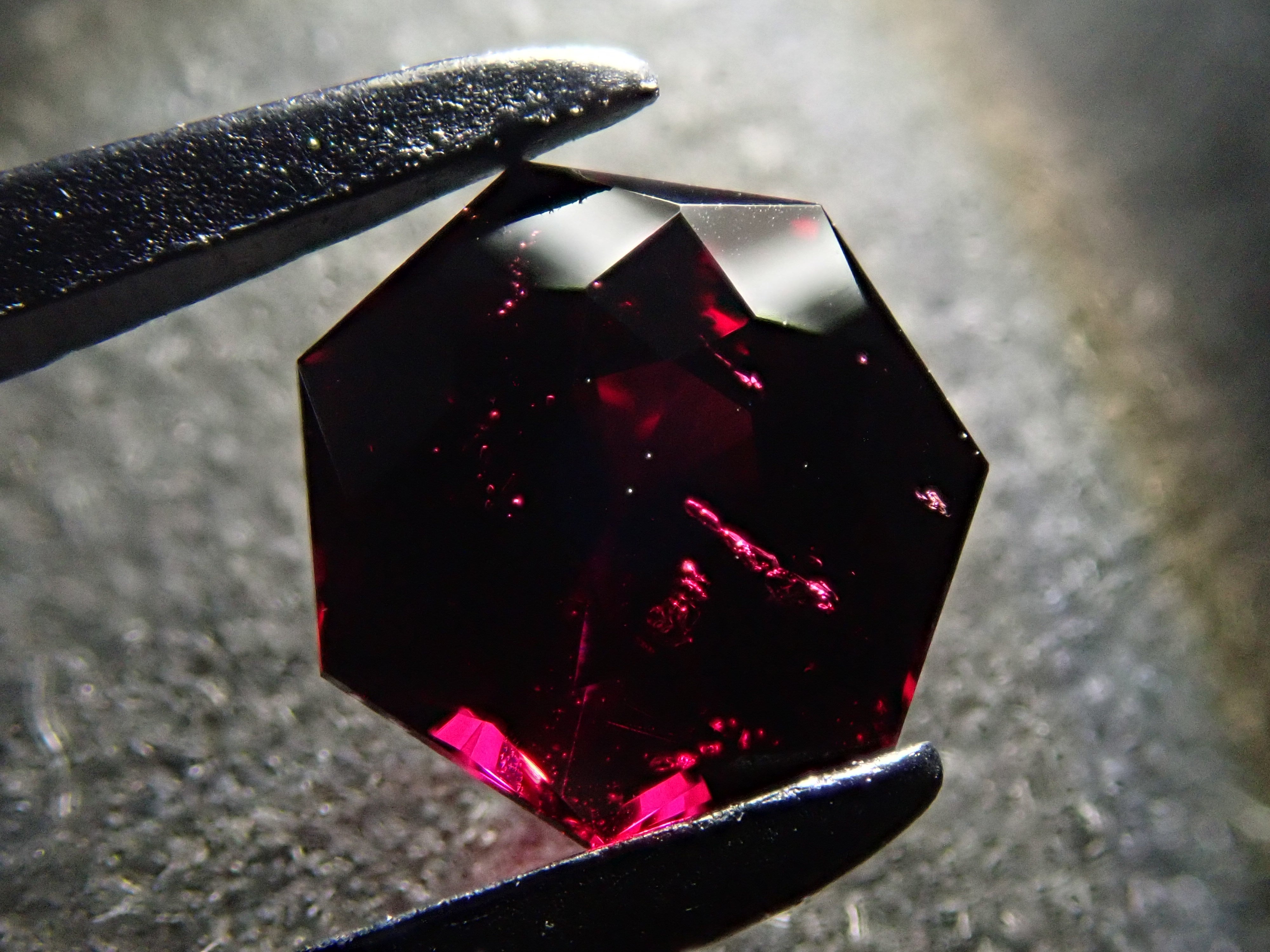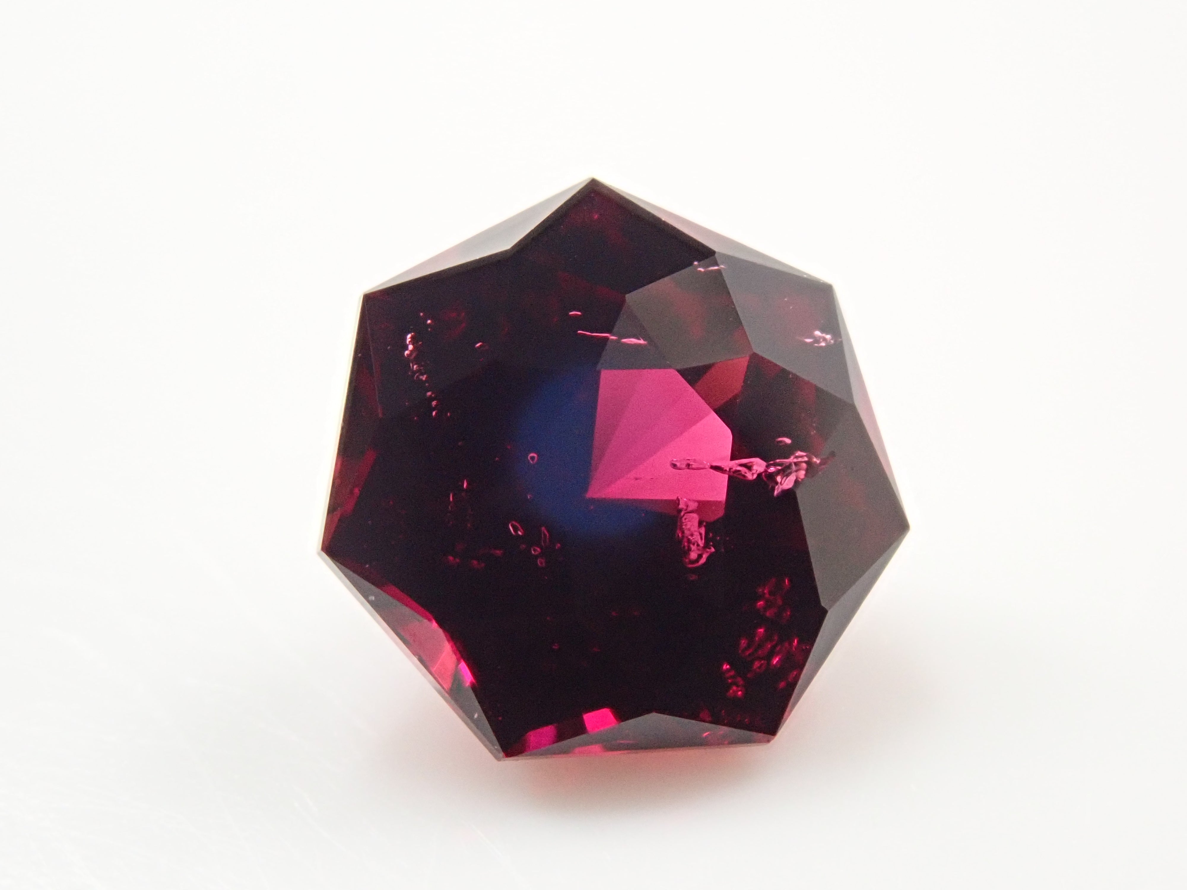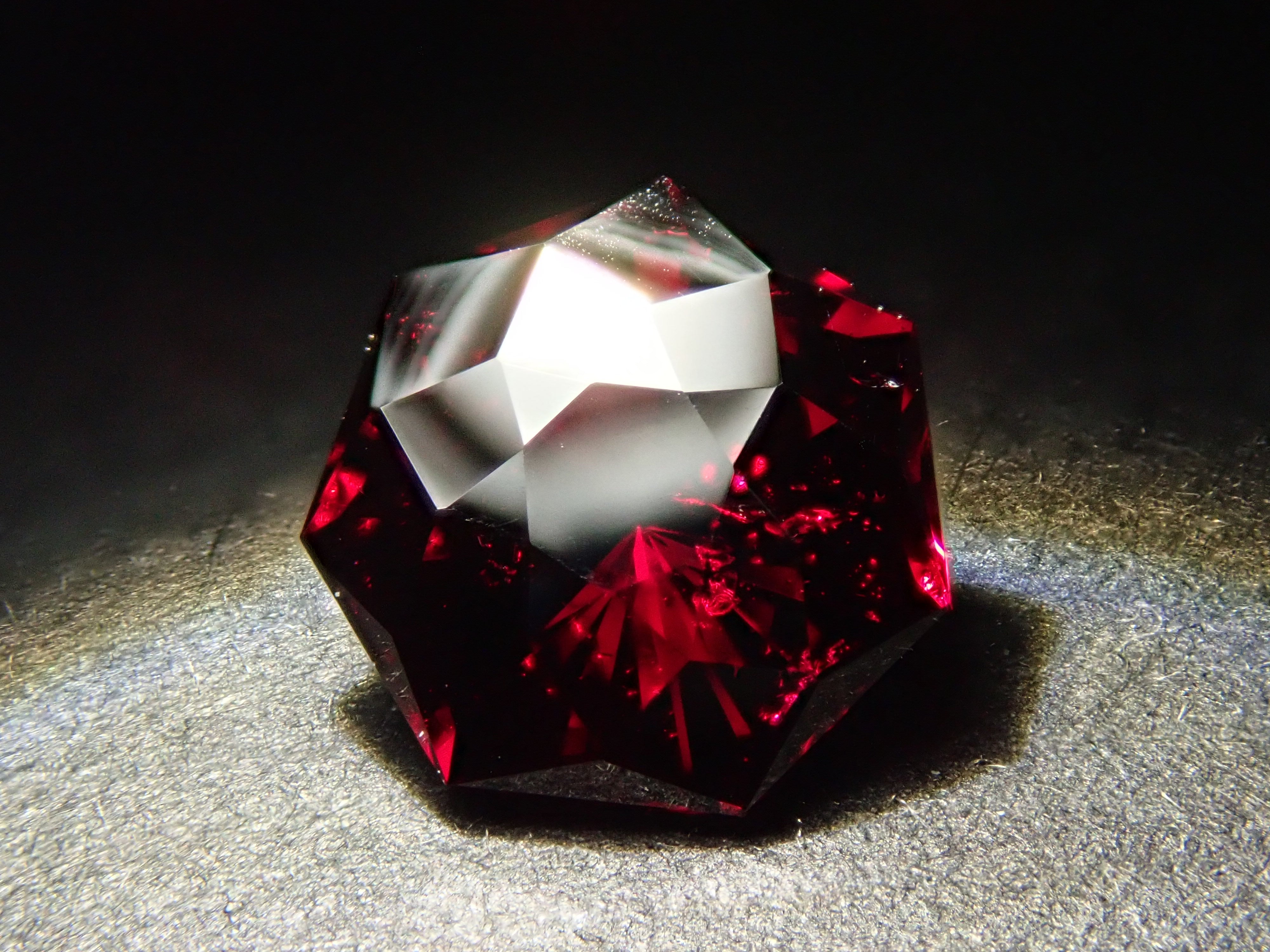 石榴石是著名的一月誕生石。它的顏色多種多樣,包括紅色、黃色、橙色和綠色。其中最受歡迎的紅色石榴石是「鐵鋁榴石」。它的特徵是深紅色。這顆鐵鋁榴石由斯里蘭卡切割師桑傑切割而成。
