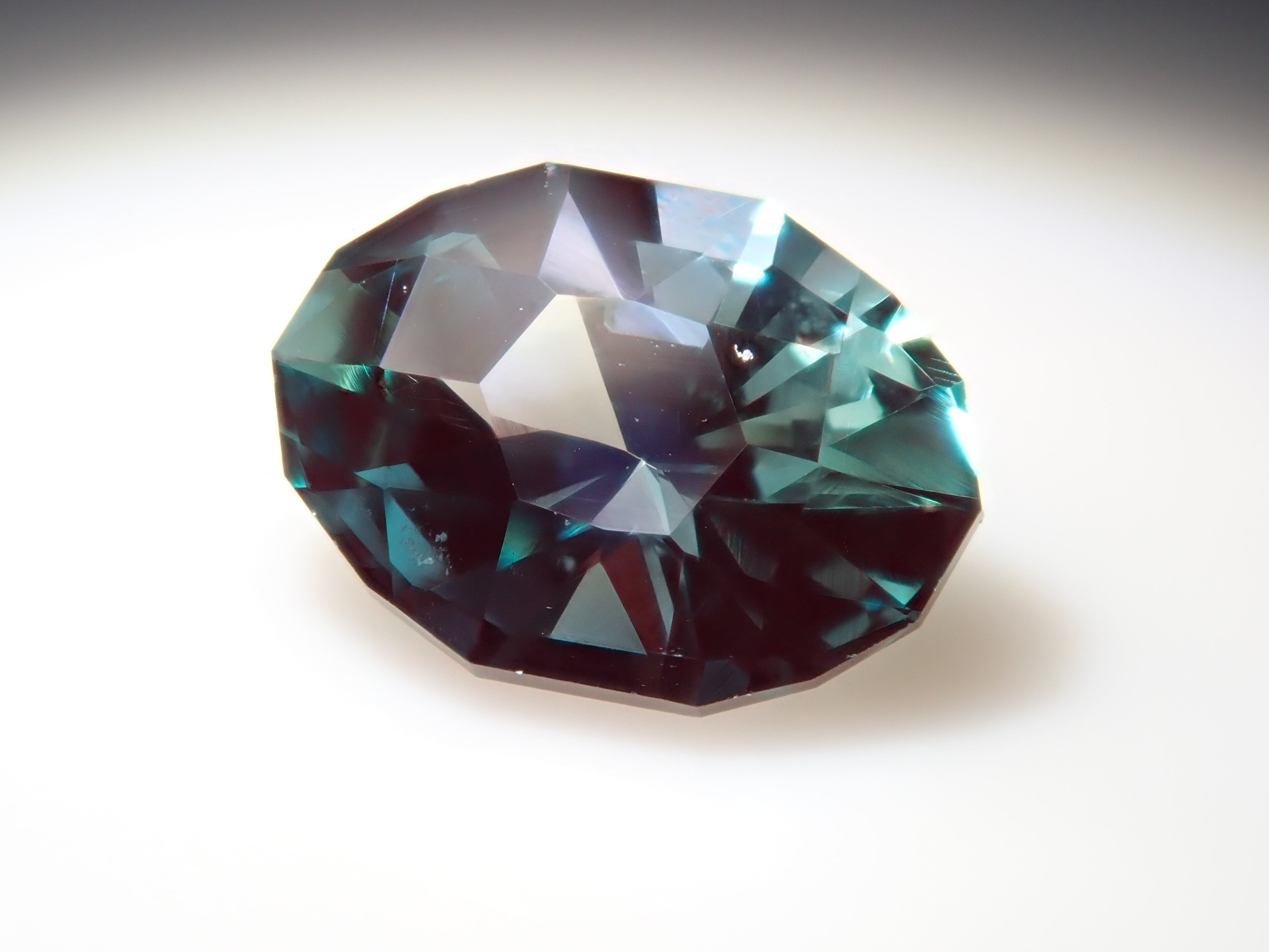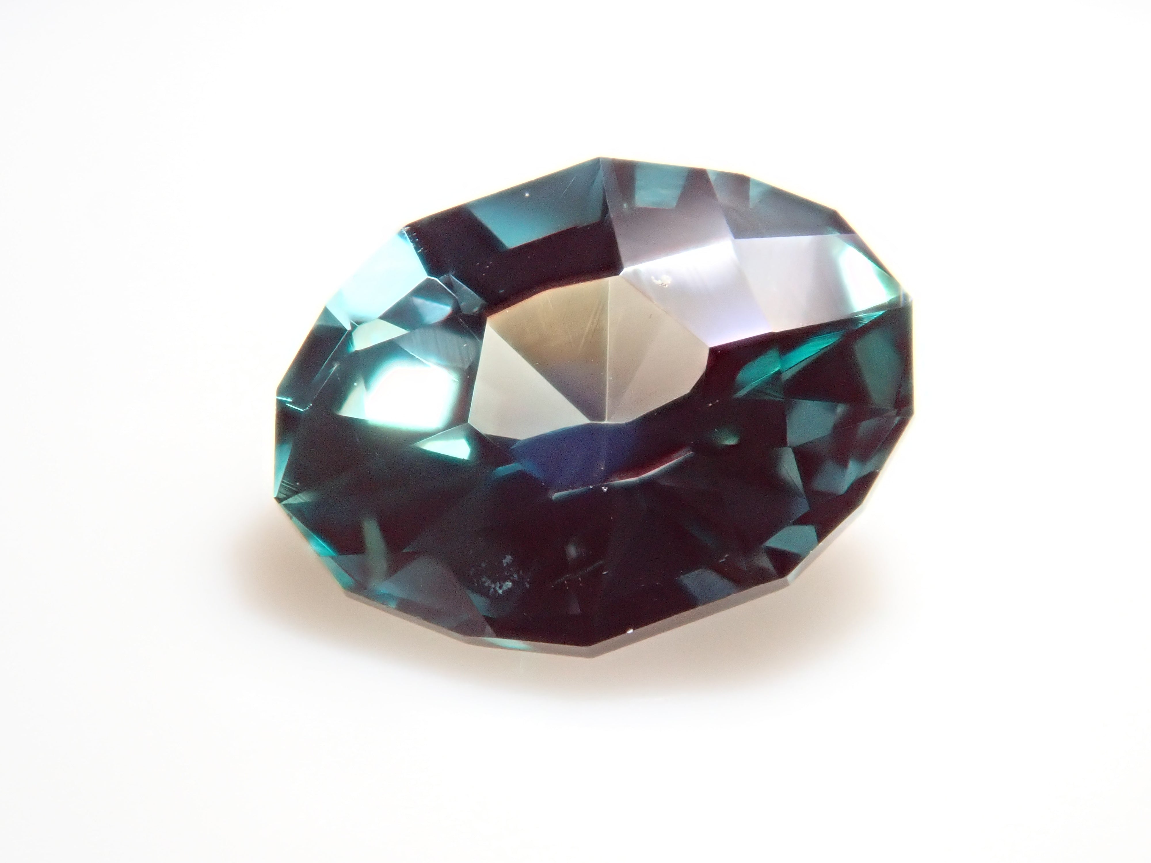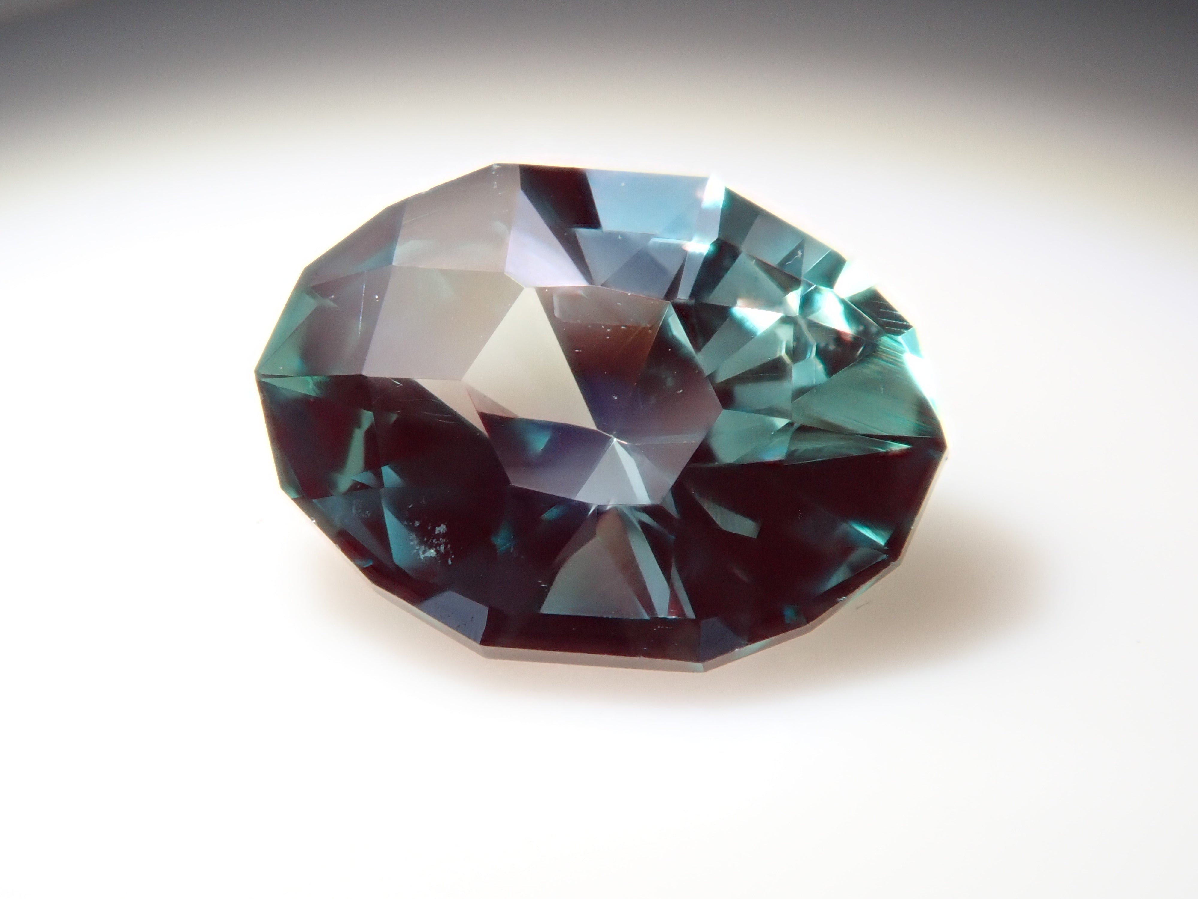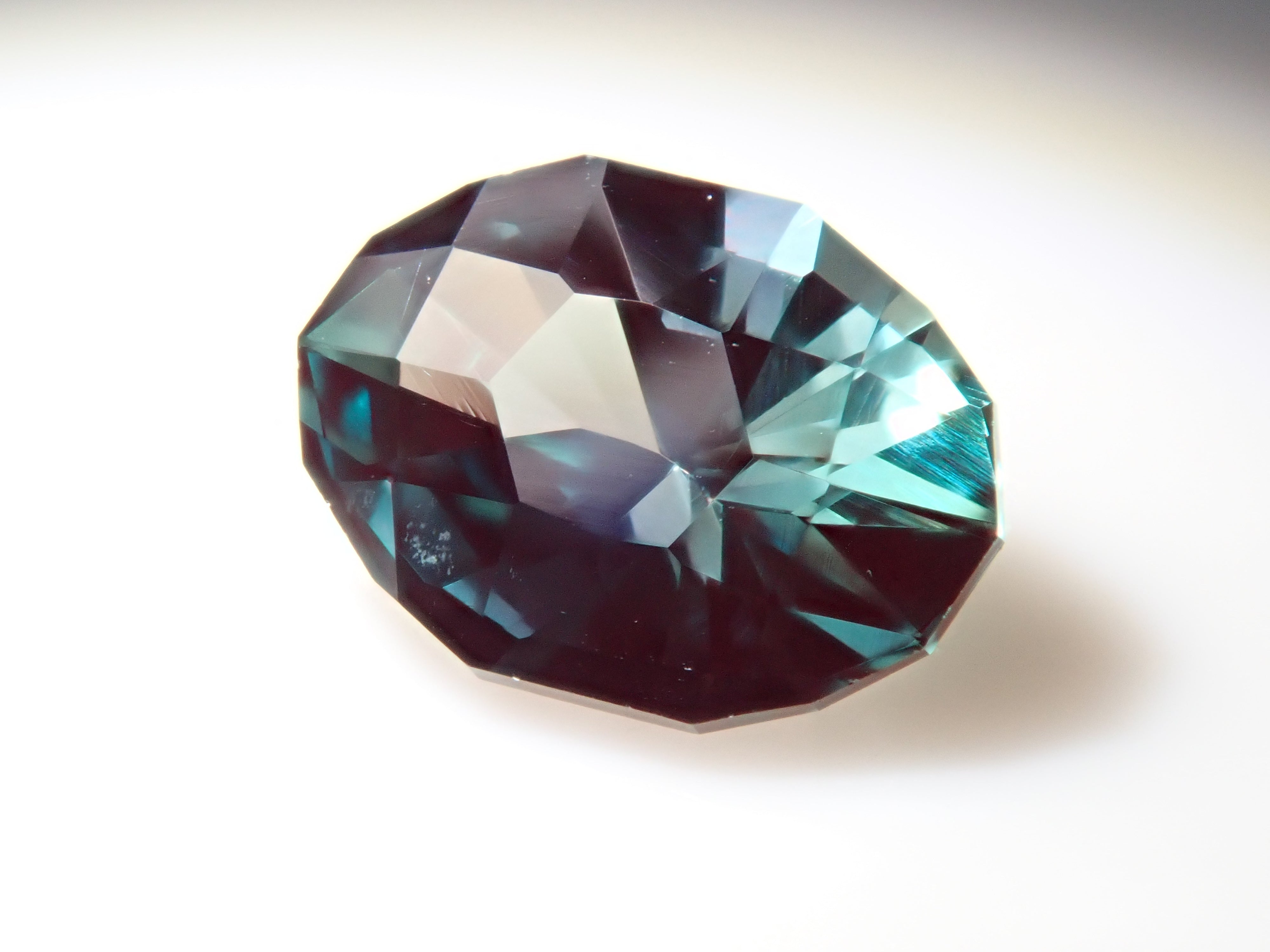 這是一顆璀璨奪目的合成亞歷山大變石。這種切工在合成亞歷山大變石中十分罕見。