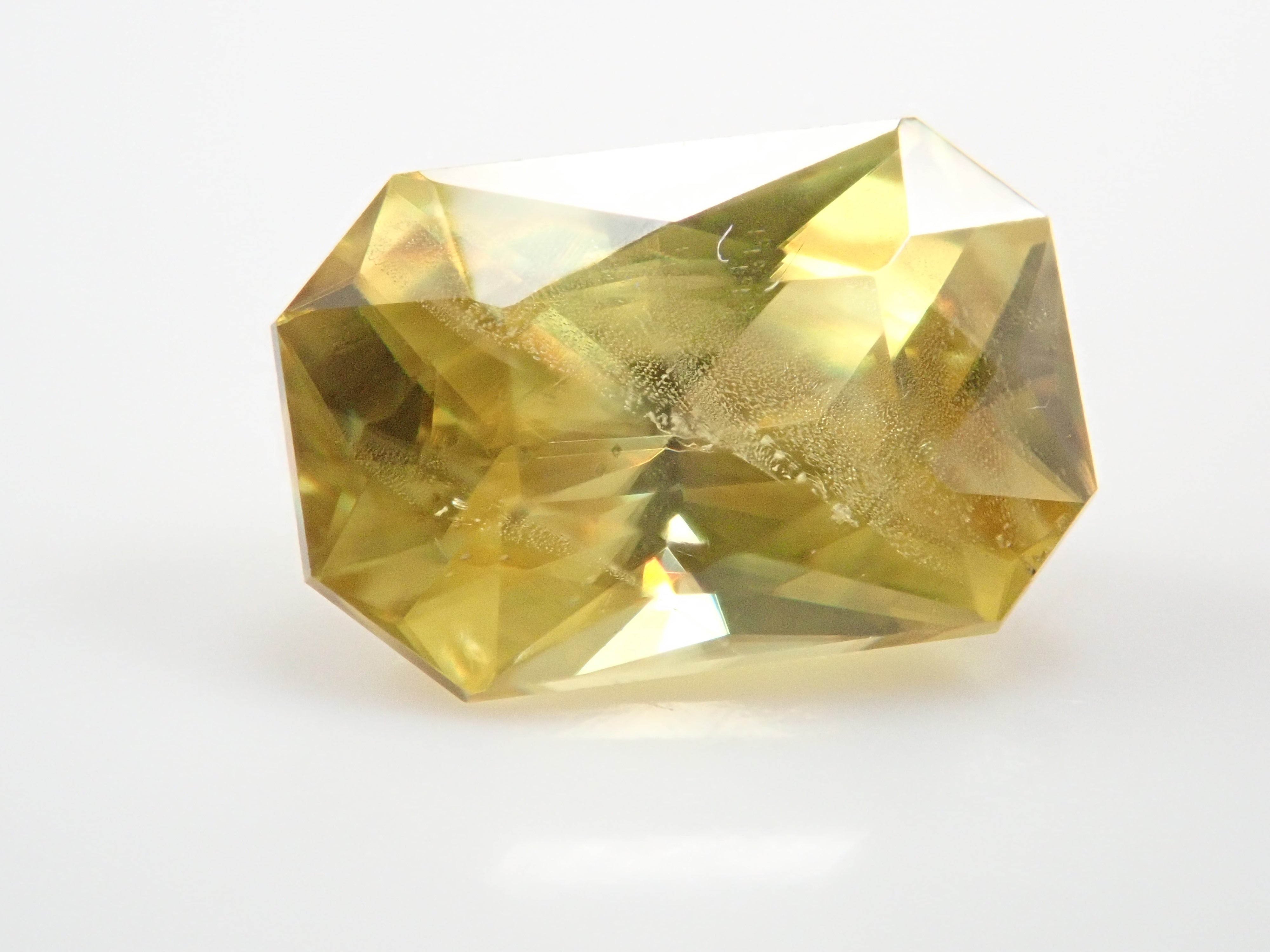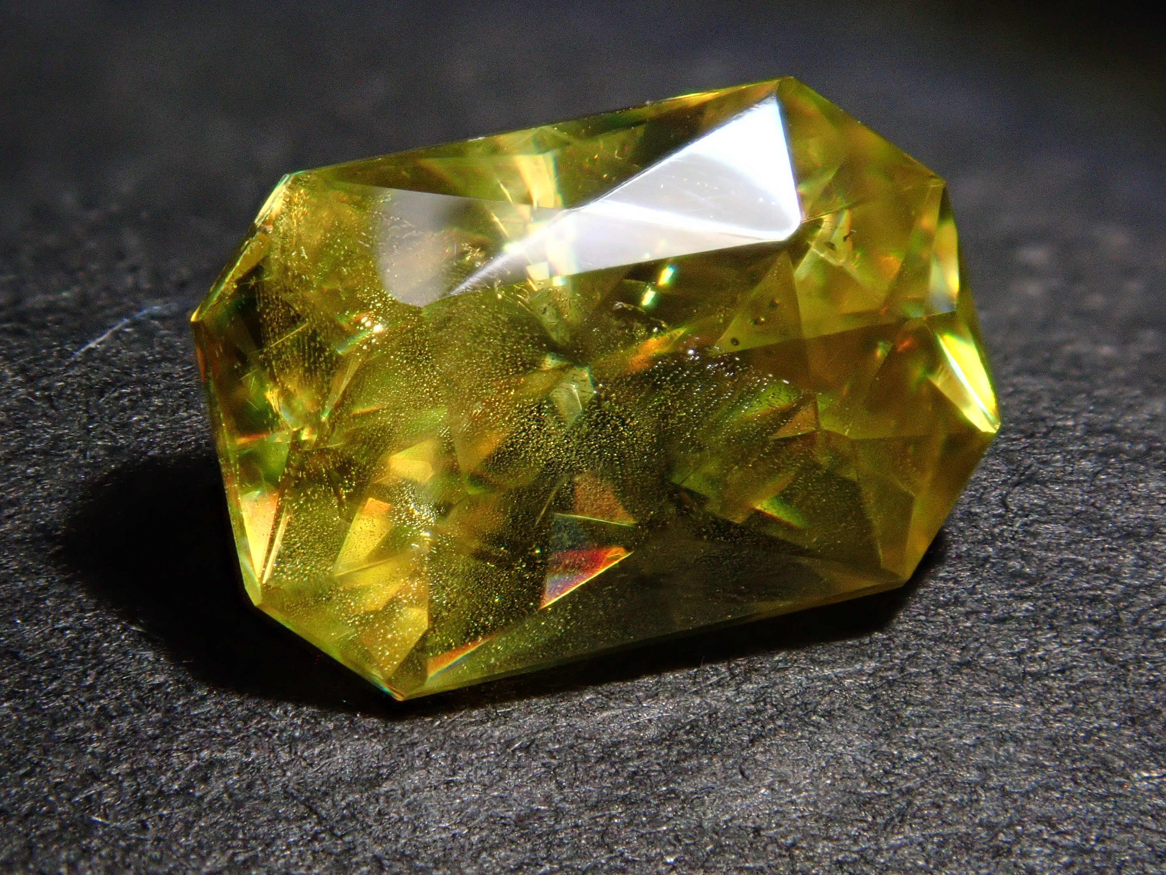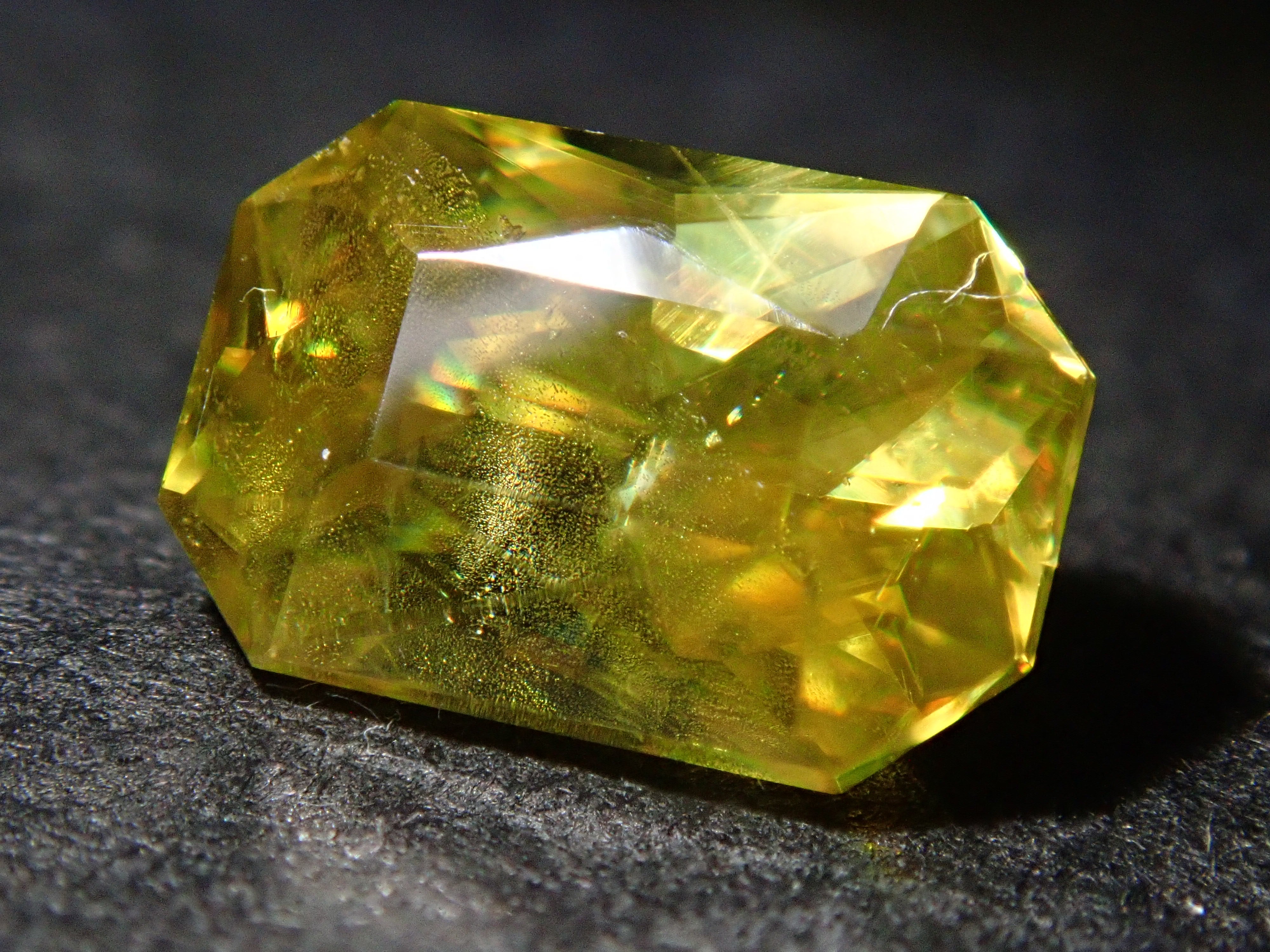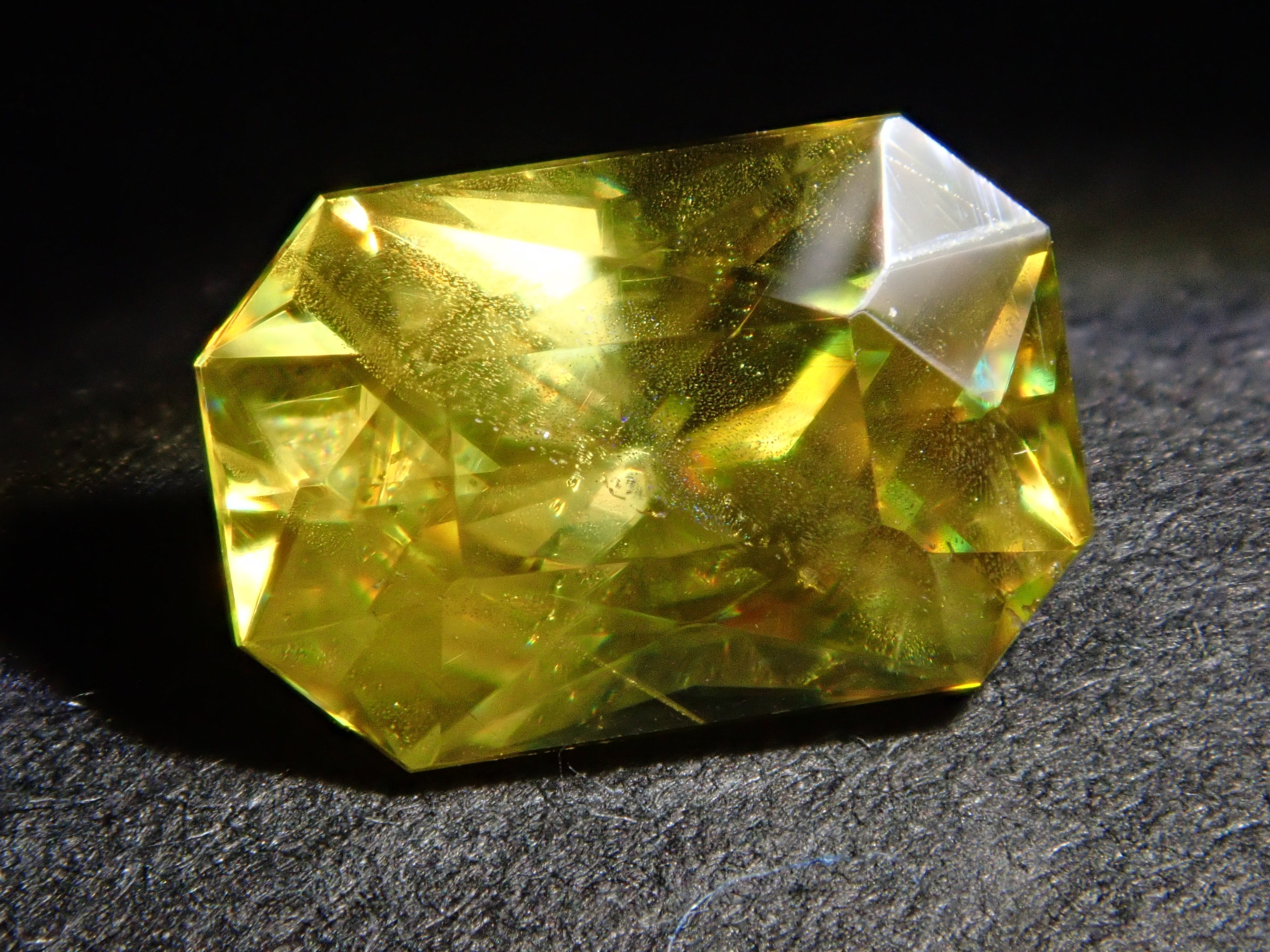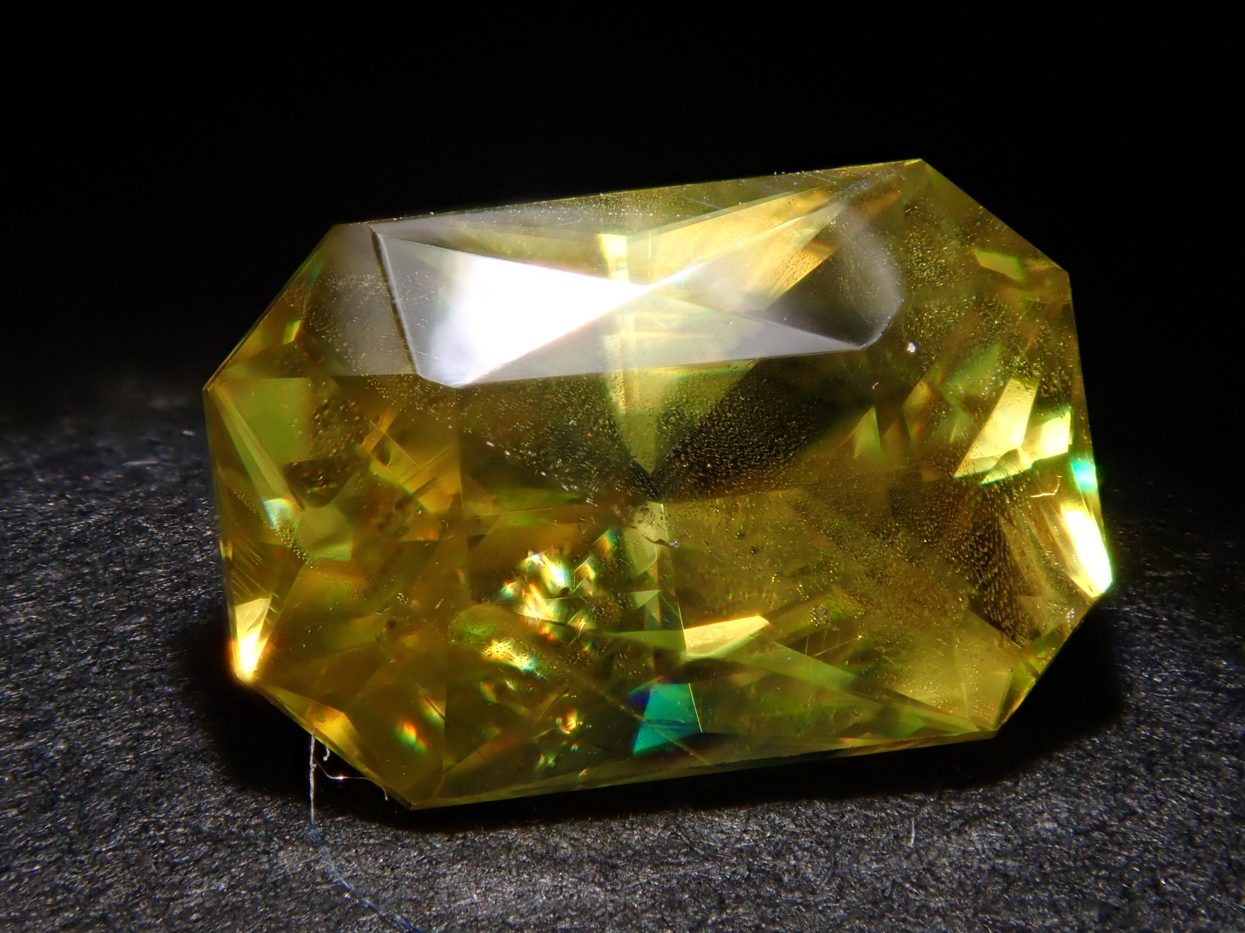 榍石散發著金色的光芒和絢麗的火彩。它是一種魅力十足的寶石,其火彩比鑽石更濃烈,越來越受到收藏家的青睞。榍石的光芒會隨著角度的變化而產生巨大的變化。不妨試試在陽光下用手掌滾動榍石,仔細觀察它。部分照片是用筆型手電筒拍攝的。