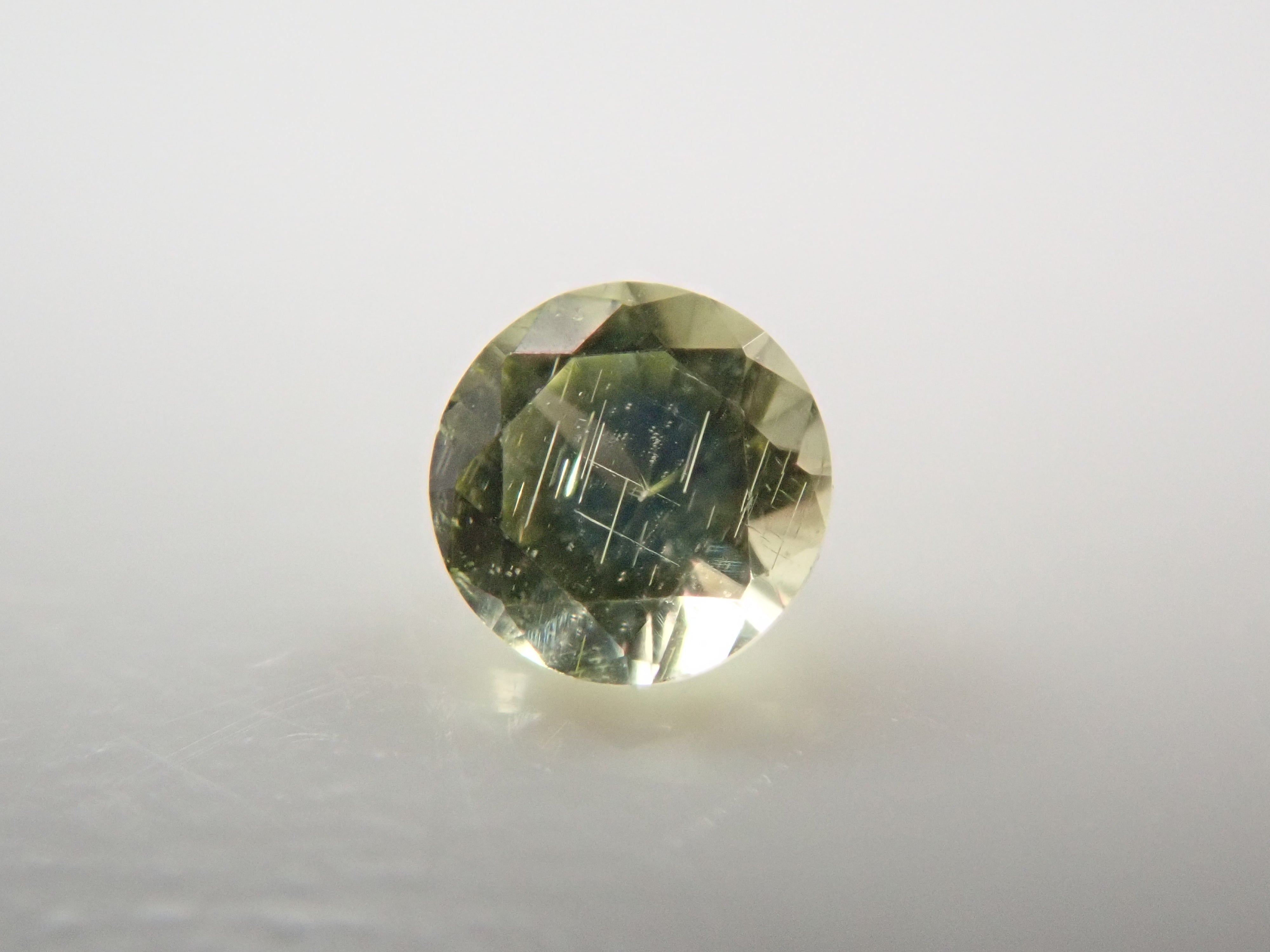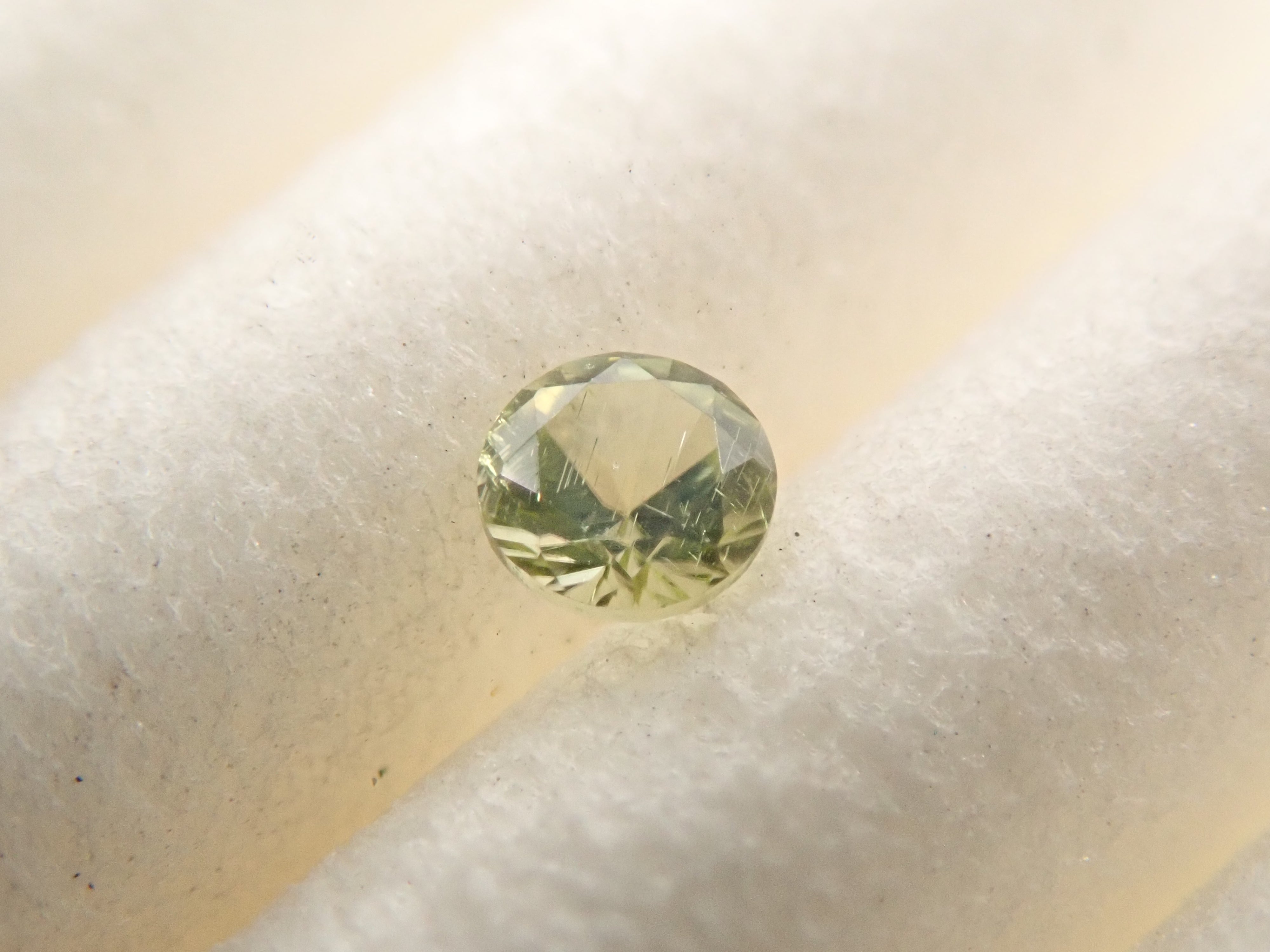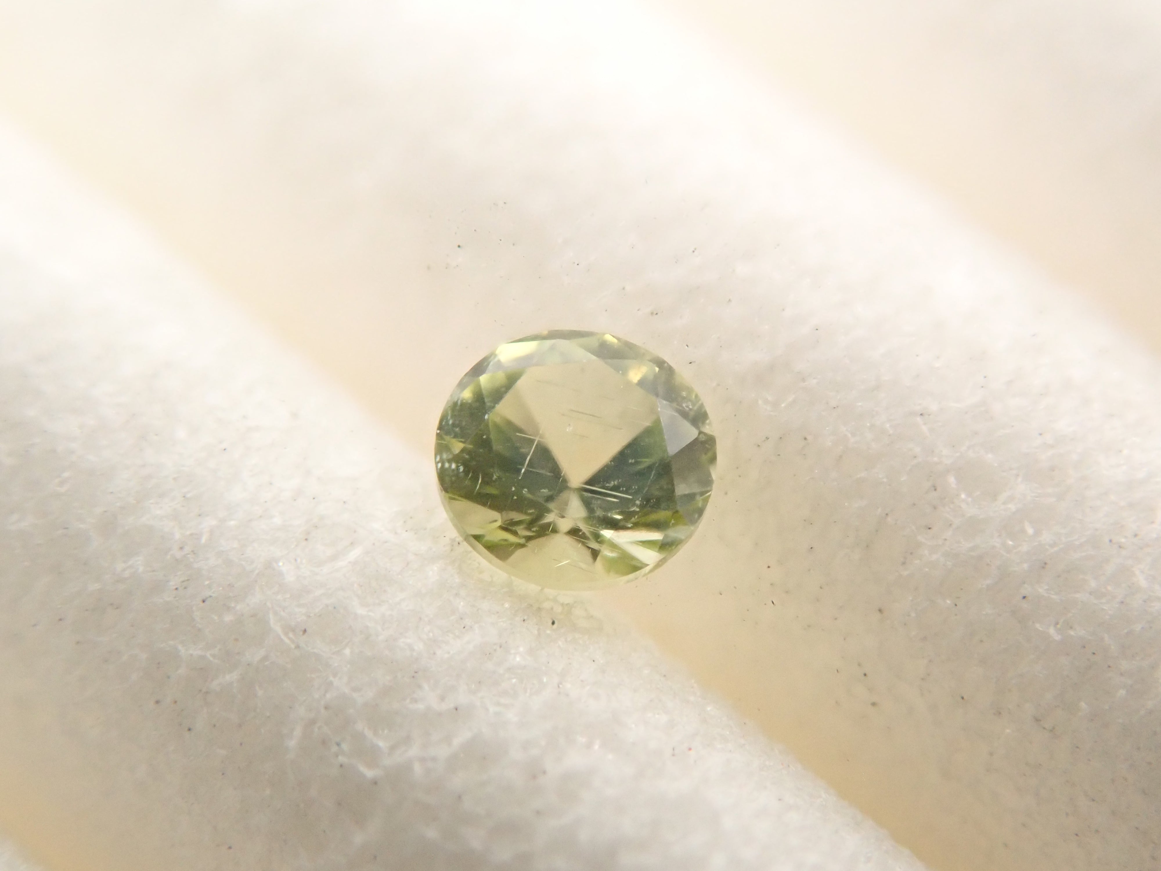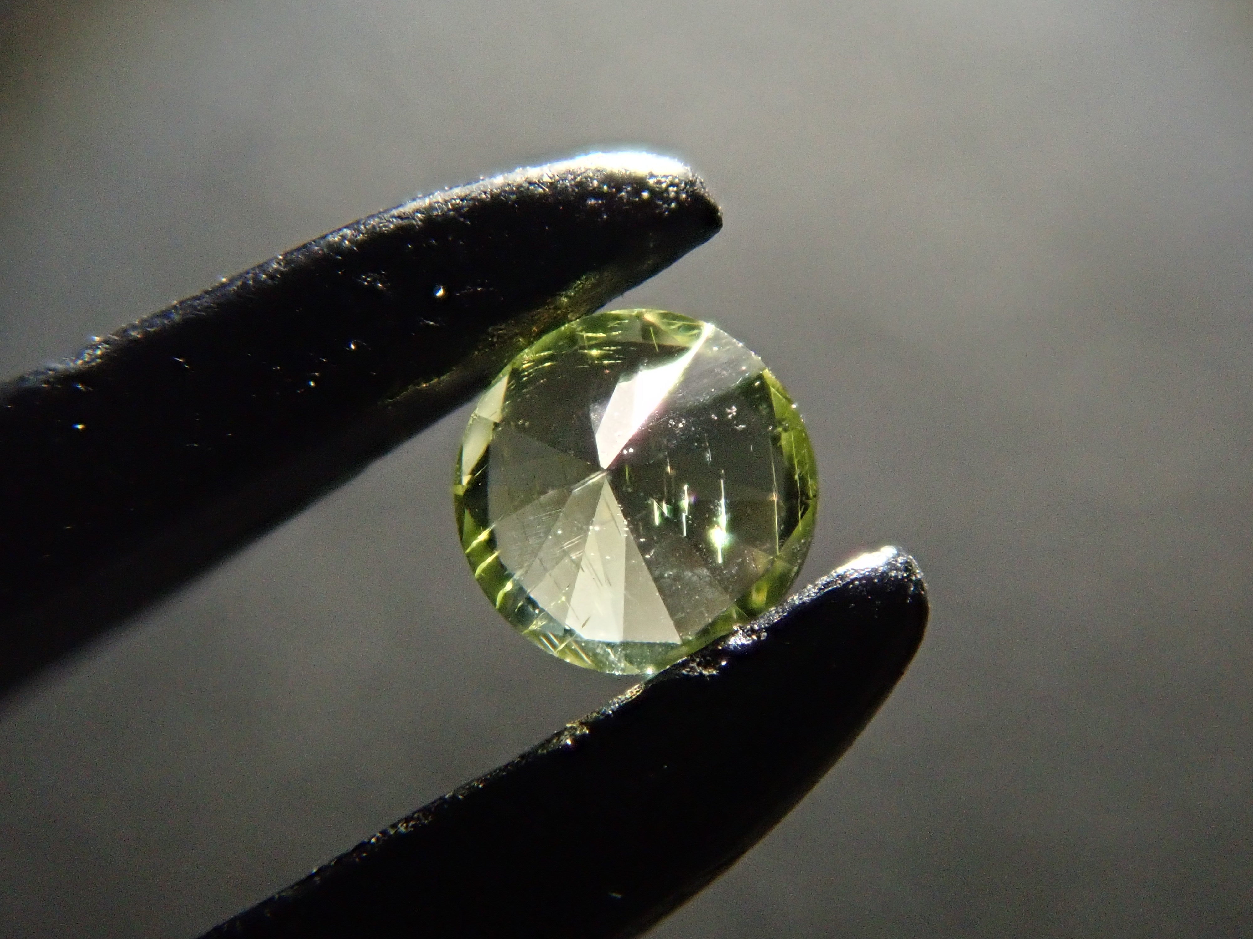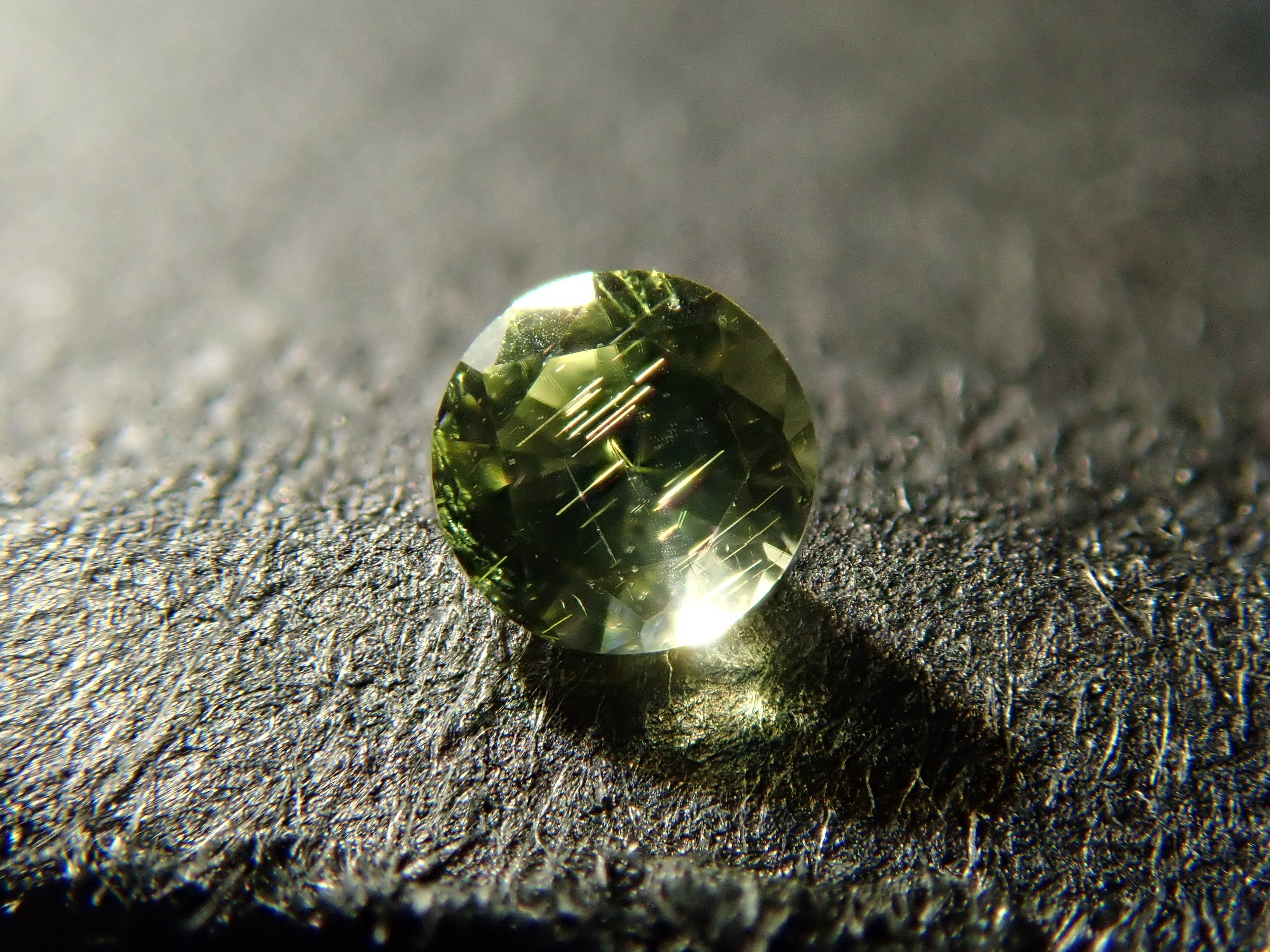橄欖石是著名的八月誕生石。事實上,橄欖石也存在於月球岩石和隕石中。與地球上的橄欖石相比,它們的差異在於比重更大,且內含物和成分獨特。想到它來自遙遠的太空,就讓人覺得它是一種非常神秘的寶石。寄生橄欖石通常體積較小,是一種罕見的寶石,很少會變成散石。這是一顆直徑2.1毫米、透明度極高的圓形切割寄生橄欖石。