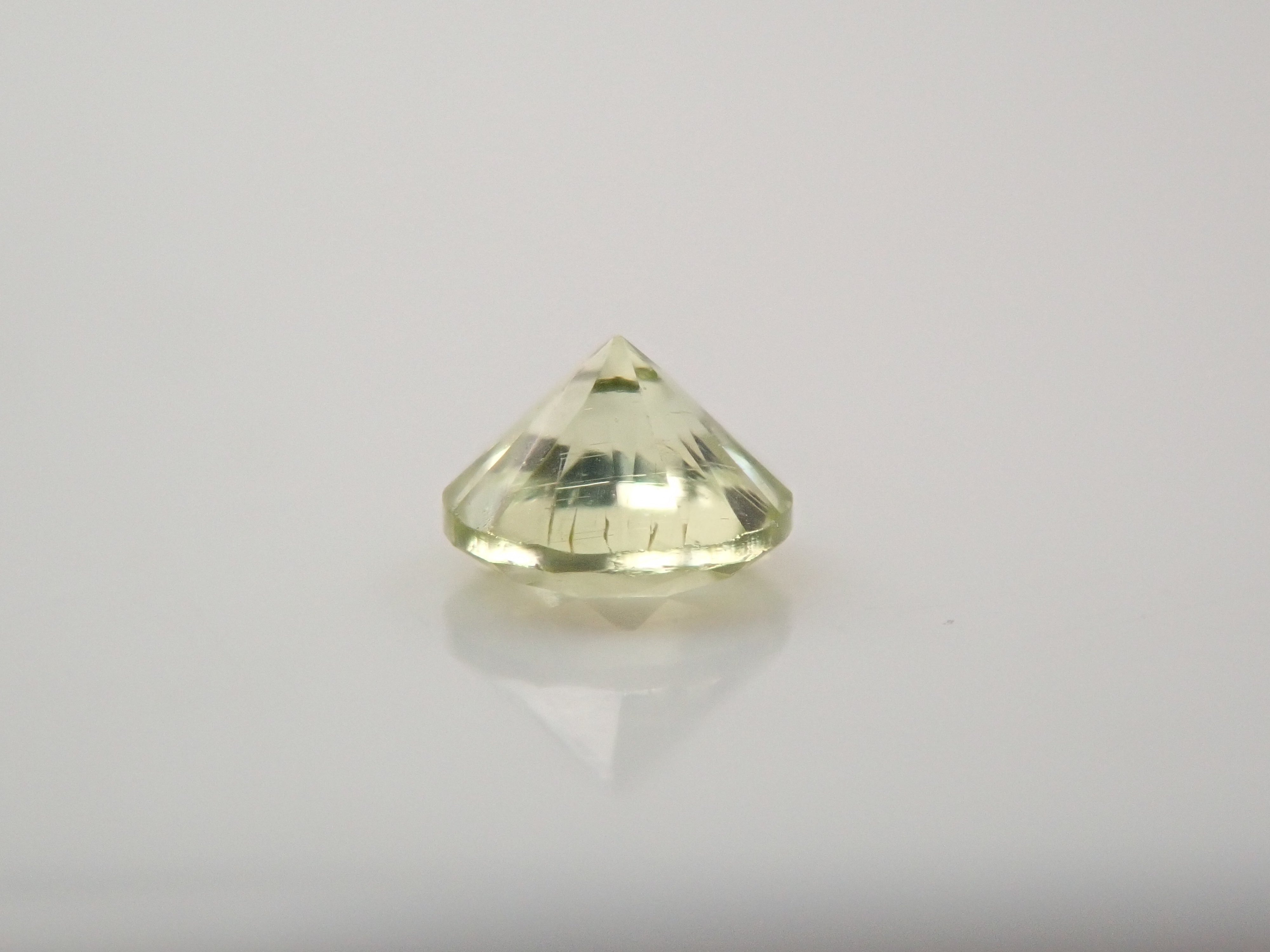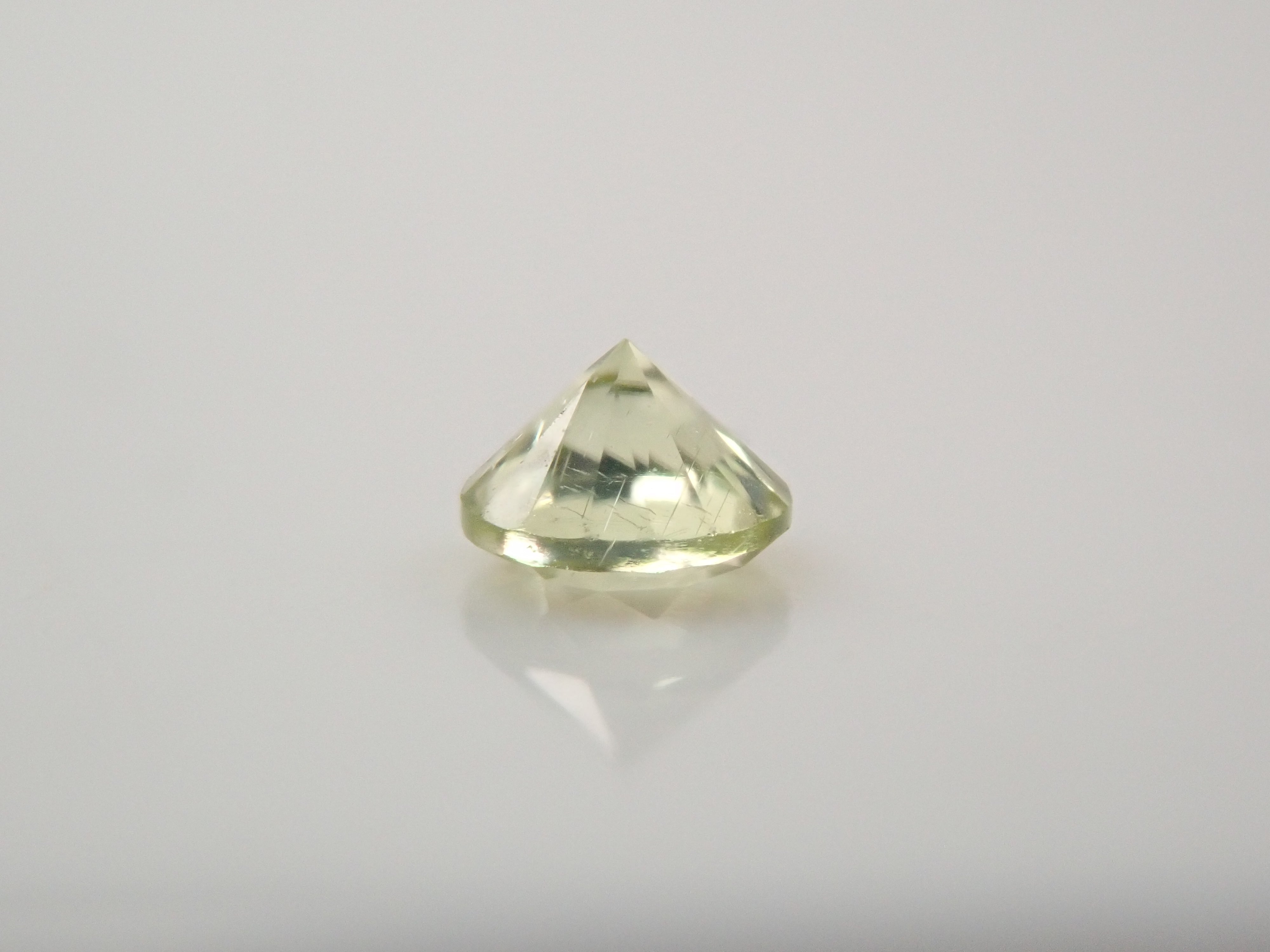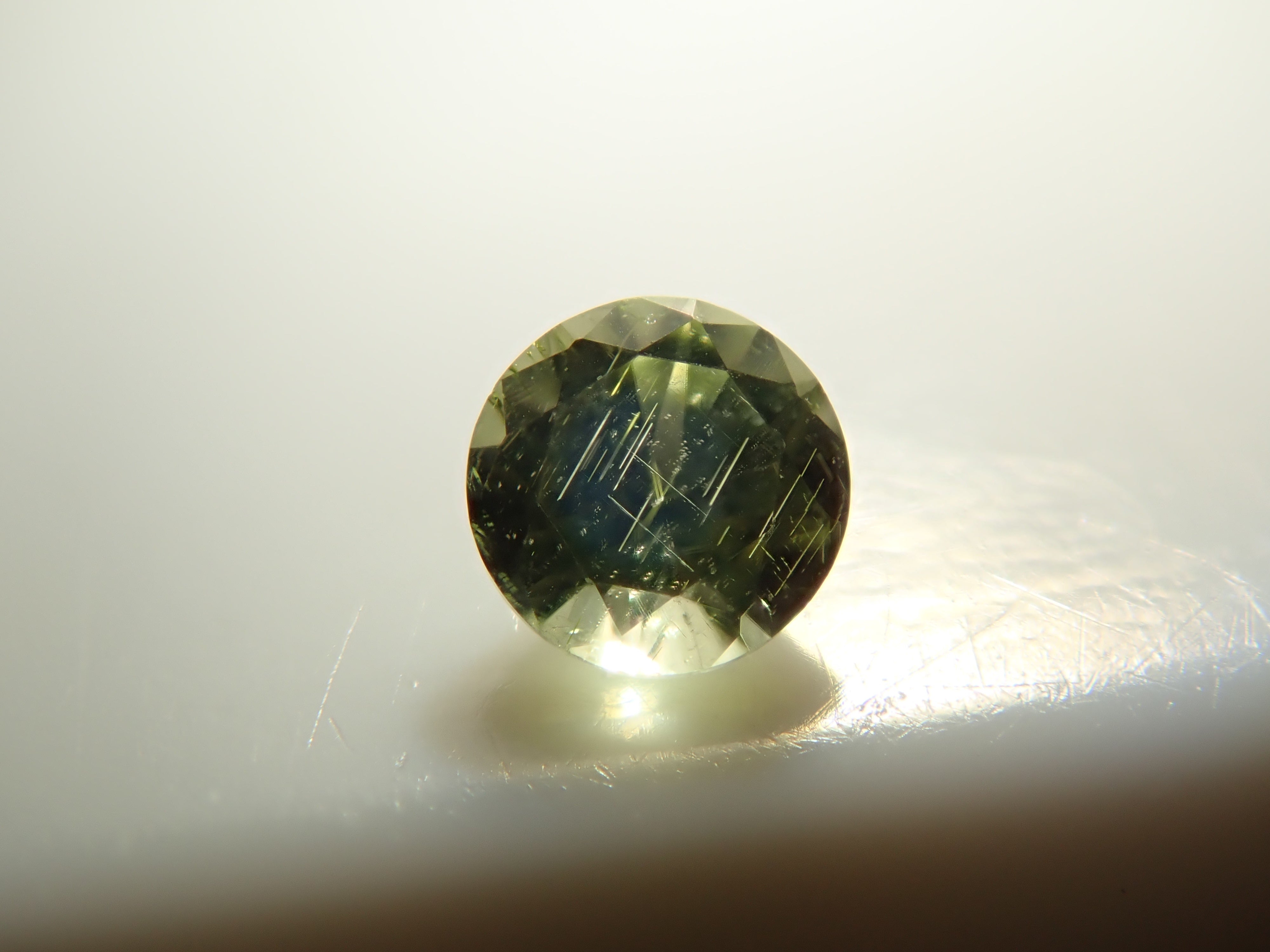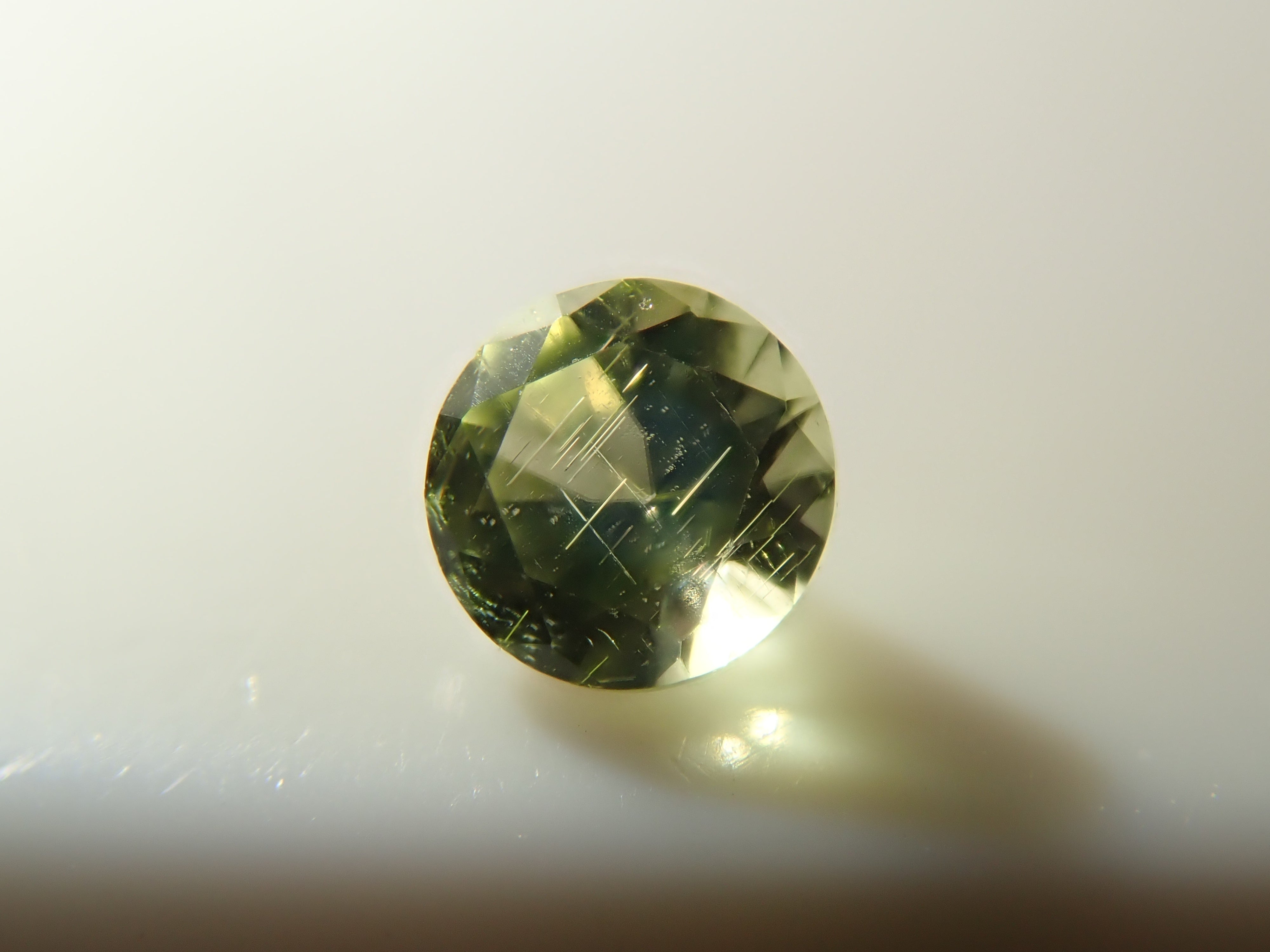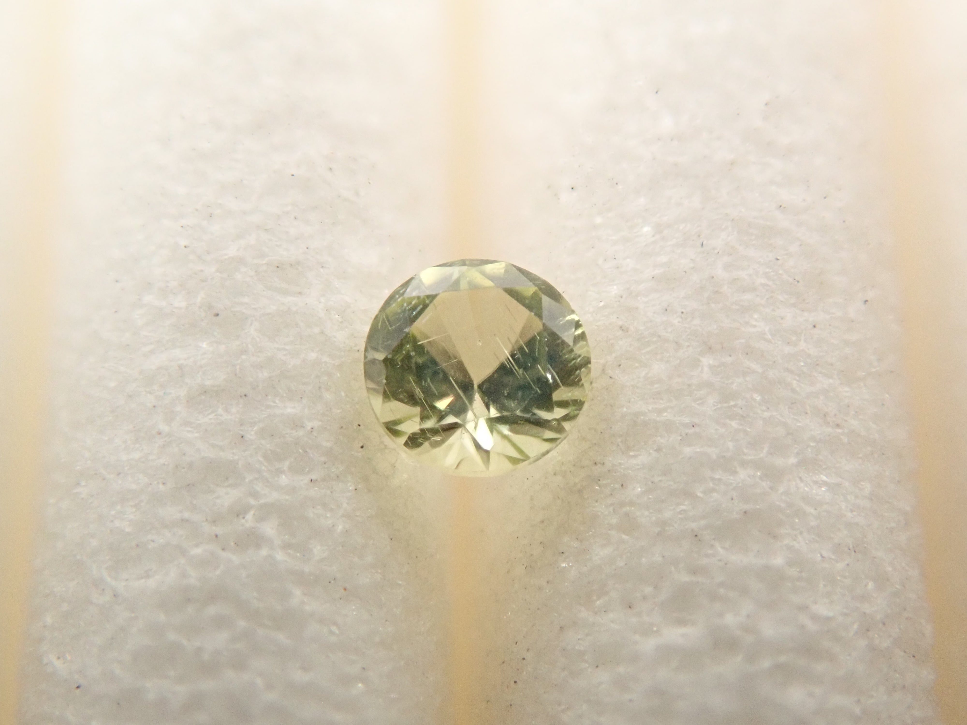 橄欖石是著名的八月誕生石。事實上,橄欖石也存在於月球岩石和隕石中。與地球上的橄欖石相比,它們的差異在於比重更大,且內含物和成分獨特。想到它來自遙遠的太空,就讓人覺得它是一種非常神秘的寶石。寄生橄欖石通常體積較小,是一種罕見的寶石,很少會變成散石。這是一顆直徑2.1毫米、透明度極高的圓形切割寄生橄欖石。