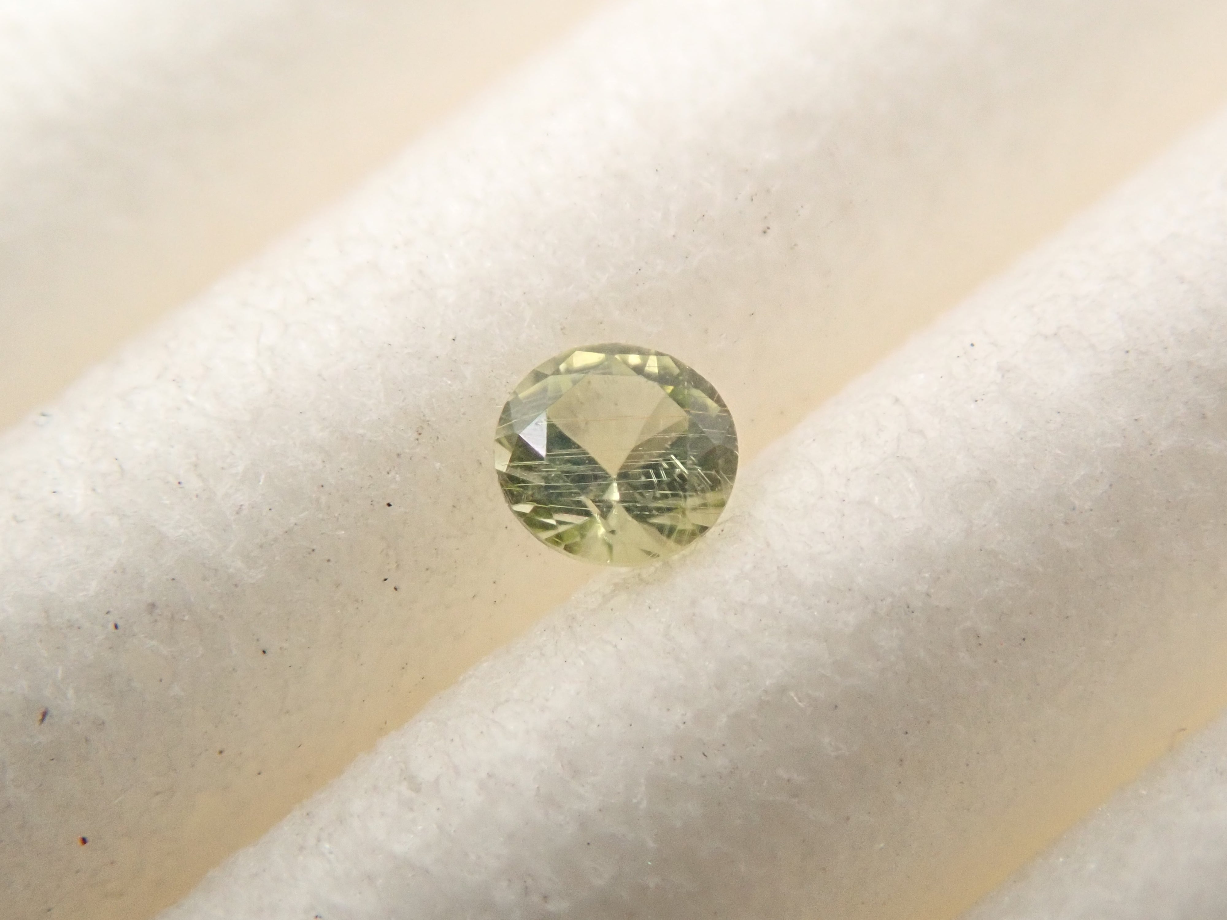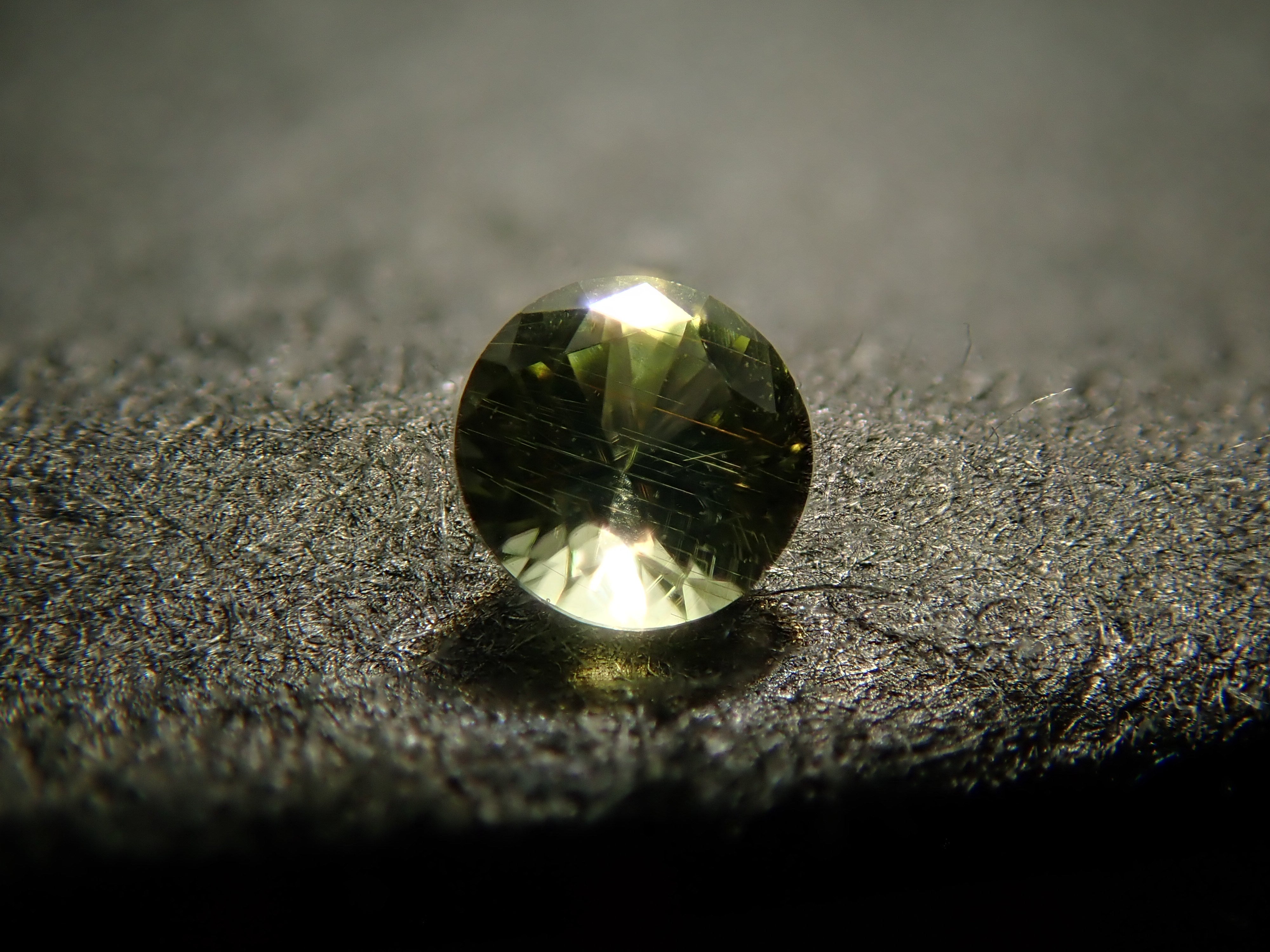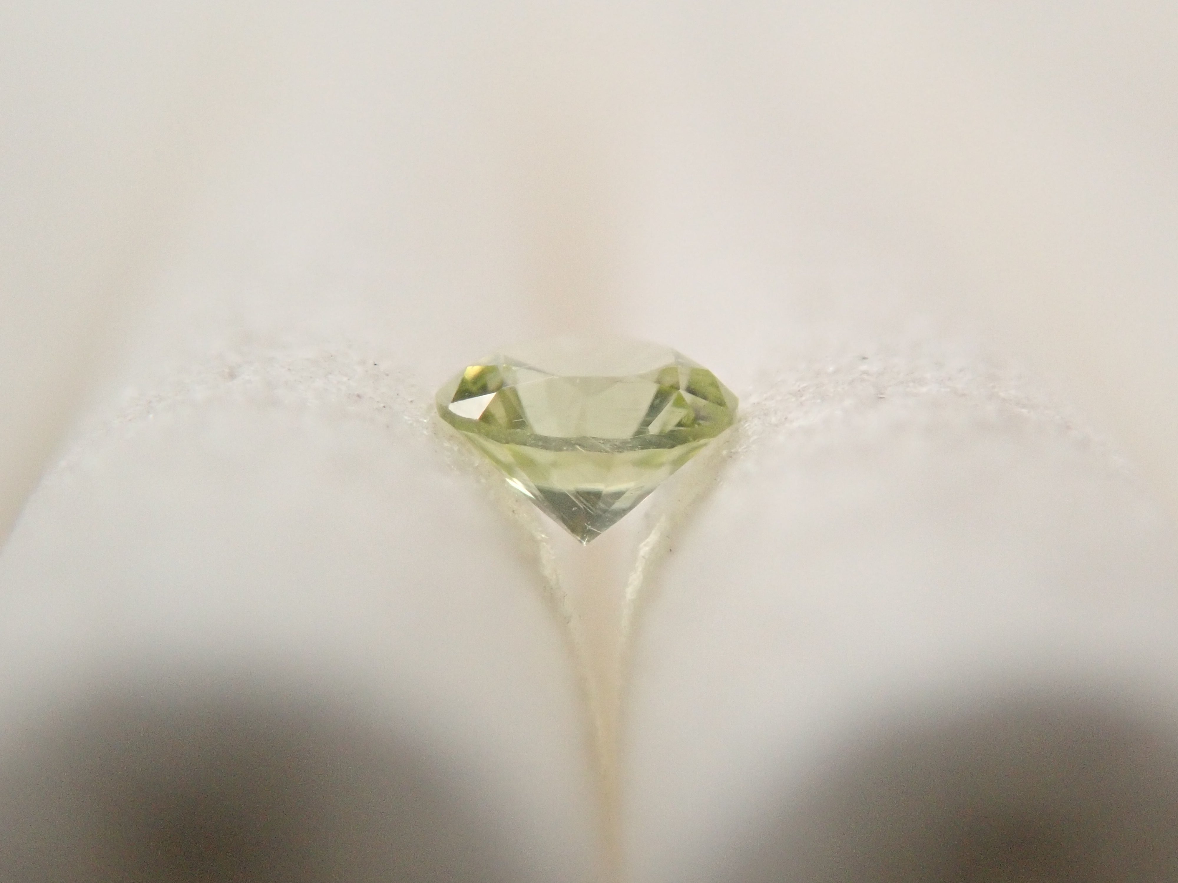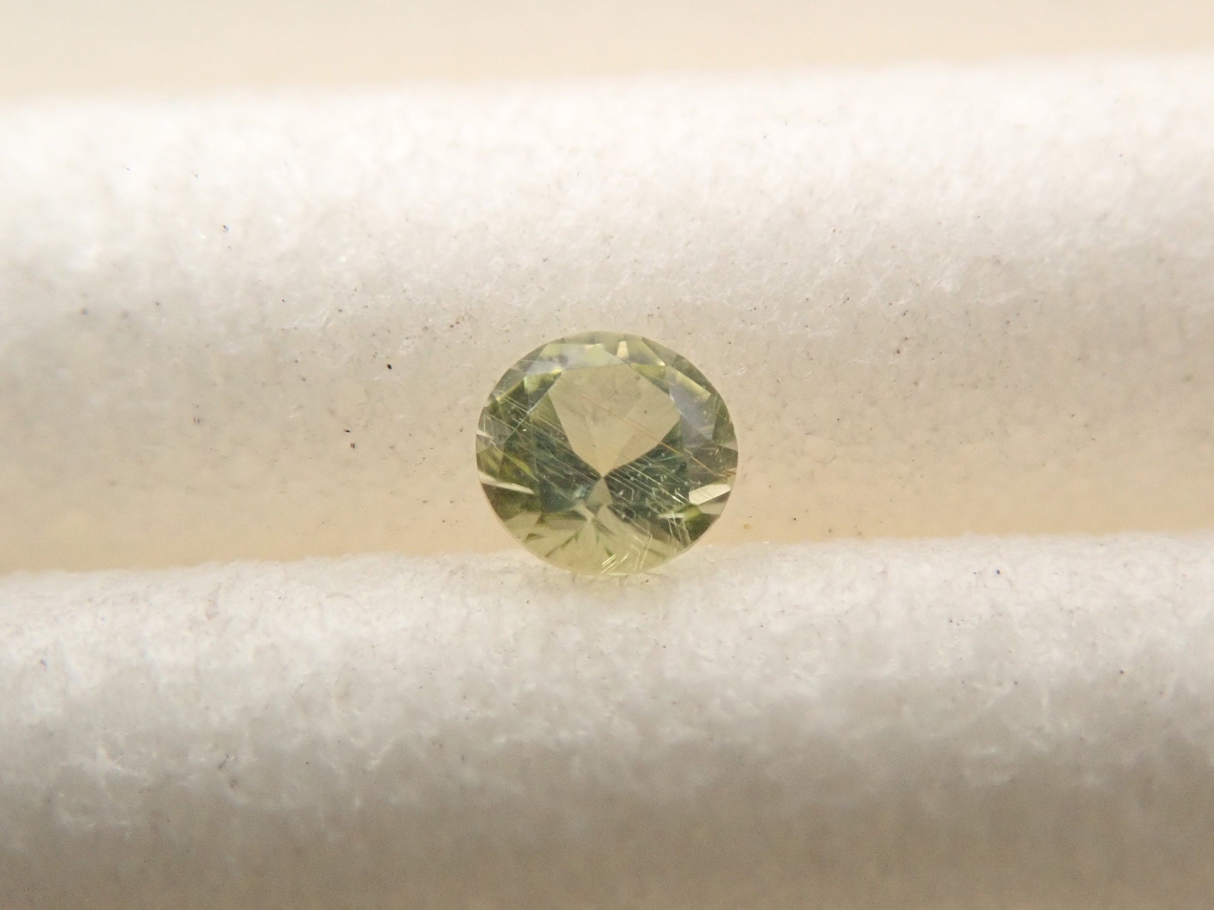 橄欖石是著名的八月誕生石。事實上,橄欖石也存在於月球岩石和隕石中。與地球上的橄欖石相比,它們的差異在於比重更大,且內含物和成分獨特。想到它來自遙遠的太空,就讓人覺得它是一種非常神秘的寶石。寄生橄欖石通常體積較小,是一種罕見的寶石,很少會變成散石。這是一顆直徑2.1毫米、透明度極高的圓形切割寄生橄欖石。