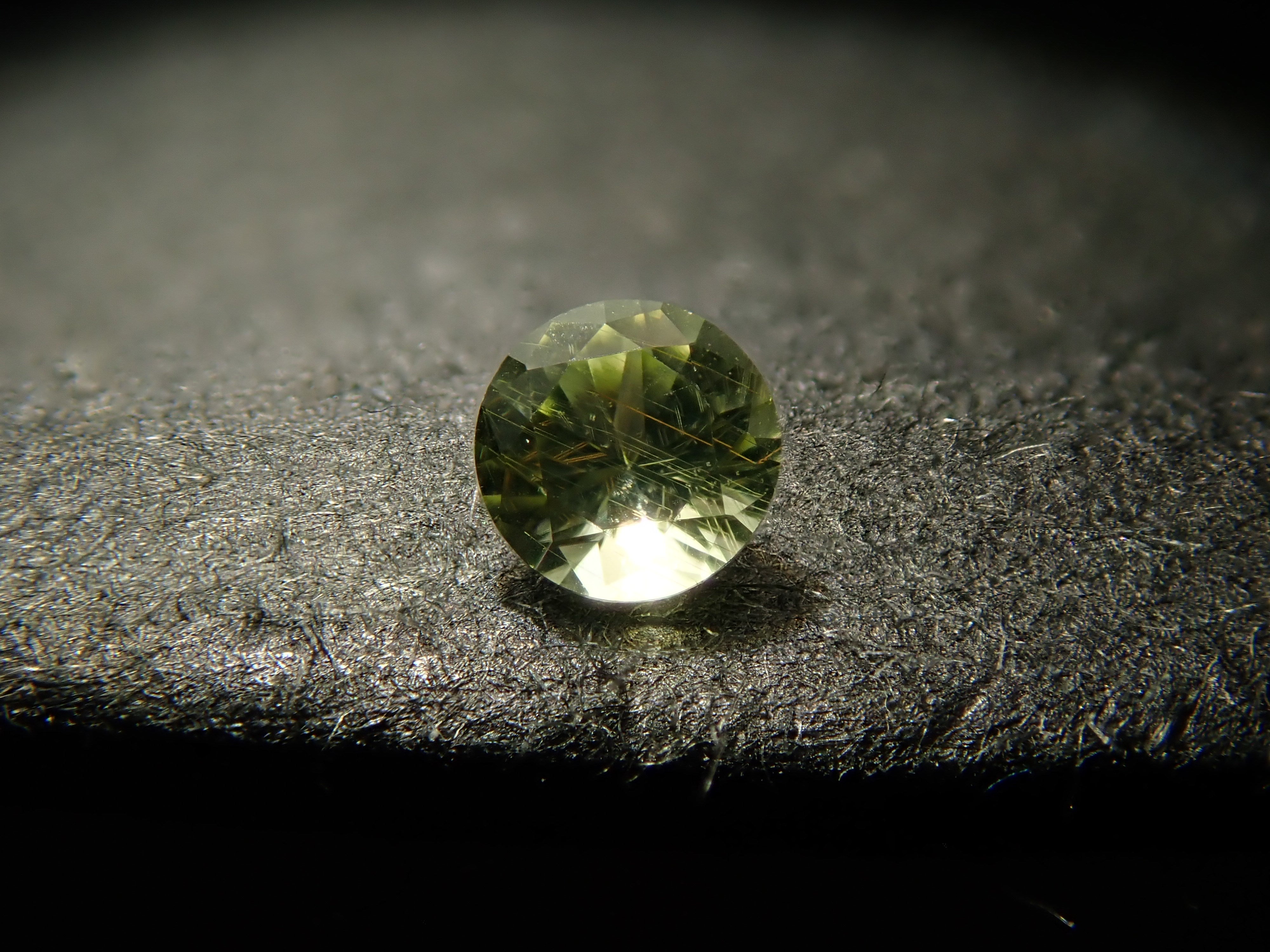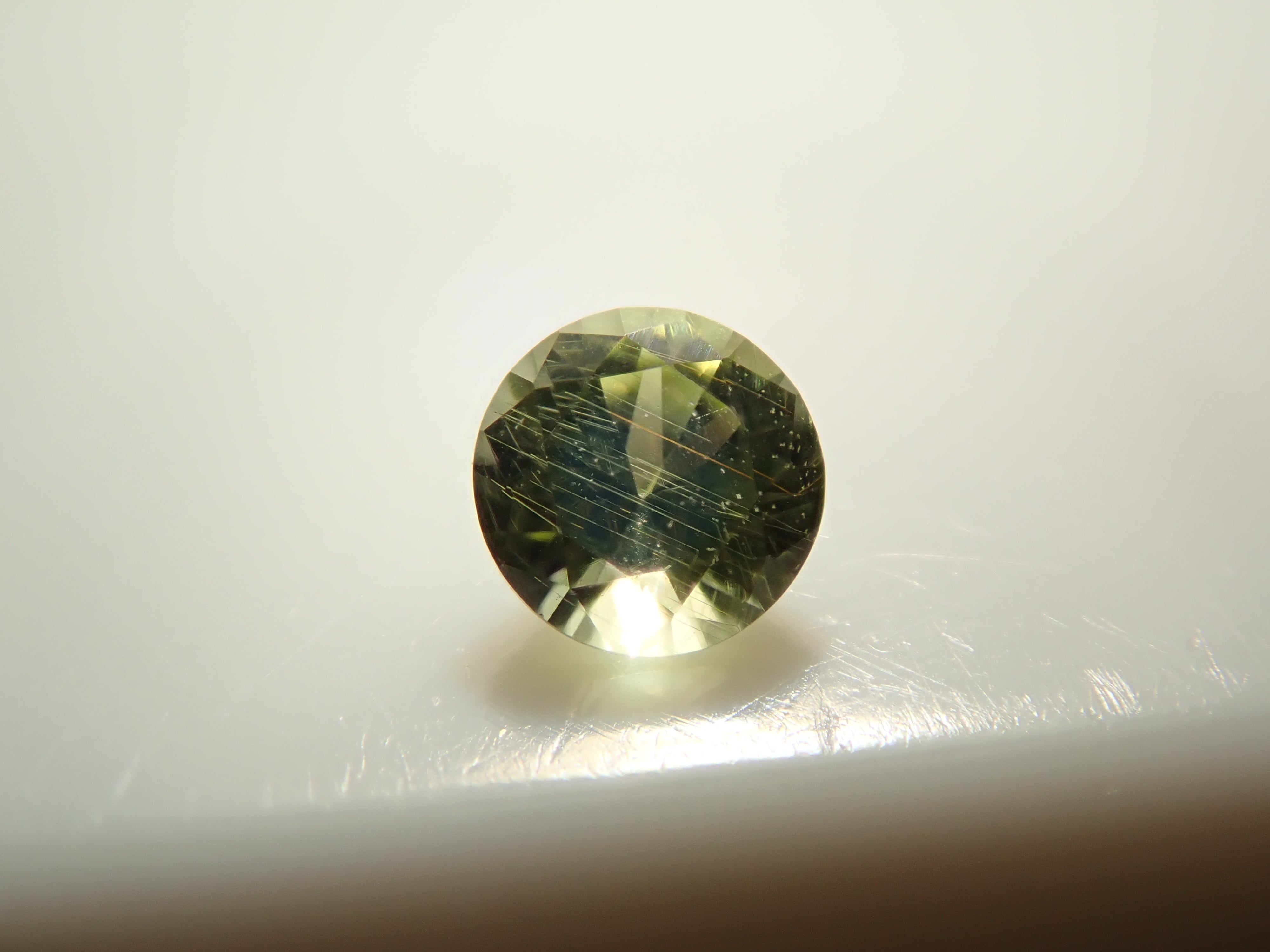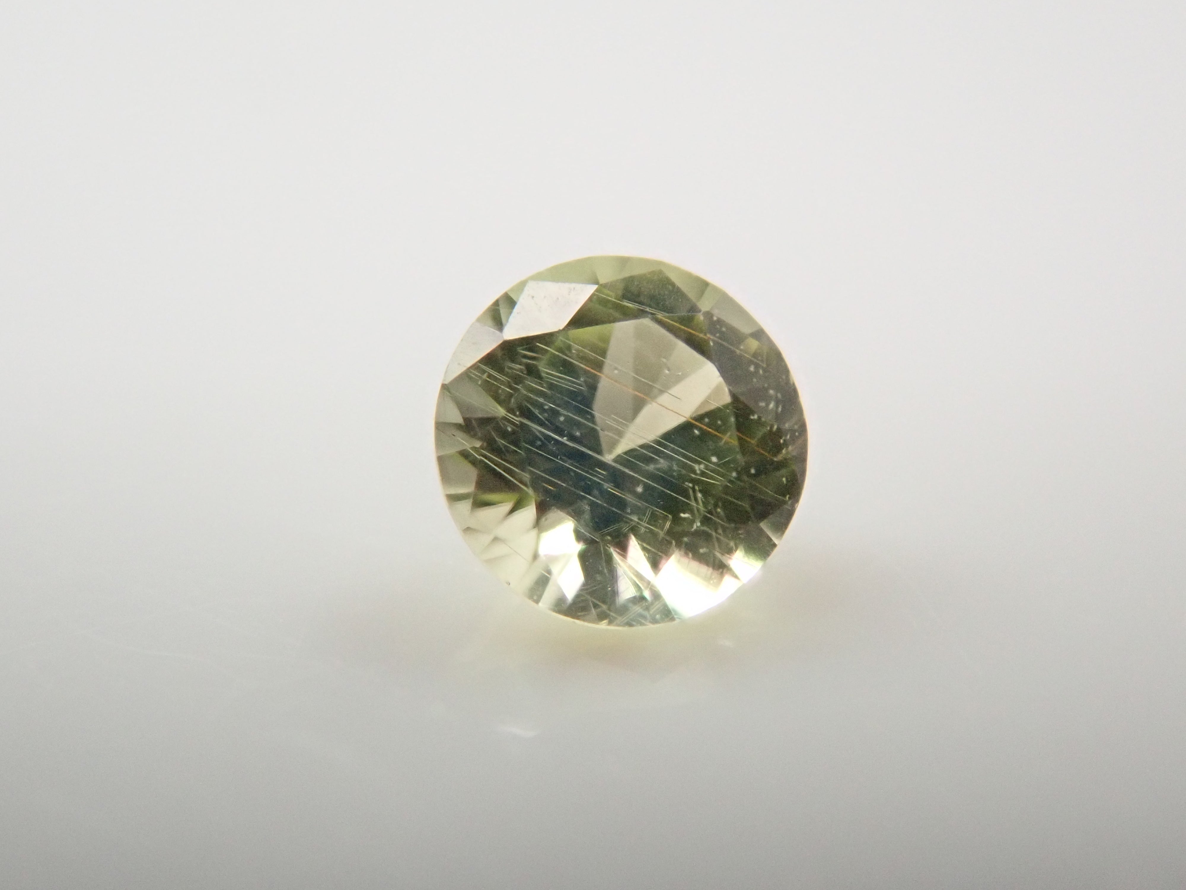 橄欖石是著名的八月誕生石。事實上,橄欖石也存在於月球岩石和隕石中。與地球上的橄欖石相比,它們的差異在於比重更大,且內含物和成分獨特。想到它來自遙遠的太空,就讓人覺得它是一種非常神秘的寶石。寄生橄欖石通常體積較小,是一種罕見的寶石,很少會變成散石。這是一顆直徑2.1毫米、透明度極高的圓形切割寄生橄欖石。