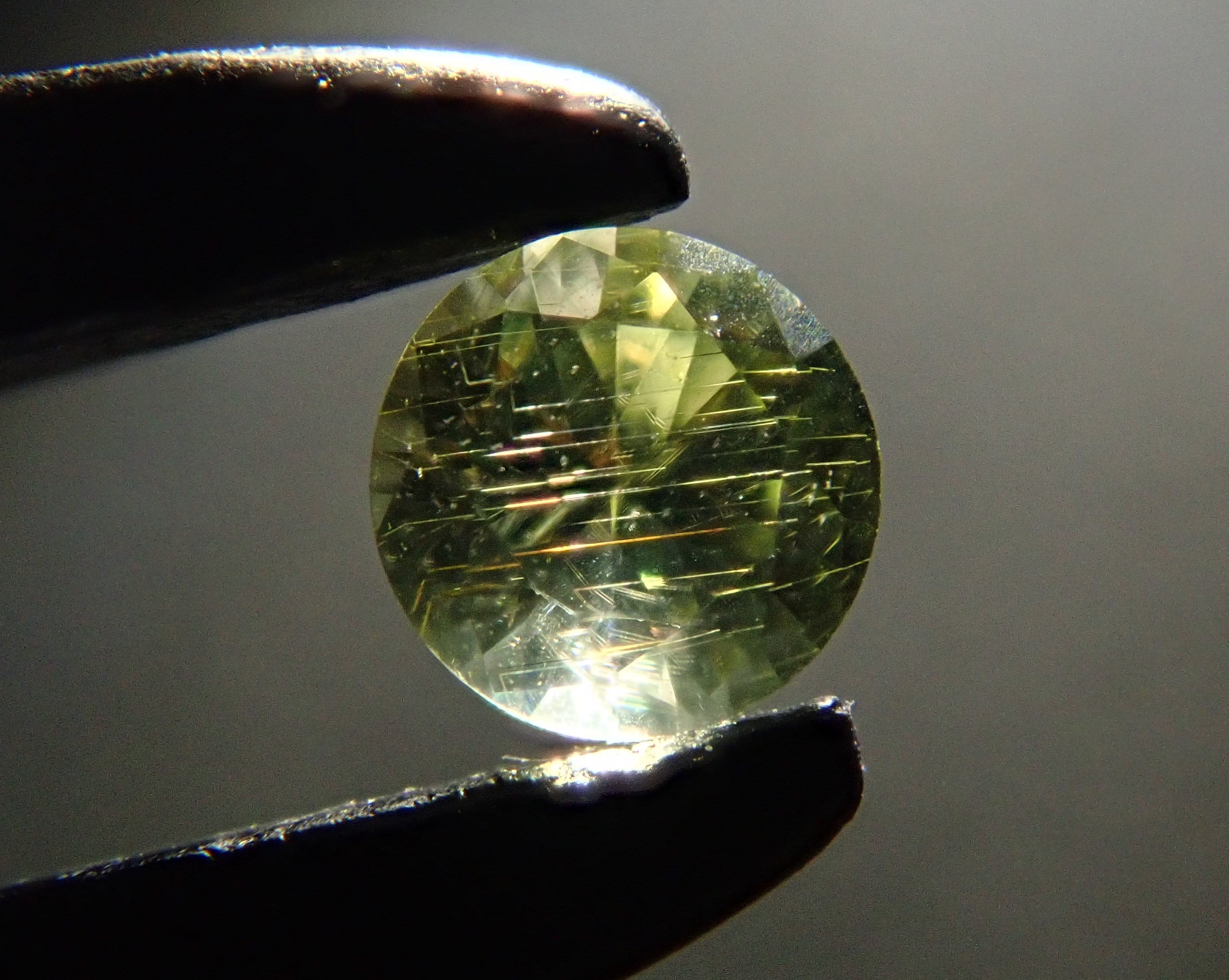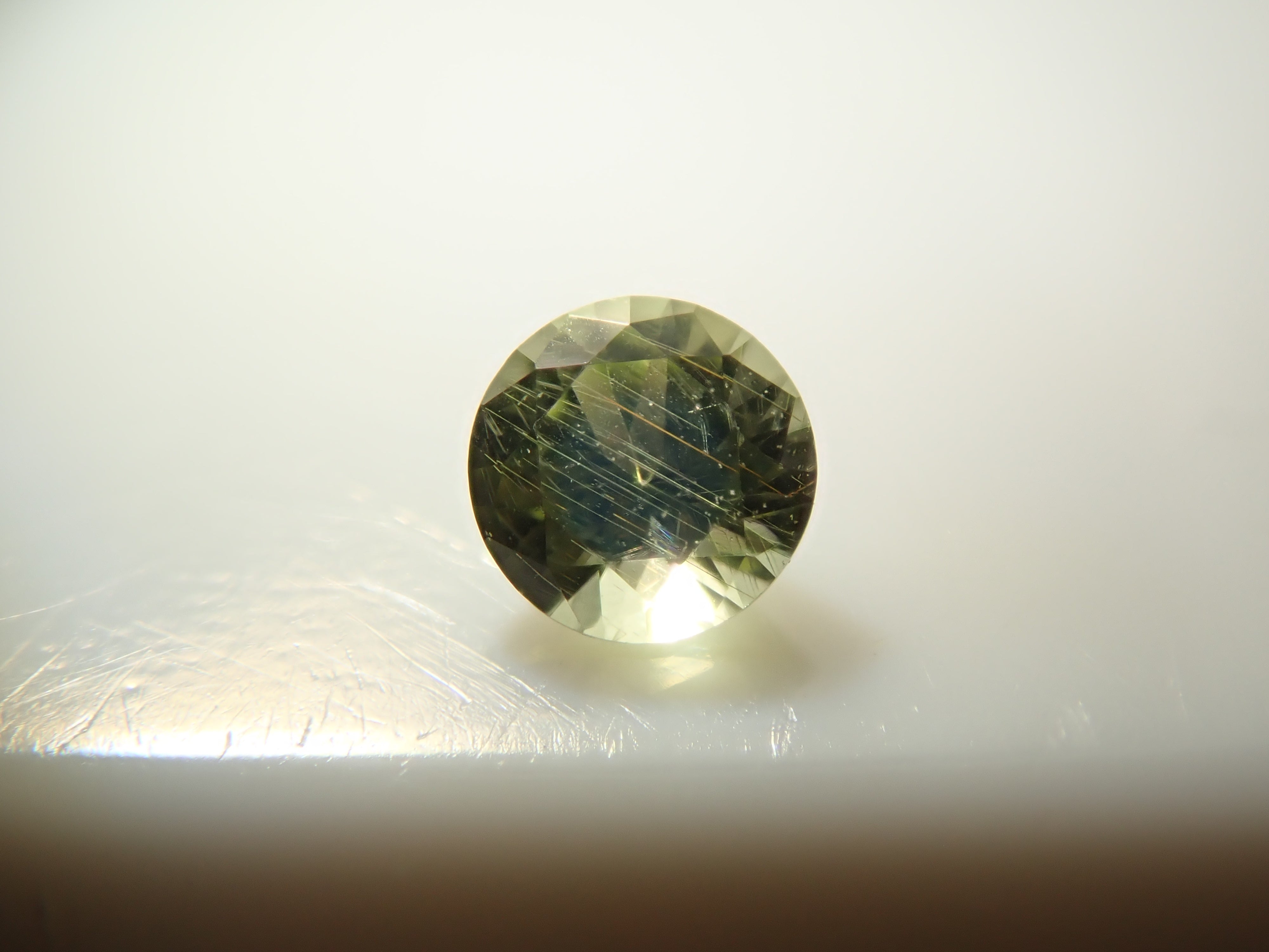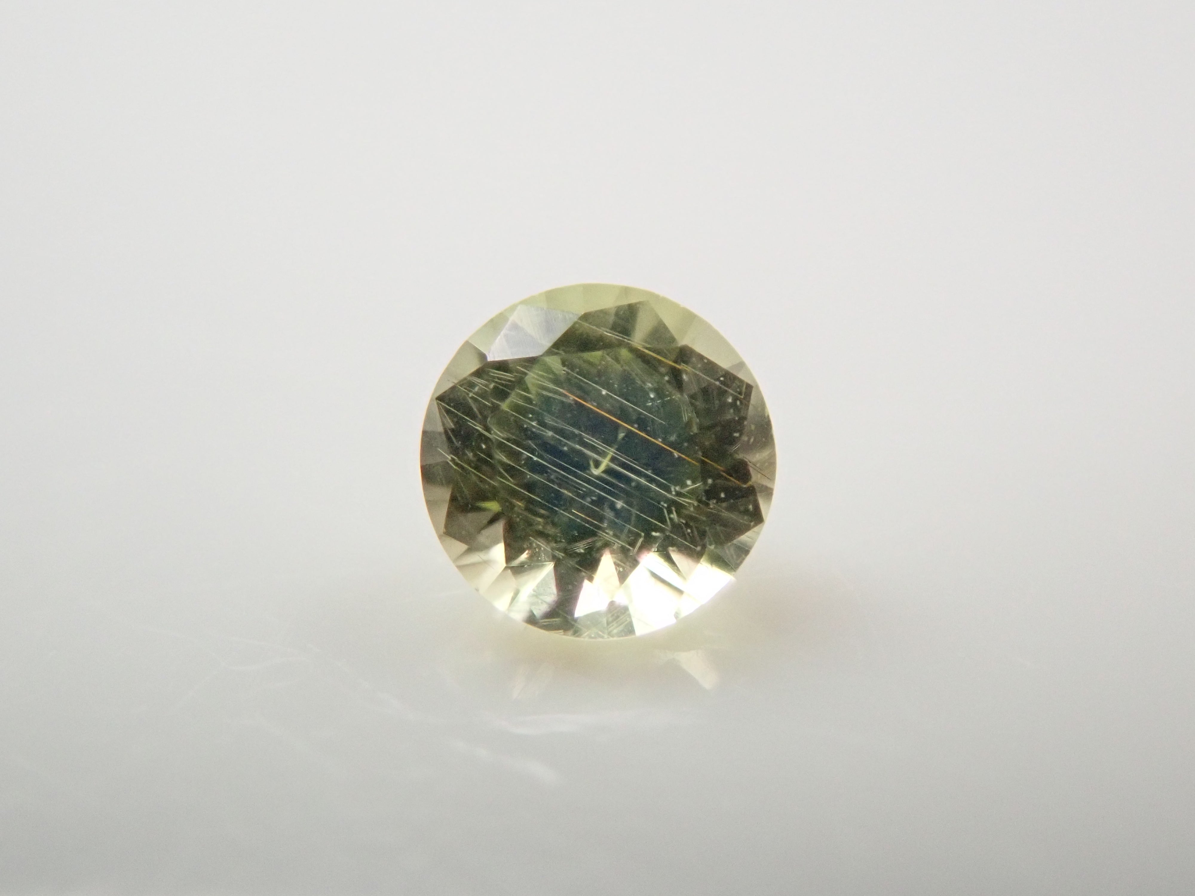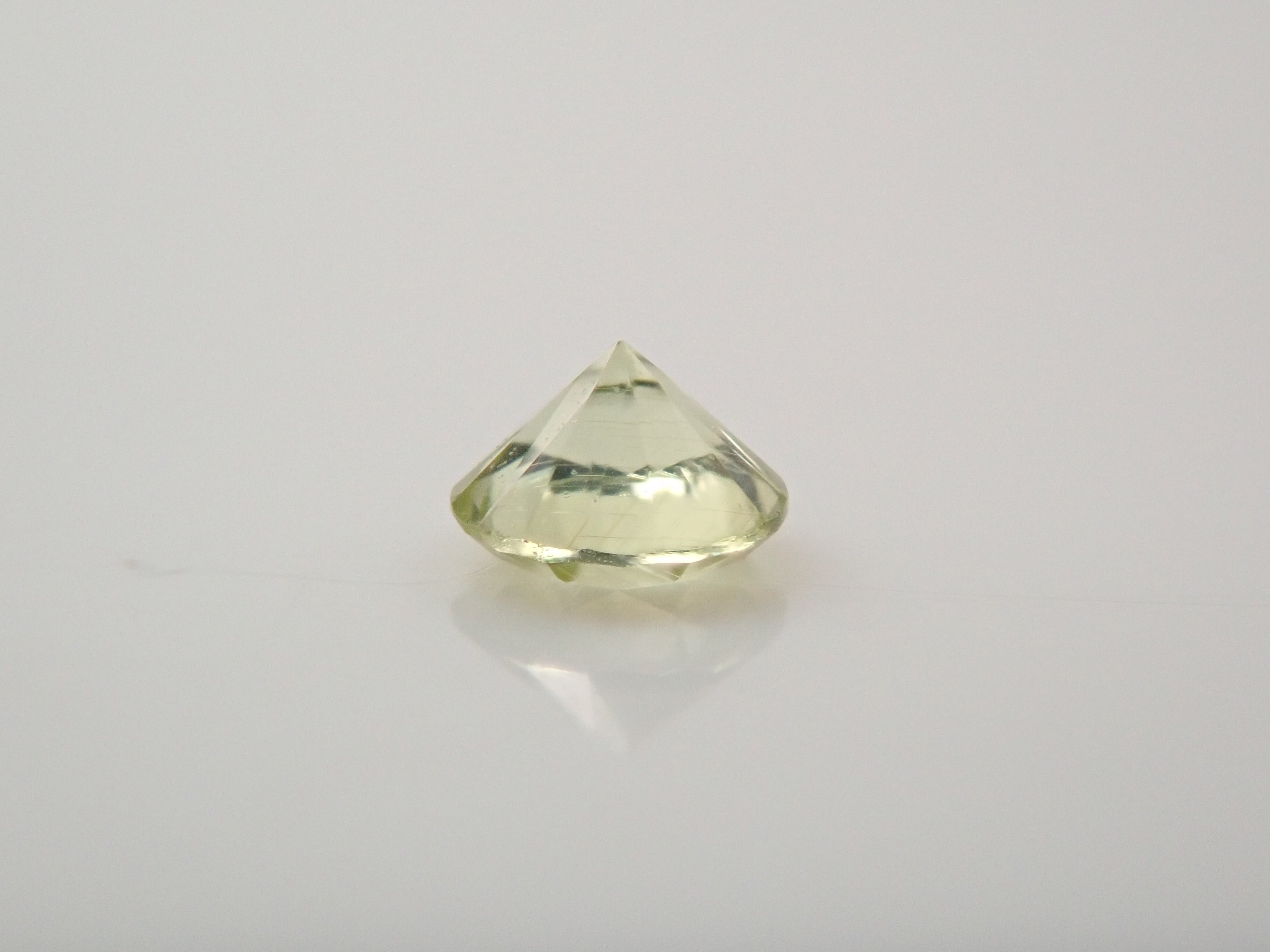 橄欖石是著名的八月誕生石。事實上,橄欖石也存在於月球岩石和隕石中。與地球上的橄欖石相比,它們的差異在於比重更大,且內含物和成分獨特。想到它來自遙遠的太空,就讓人覺得它是一種非常神秘的寶石。寄生橄欖石通常體積較小,是一種罕見的寶石,很少會變成散石。這是一顆直徑2.1毫米、透明度極高的圓形切割寄生橄欖石。