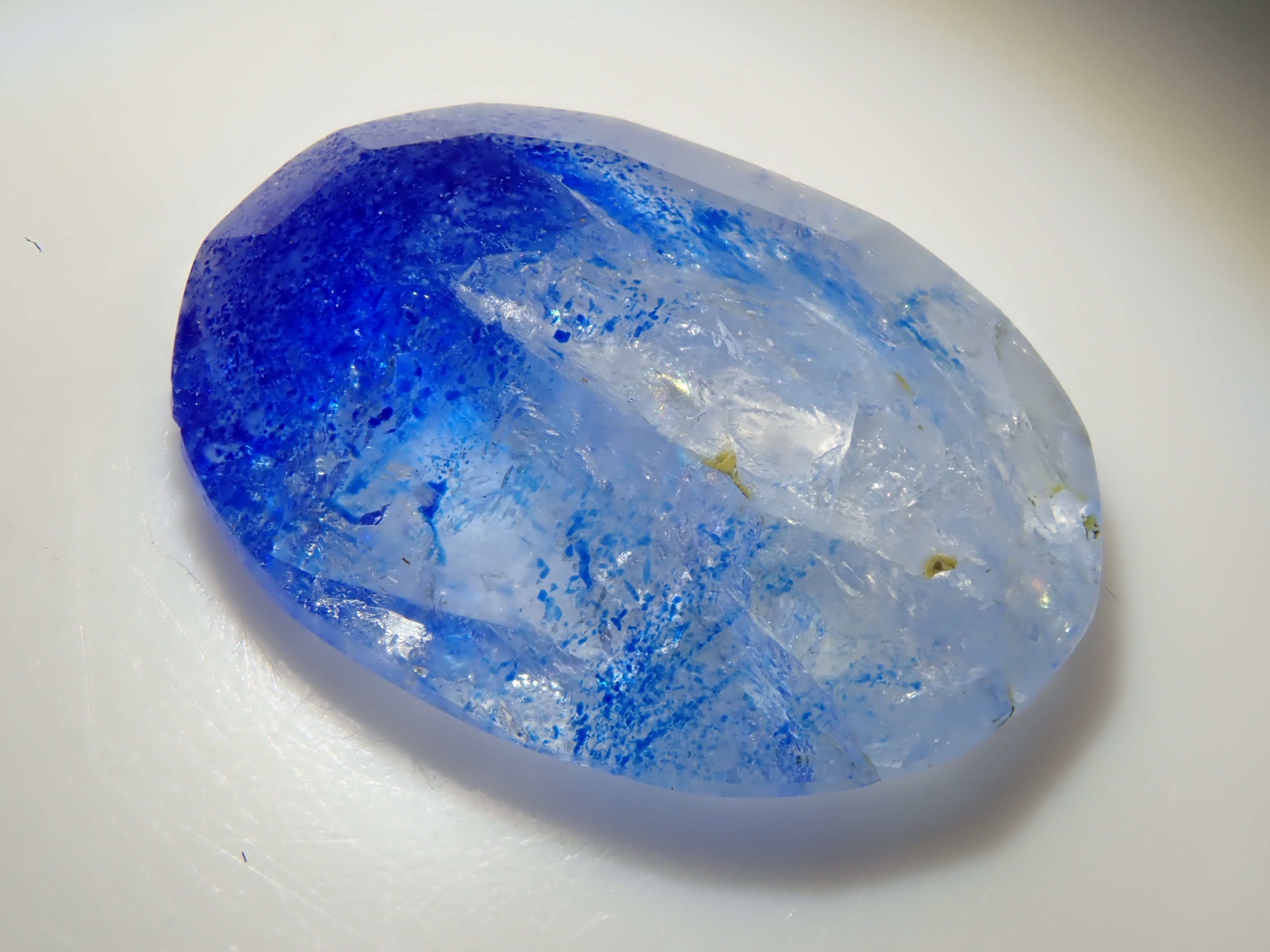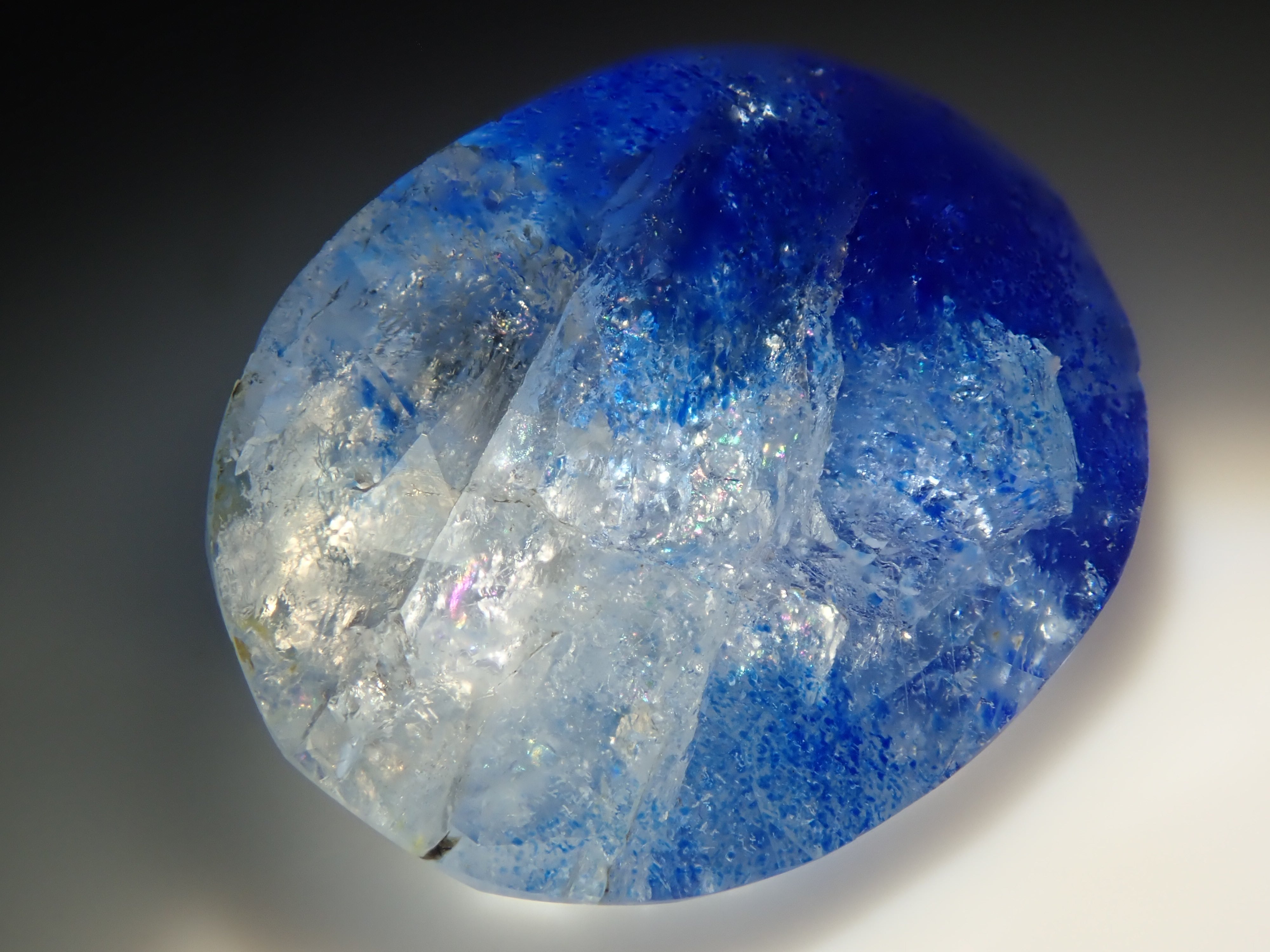 天然方鈉石。顧名思義,它擁有清爽的透明度和如融化的冰塊般柔和的光澤。此外,還有一種淡藍色的方鈉石,名副其實地被稱為「蘇打」。這是一種光是看著就讓人口渴的寶石。這是一種內部含有青金石的方鈉石。