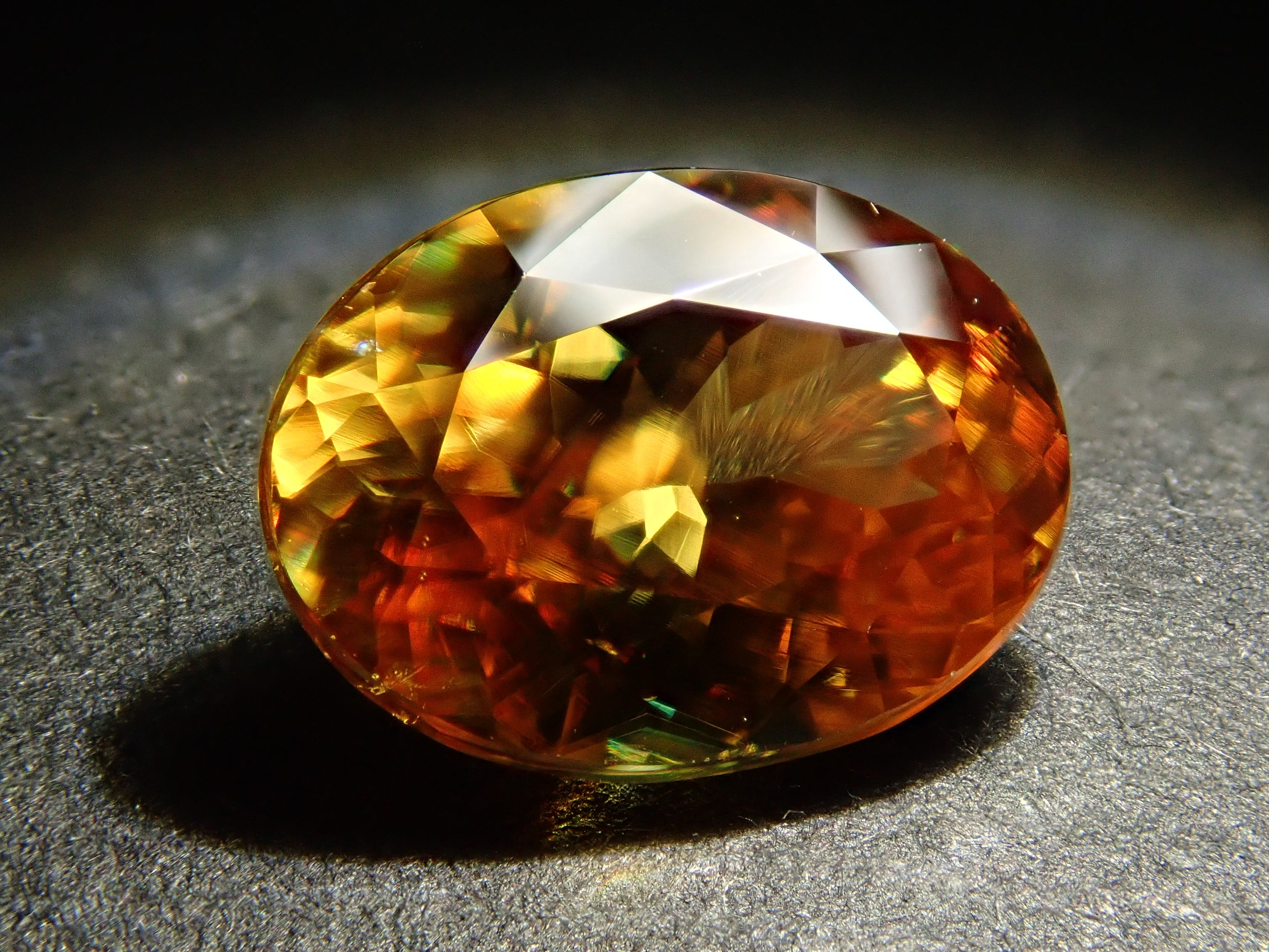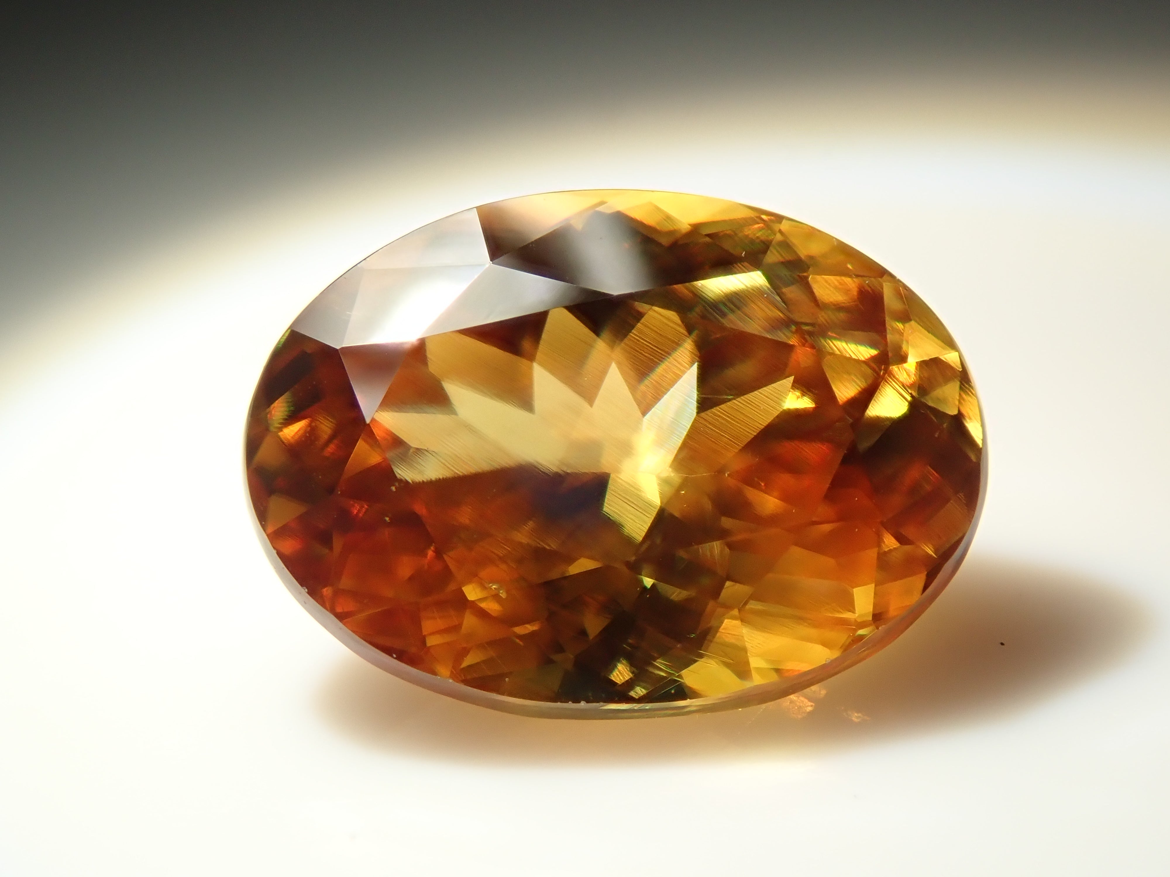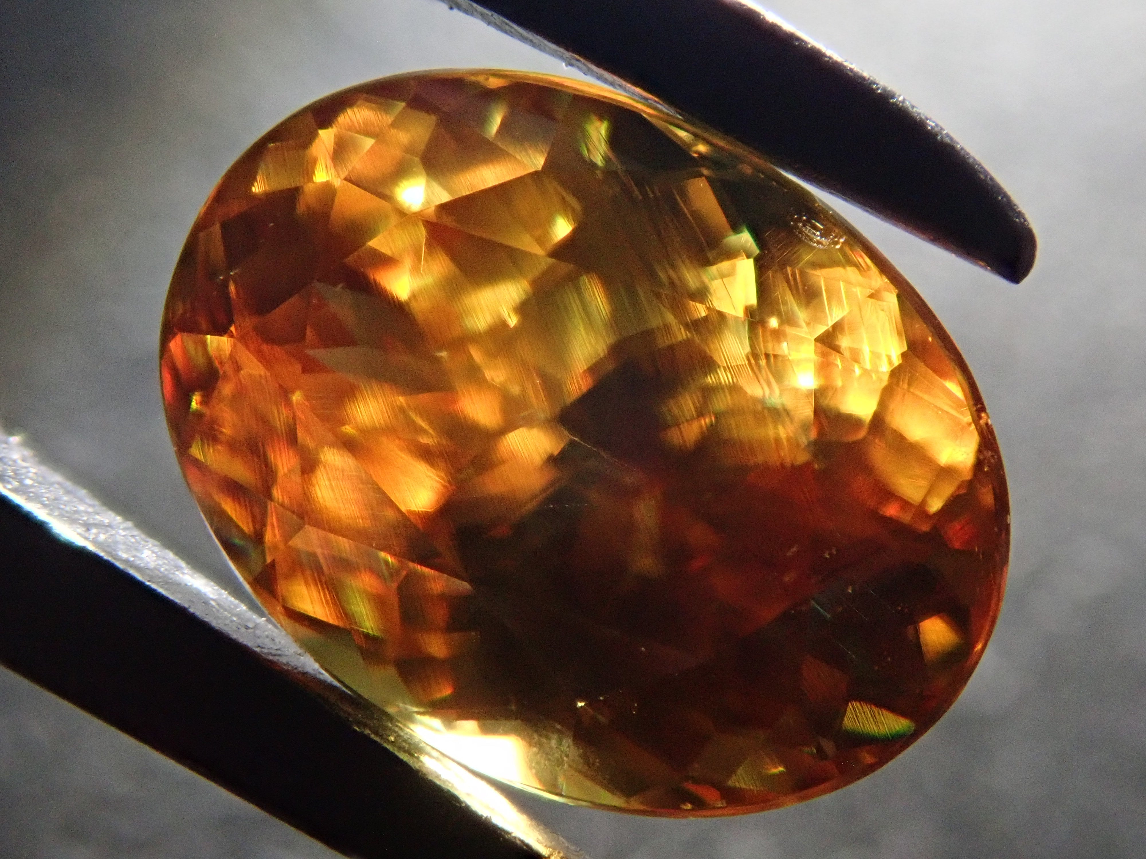 榍石散發著金色的光芒和絢麗的火彩。它是一種魅力十足的寶石,其火彩比鑽石更濃烈,越來越受到收藏家的青睞。榍石的光芒會隨著角度的變化而產生巨大的變化。不妨試試在陽光下用手掌滾動榍石,仔細觀察它。部分照片是用筆型手電筒拍攝的。