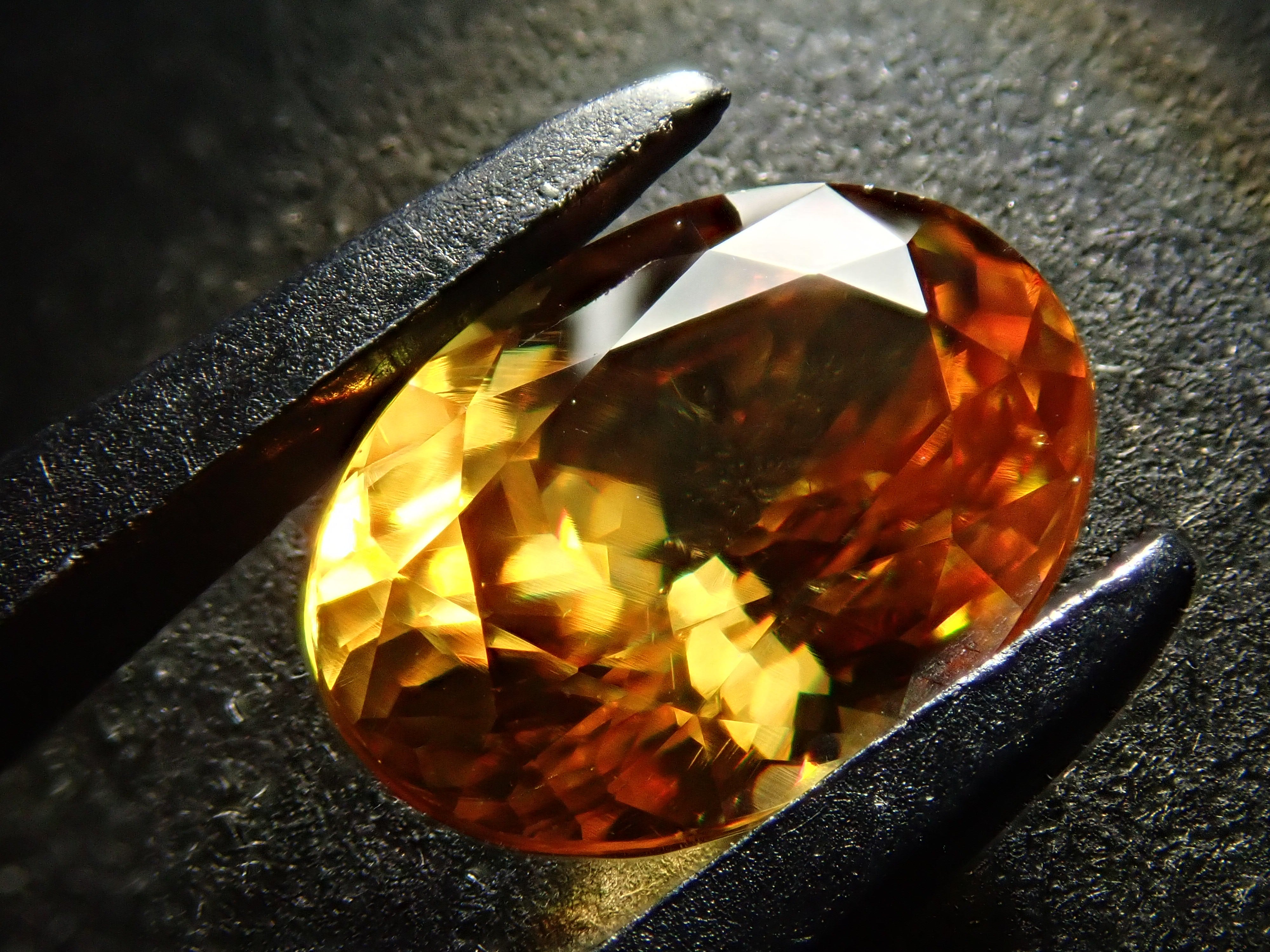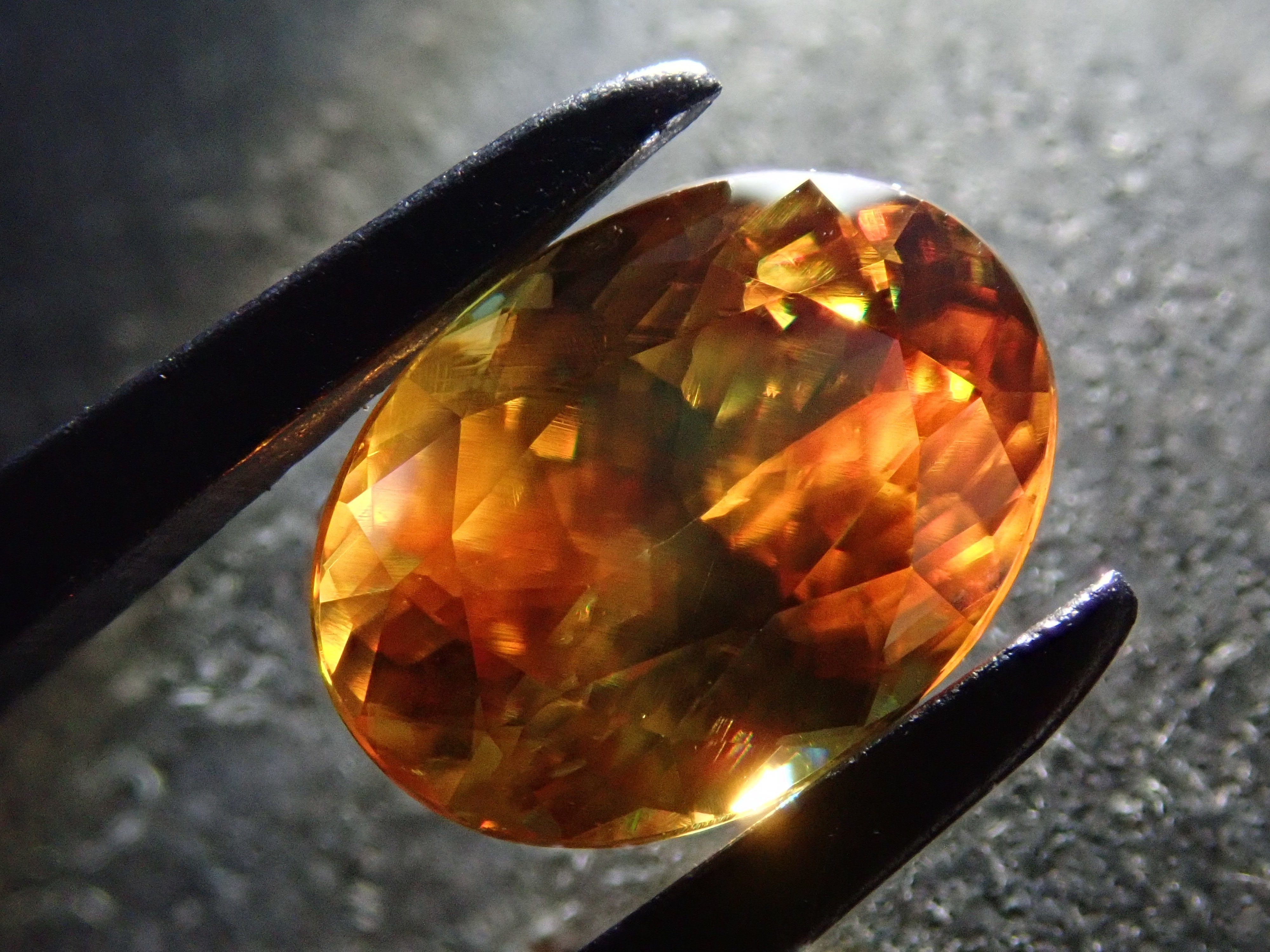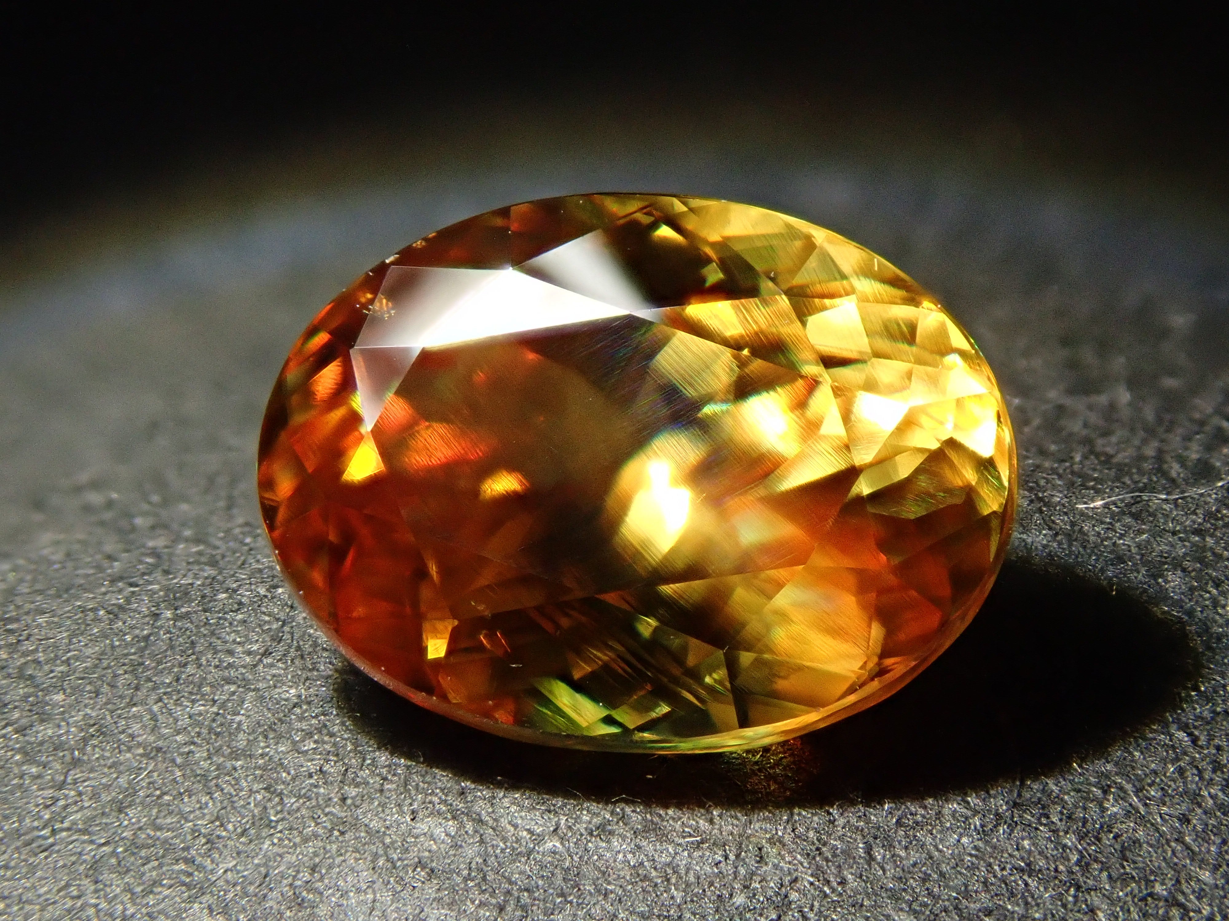 榍石散發著金色的光芒和絢麗的火彩。它是一種魅力十足的寶石,其火彩比鑽石更濃烈,越來越受到收藏家的青睞。榍石的光芒會隨著角度的變化而產生巨大的變化。不妨試試在陽光下用手掌滾動榍石,仔細觀察它。部分照片是用筆型手電筒拍攝的。