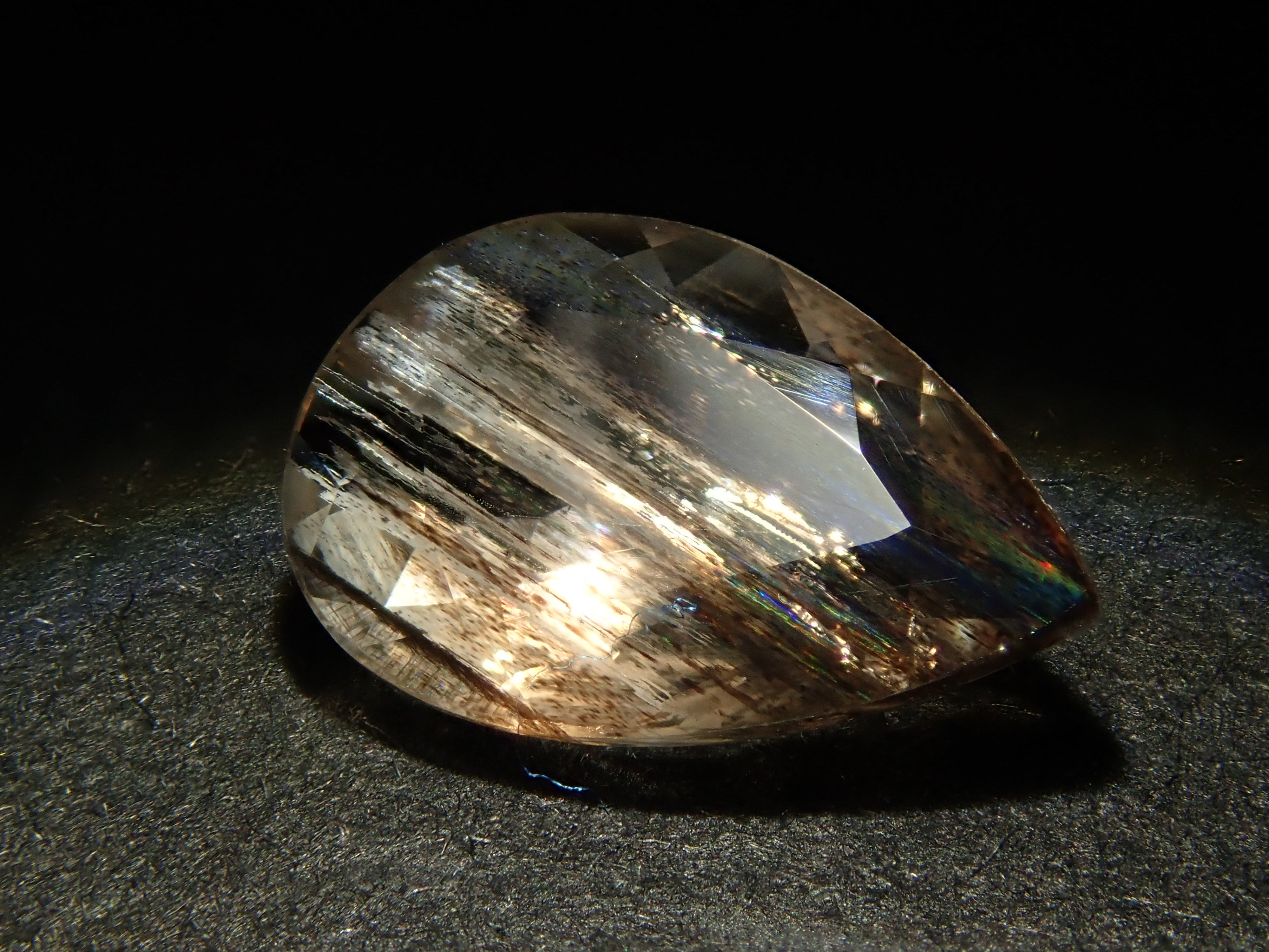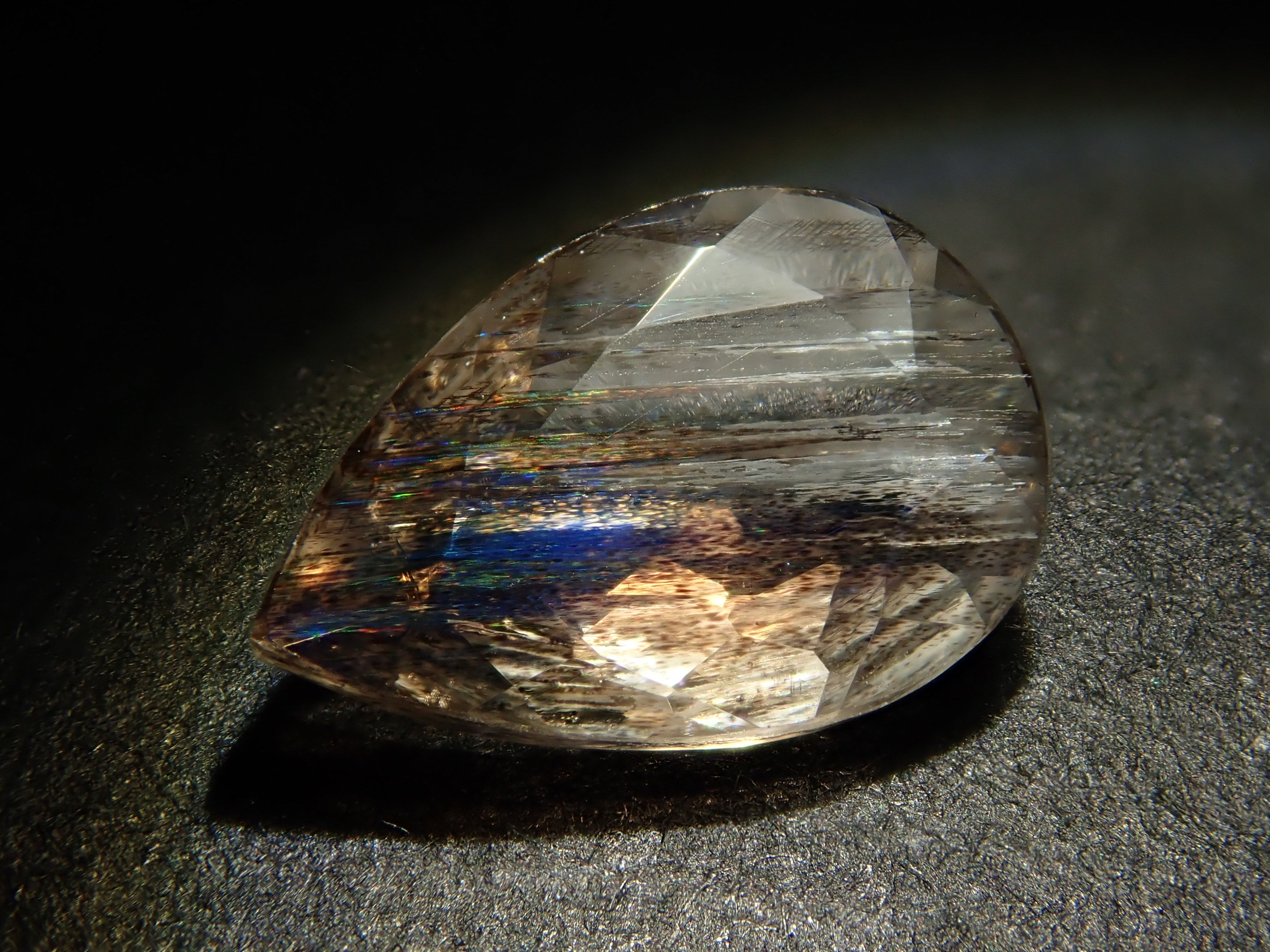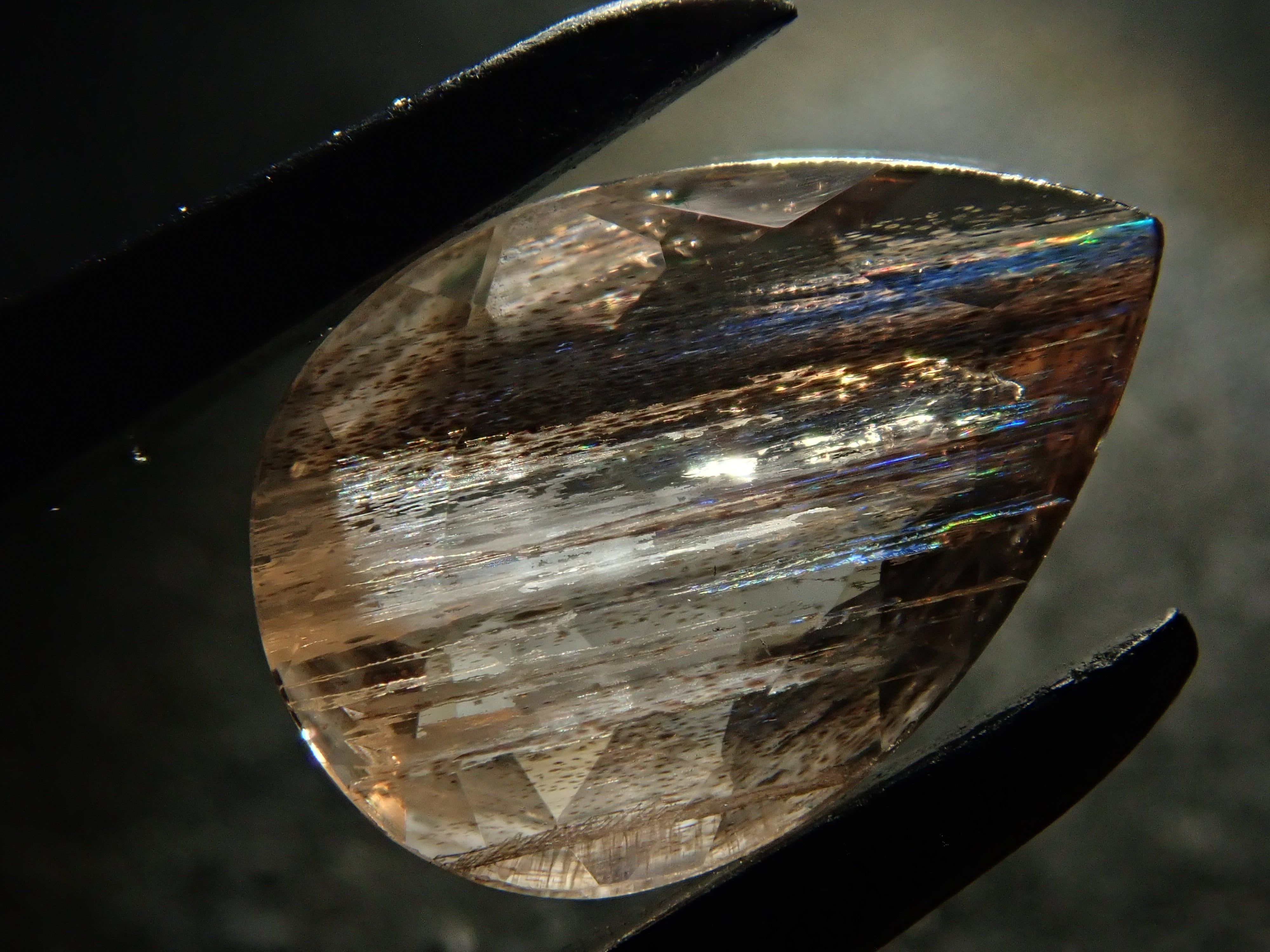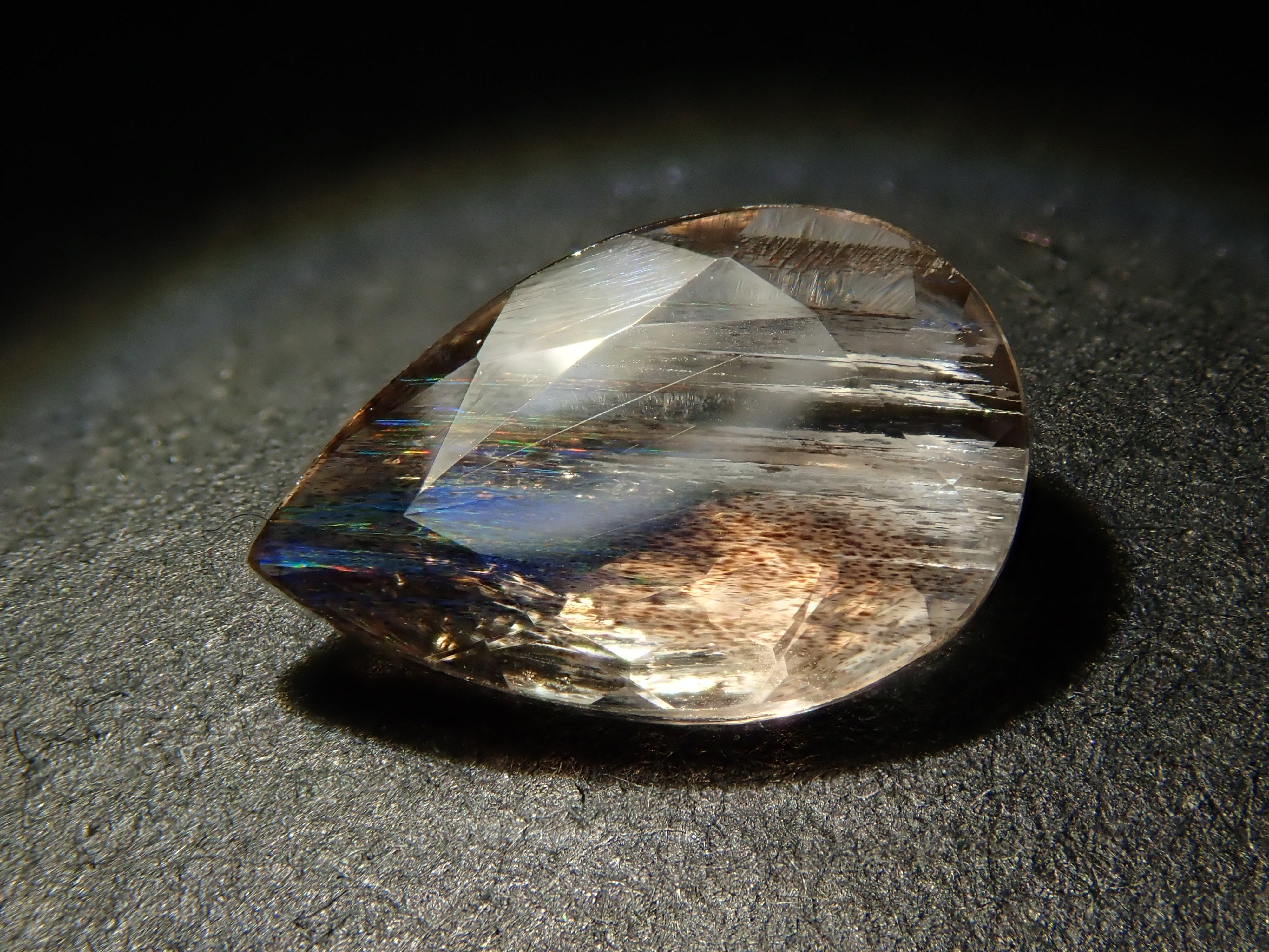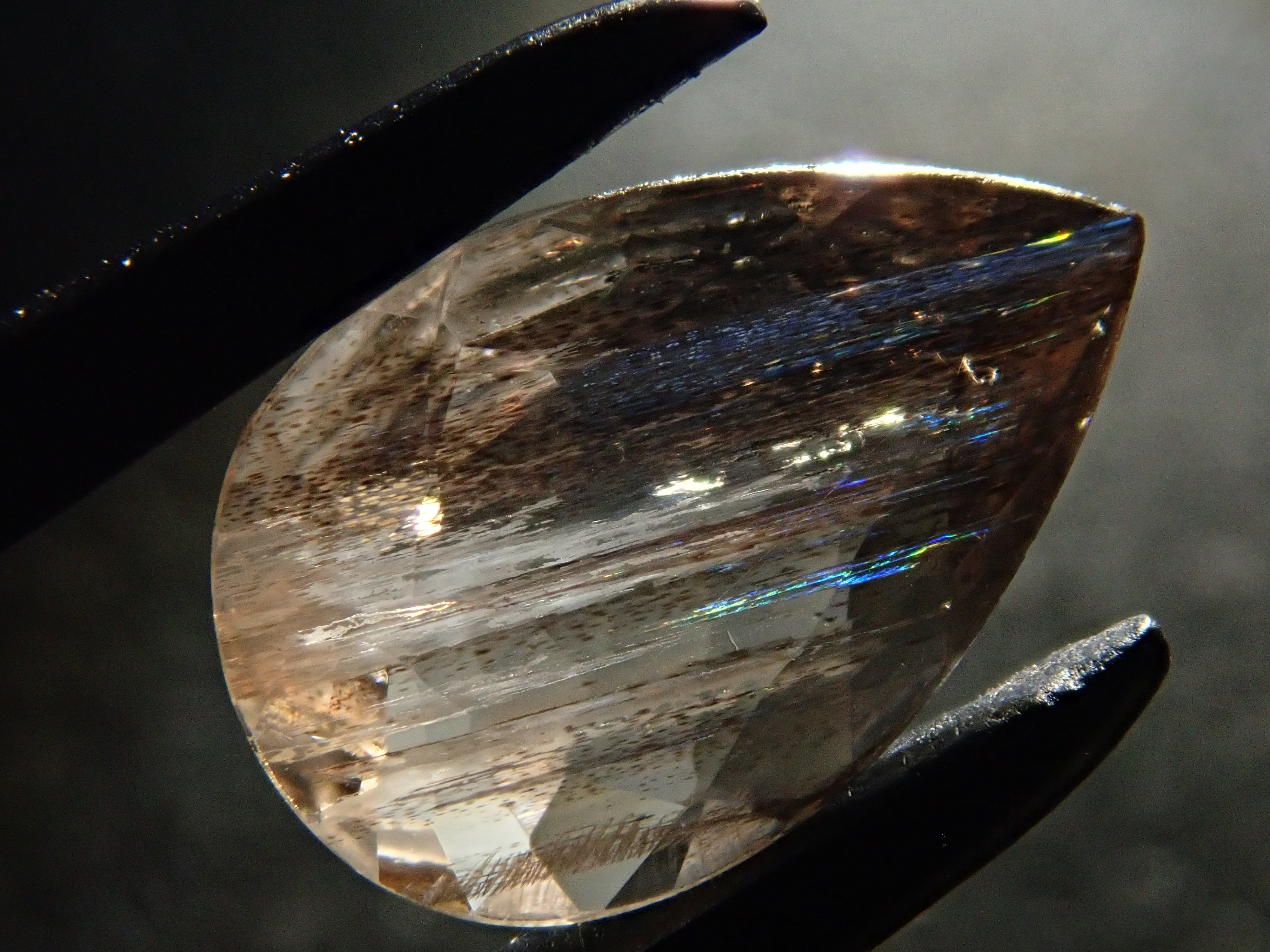 這就是所謂的“彩虹方柱石”,它擁有如孔雀羽毛般絢麗的色彩。方柱石是一種具有「多色性」的寶石,也就是說,從不同的角度觀看,它會呈現出不同的顏色。拍攝這張照片時,我用筆型電筒捕捉了這些神祕的色彩。