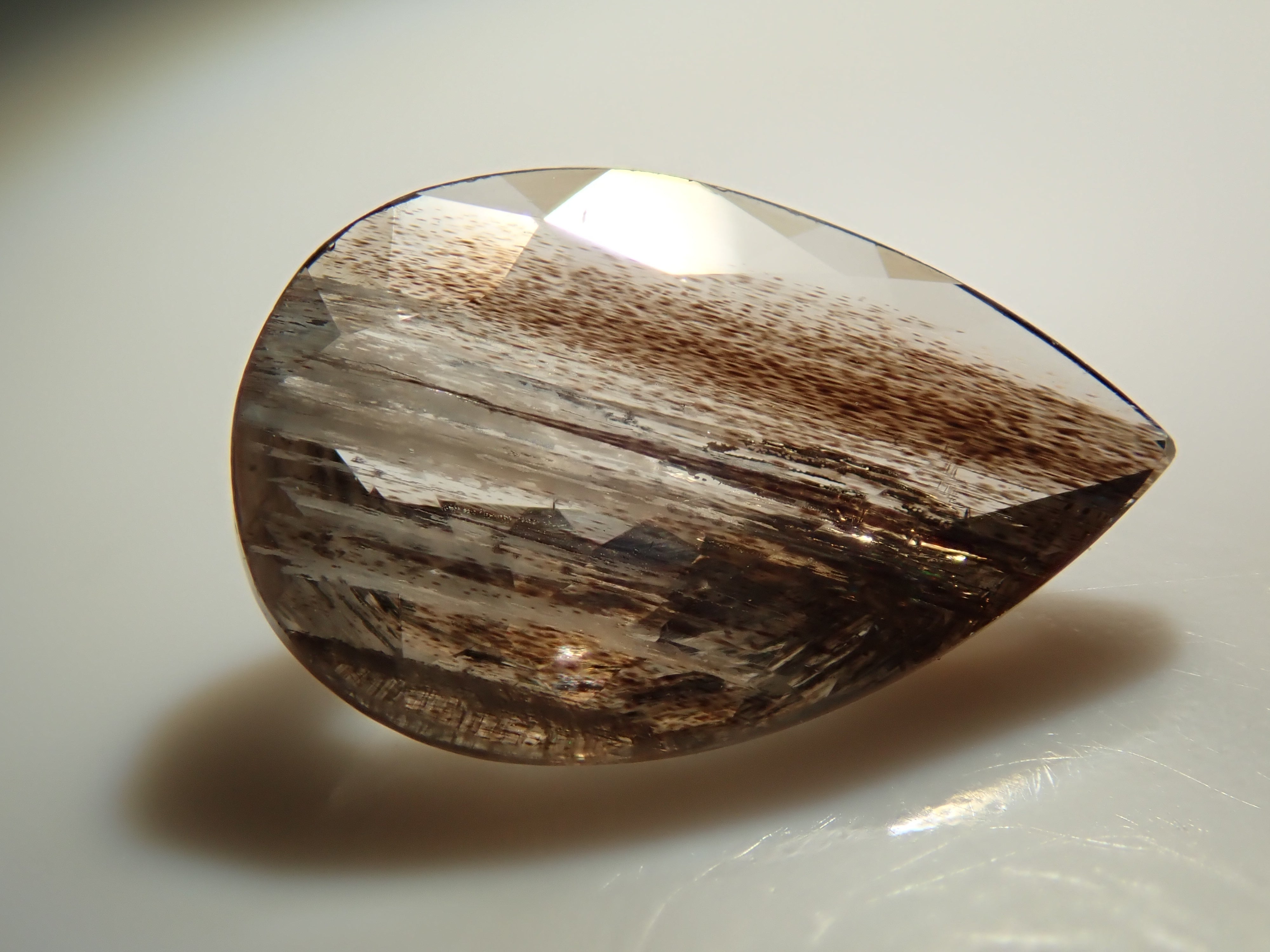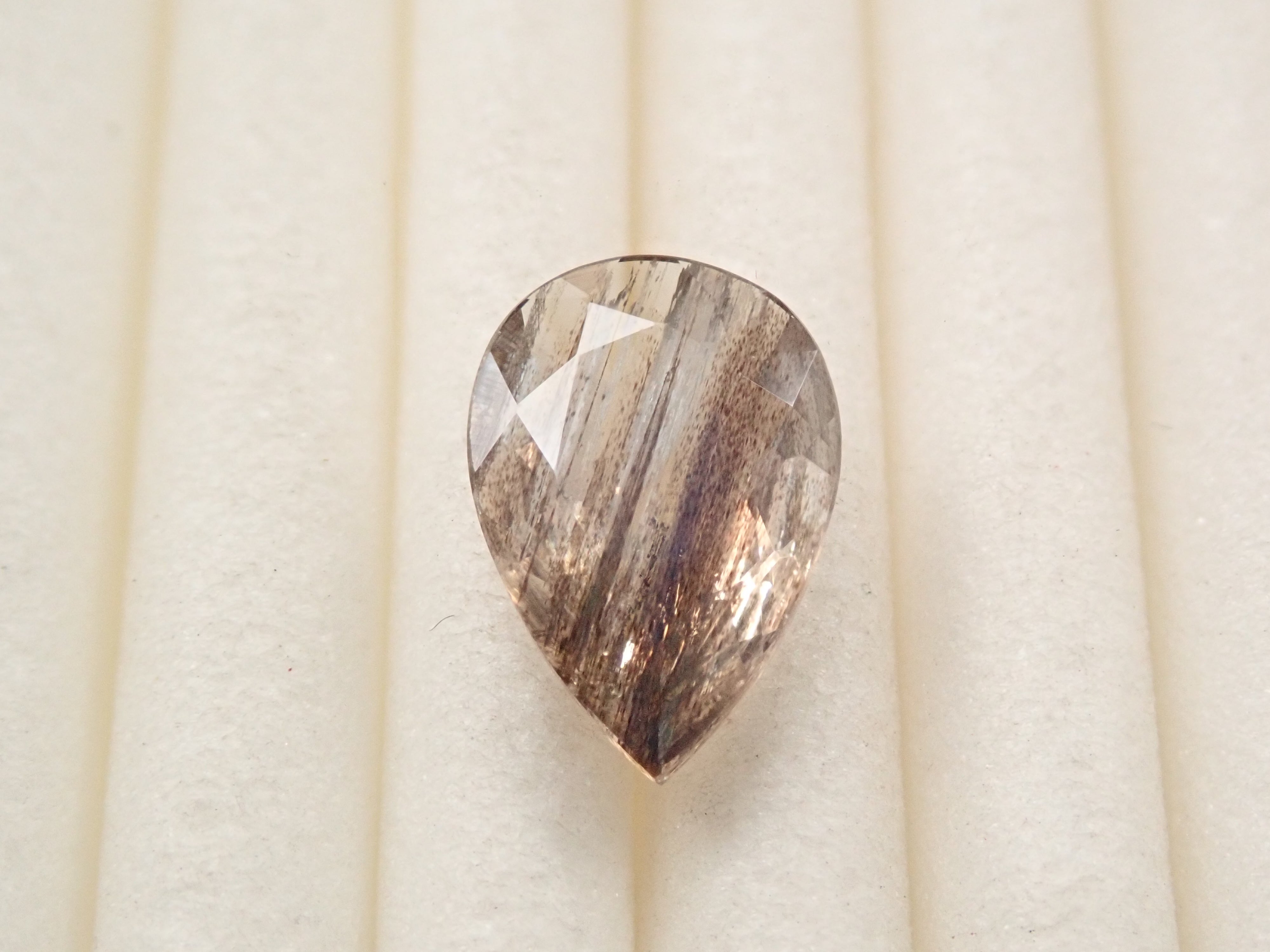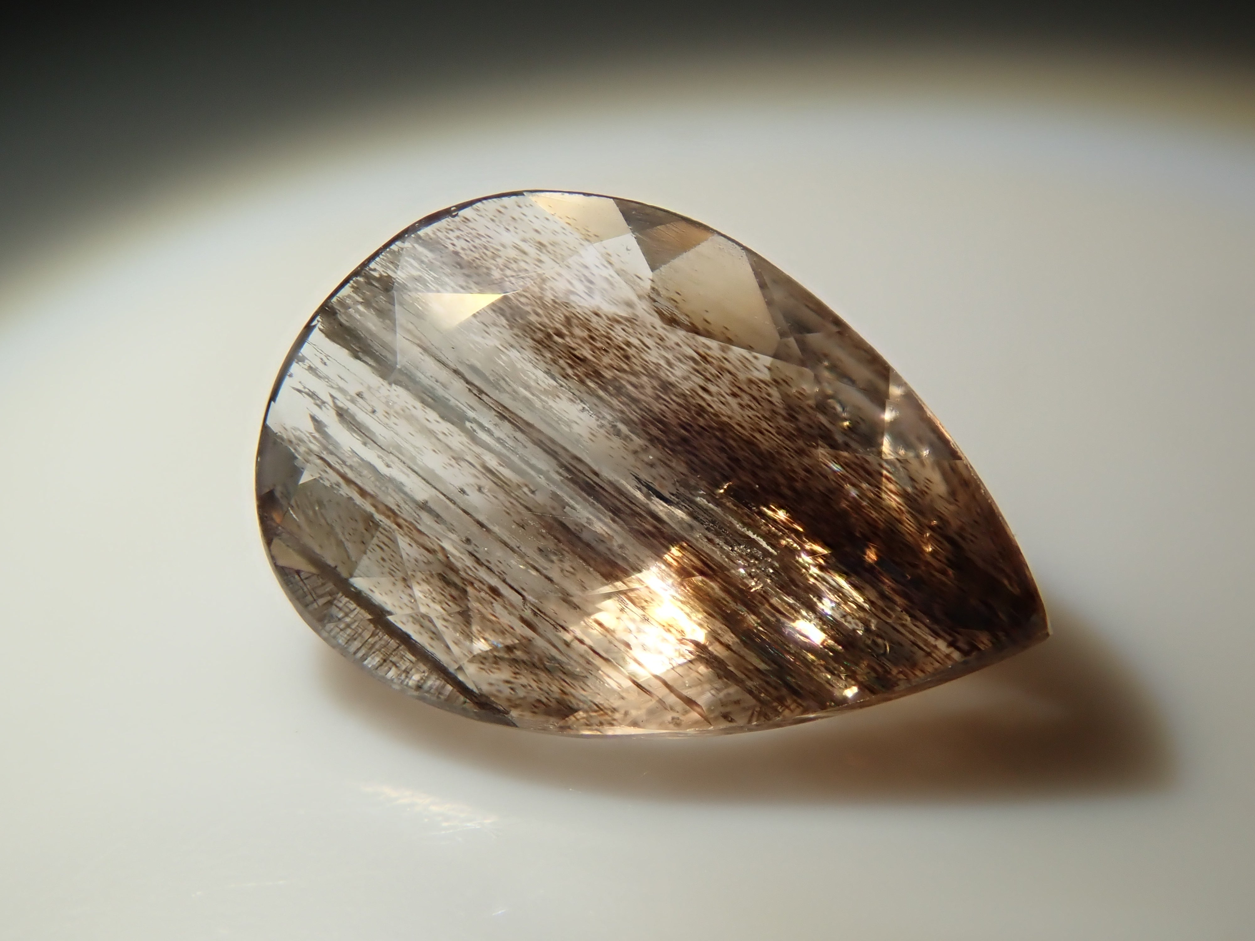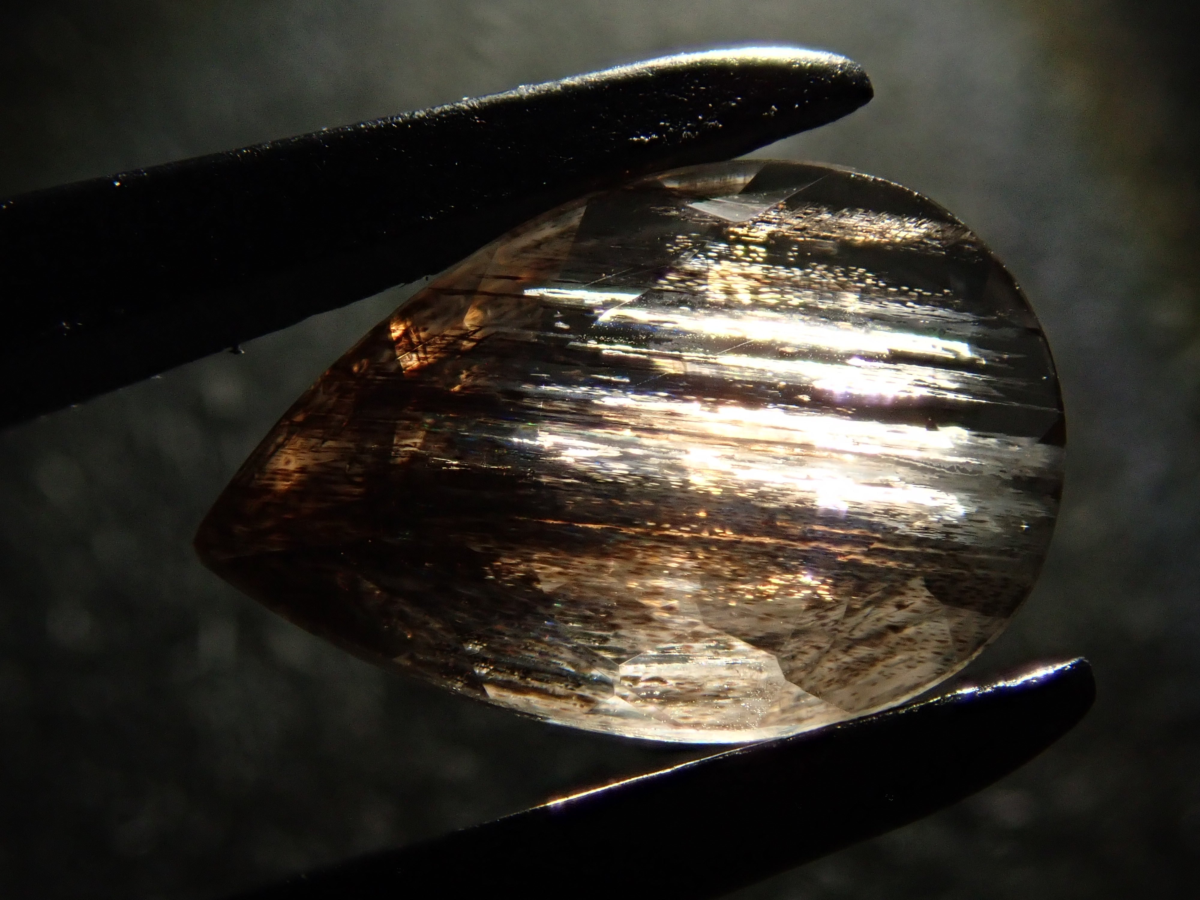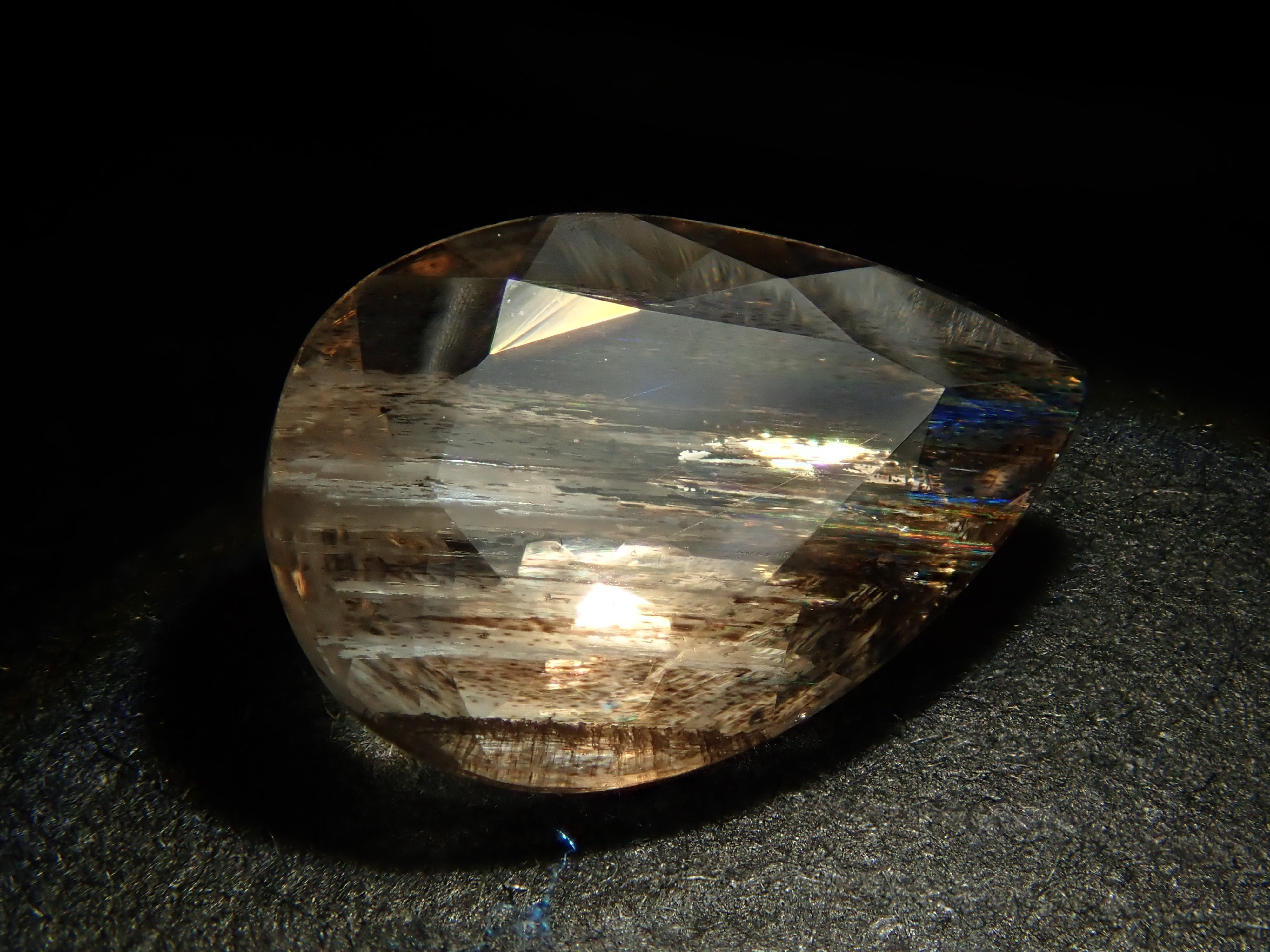 這就是所謂的“彩虹方柱石”,它擁有如孔雀羽毛般絢麗的色彩。方柱石是一種具有「多色性」的寶石,也就是說,從不同的角度觀看,它會呈現出不同的顏色。拍攝這張照片時,我用筆型電筒捕捉了這些神祕的色彩。