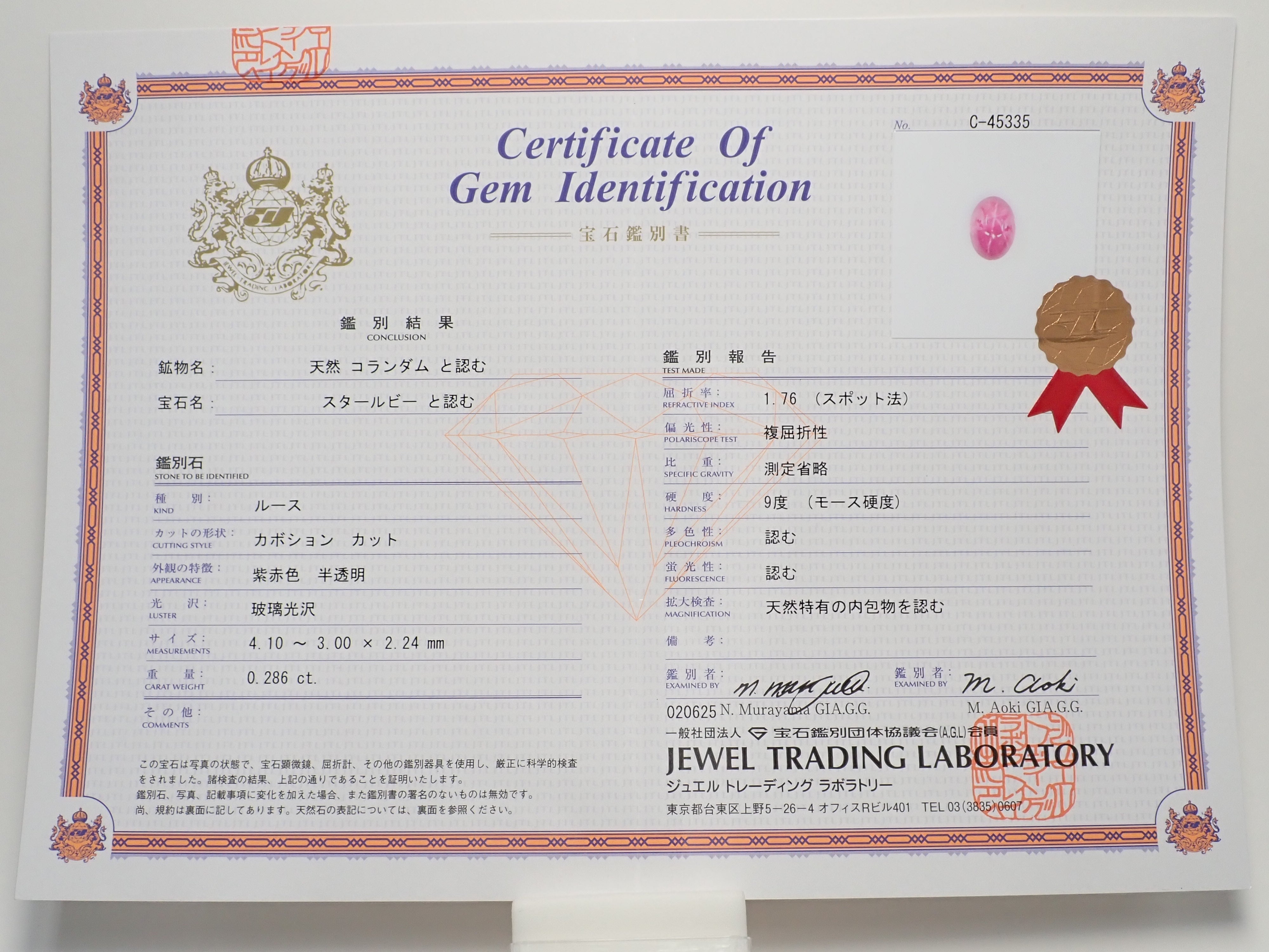 這是一顆高透明度的星光紅寶石。它附有JTL鑑定證書。