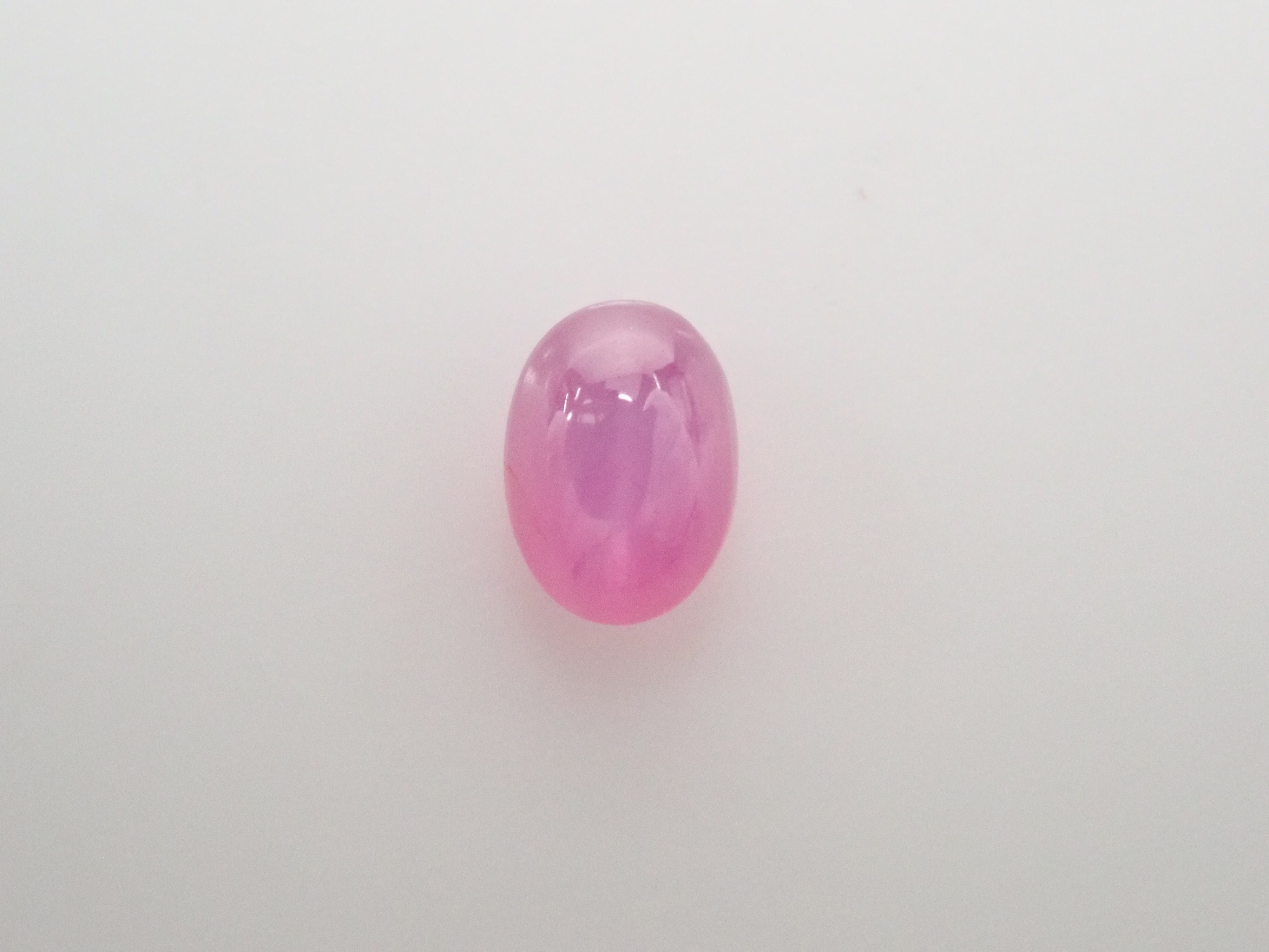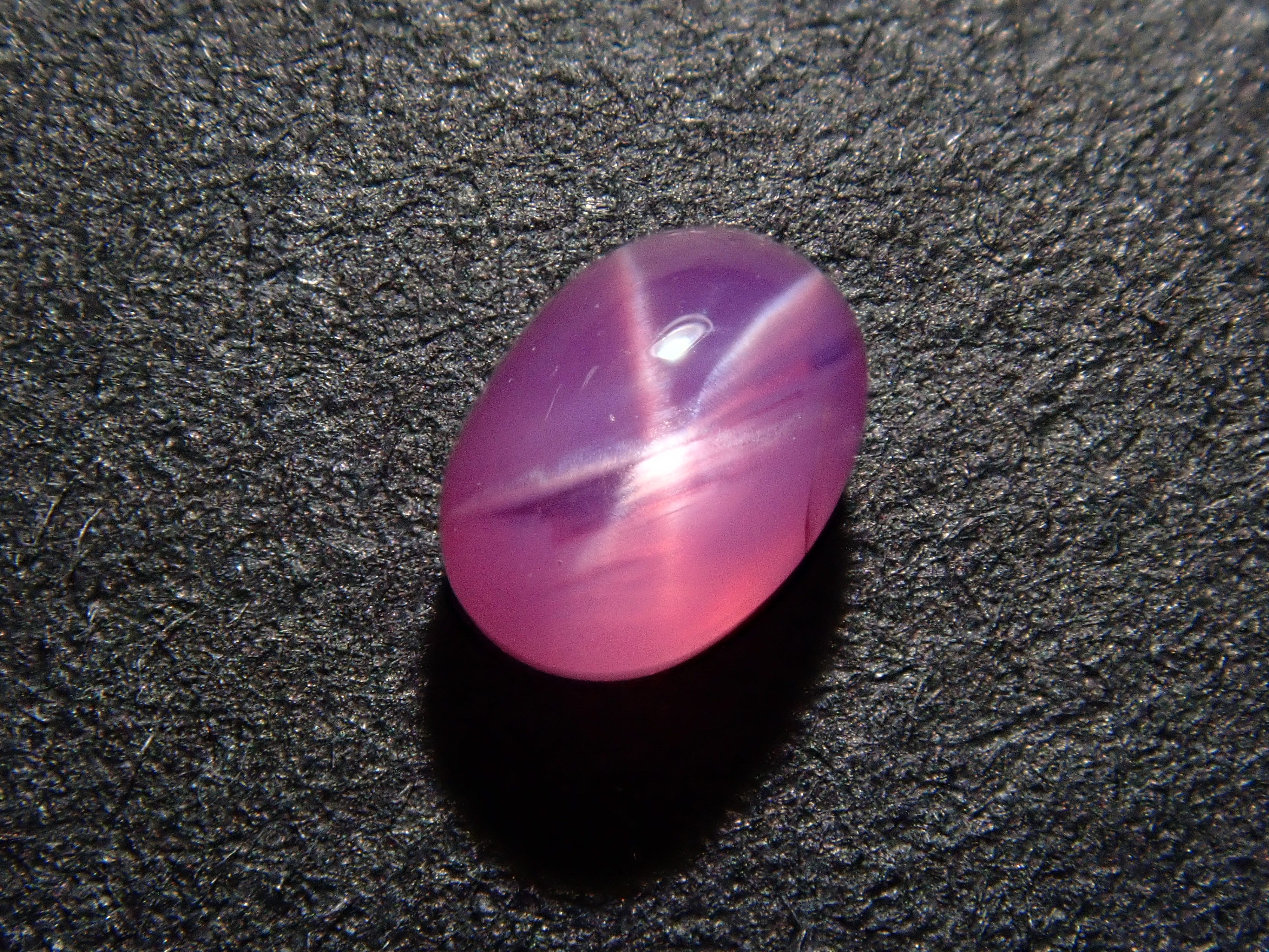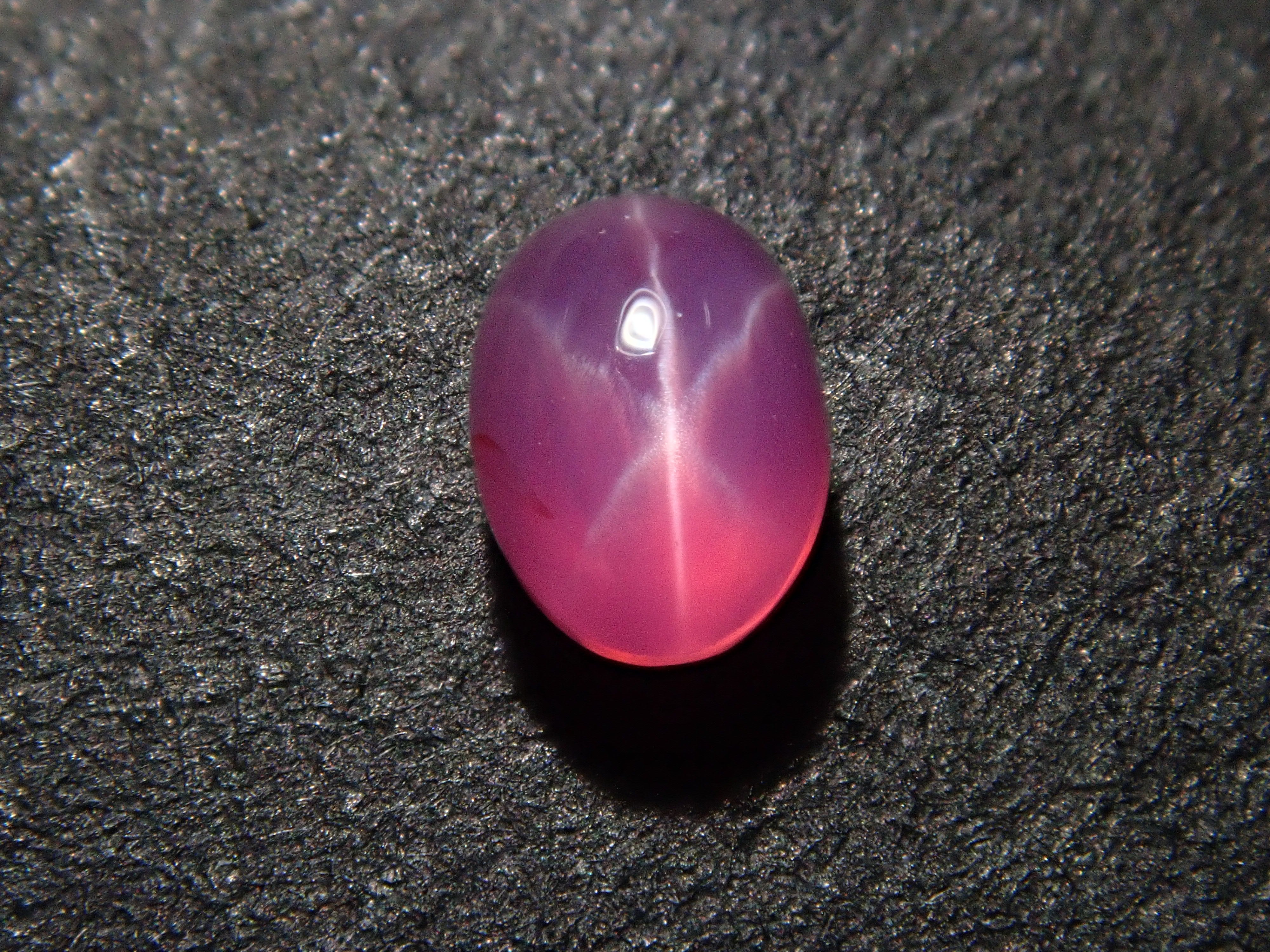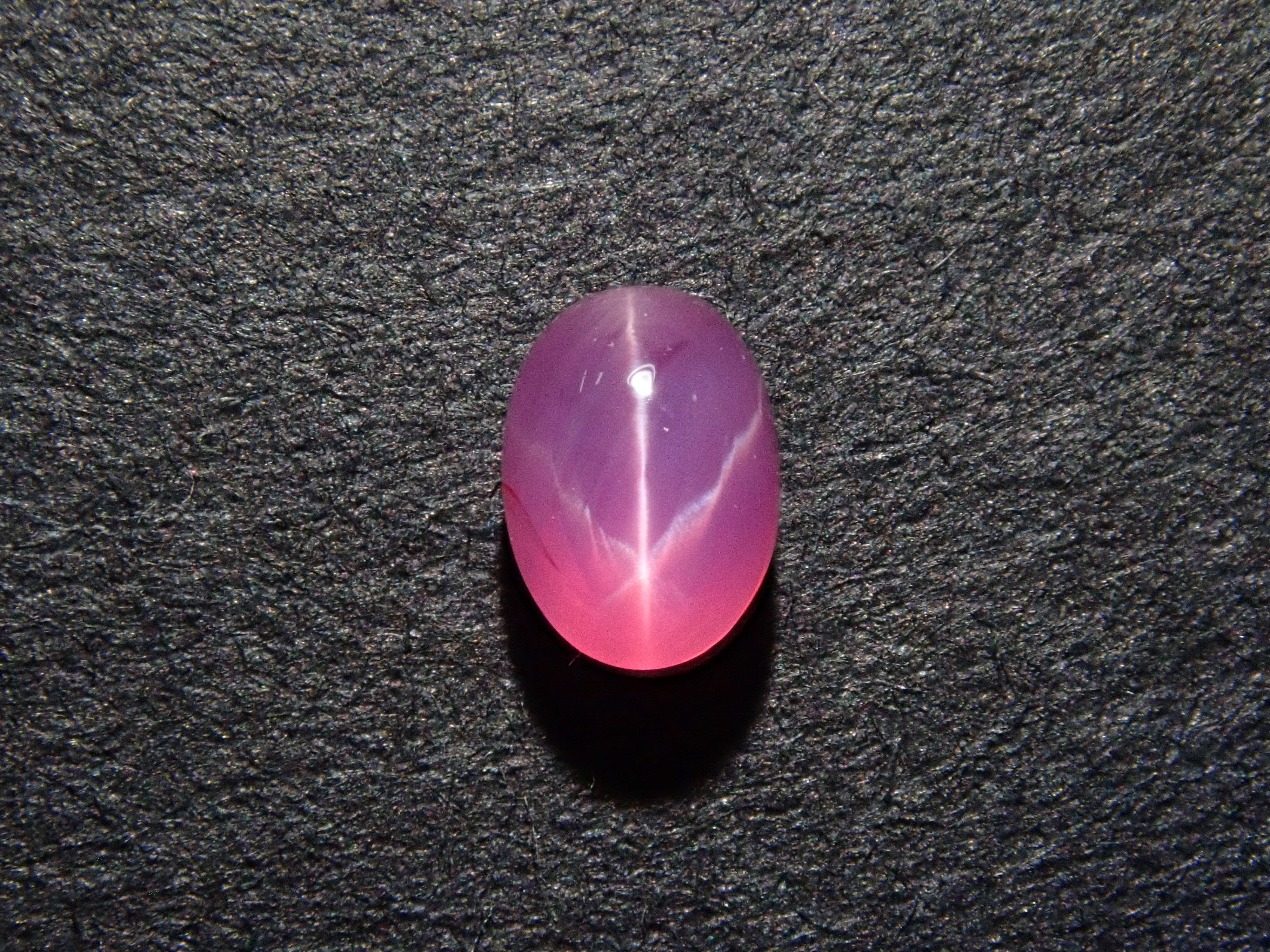 藍寶石是一種著名的寶石。其礦物成分是剛玉,與紅寶石相同,但除紅色以外的所有剛玉都被稱為藍寶石。這顆是粉紅色藍寶石,也具有星光效果。照片使用了筆型手電筒。寶石背面通常未經拋光。