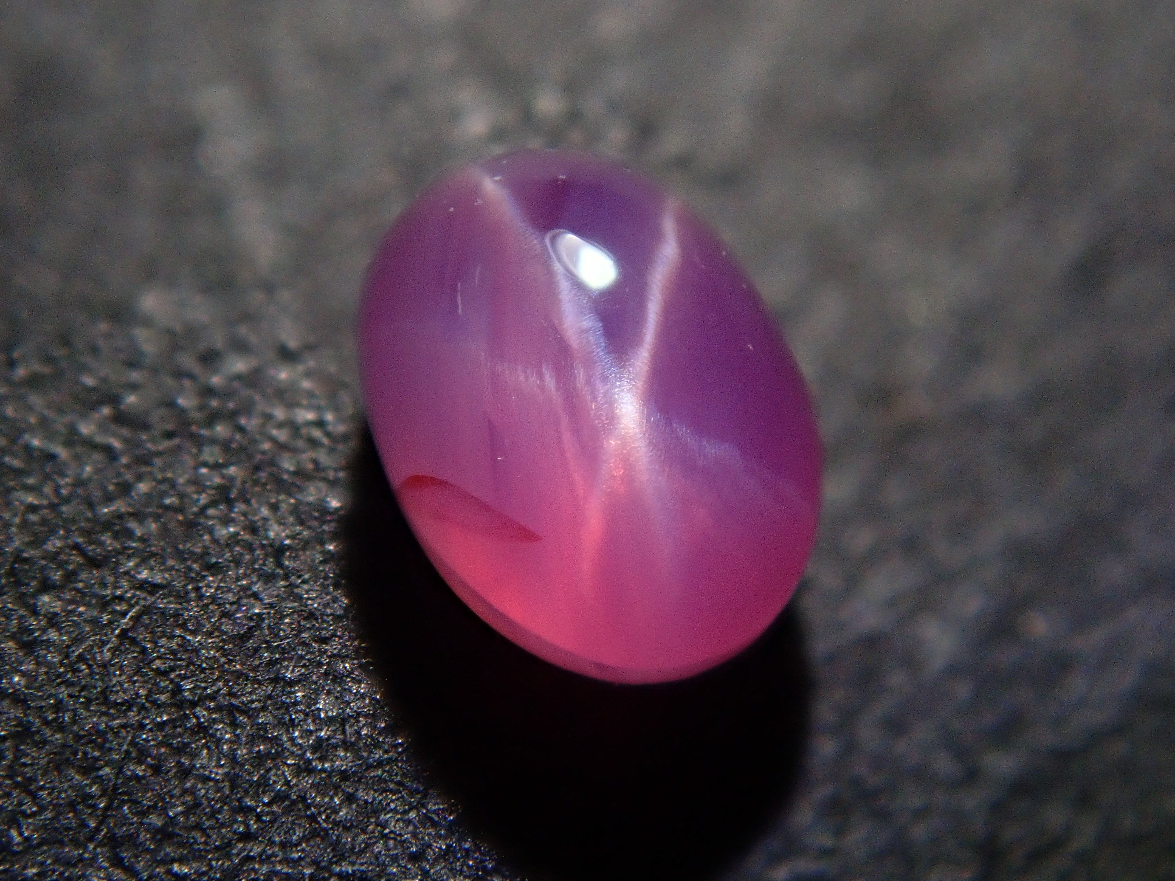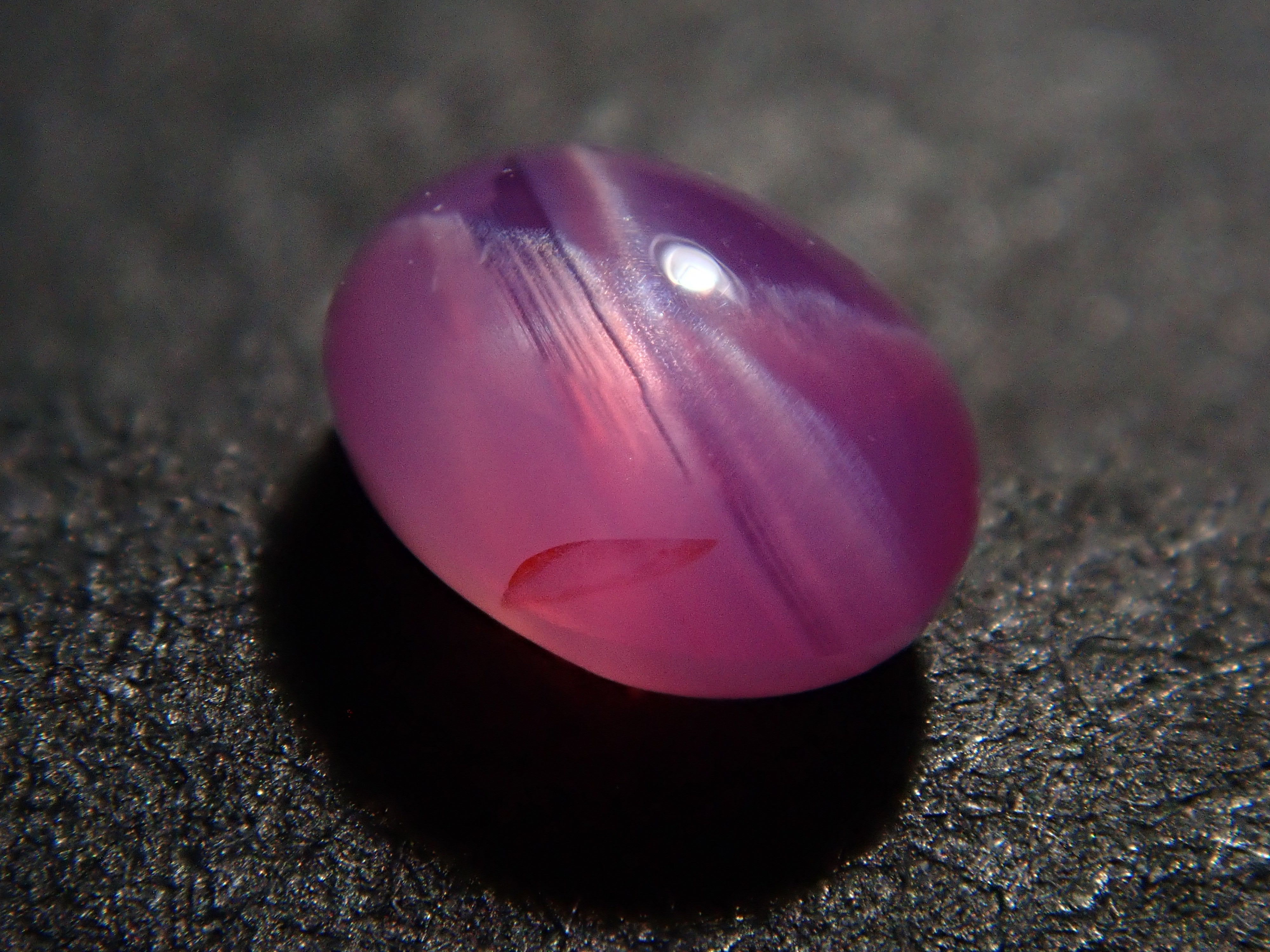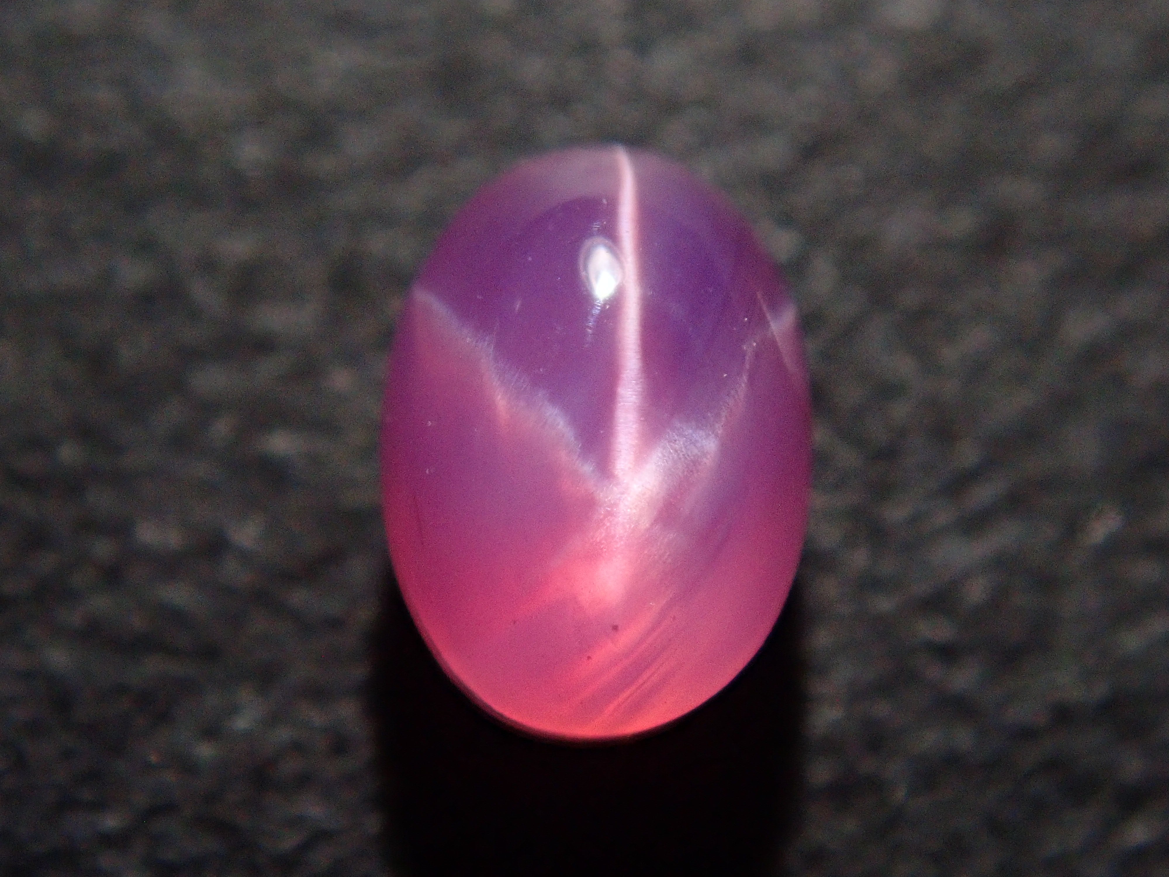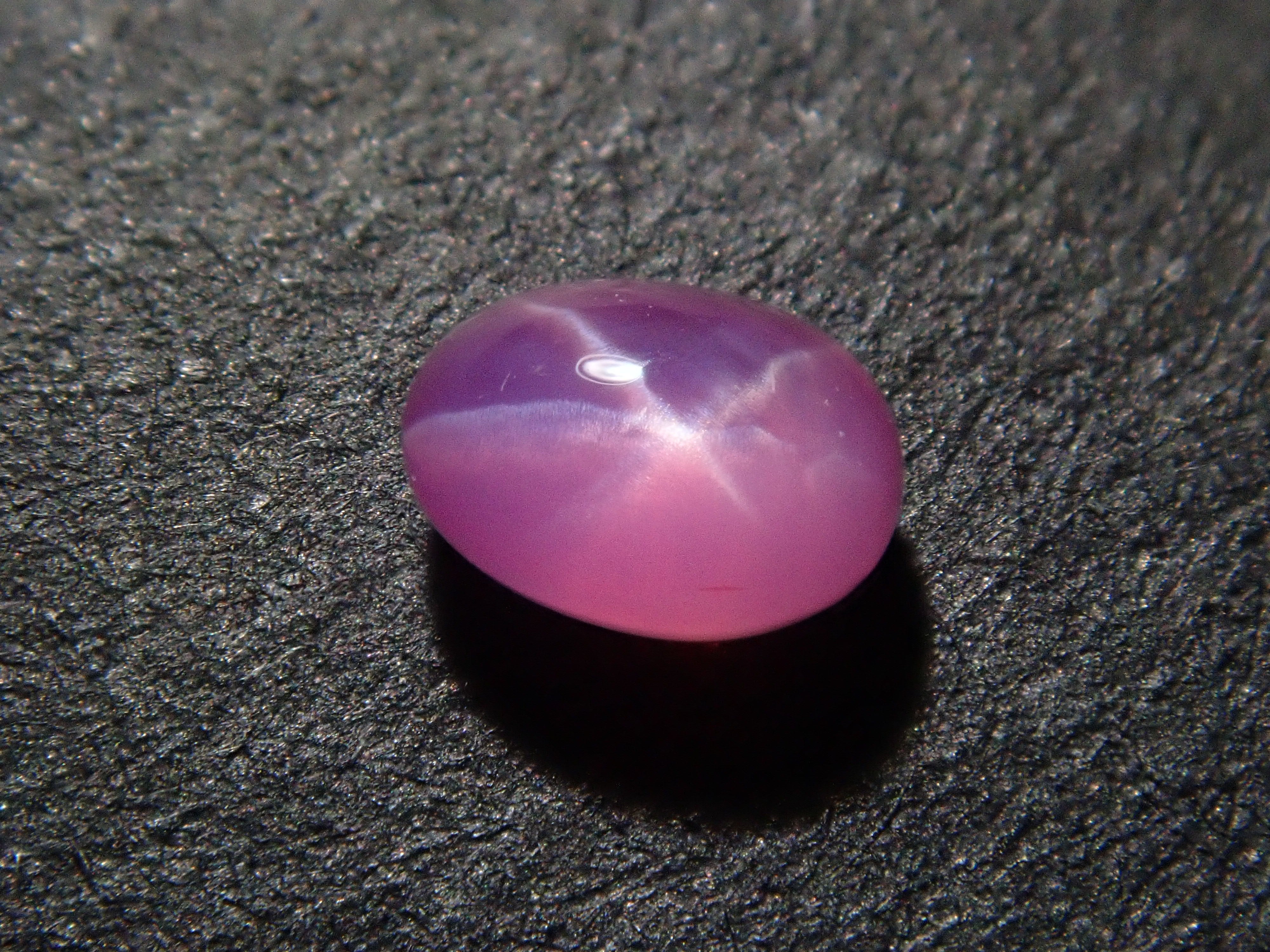藍寶石是一種著名的寶石。其礦物成分是剛玉,與紅寶石相同,但除紅色以外的所有剛玉都被稱為藍寶石。這顆是粉紅色藍寶石,也具有星光效果。照片使用了筆型手電筒。寶石背面通常未經拋光。