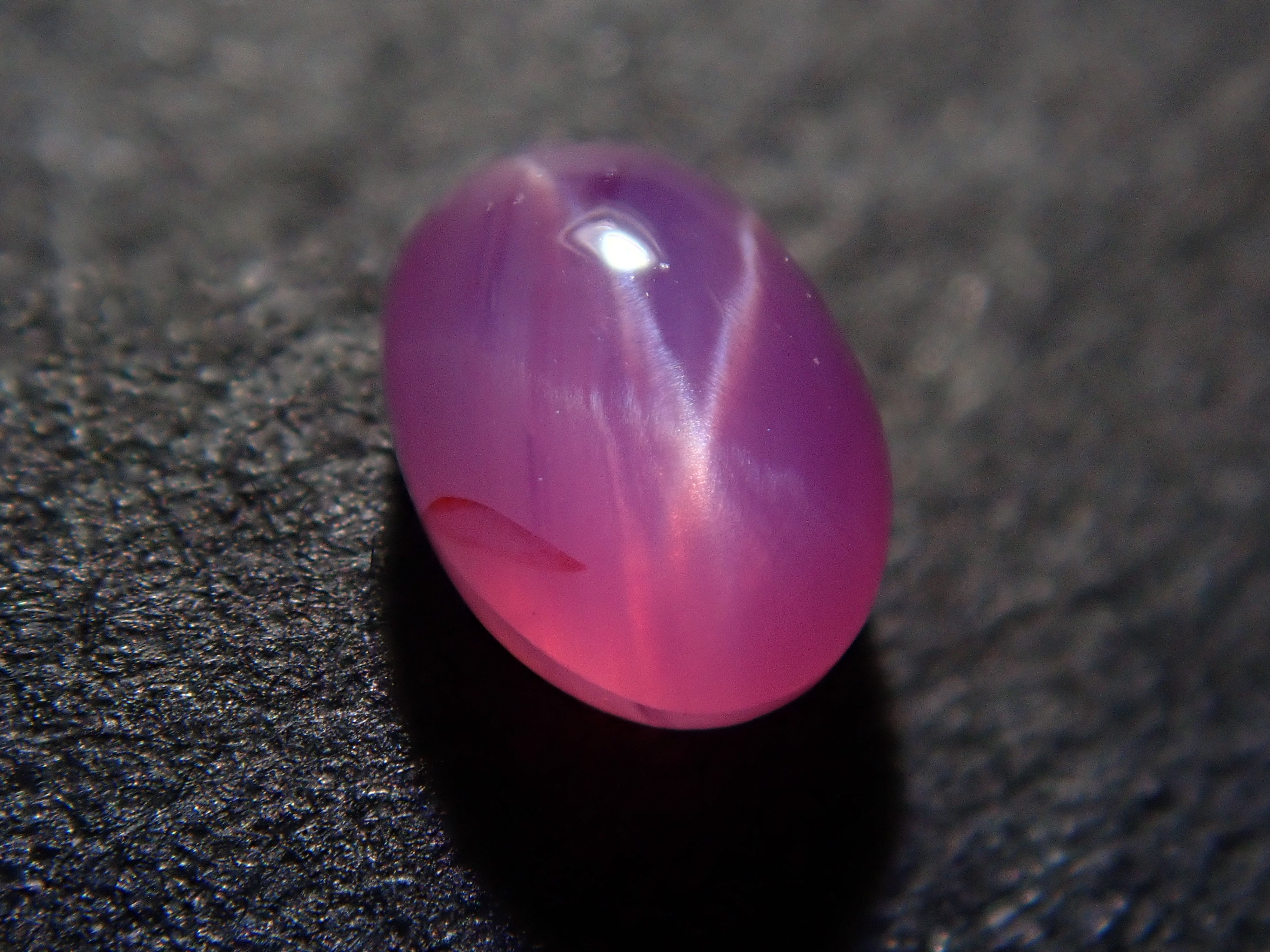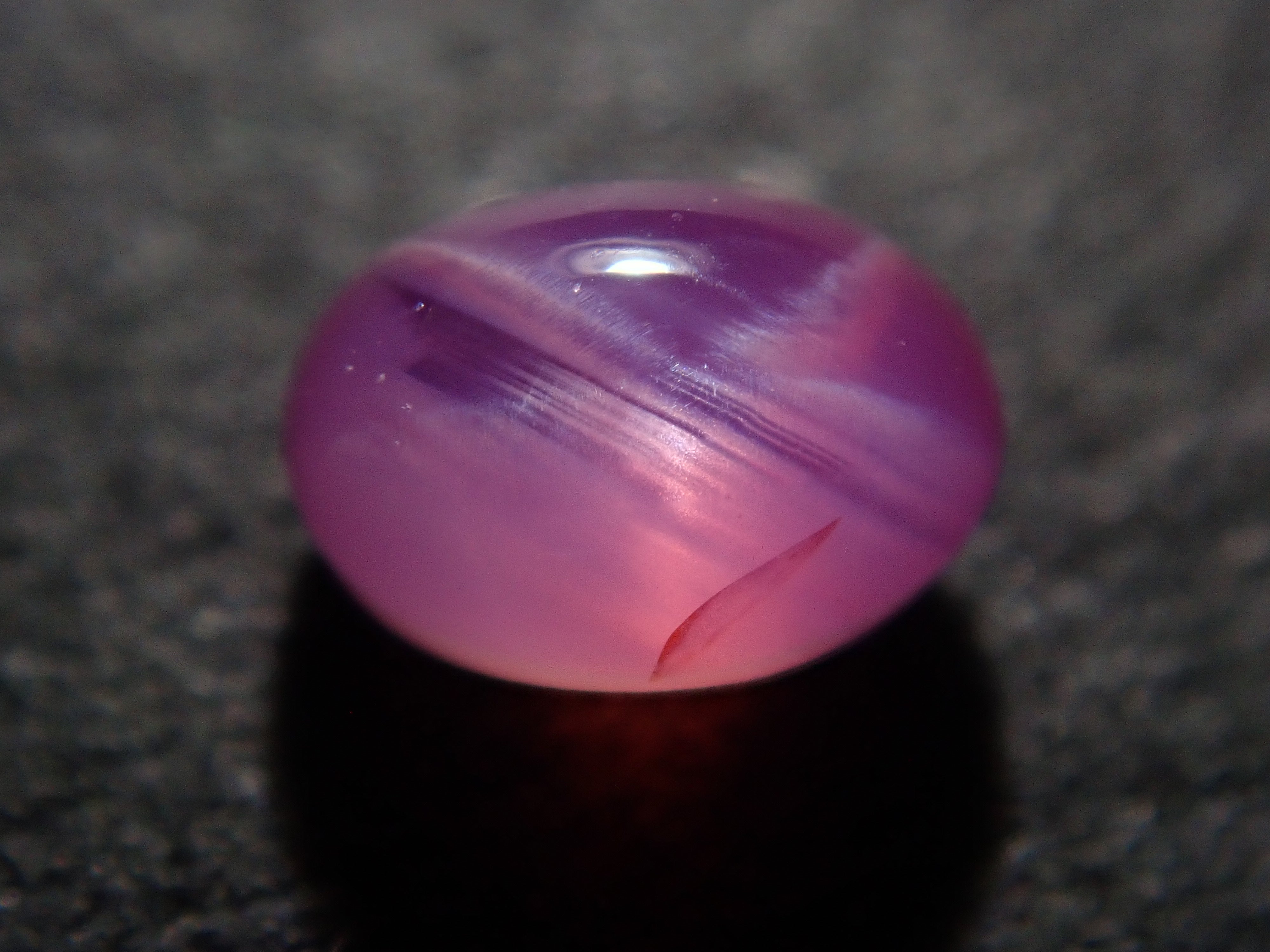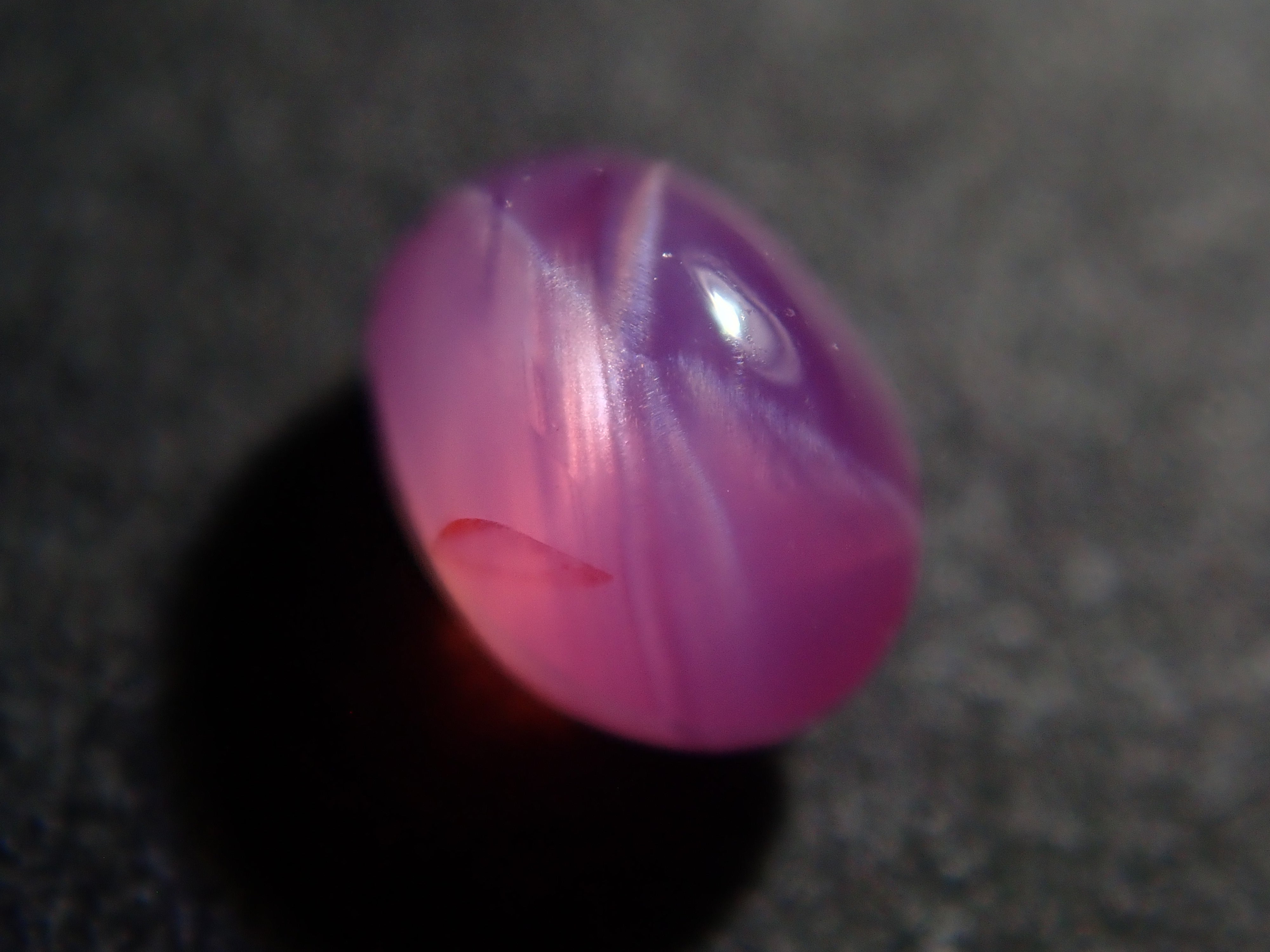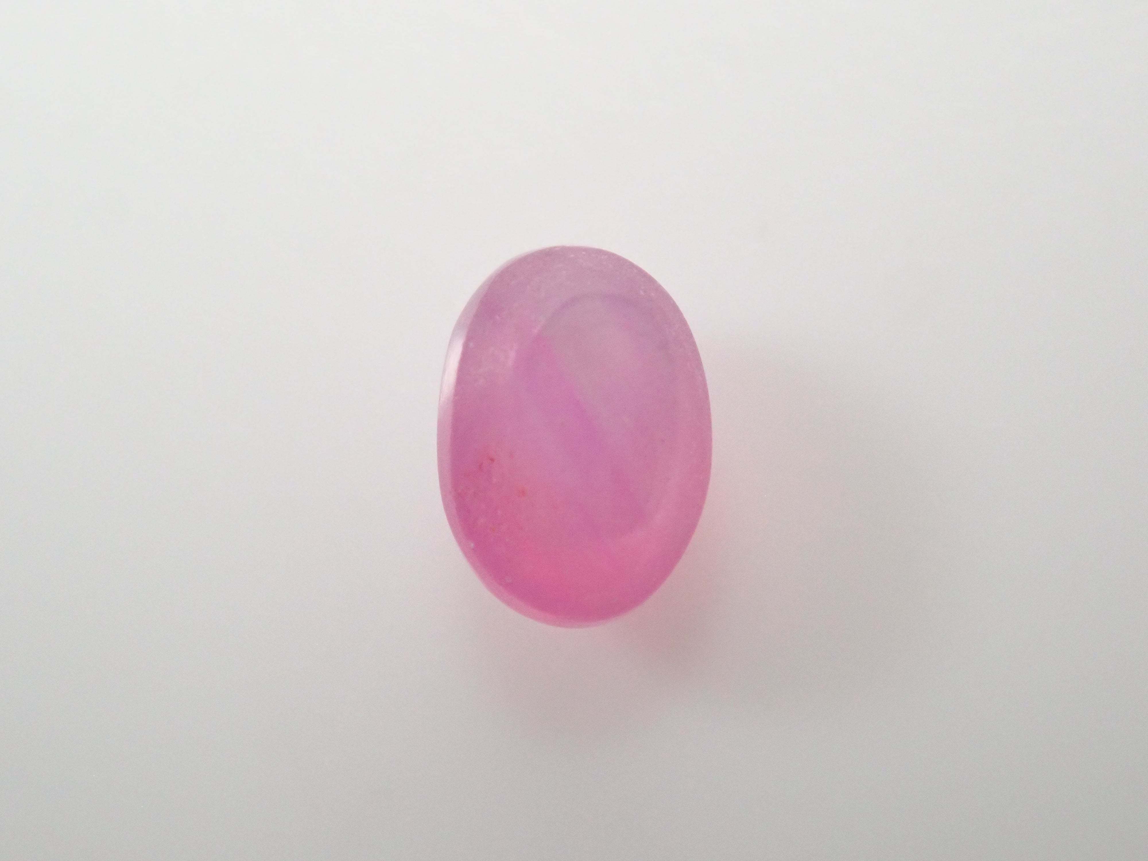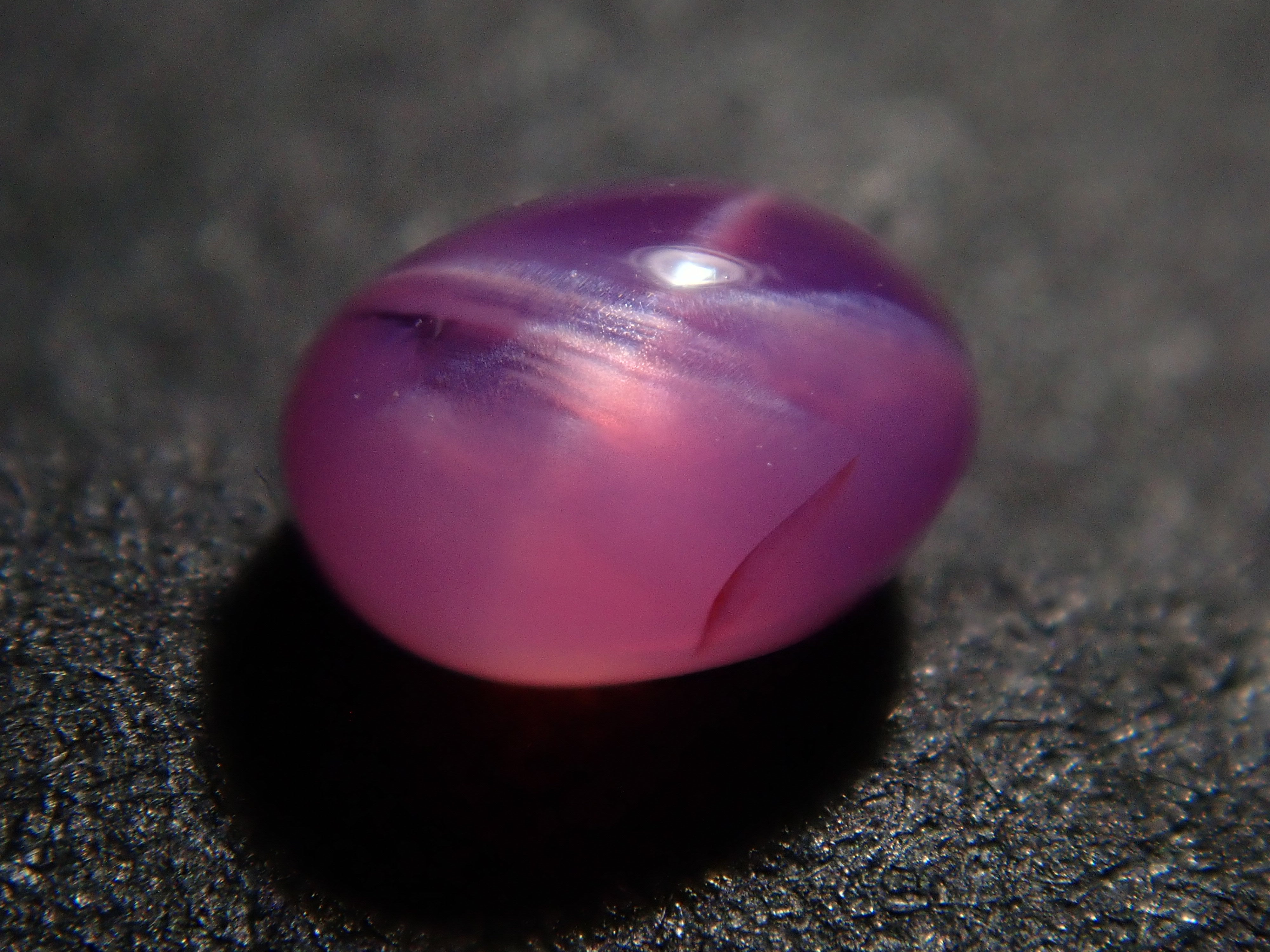 藍寶石是一種著名的寶石。其礦物成分是剛玉,與紅寶石相同,但除紅色以外的所有剛玉都被稱為藍寶石。這顆是粉紅色藍寶石,也具有星光效果。照片使用了筆型手電筒。寶石背面通常未經拋光。