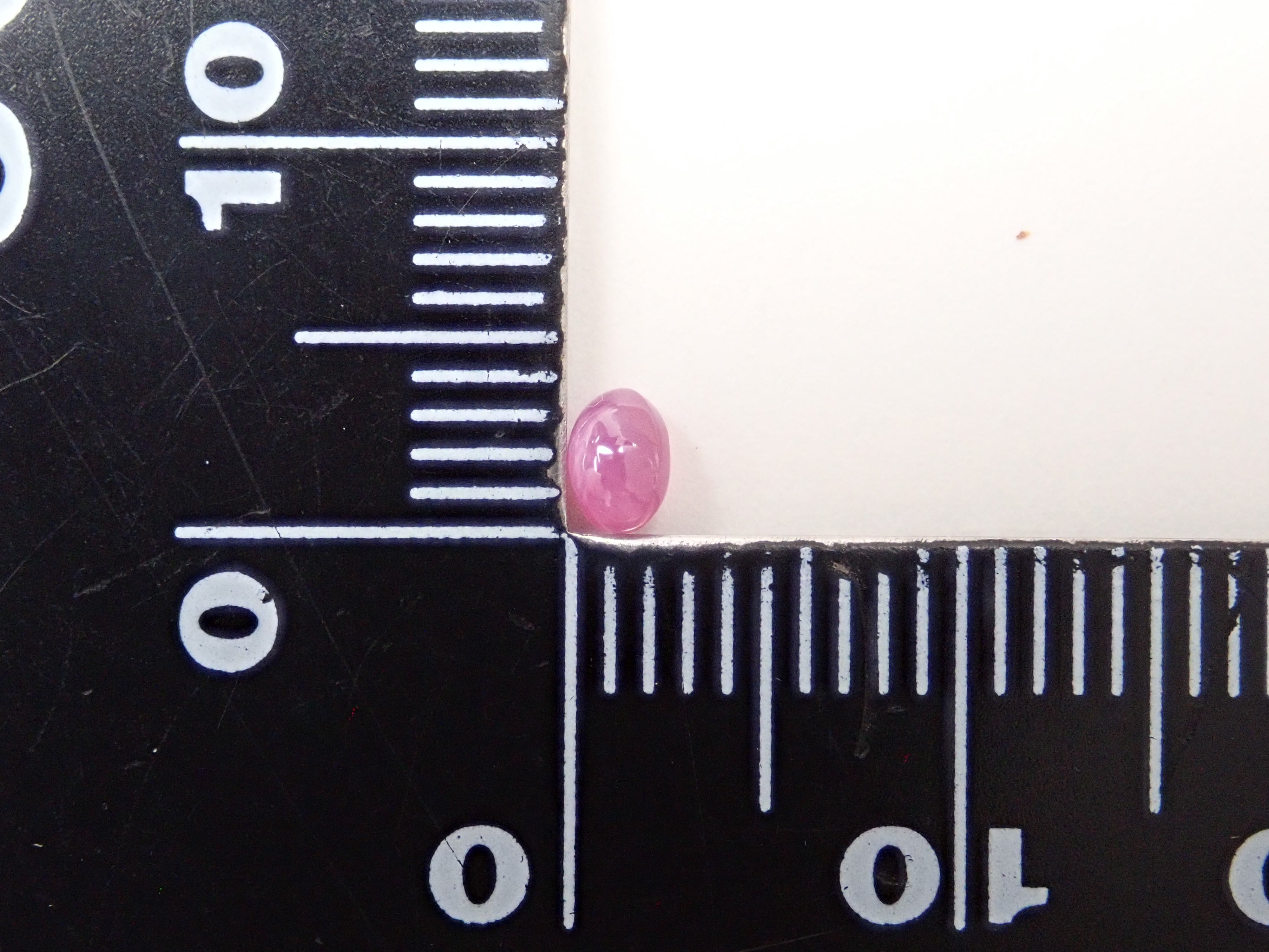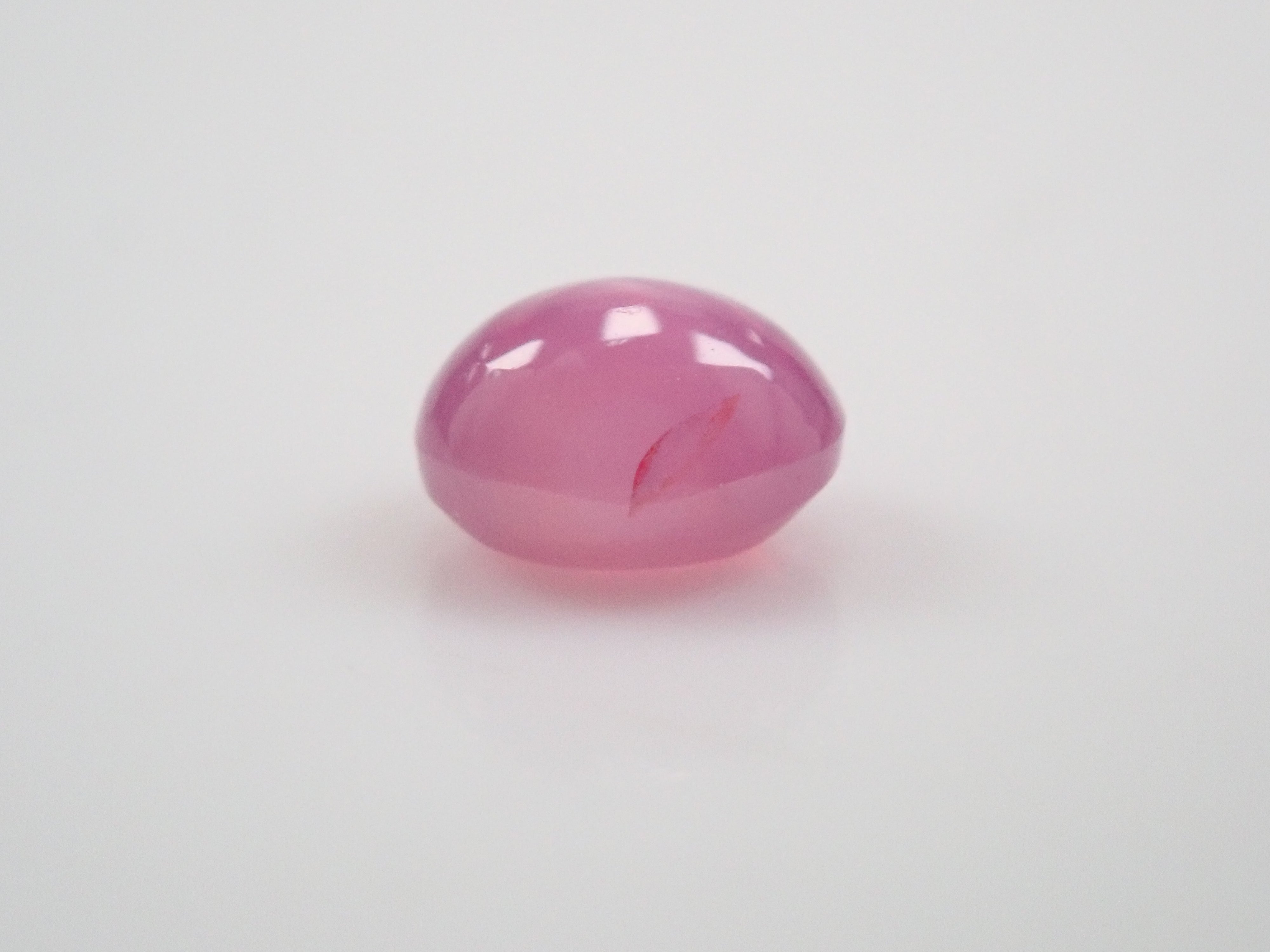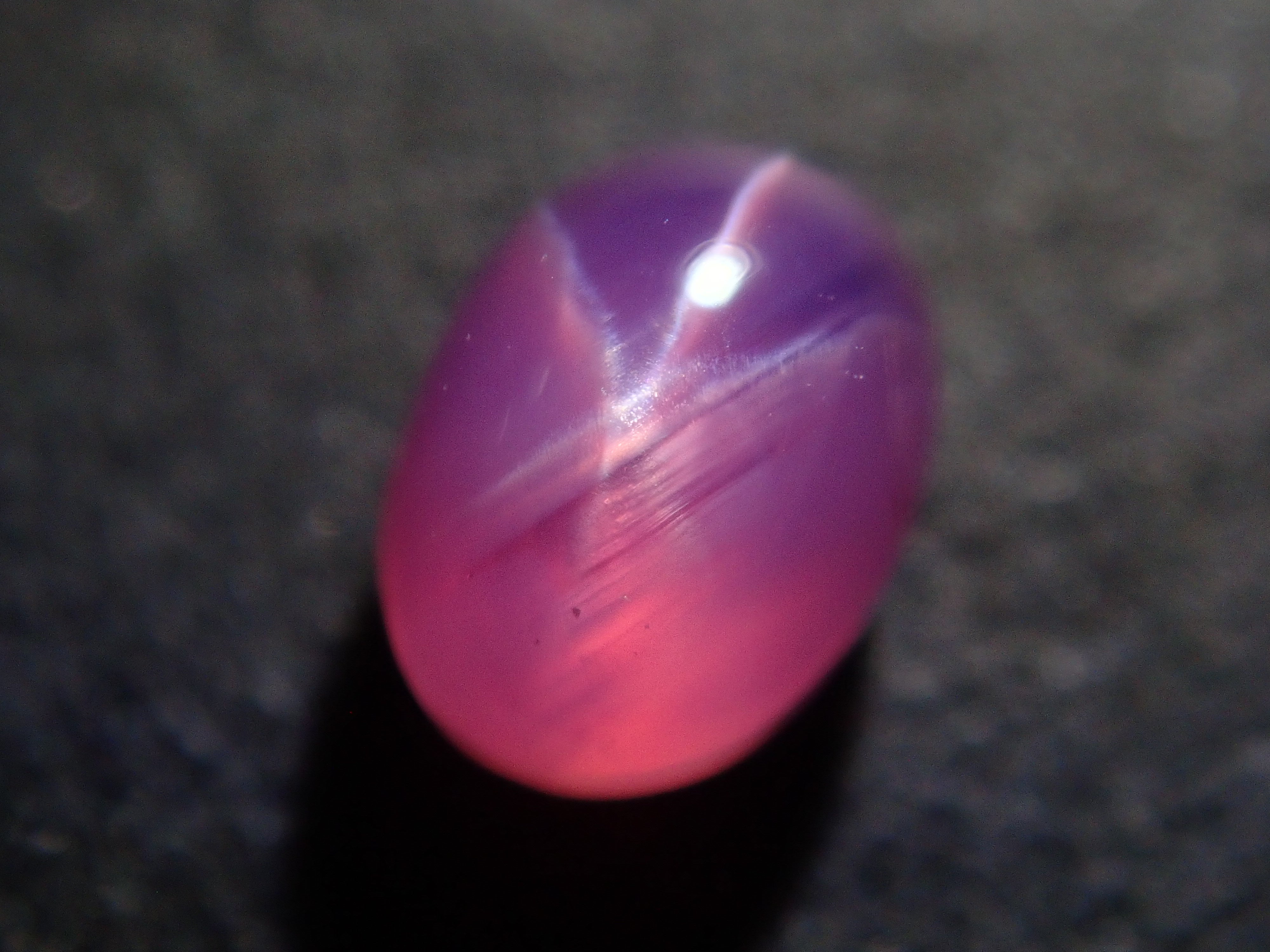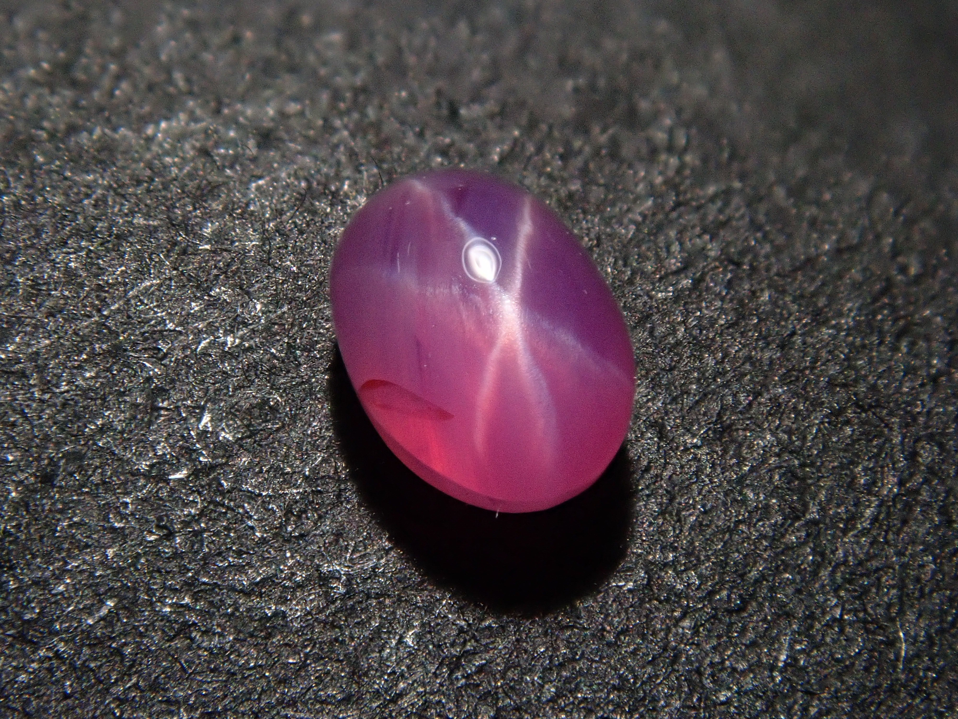 藍寶石是一種著名的寶石。其礦物成分是剛玉,與紅寶石相同,但除紅色以外的所有剛玉都被稱為藍寶石。這顆是粉紅色藍寶石,也具有星光效果。照片使用了筆型手電筒。寶石背面通常未經拋光。