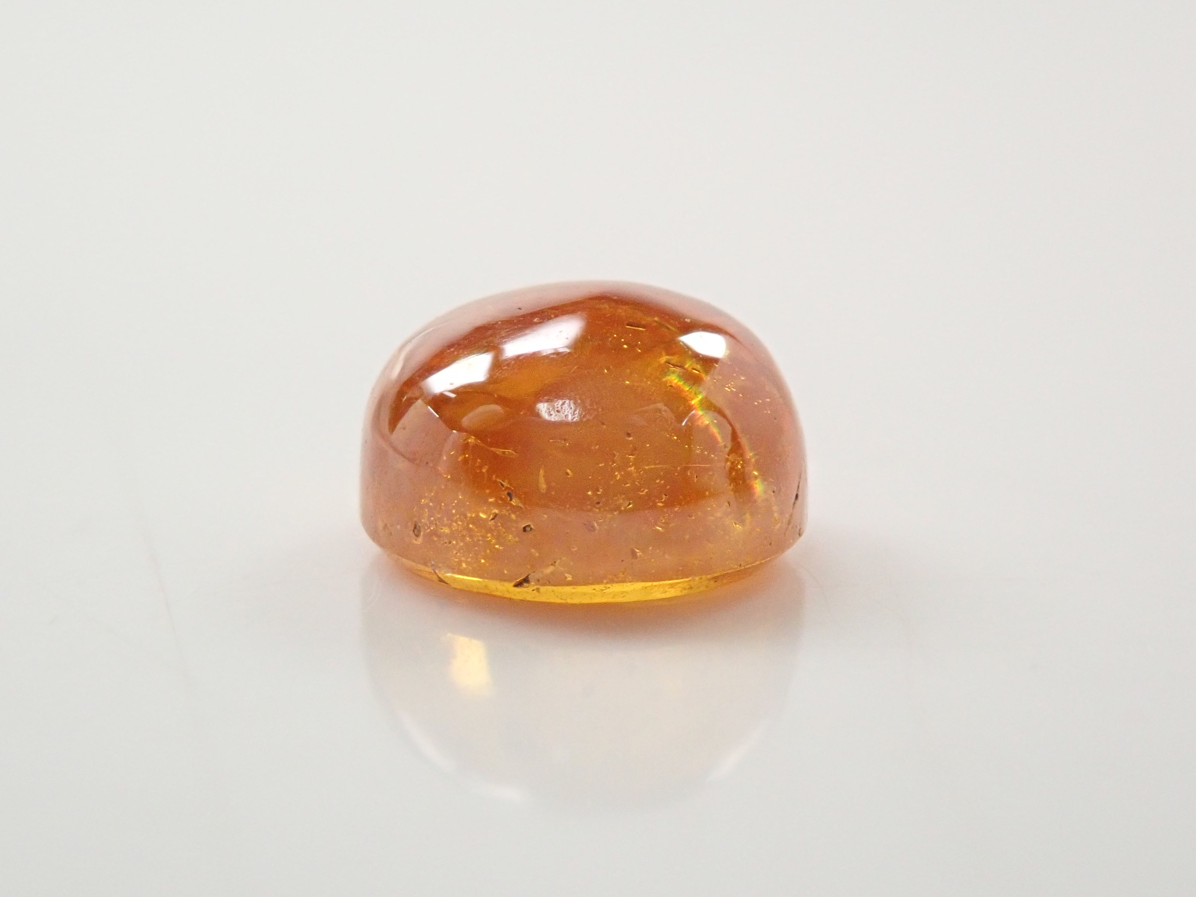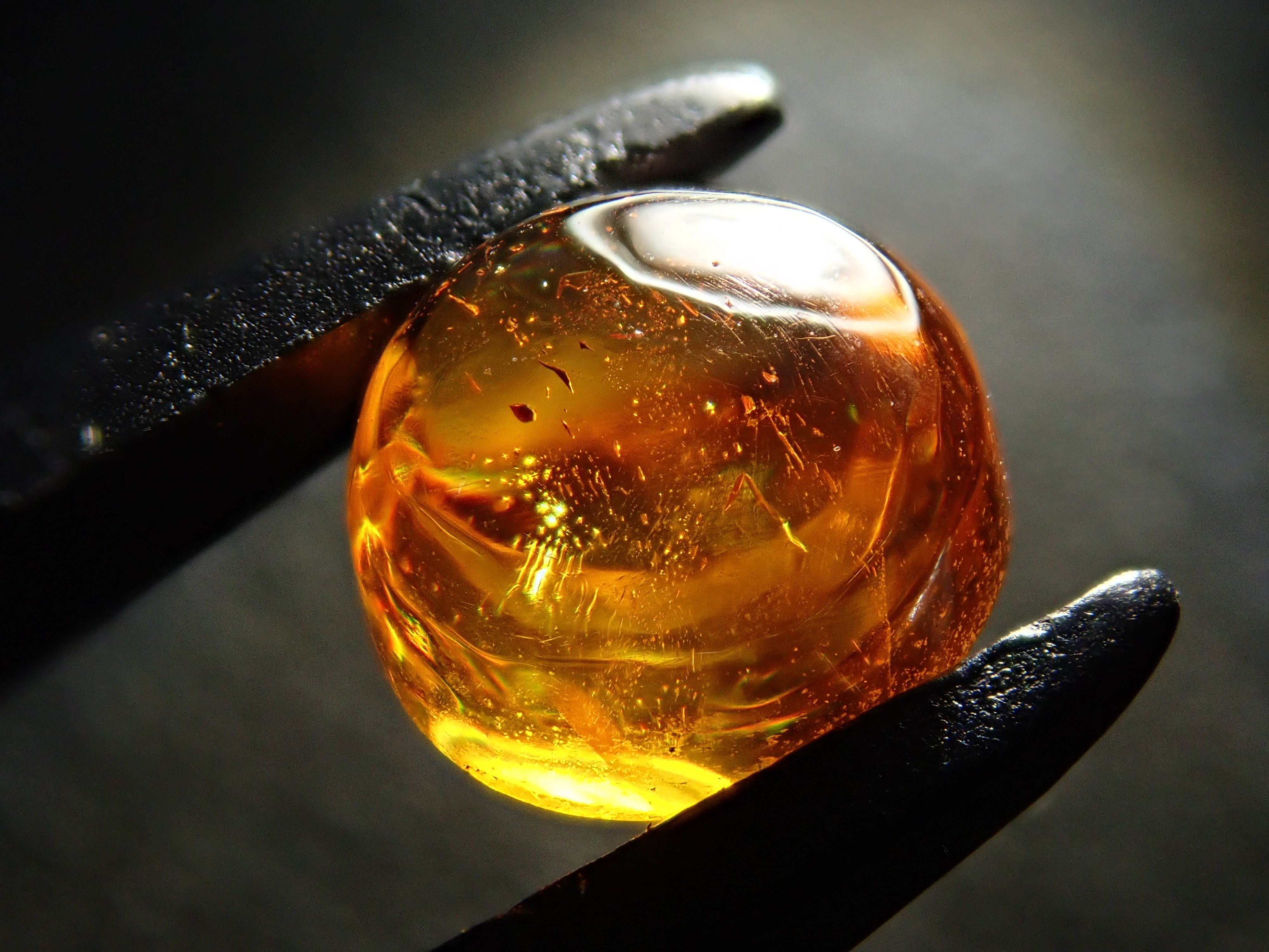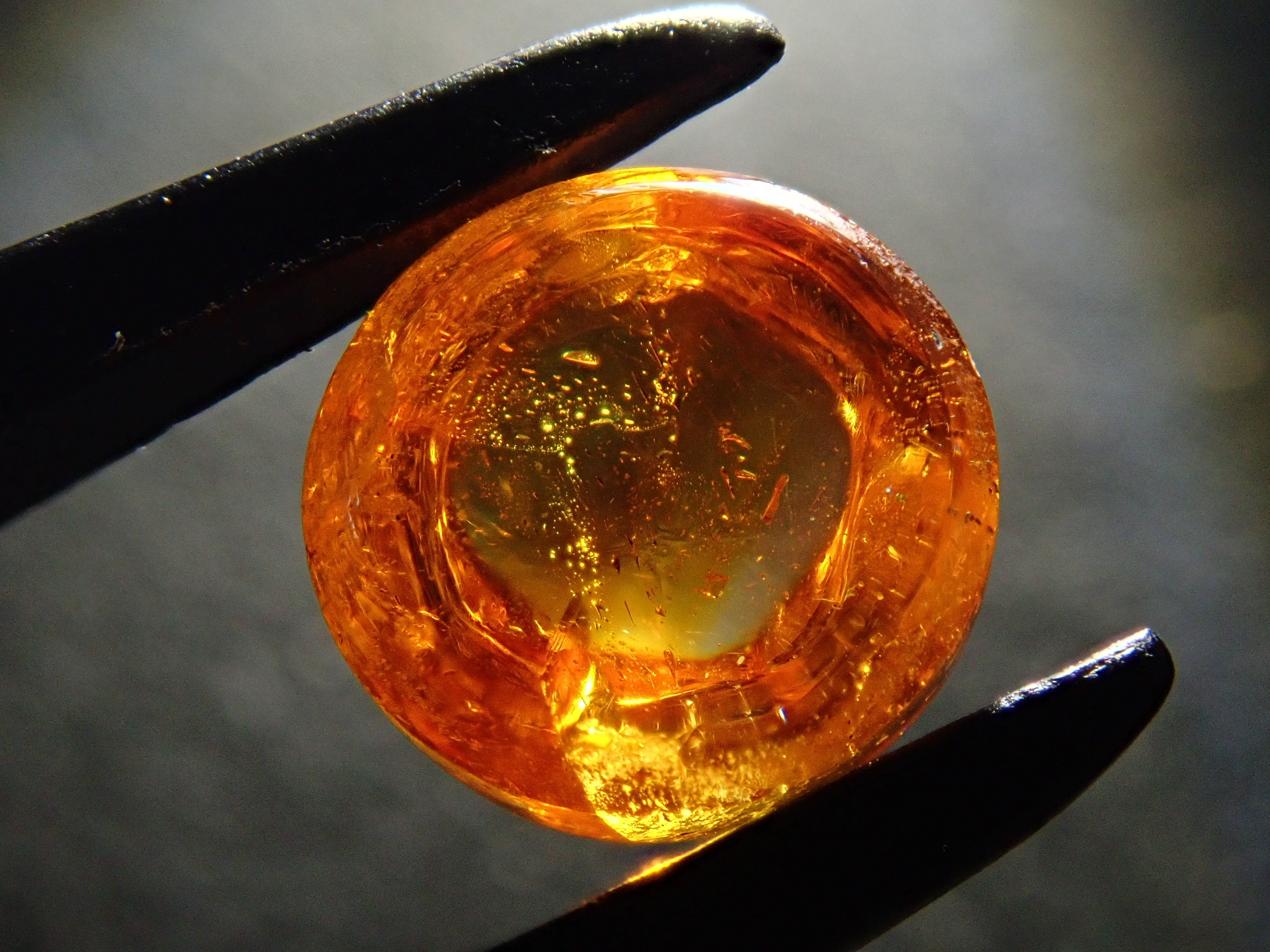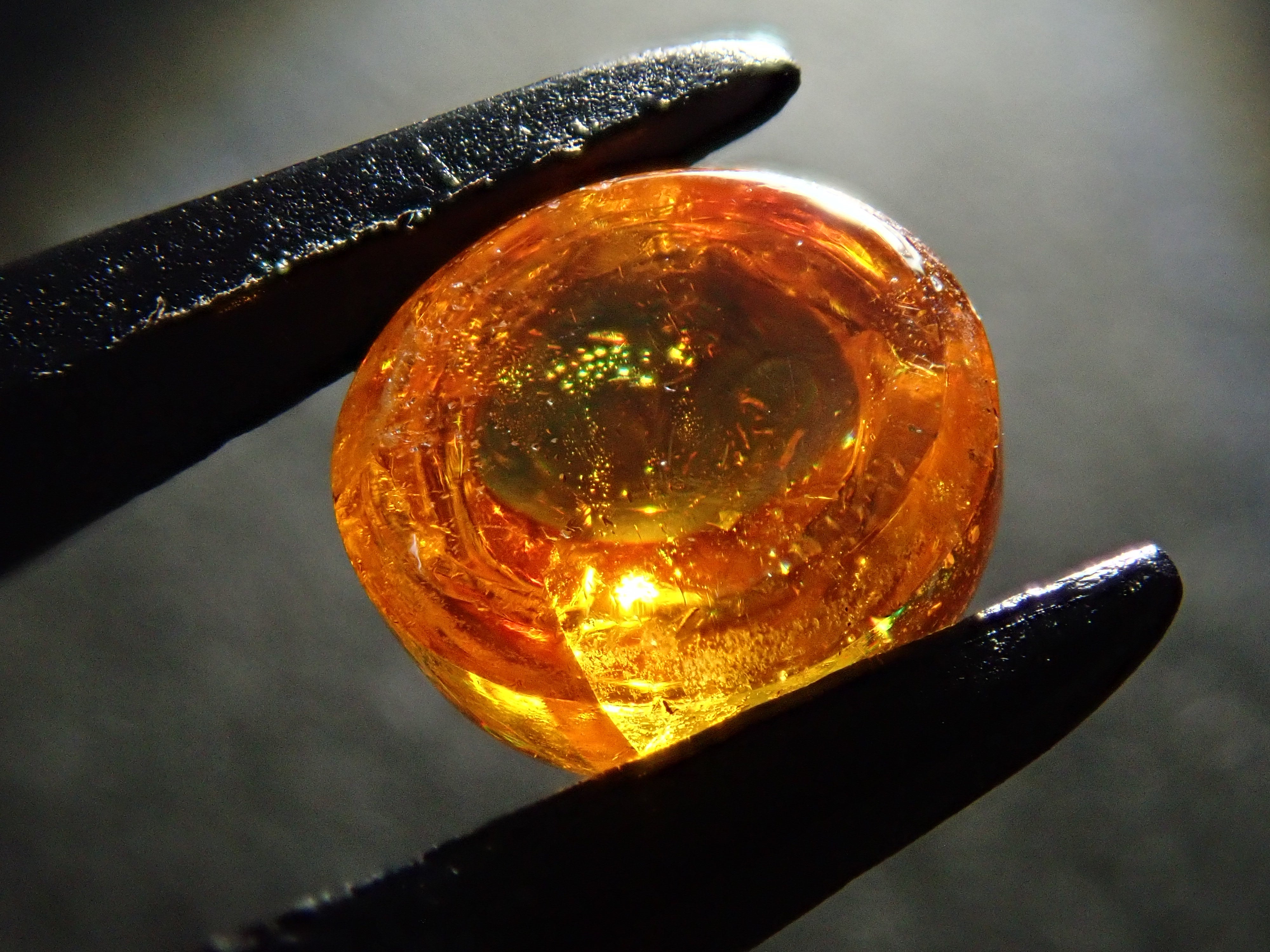 閃鋅礦的色散率幾乎是鑽石的四倍,並能展現出絢麗的火彩。據說,閃鋅礦是稀有寶石之一,流通量很小,在市場上並不常見。其底色為黃色、橙色、綠色等,火彩則呈現各種顏色,例如黃色、棕色、橙色、紅色和綠色。這是一顆剛抵達圖森的凸圓形切割西班牙閃鋅礦。