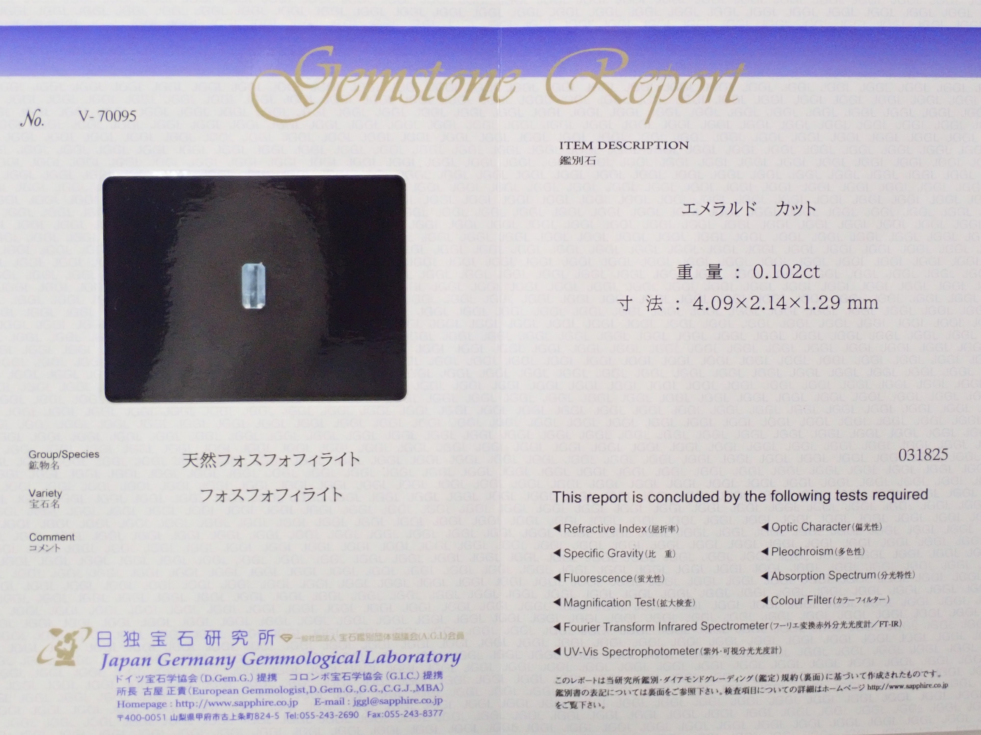 磷葉石因出現在一部著名的寶石漫畫中而成為一種廣受歡迎的稀有寶石。大顆的磷葉石非常罕見,而切割後的磷葉石則非常珍貴,因為它們易碎且易碎。然而,不難理解為什麼有些人會被這種藍綠色的美麗而短暫的色彩所吸引。磷葉石也有無色和深綠色兩種顏色,其中深綠色特別罕見。它附有日德寶石學院的鑑定證書。