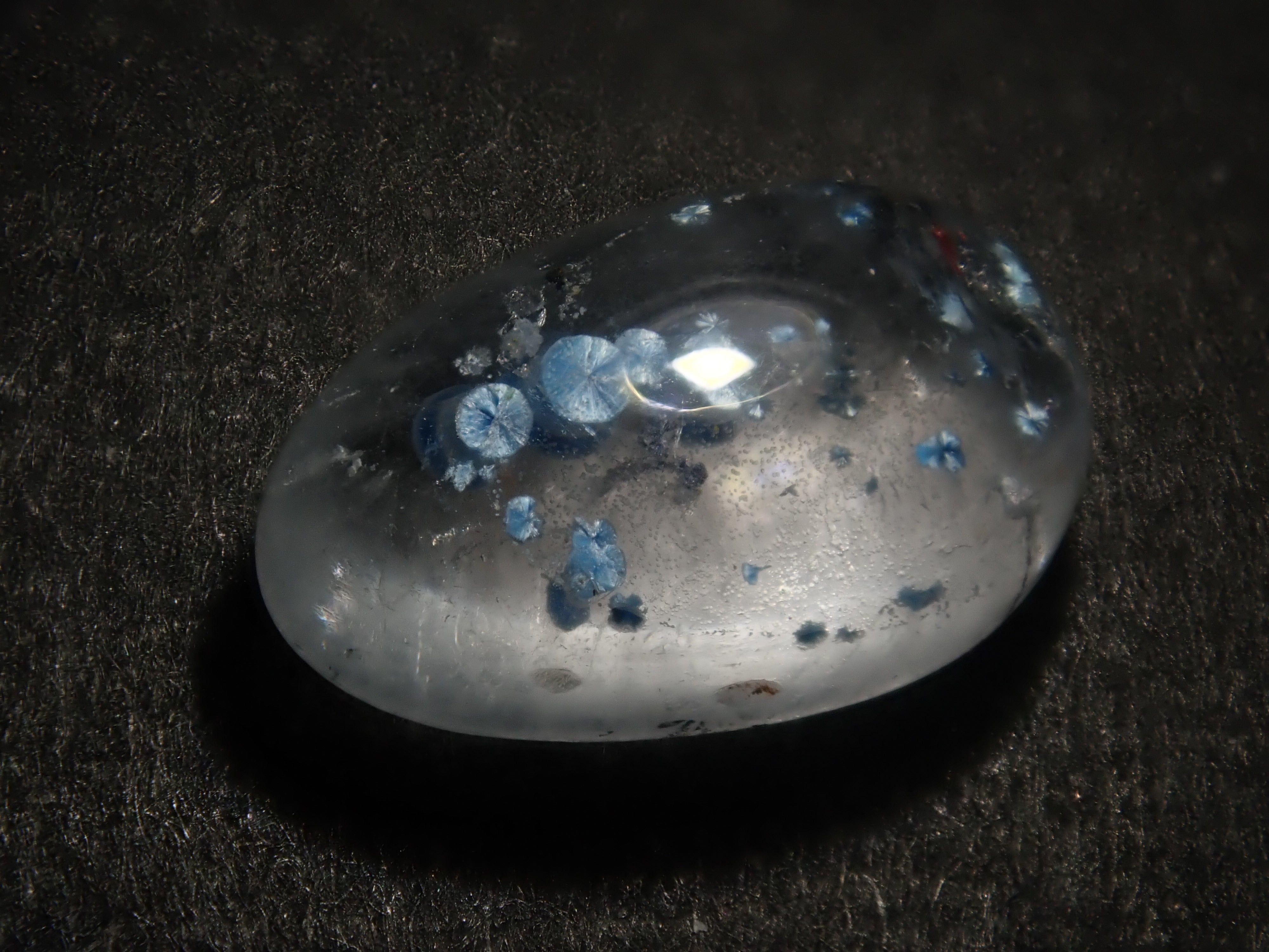 美杜莎石英的晶體內部含有礦物「giralite」(一種水母)的包裹體。它有時被稱為“giralite-in-quartz”(石英內含giralite),但GIA將其命名為“美杜莎石英”,因為其包裹體形似一種名為“美杜莎水母”的水母。它還有幾個暱稱,例如“帕拉伊巴石英”,因為它美麗的藍色讓人聯想到帕拉伊巴碧璽,也因為它產自巴西帕拉伊巴碧璽的產地。盡情欣賞這顆寶石內部展現的神秘而美麗的世界吧。