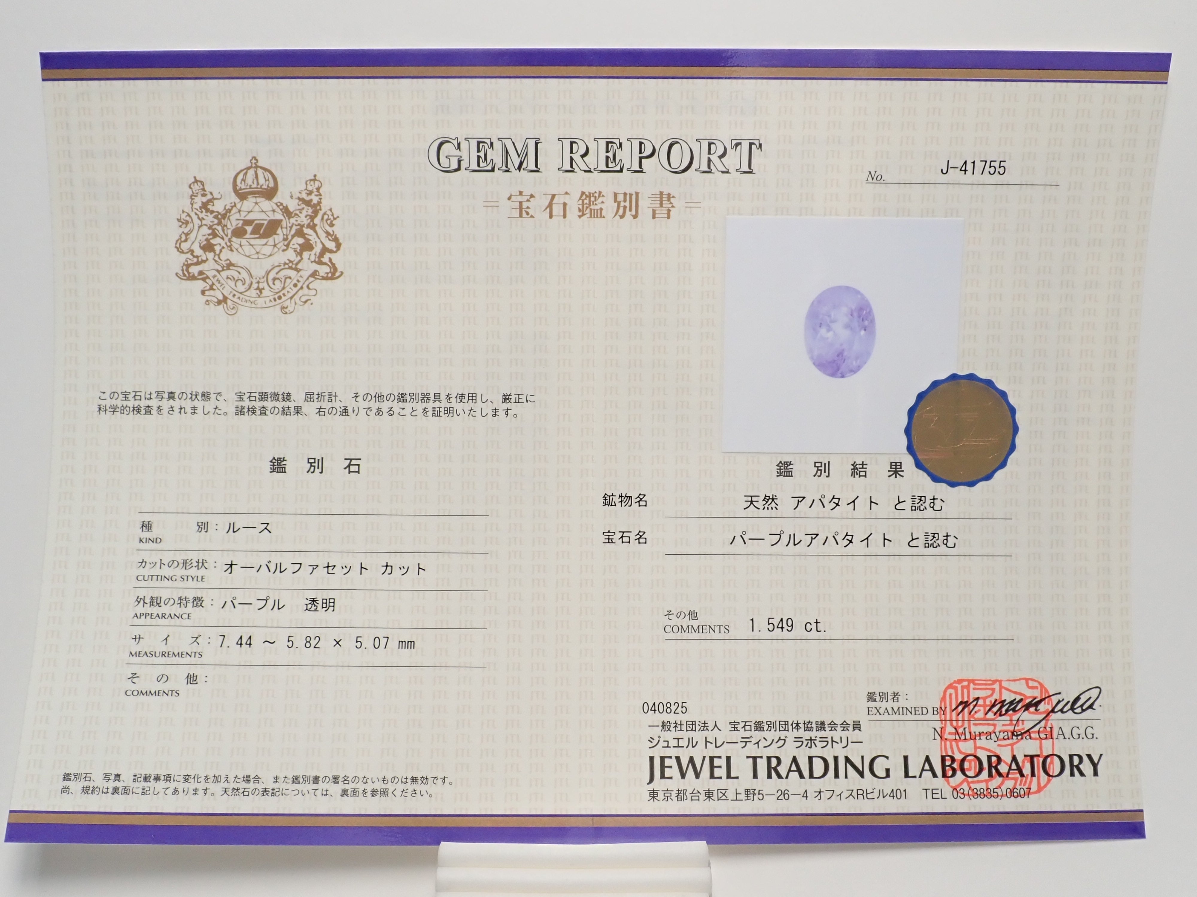 附有 JTL 真品證書。