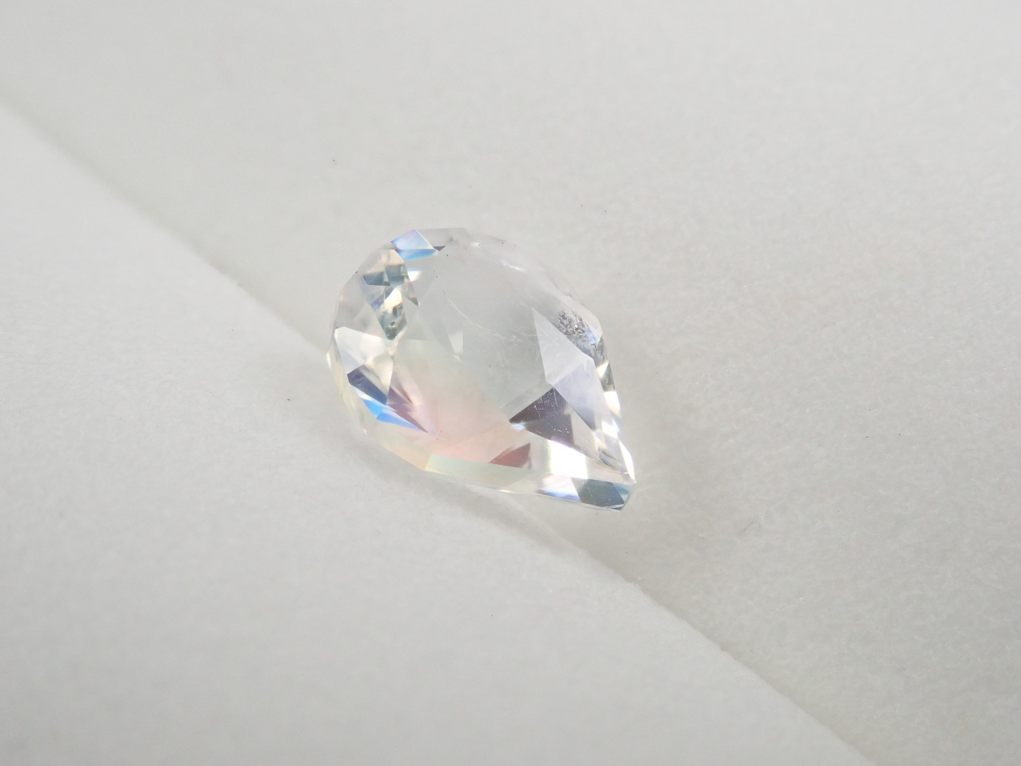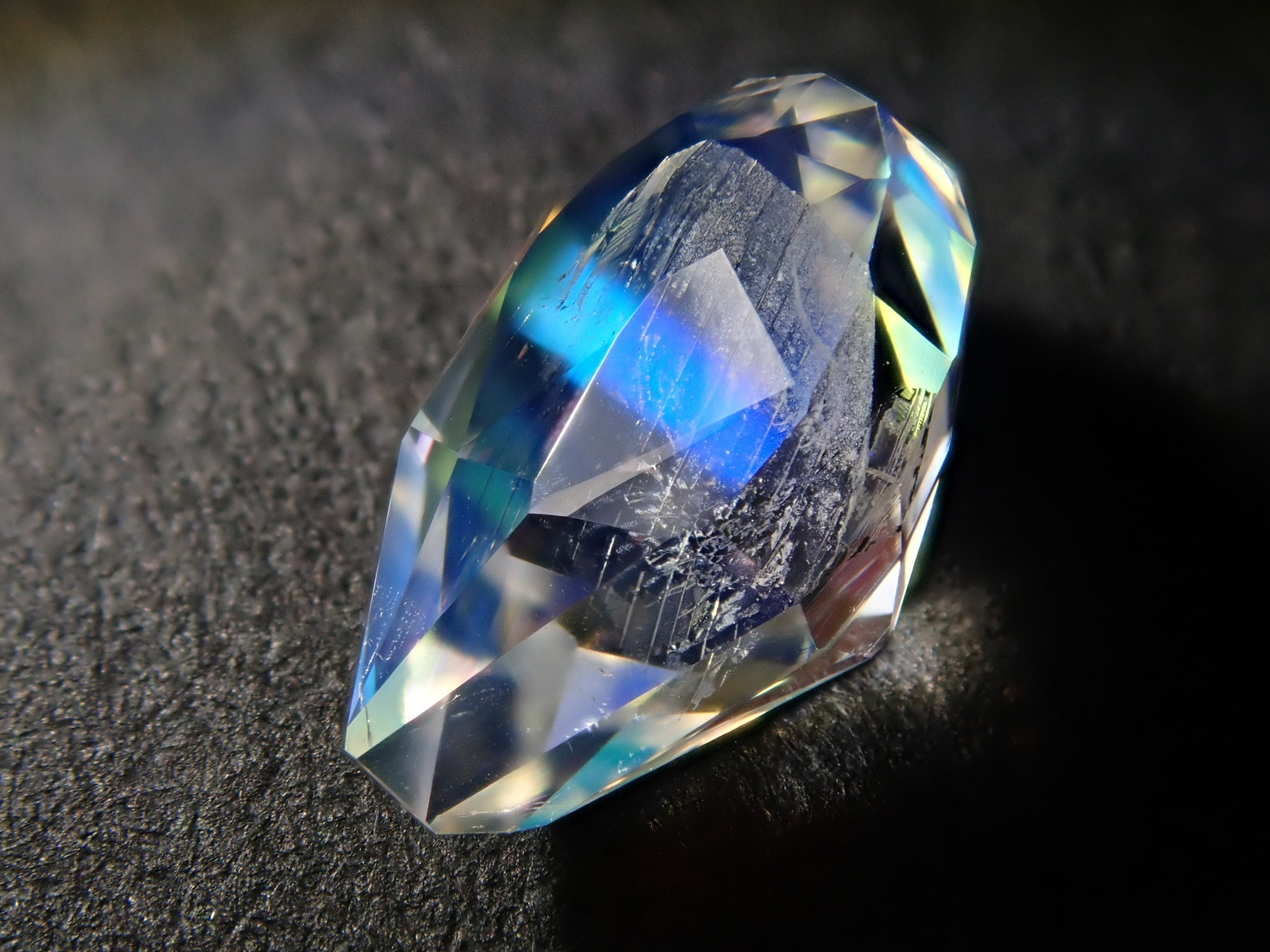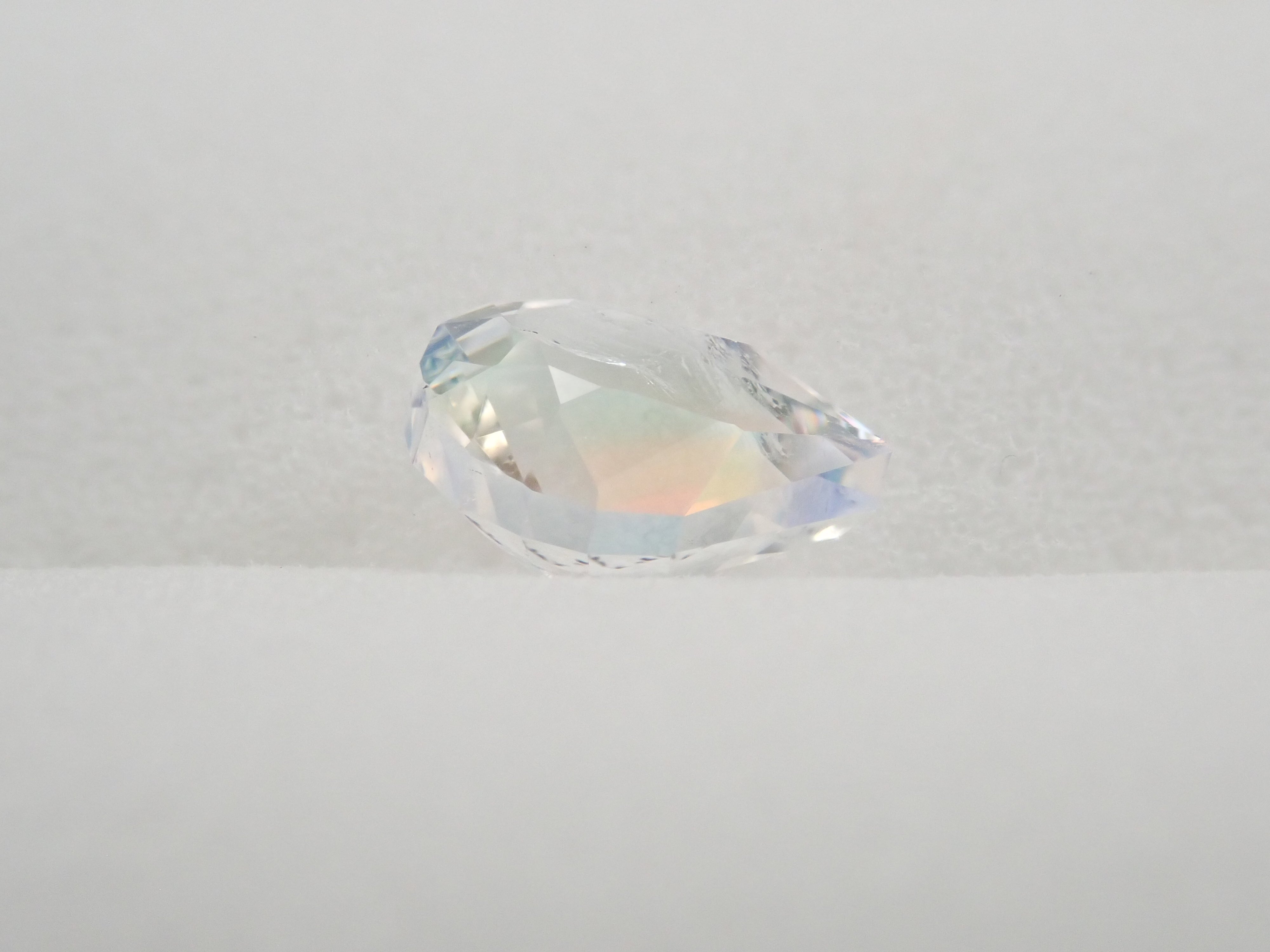 這塊寶石位於斜長石組,介於中長石和拉長石之間。彩虹般的光學效果閃耀著神秘的光芒,讓人忍不住想永遠凝視它。 這是產自馬達加斯加的中長石,由斯里蘭卡切割師 Sanjay 切割。