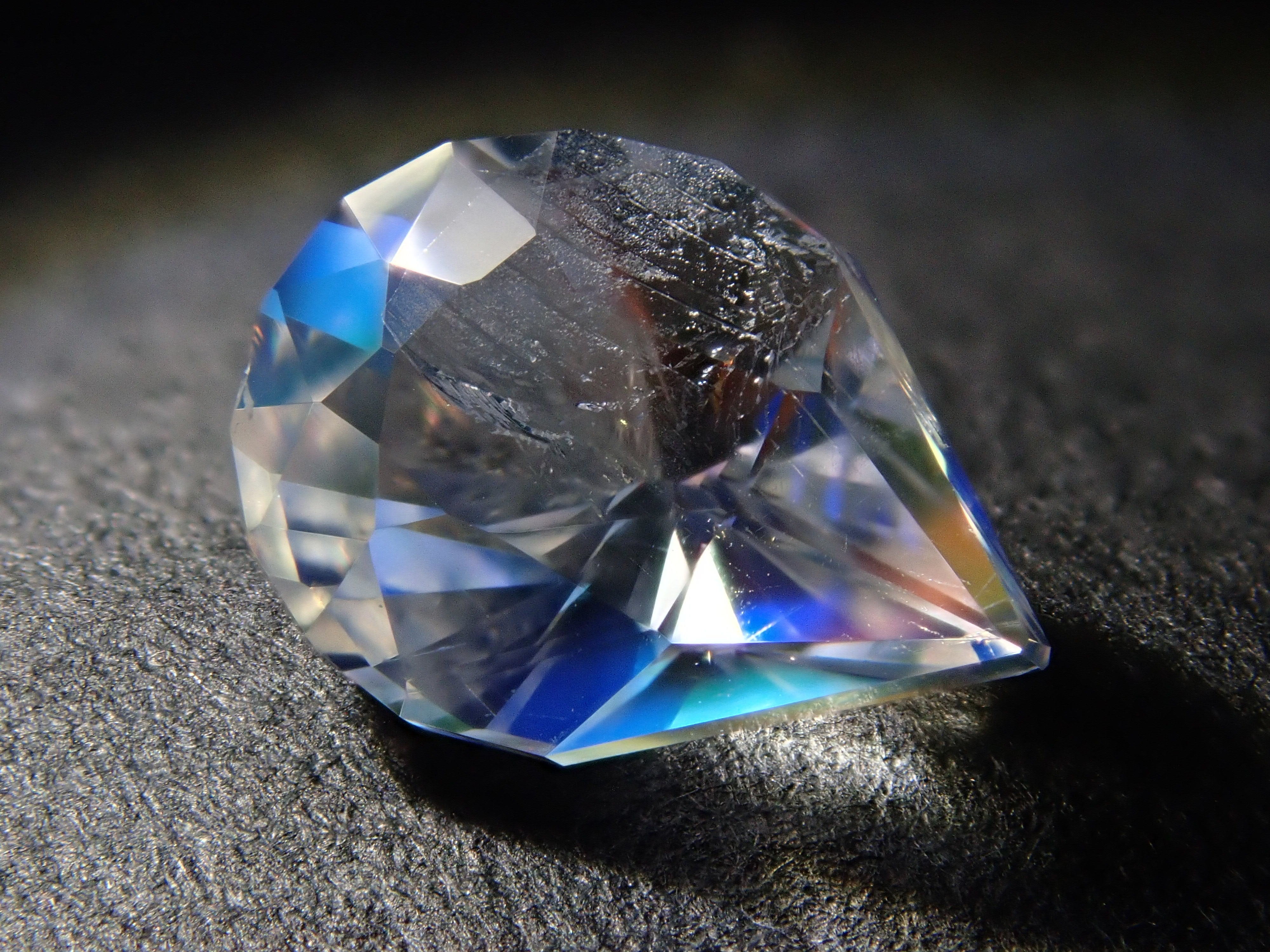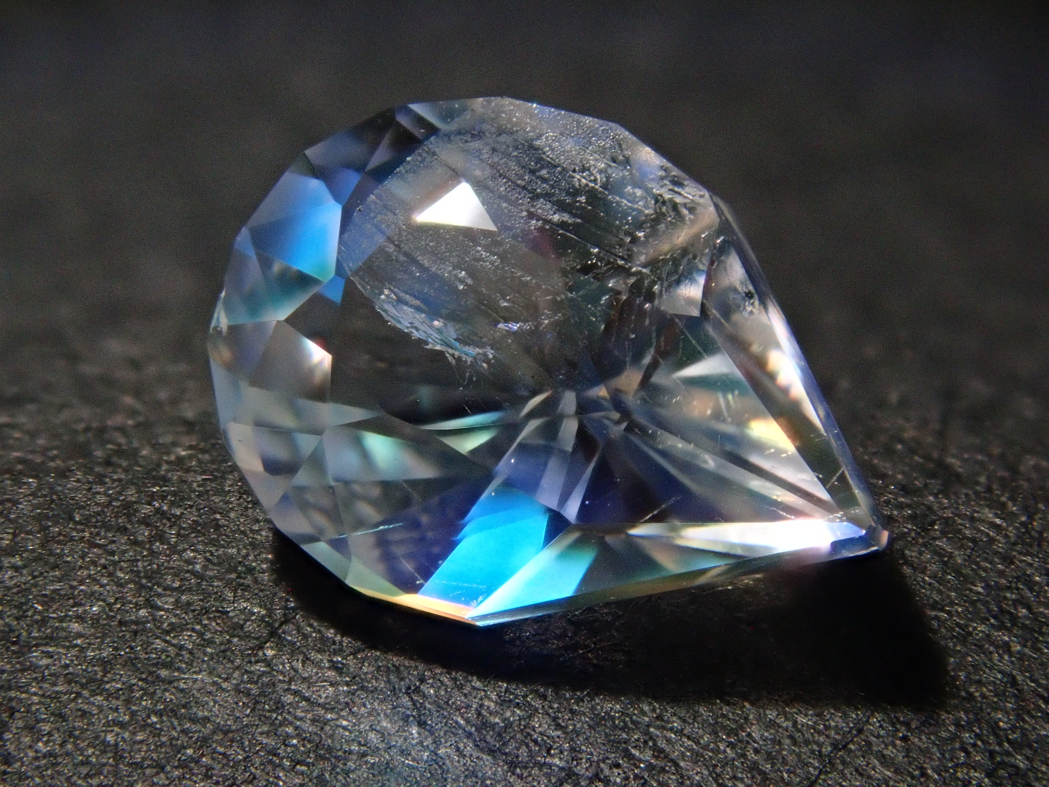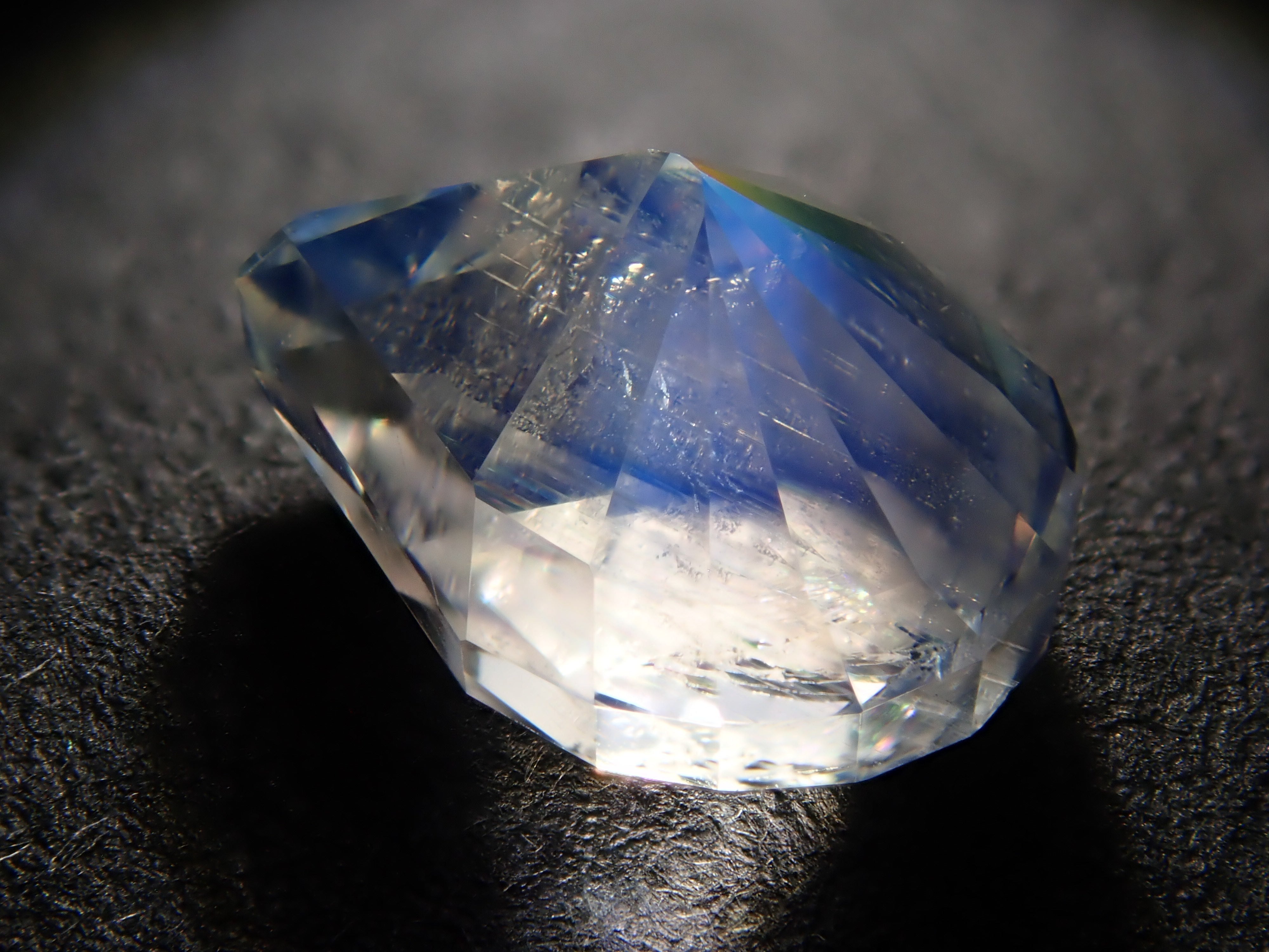 這塊寶石位於斜長石組,介於中長石和拉長石之間。彩虹般的光學效果閃耀著神秘的光芒,讓人忍不住想永遠凝視它。 這是產自馬達加斯加的中長石,由斯里蘭卡切割師 Sanjay 切割。