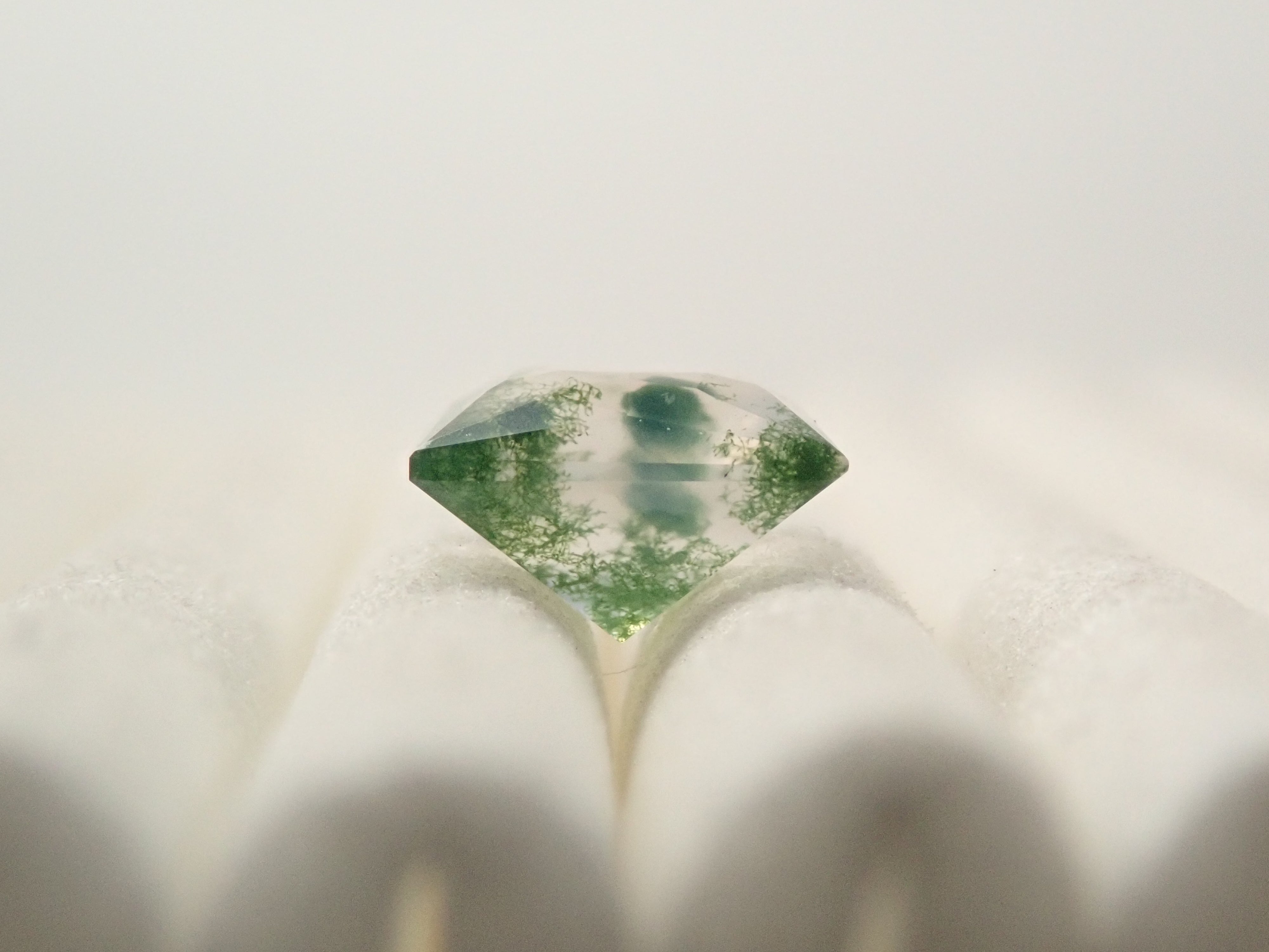 苔蘚瑪瑙是一種神秘的寶石,看起來彷彿植物融入其中。其花紋類似苔蘚、水下藻類,有些則呈現深綠色,如同樹枝或森林。苔蘚瑪瑙是一種多晶質的石英。它的日文名稱是“瑪瑙”,有記載顯示它在日本被開採。這塊苔蘚瑪瑙由斯里蘭卡切割師 Sanjay 切割。