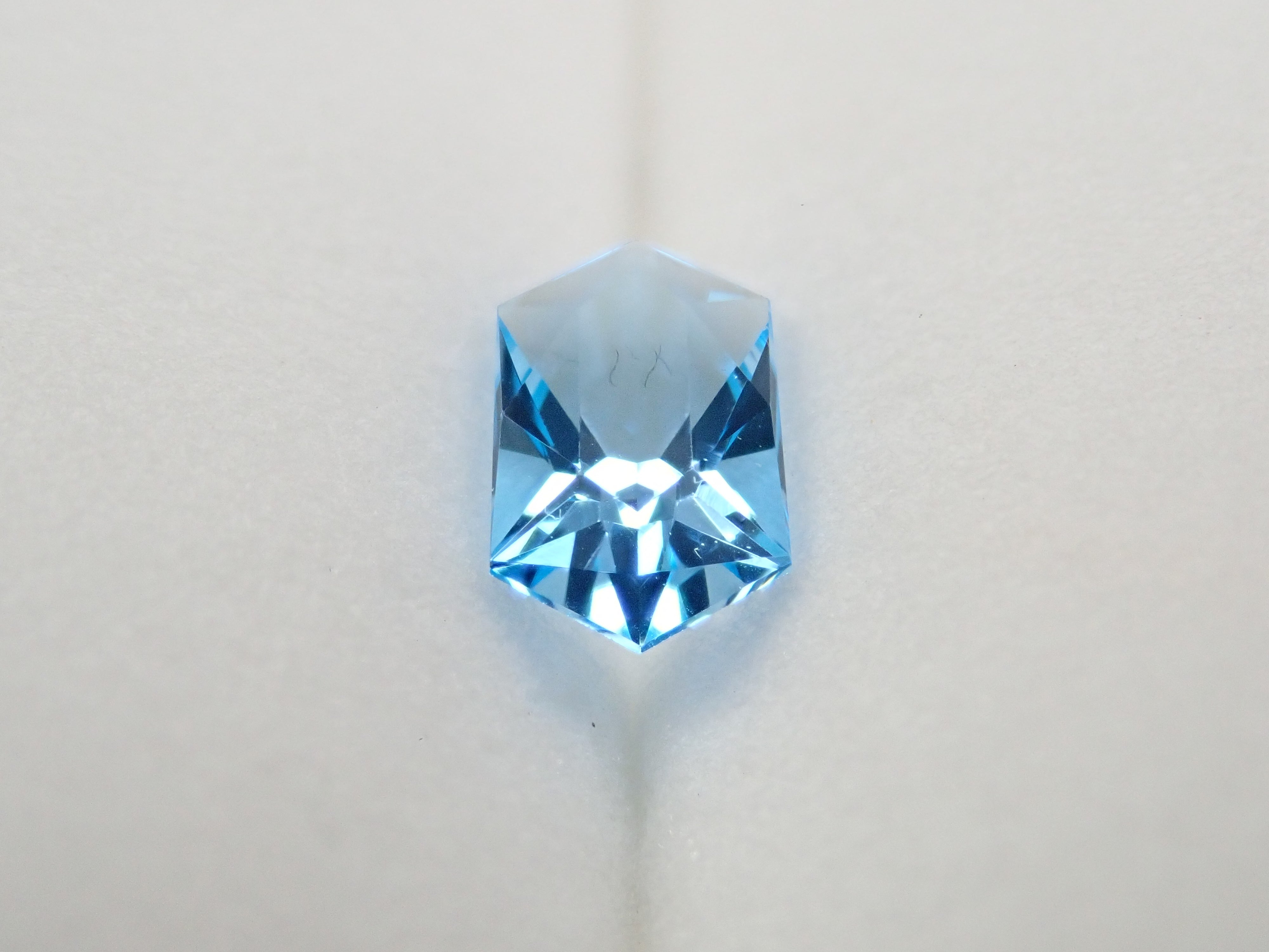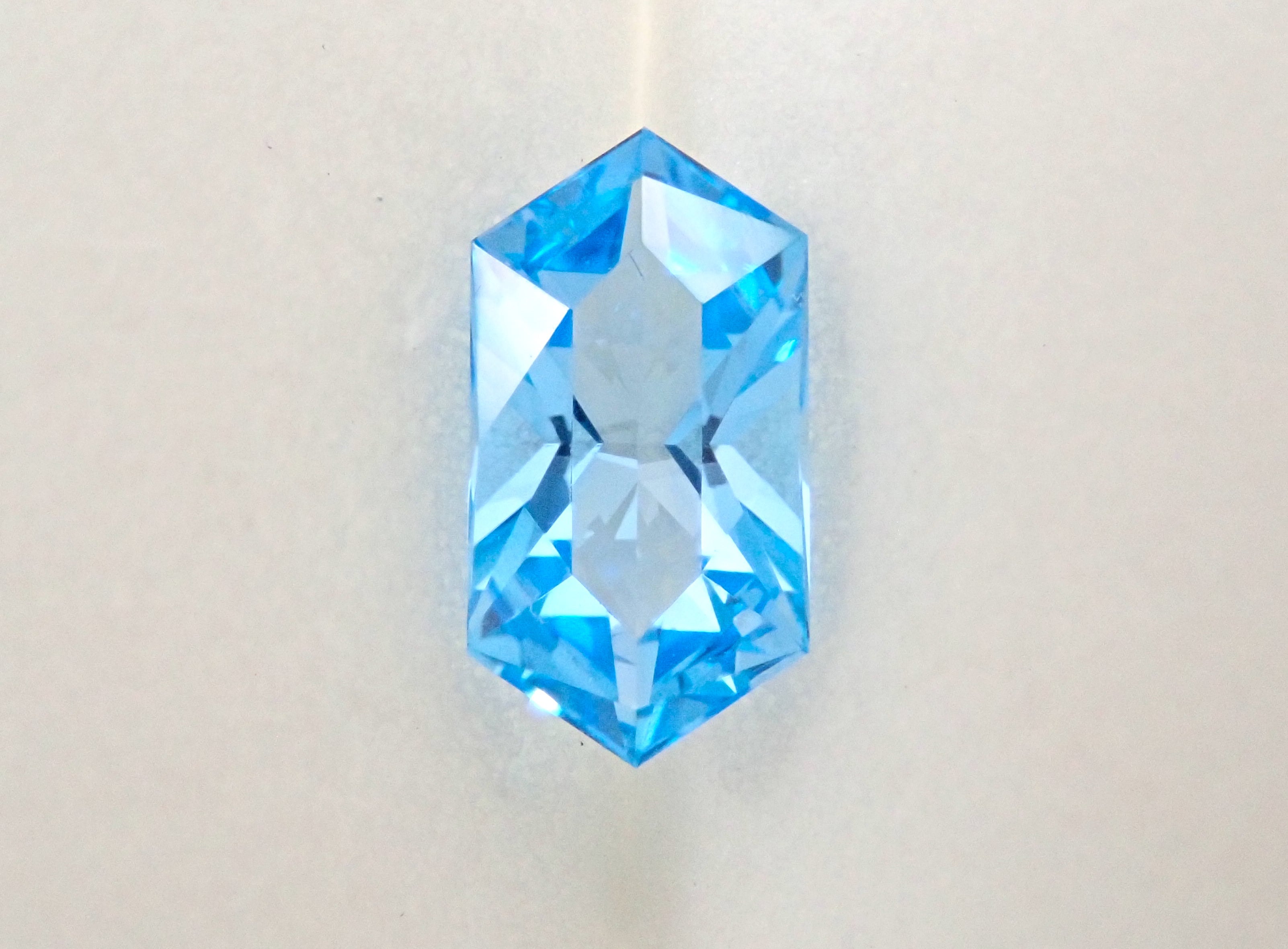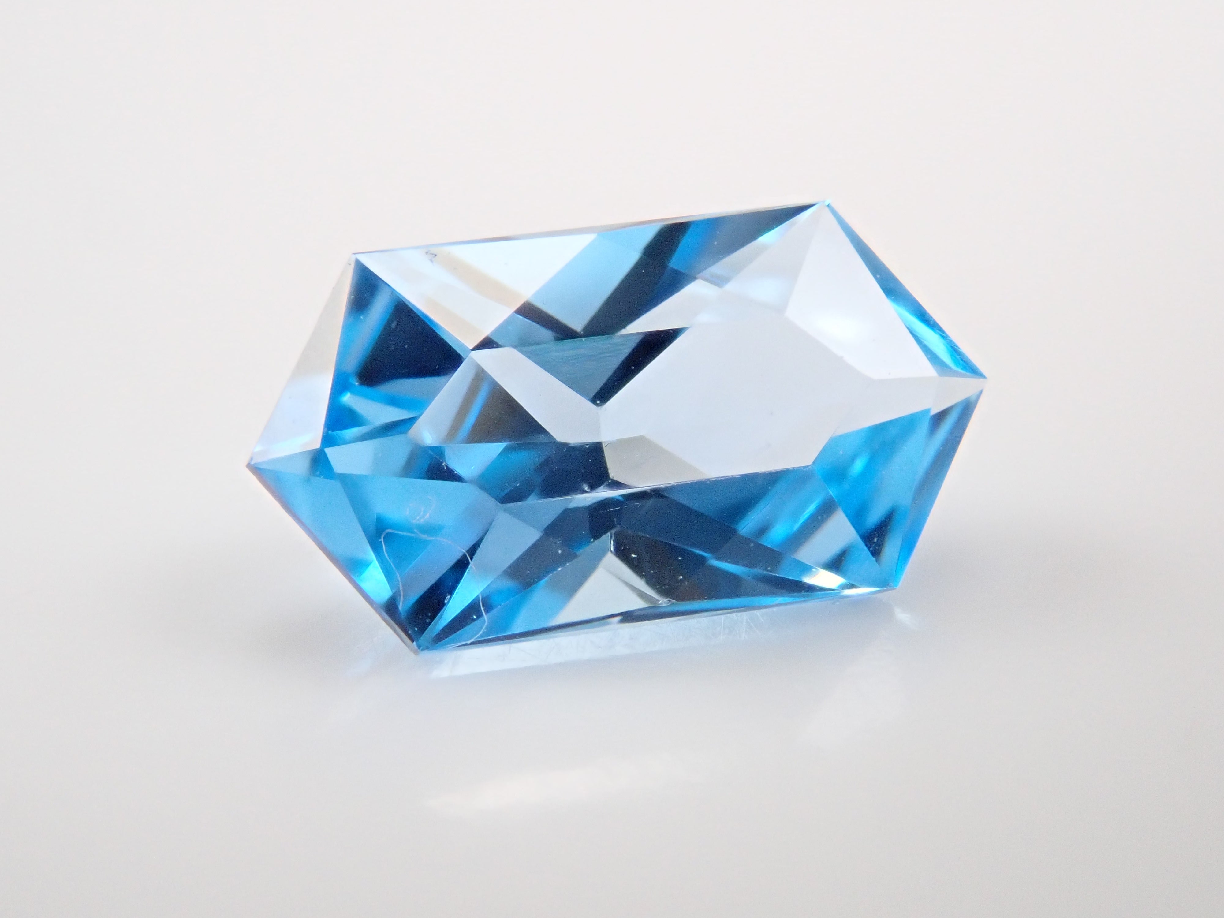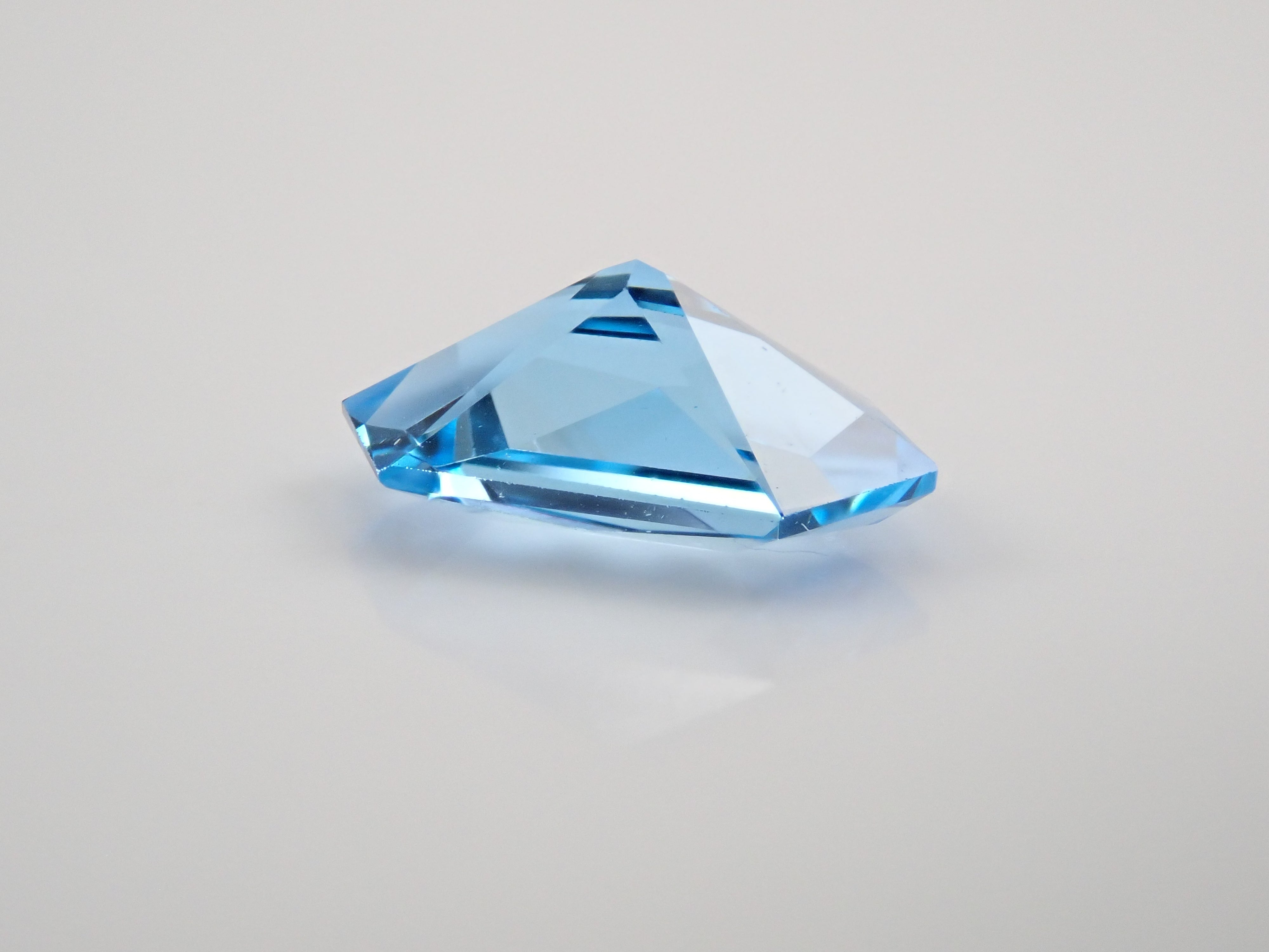藍色托帕石以其迷人的藍色,是眾多托帕石變種中最受歡迎的顏色之一。其中,「瑞士藍托帕石」指的是像這顆散石一樣,擁有深邃而鮮豔藍色的寶石。這是一顆產自巴西的瑞士藍色托帕石,由斯里蘭卡拋光師桑傑拋光而成。