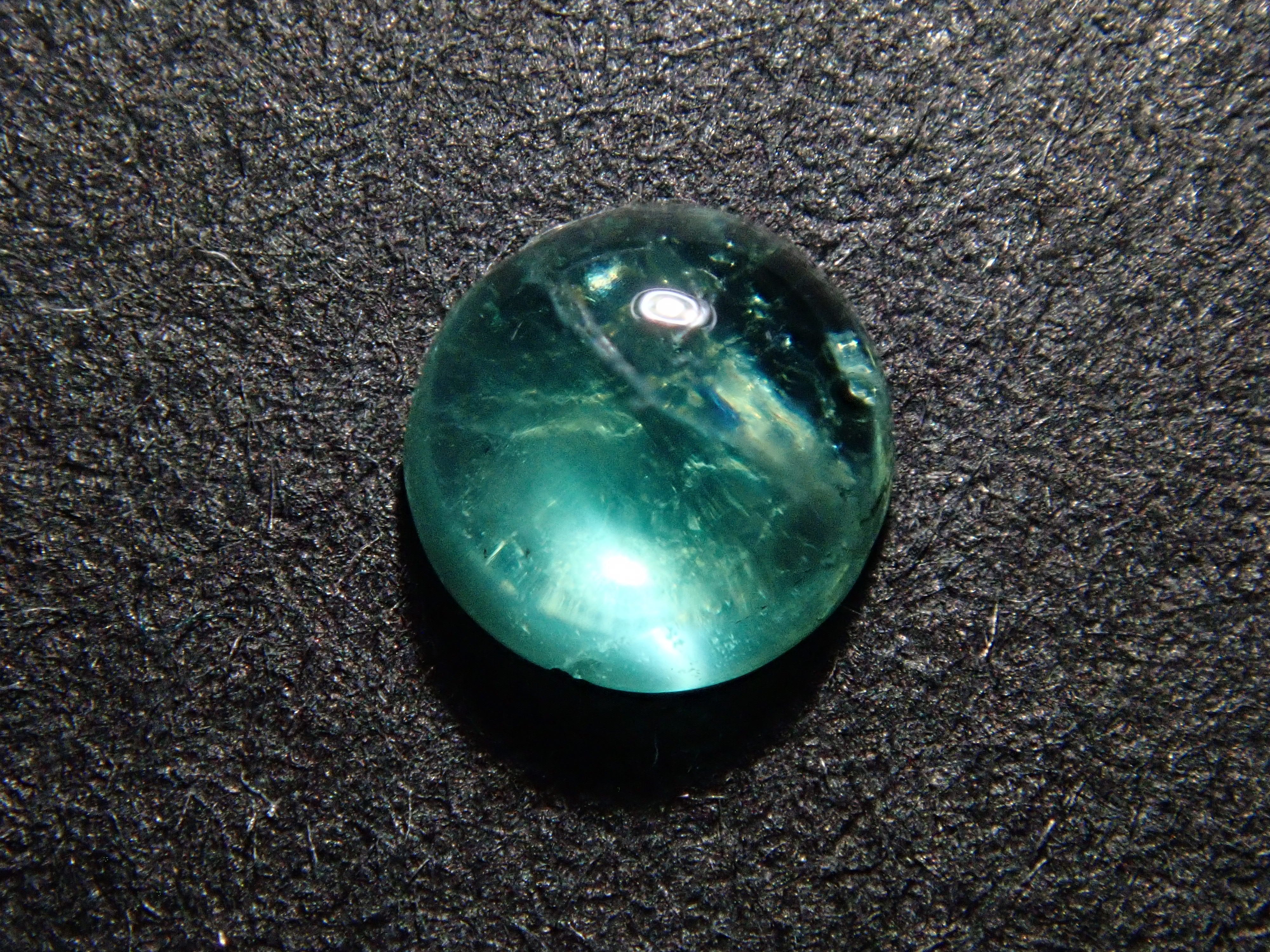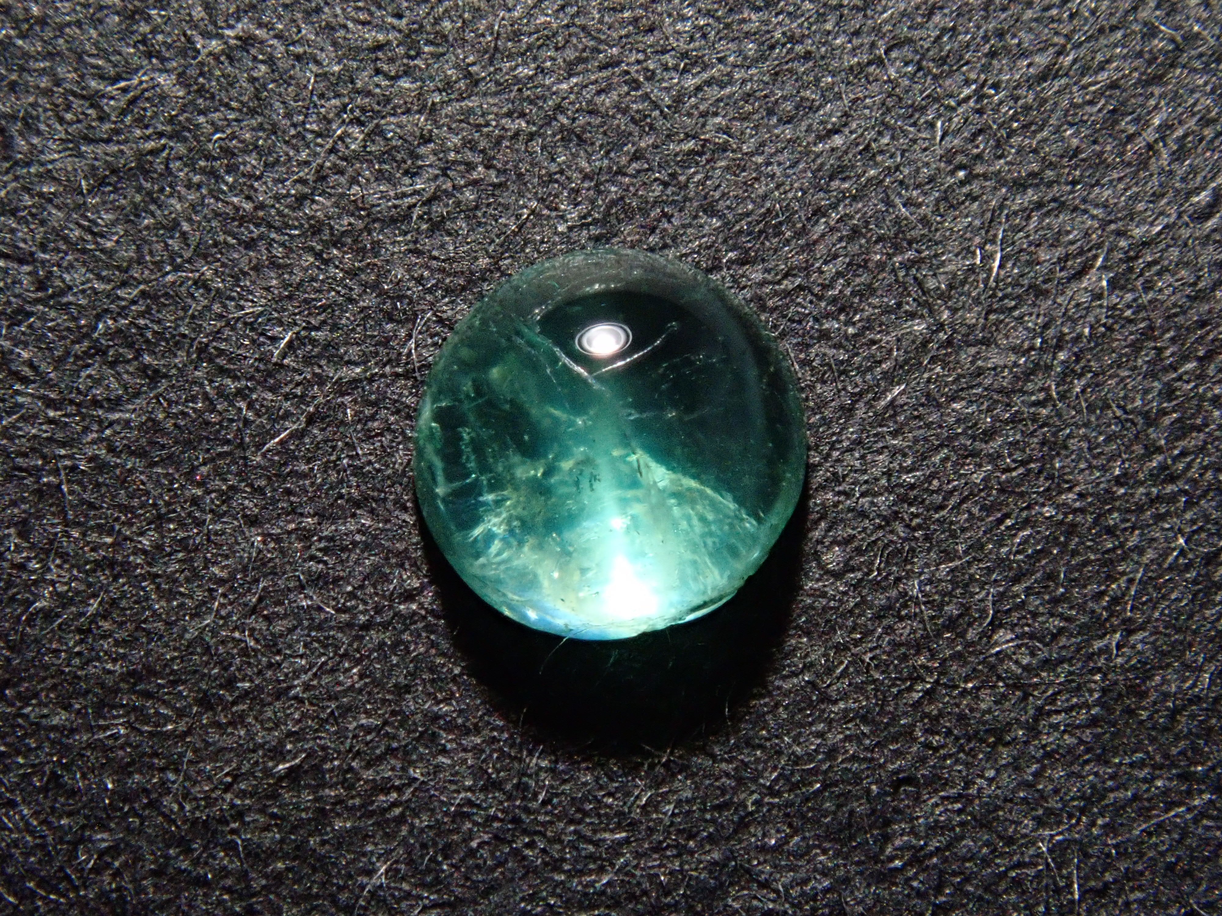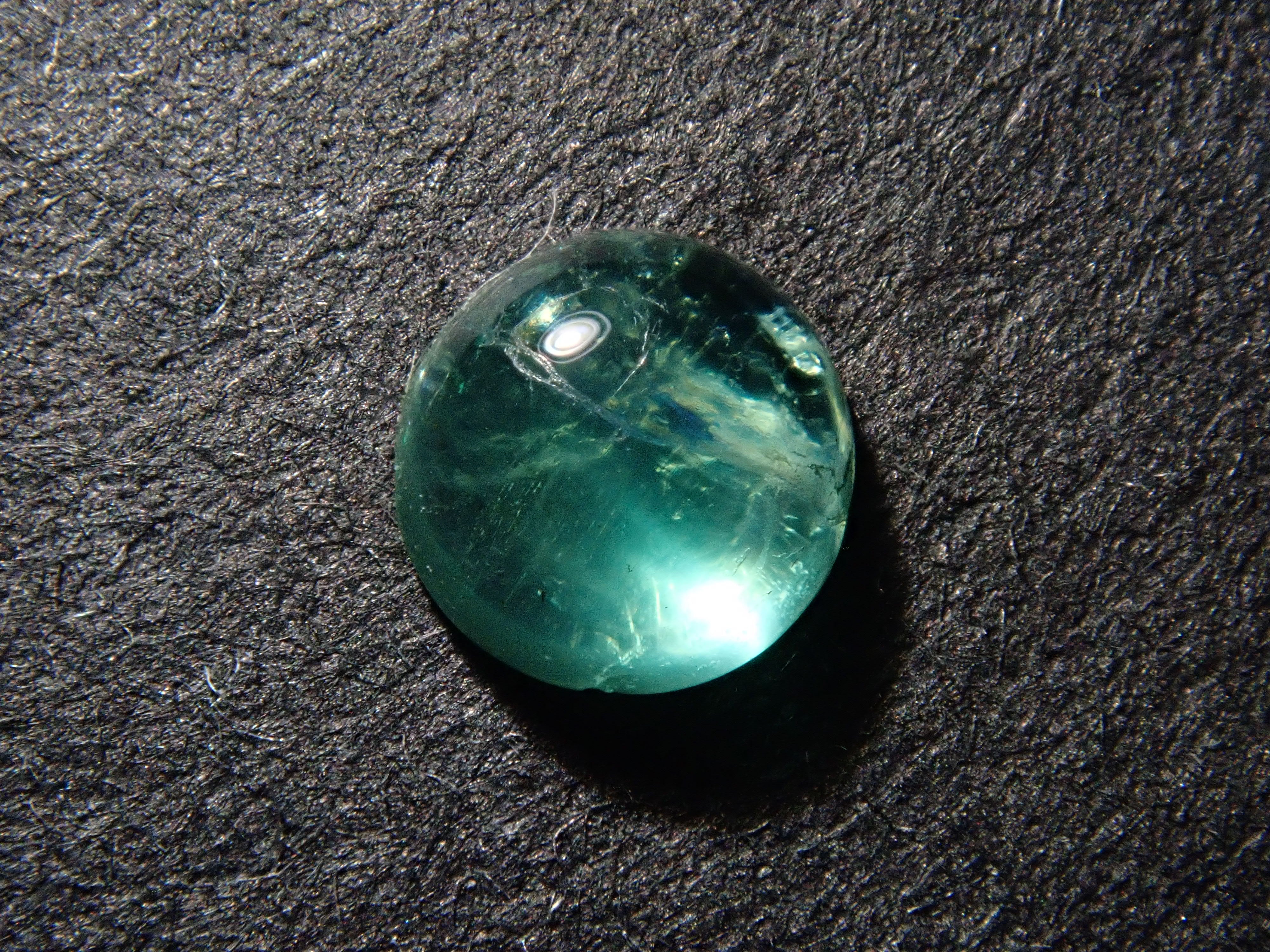 祖母綠是克莉奧佩特拉鍾愛的著名寶石。據說,完美無瑕的祖母綠數量與完美無瑕的人一樣少。因此,人們通常會用油處理祖母綠,使刮痕不那麼明顯。在光線照射下,可以看到貓眼效應。這種兼具溫柔與清新的氣質,充滿魅力。照片是用筆形電筒拍攝的。寶石背面基本未經打磨。這顆寶石是一顆較為罕見的圓形切割(凸圓形)祖母綠貓眼裸石。