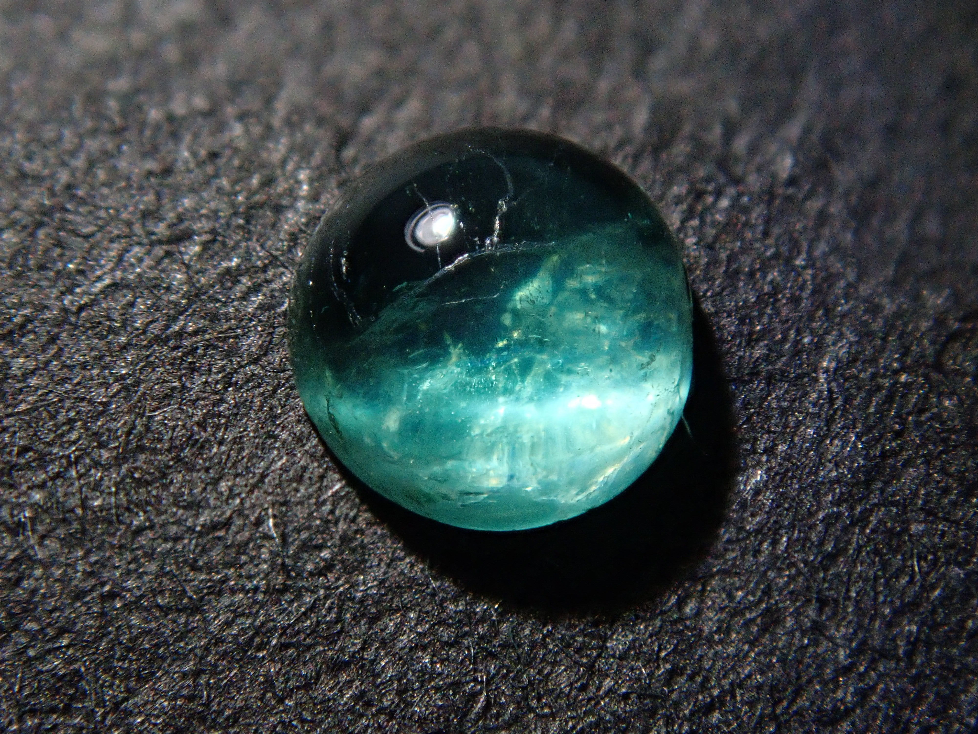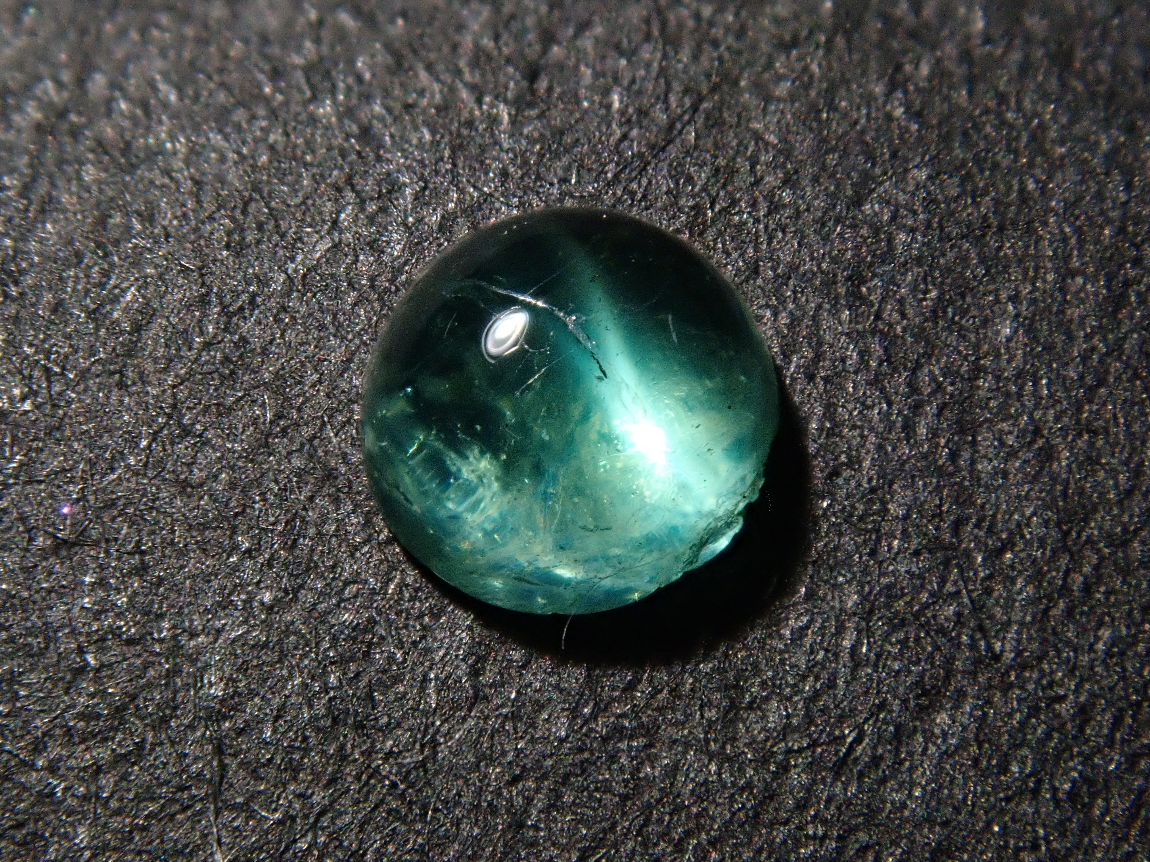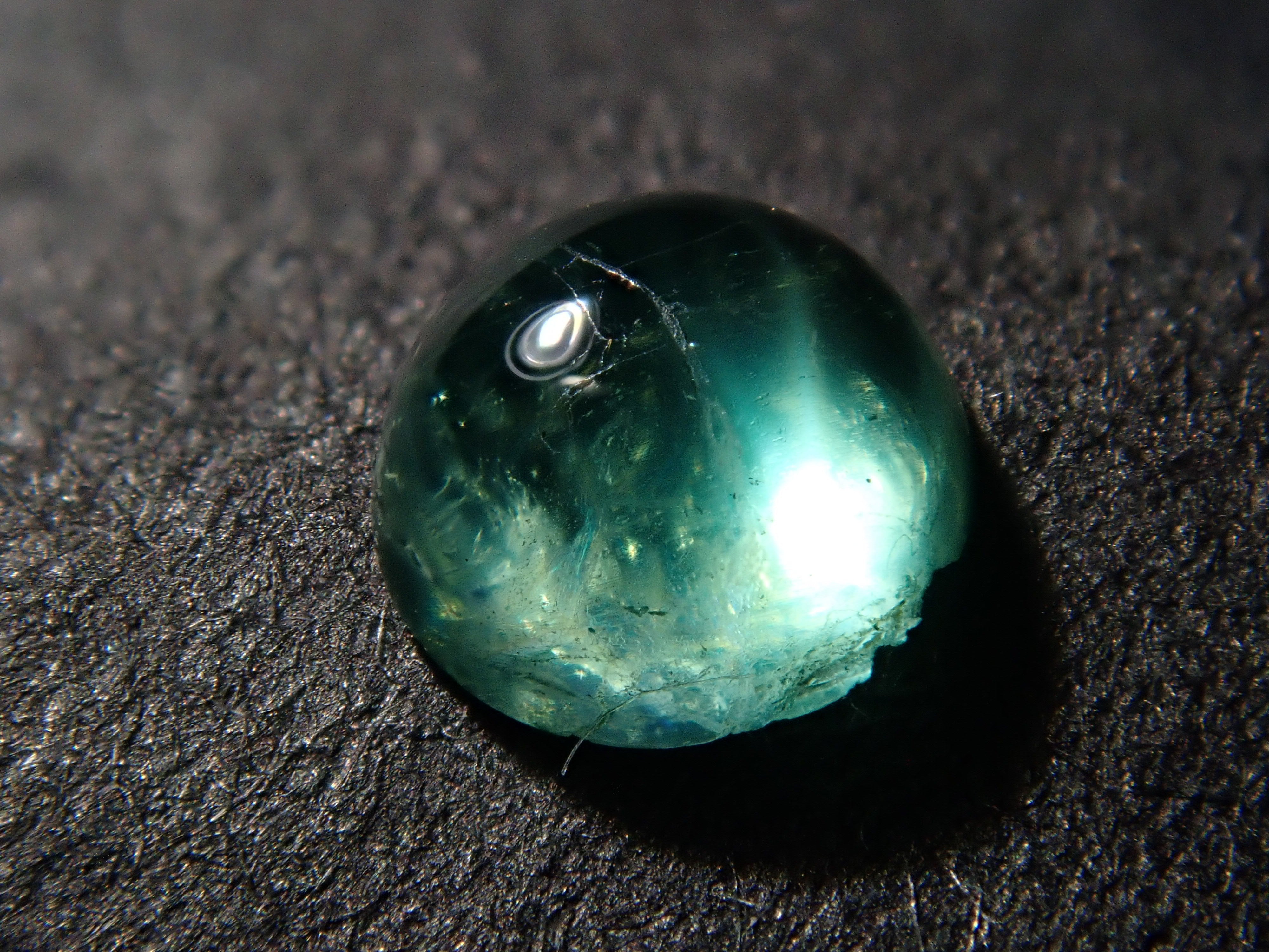 祖母綠是克莉奧佩特拉鍾愛的著名寶石。據說,完美無瑕的祖母綠數量與完美無瑕的人一樣少。因此,人們通常會用油處理祖母綠,使刮痕不那麼明顯。在光線照射下,可以看到貓眼效應。這種兼具溫柔與清新的氣質,充滿魅力。照片是用筆形電筒拍攝的。寶石背面基本未經打磨。這顆寶石是一顆較為罕見的圓形切割(凸圓形)祖母綠貓眼裸石。
