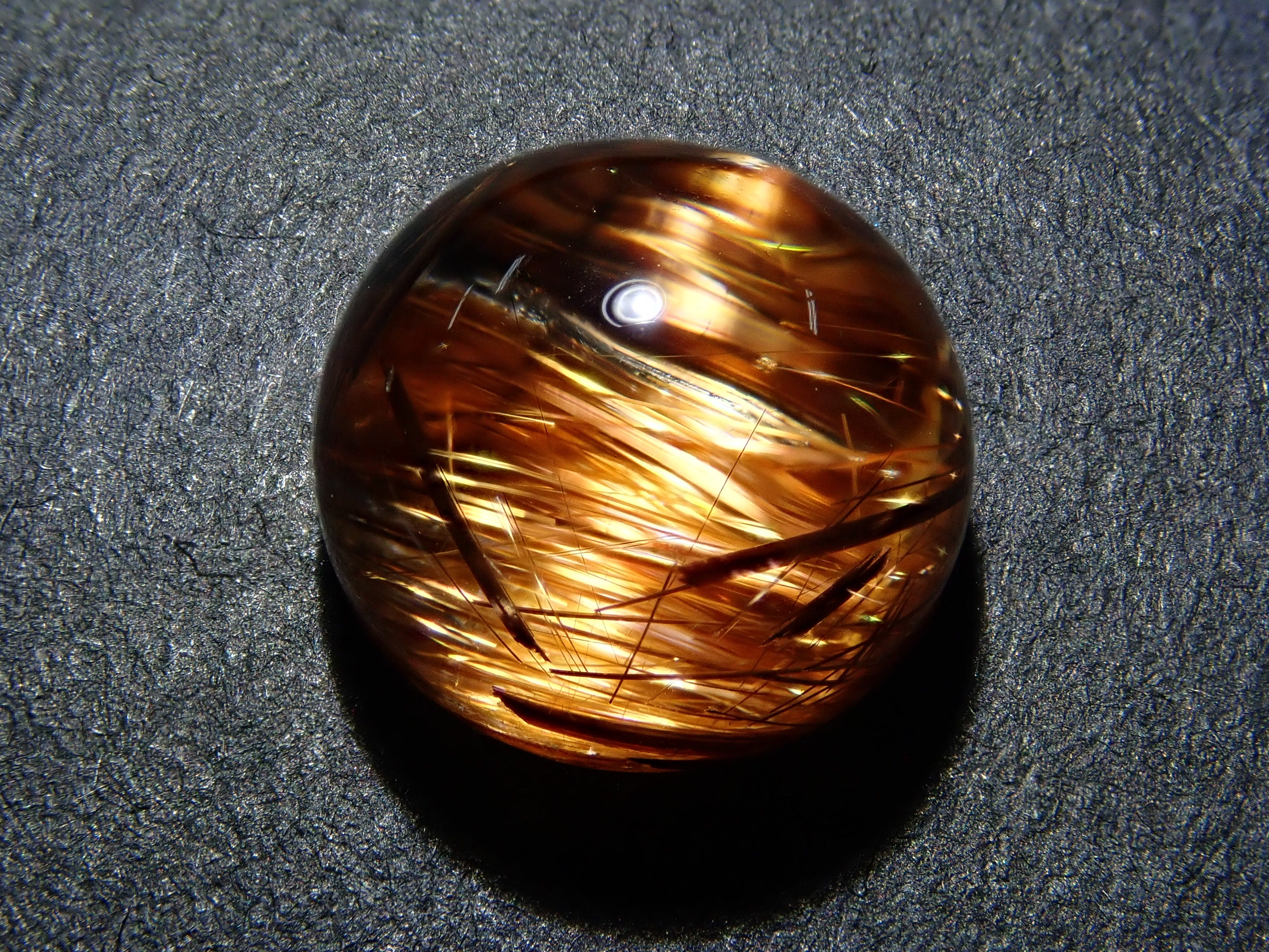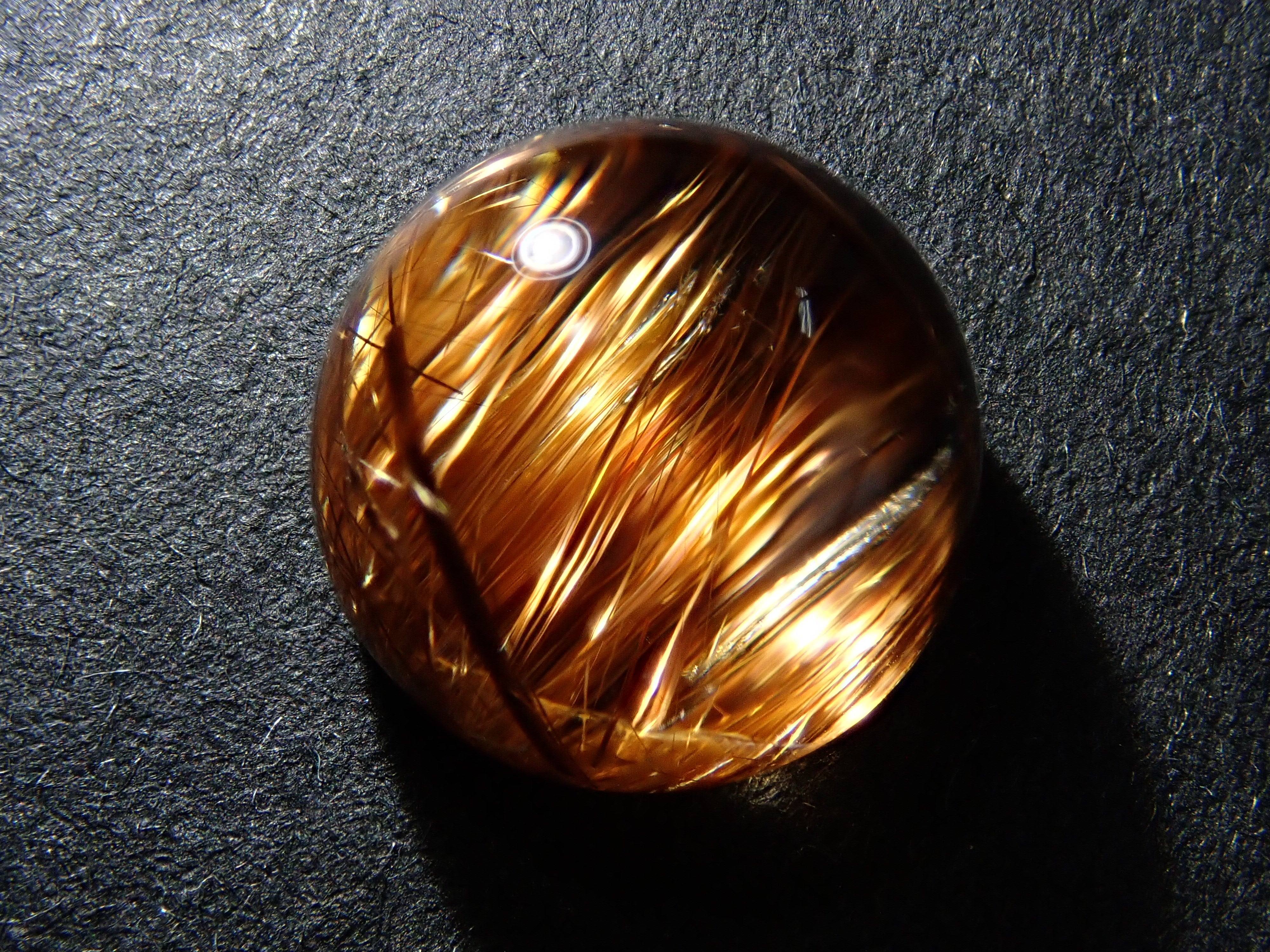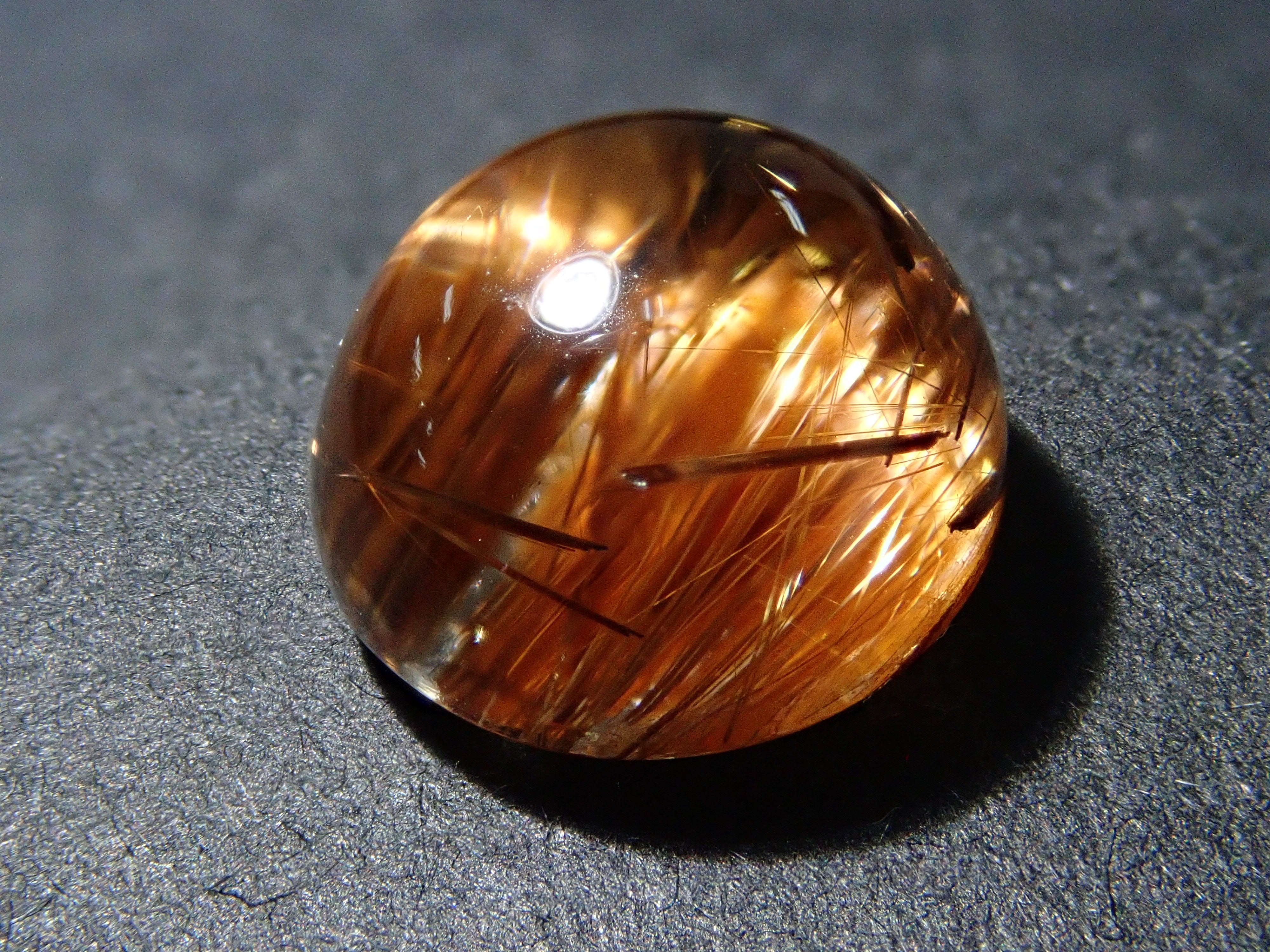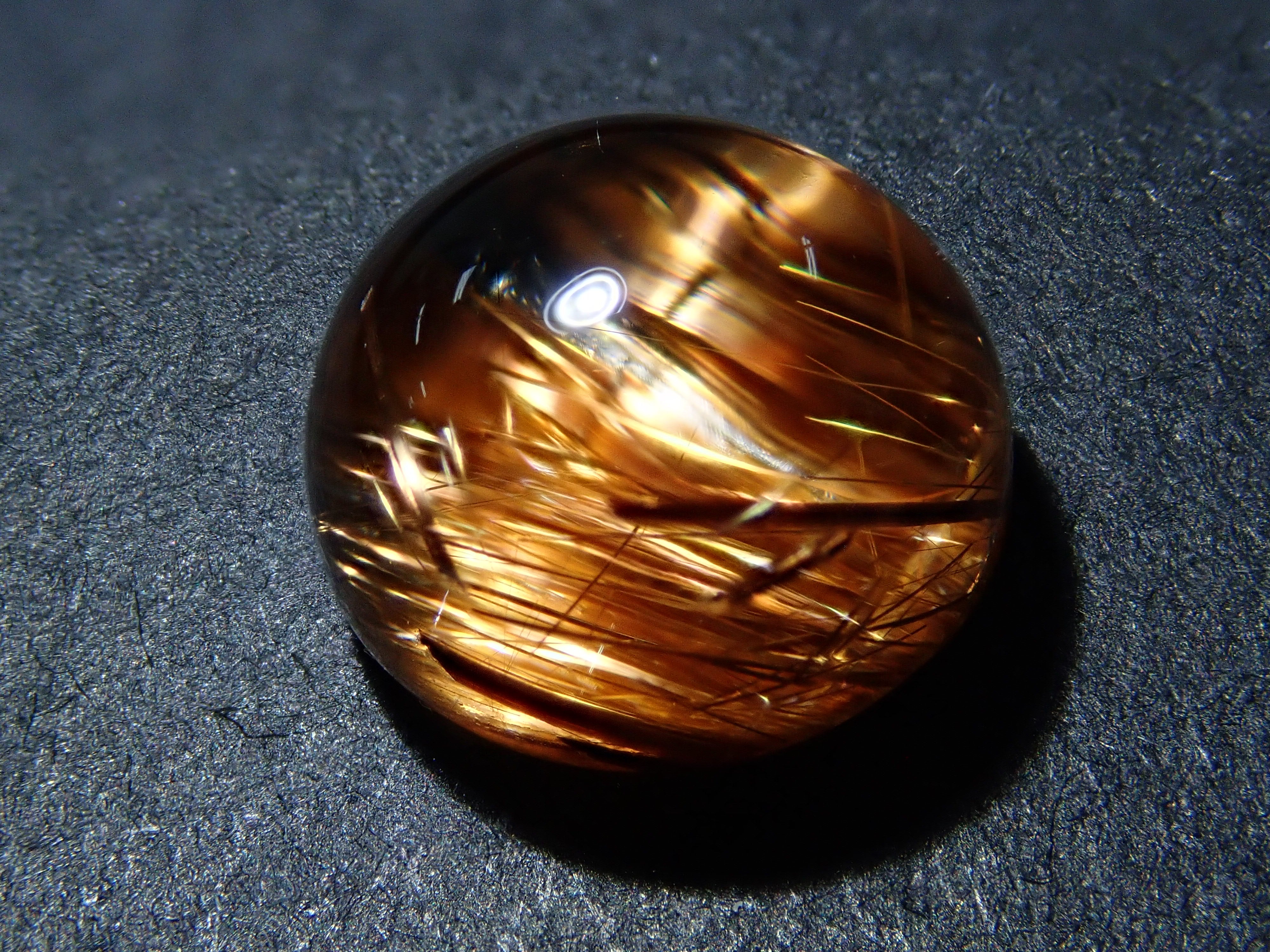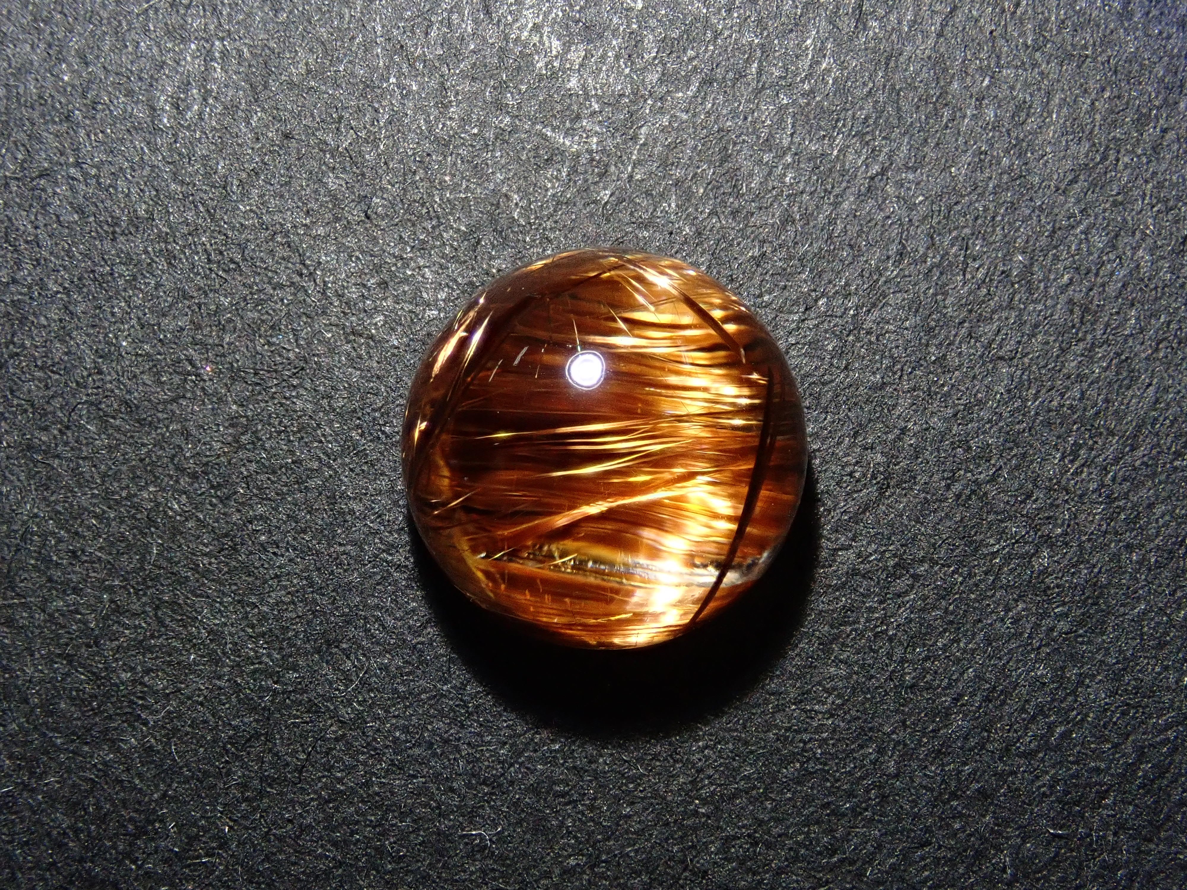 金紅石英散發著美麗的金色光澤,金色的針狀物在晶體中翩翩起舞。它的日文名稱是“金紅石”。它也被稱為“石英中的金紅石”、“金紅石石英”或“金紅石石英”。這種石英具有貓眼效應,照片是用筆型手電筒拍攝的。寶石的背面通常未經拋光。
