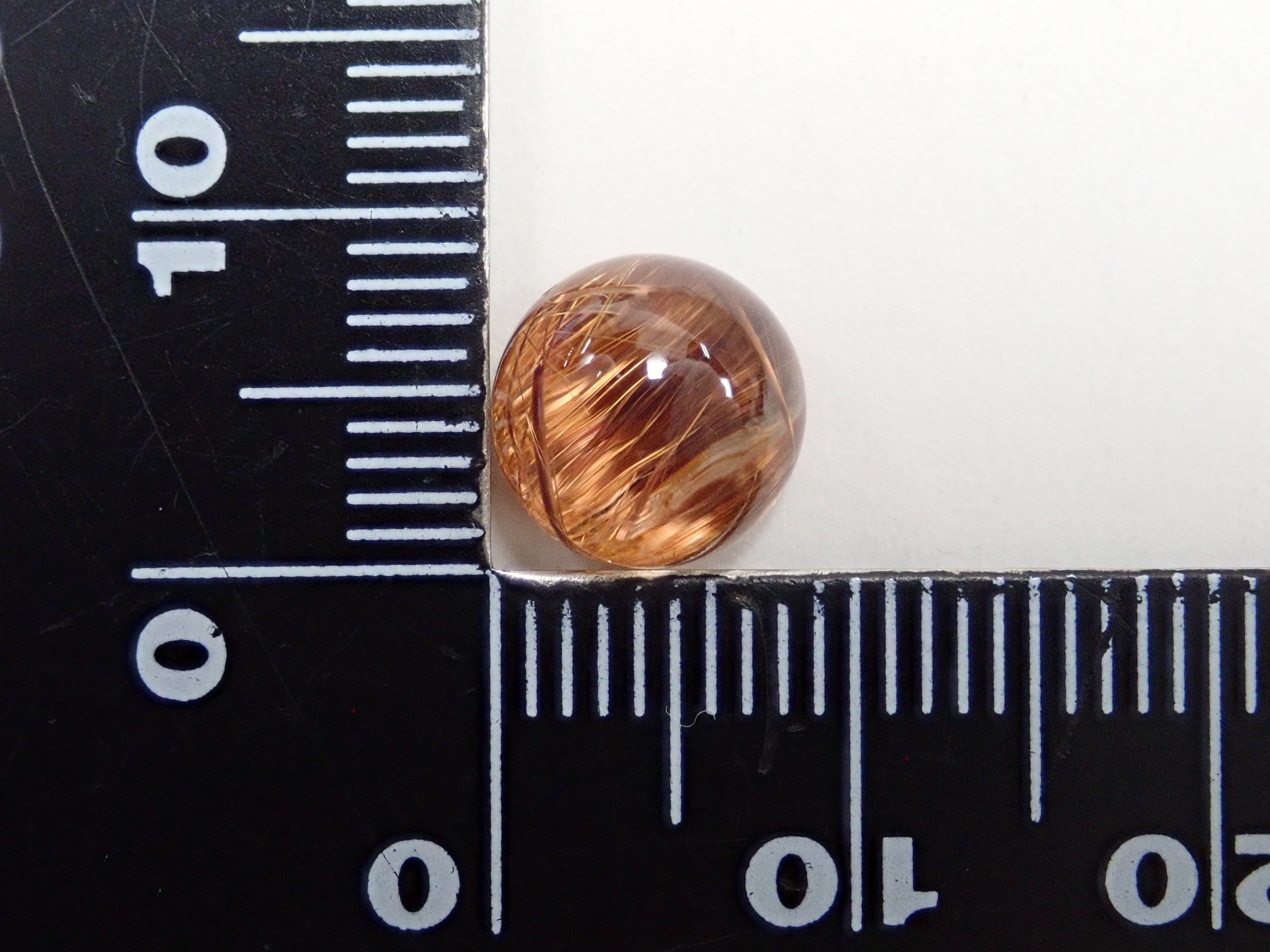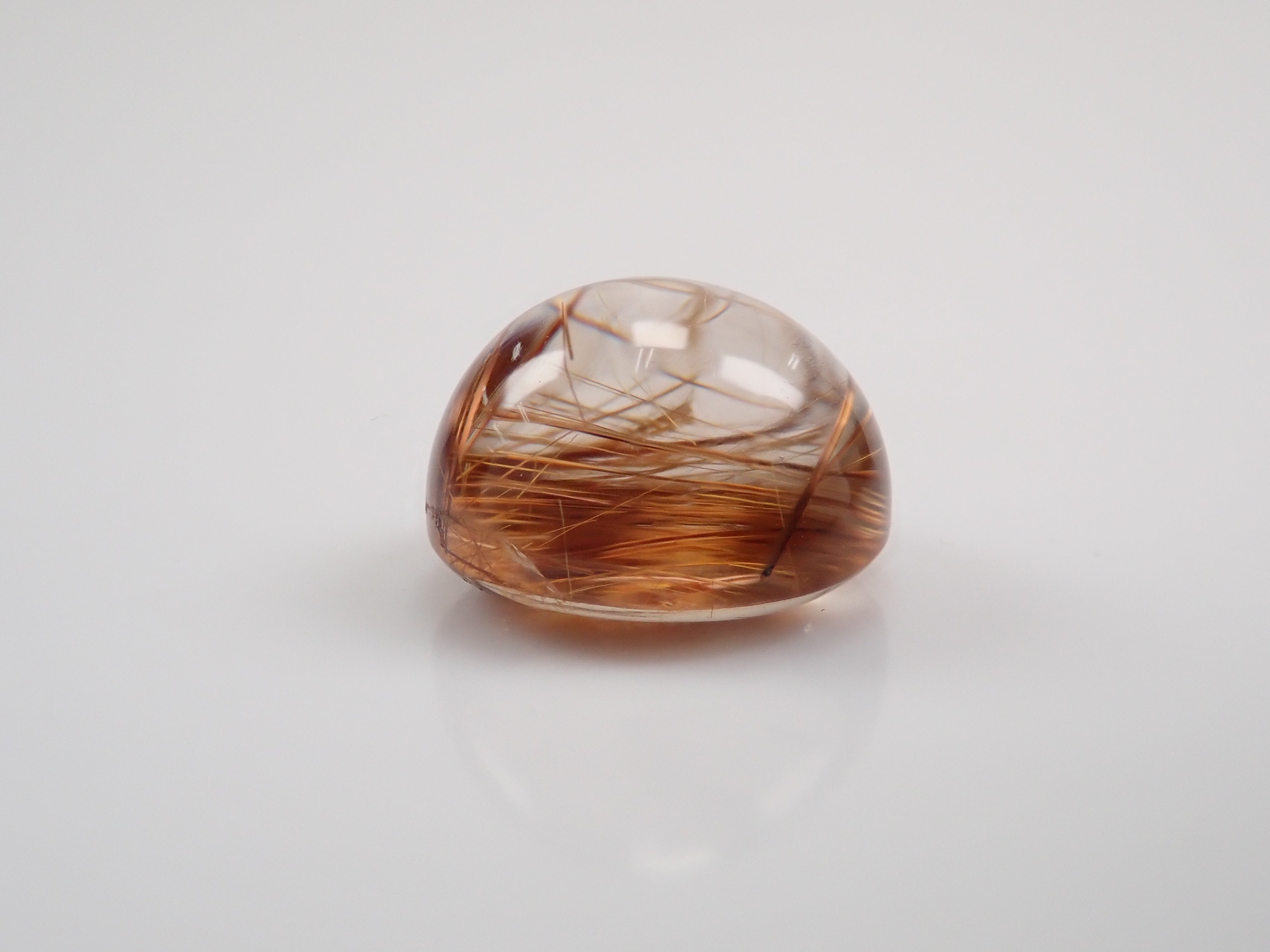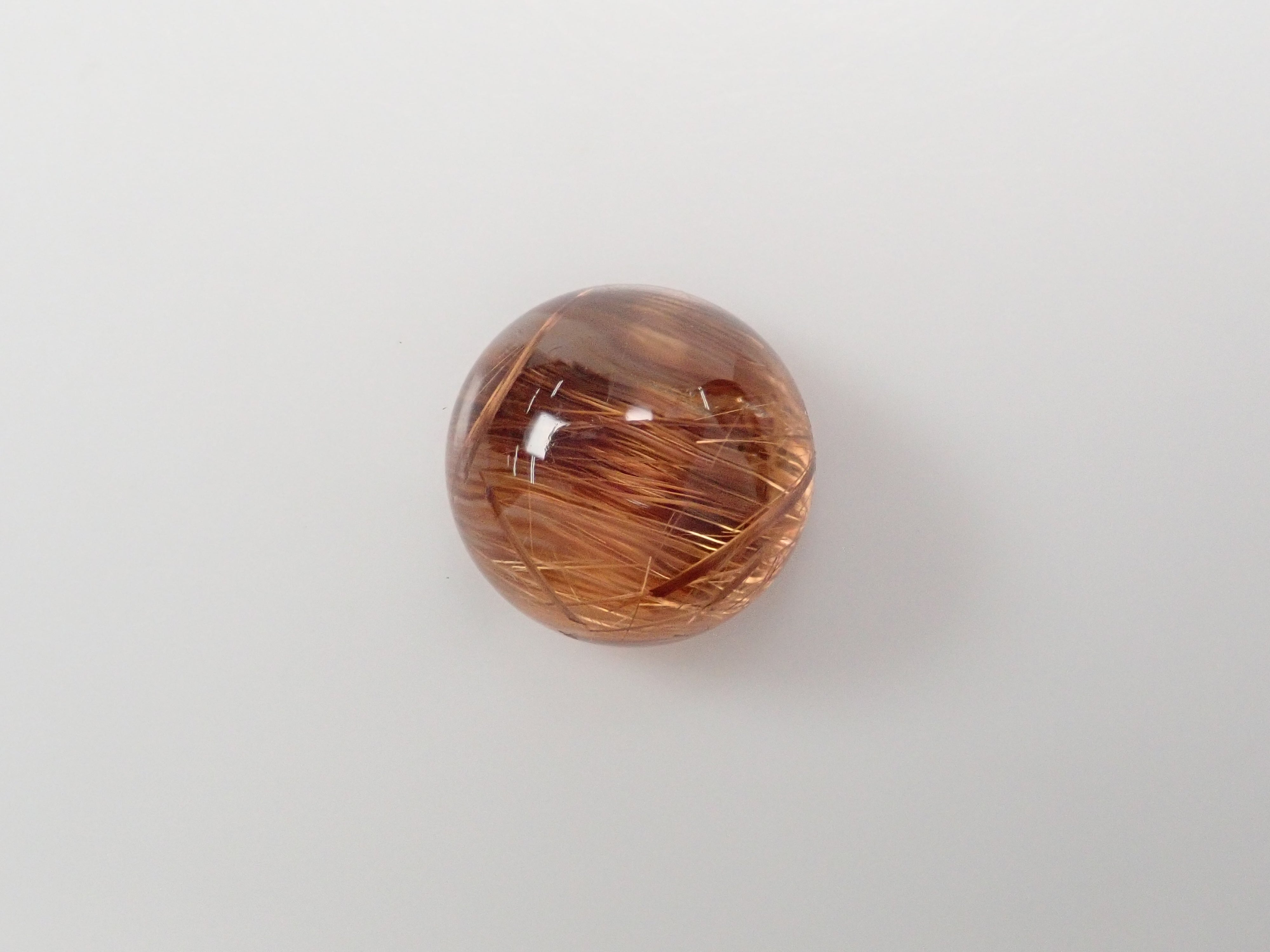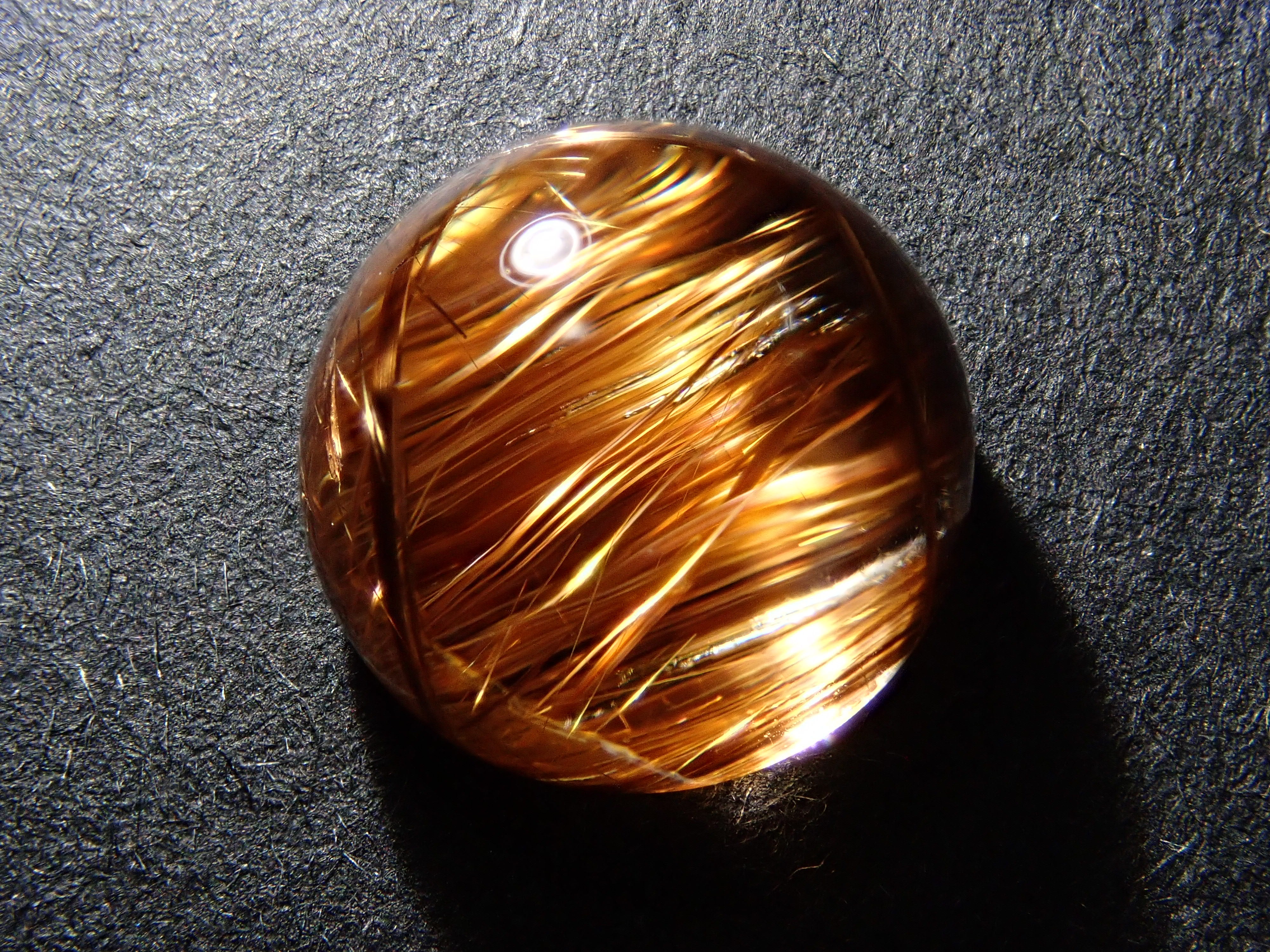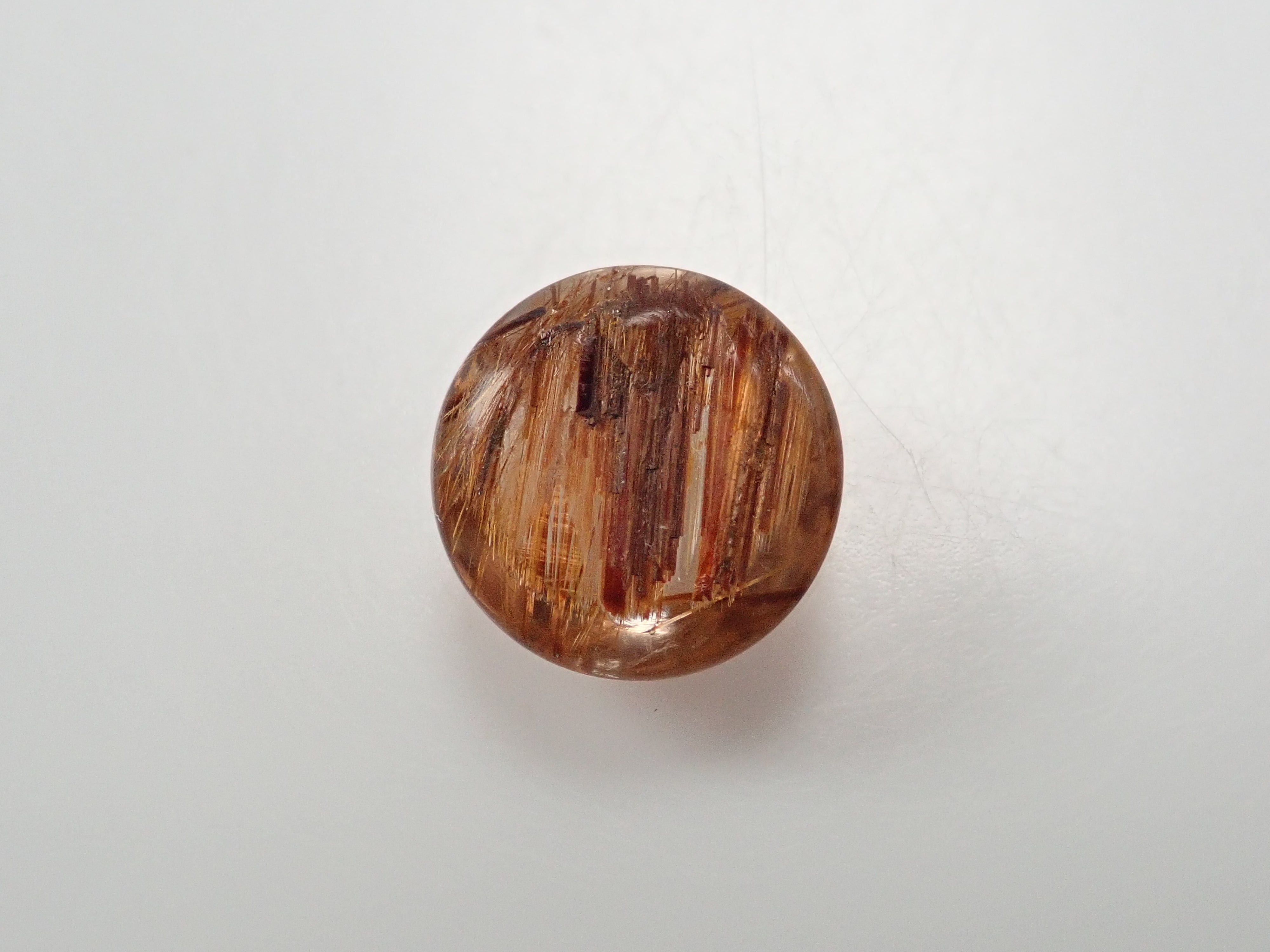 金紅石英散發著美麗的金色光澤,金色的針狀物在晶體中翩翩起舞。它的日文名稱是“金紅石”。它也被稱為“石英中的金紅石”、“金紅石石英”或“金紅石石英”。這種石英具有貓眼效應,照片是用筆型手電筒拍攝的。寶石的背面通常未經拋光。