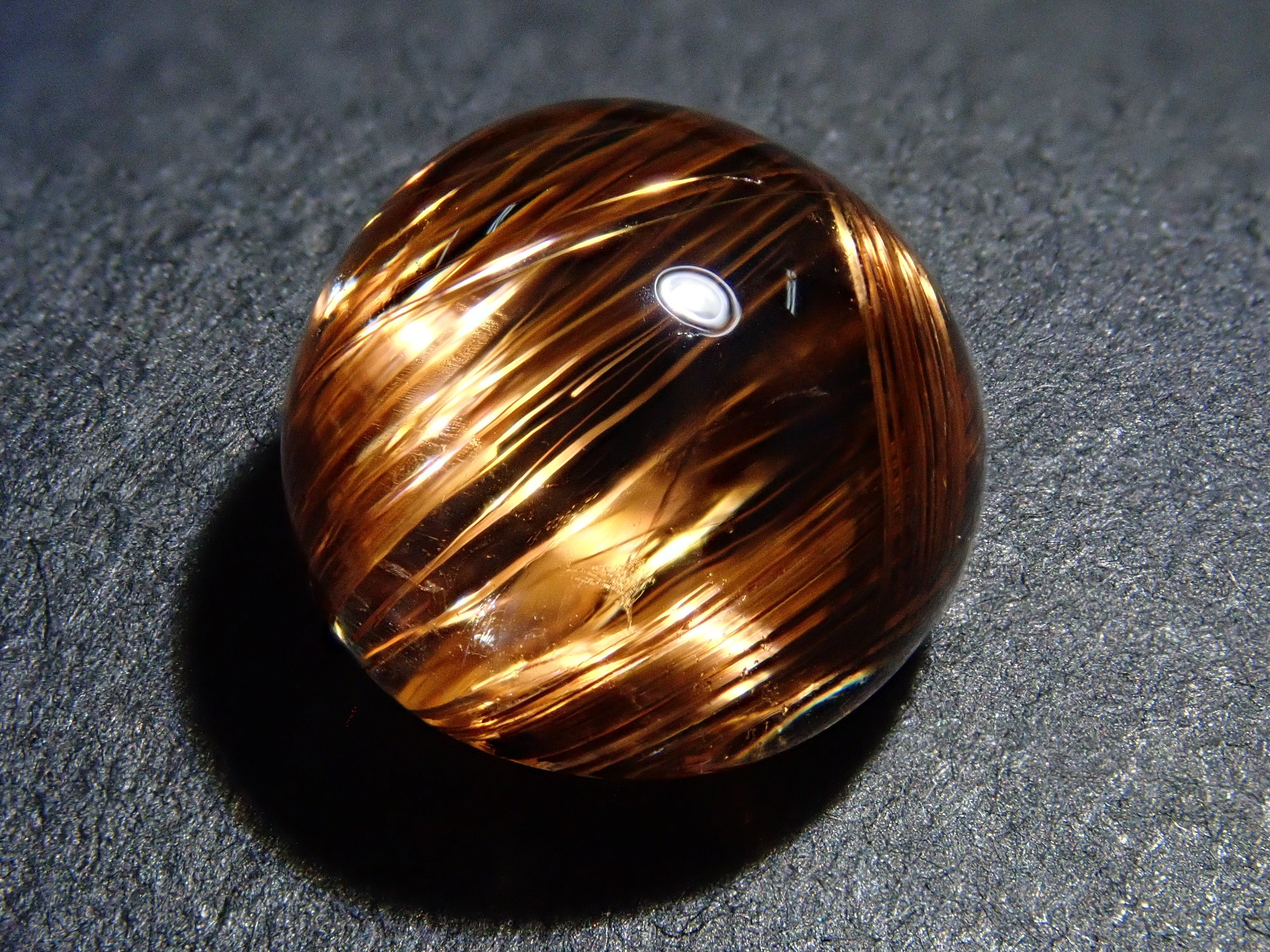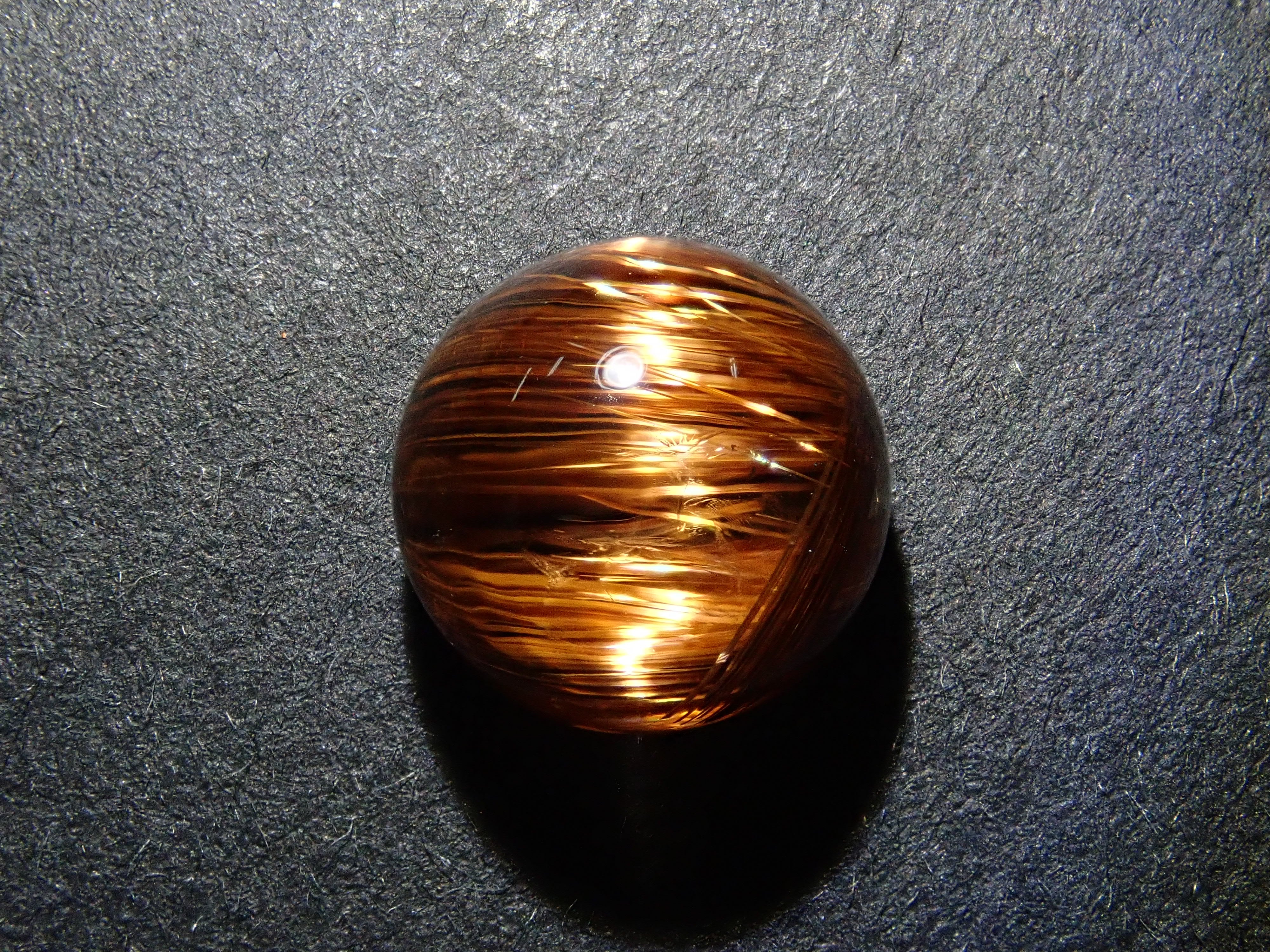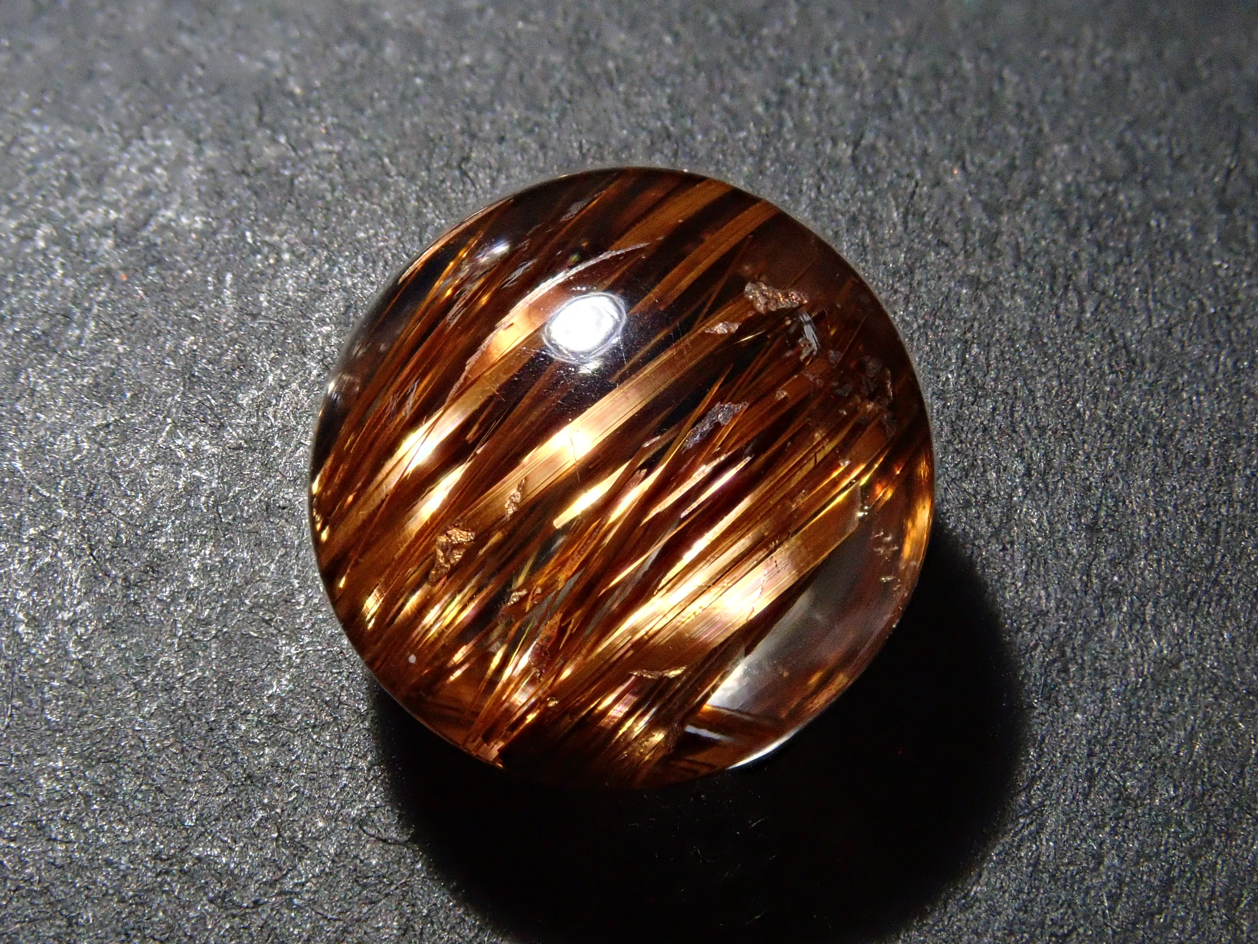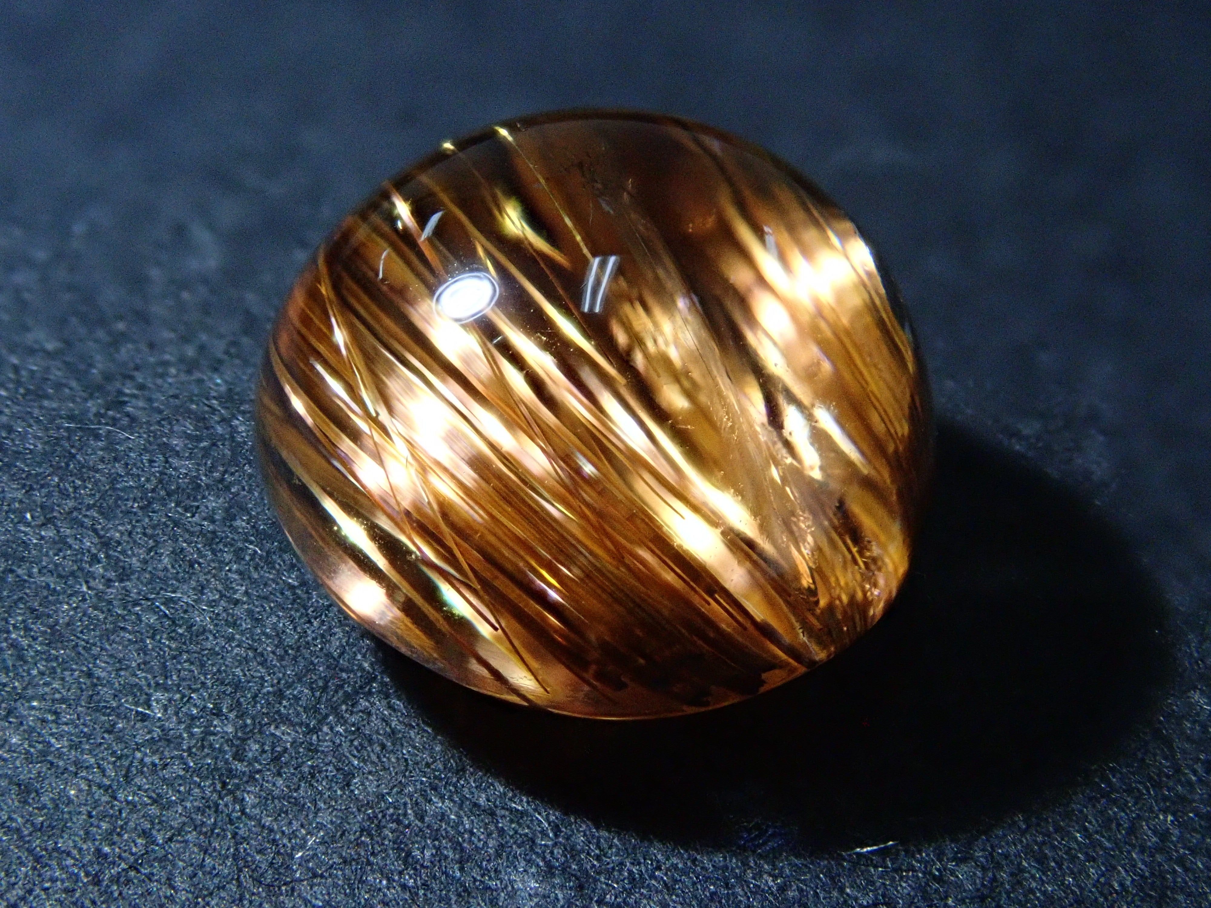 金紅石英散發著美麗的金色光澤,金色的針狀物在晶體中翩翩起舞。它的日文名稱是“金紅石”。它也被稱為“石英中的金紅石”、“金紅石石英”或“金紅石石英”。這種石英具有貓眼效應,照片是用筆型手電筒拍攝的。寶石的背面通常未經拋光。