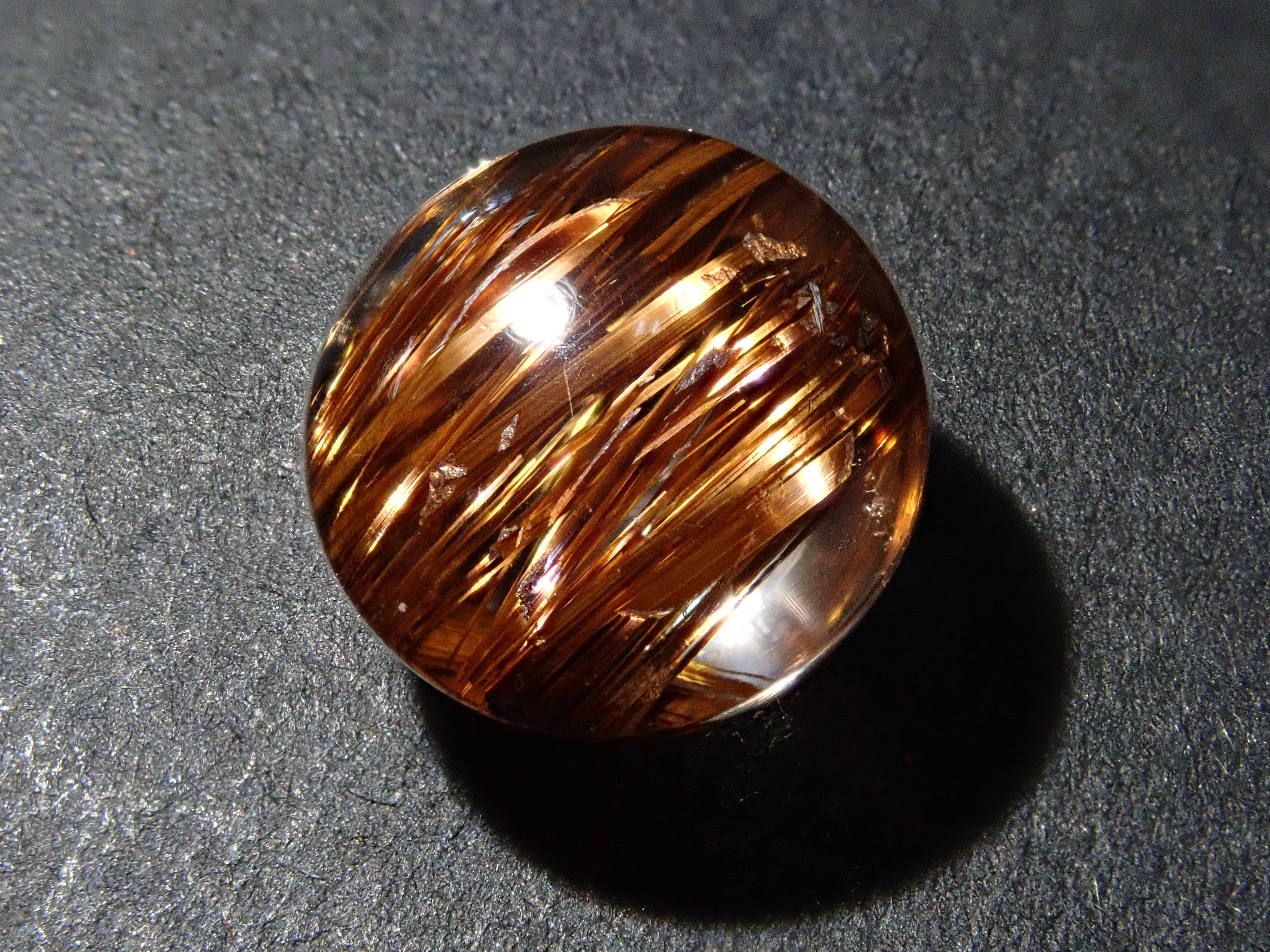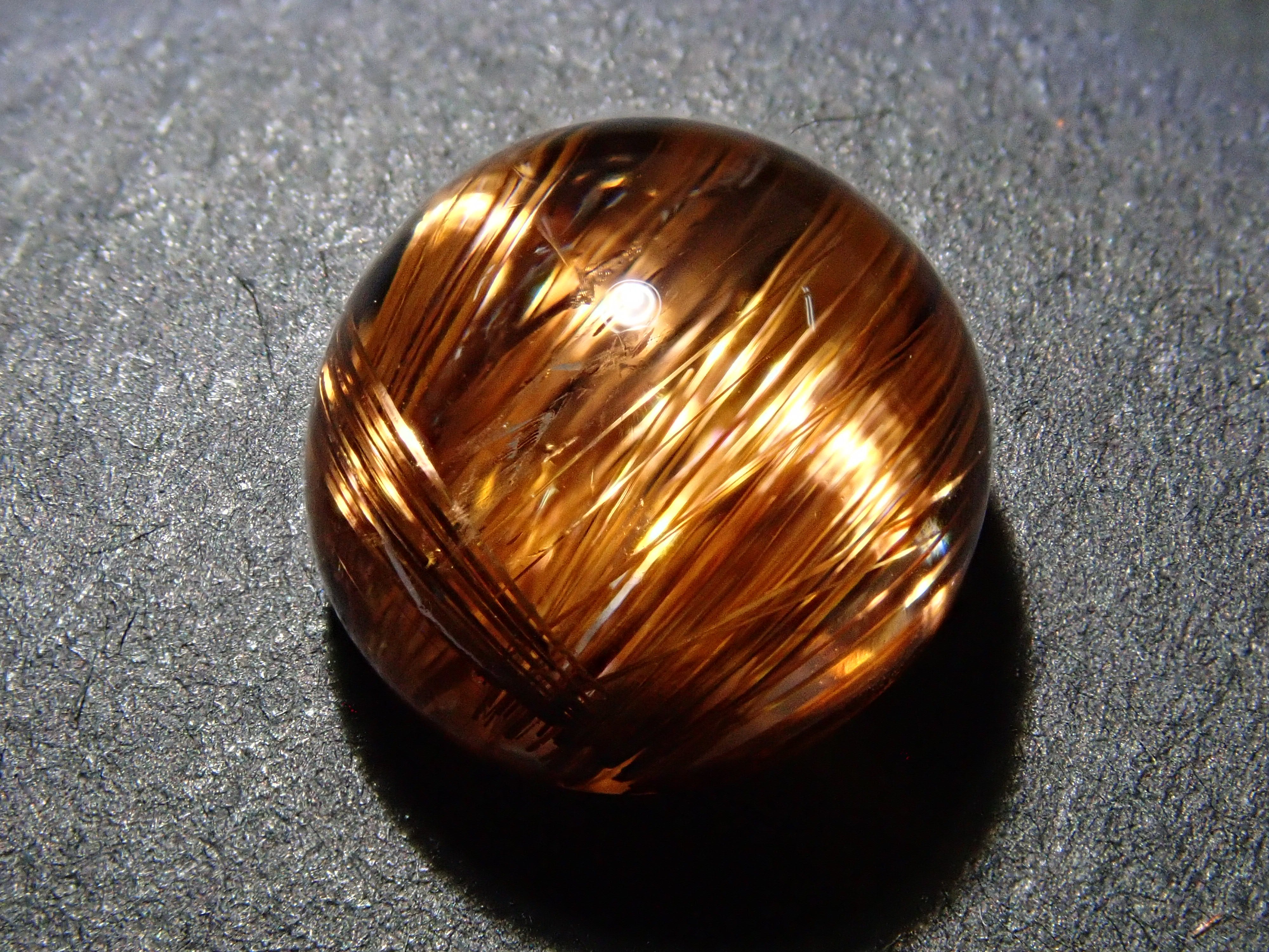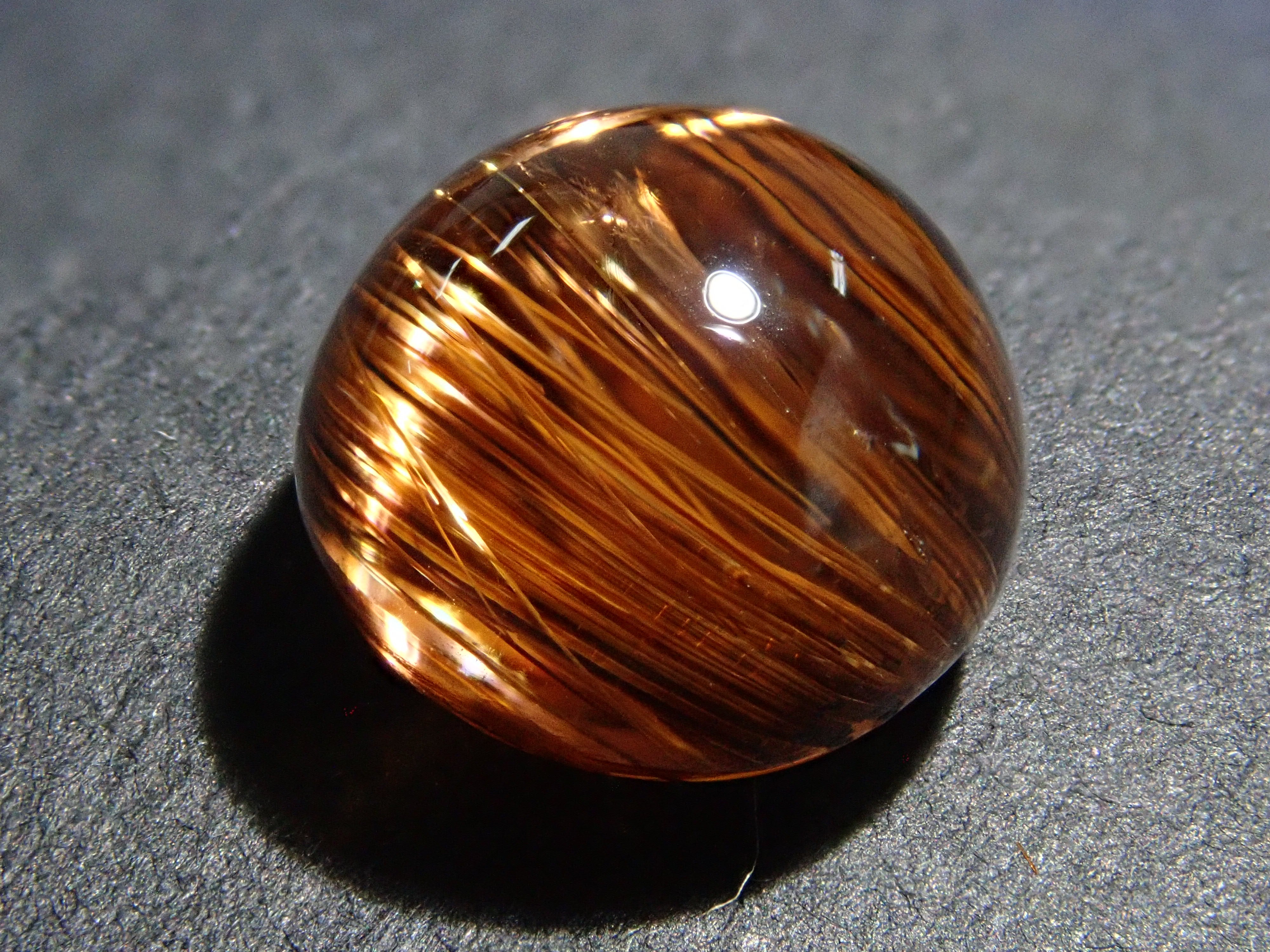 金紅石英散發著美麗的金色光澤,金色的針狀物在晶體中翩翩起舞。它的日文名稱是“金紅石”。它也被稱為“石英中的金紅石”、“金紅石石英”或“金紅石石英”。這種石英具有貓眼效應,照片是用筆型手電筒拍攝的。寶石的背面通常未經拋光。