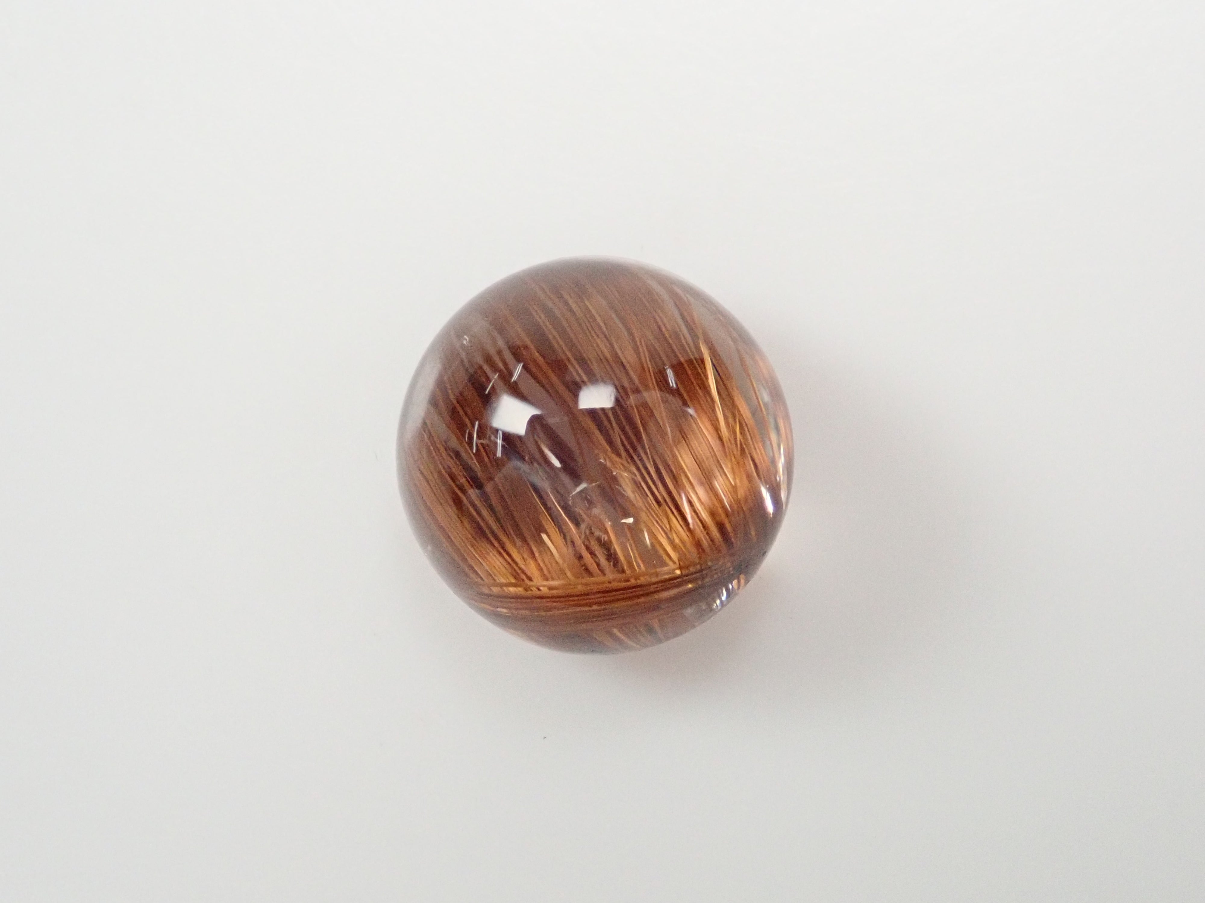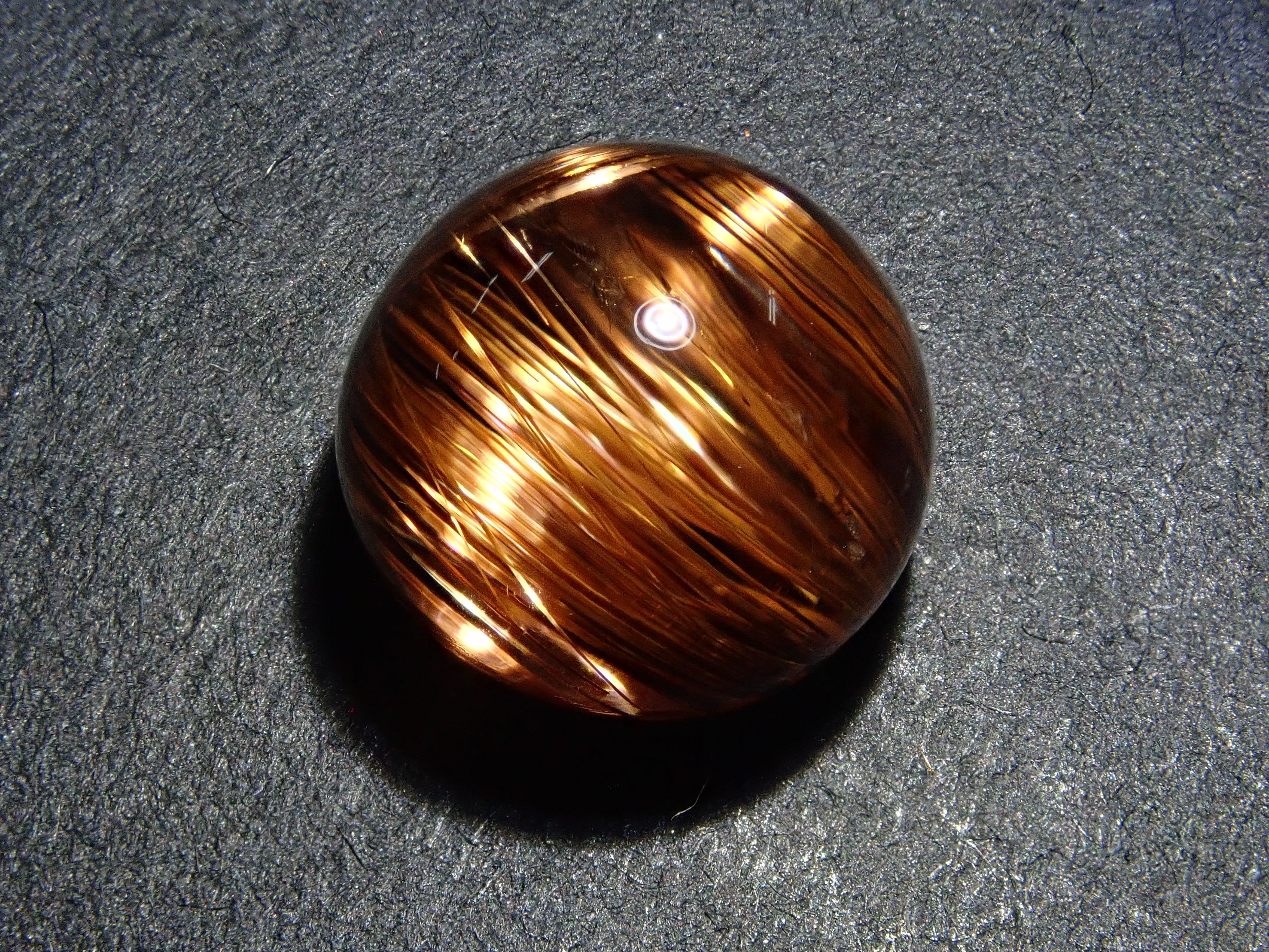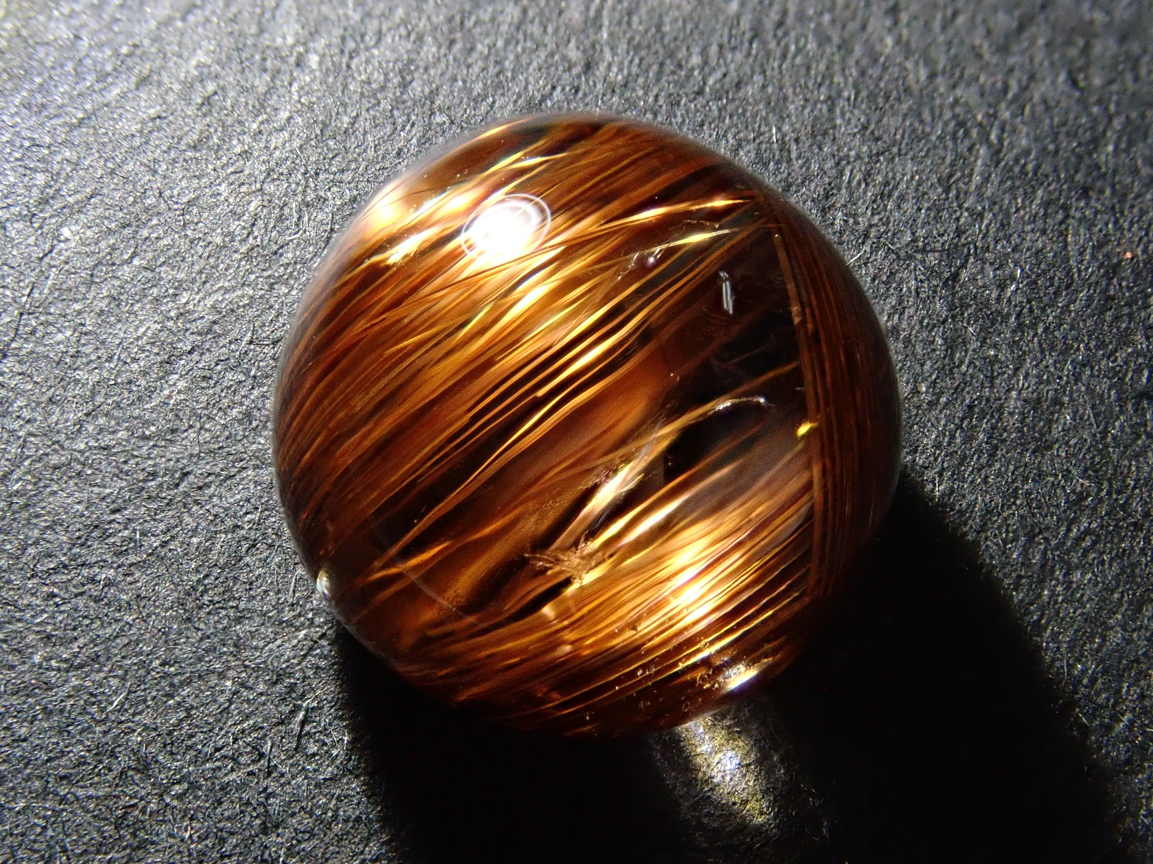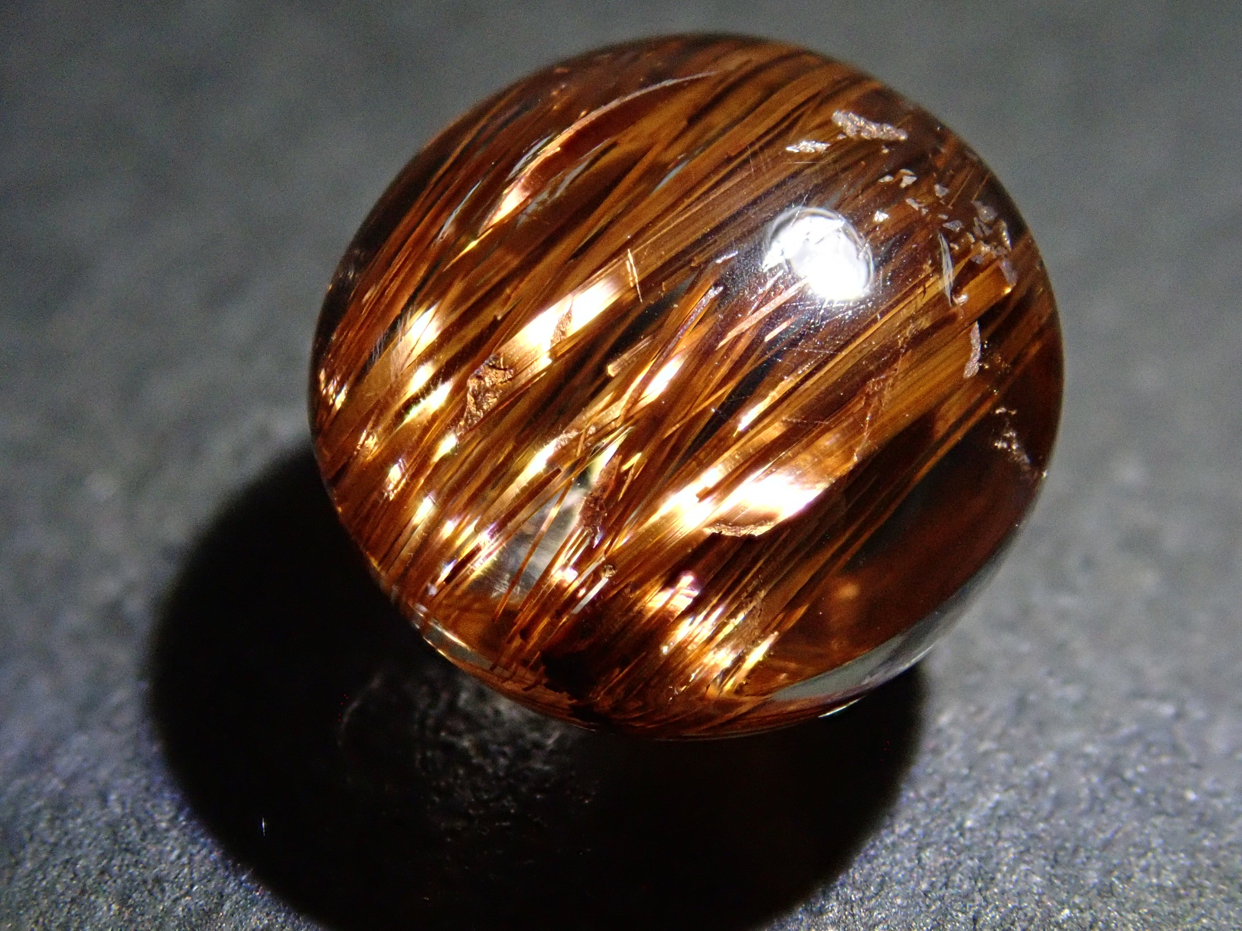 金紅石英散發著美麗的金色光澤,金色的針狀物在晶體中翩翩起舞。它的日文名稱是“金紅石”。它也被稱為“石英中的金紅石”、“金紅石石英”或“金紅石石英”。這種石英具有貓眼效應,照片是用筆型手電筒拍攝的。寶石的背面通常未經拋光。