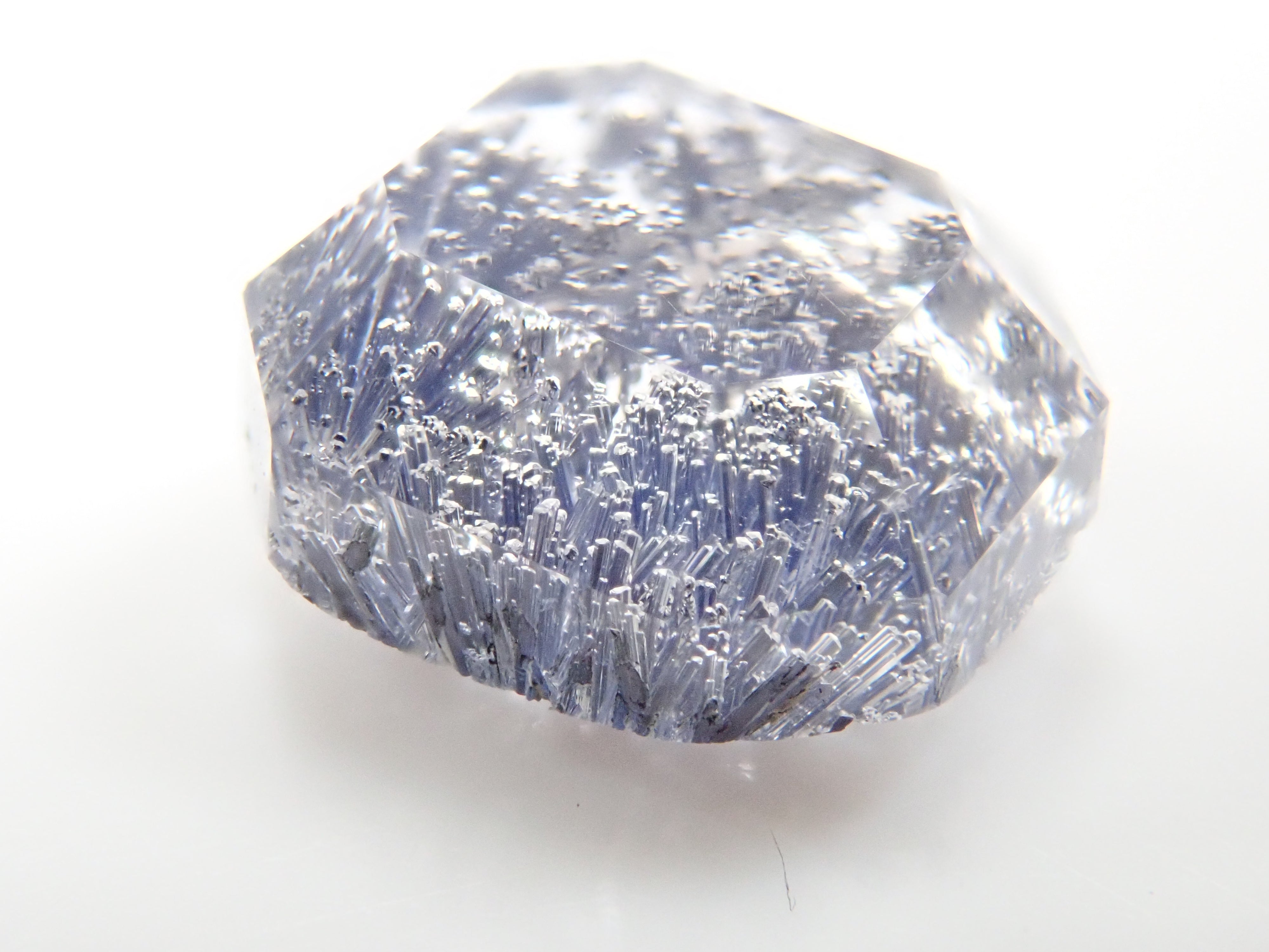 石英,日文稱為“suisho”,是日本常見的寶石,但它也是一種色澤深邃的寶石,種類繁多,包括紫水晶和黃水晶。這款藍線石是石英中的藍線石,擁有美麗的藍色內含物。其他寶石中沒有一種擁有相同的紋路,因此它成為收藏家們的心頭好。