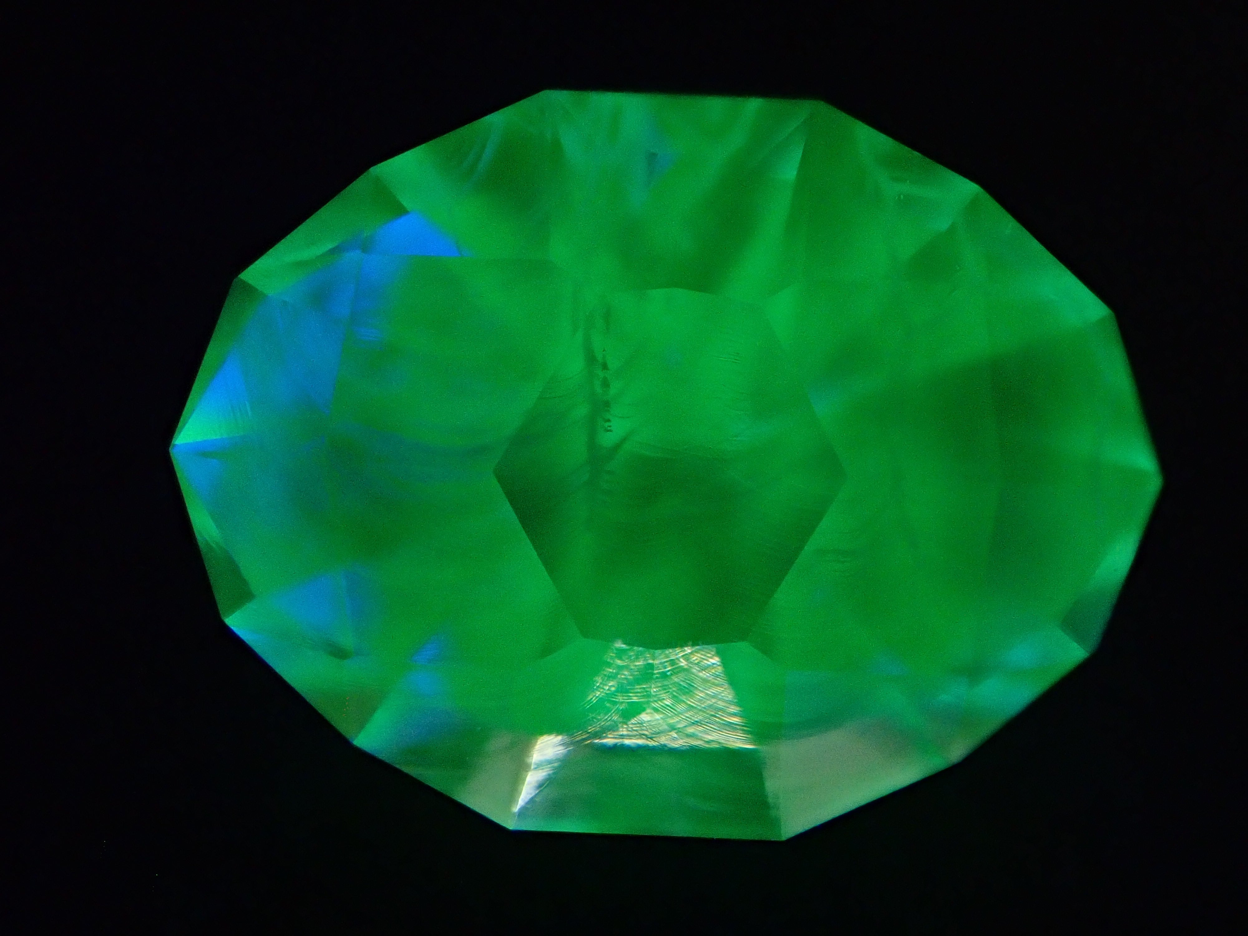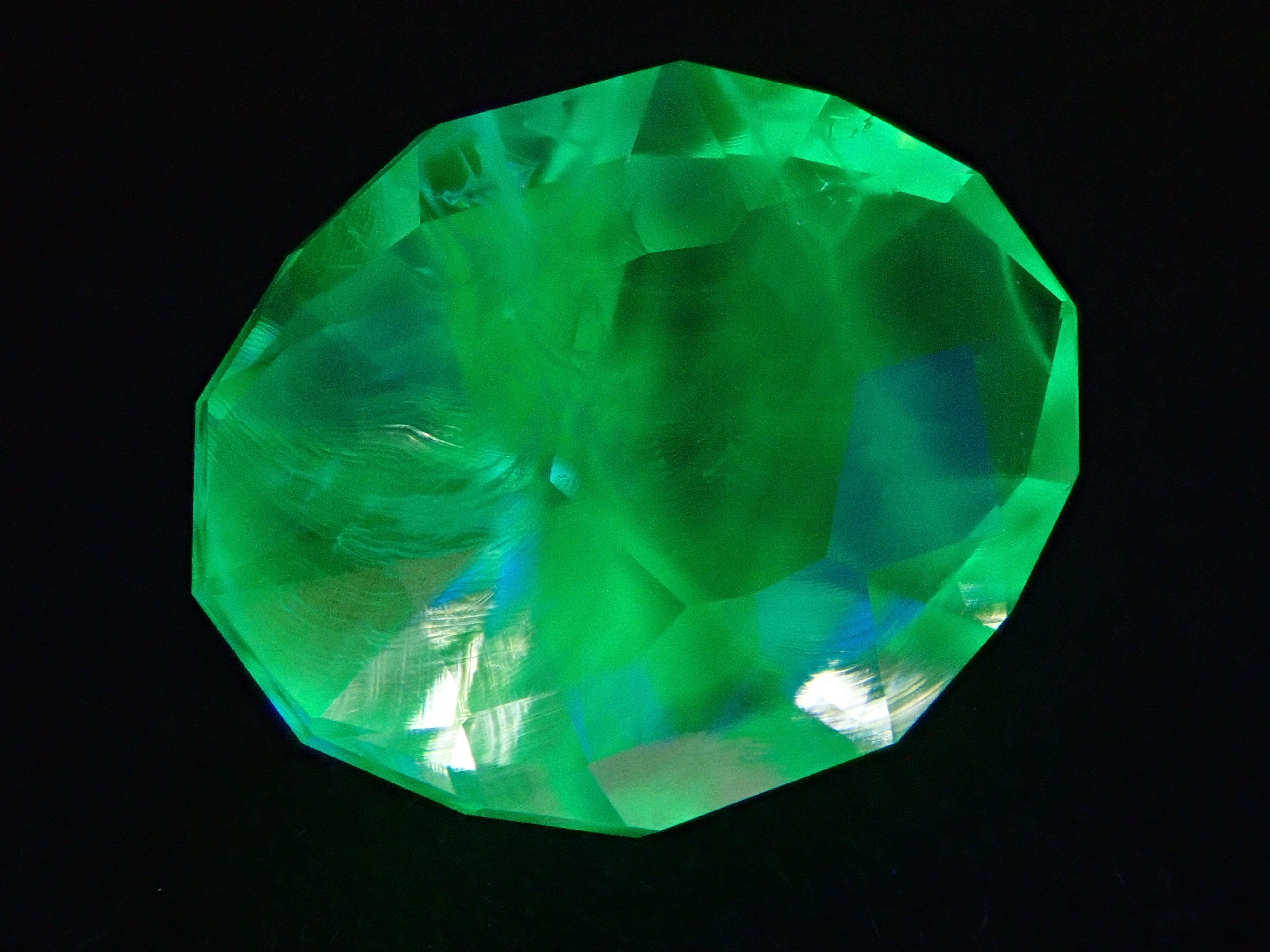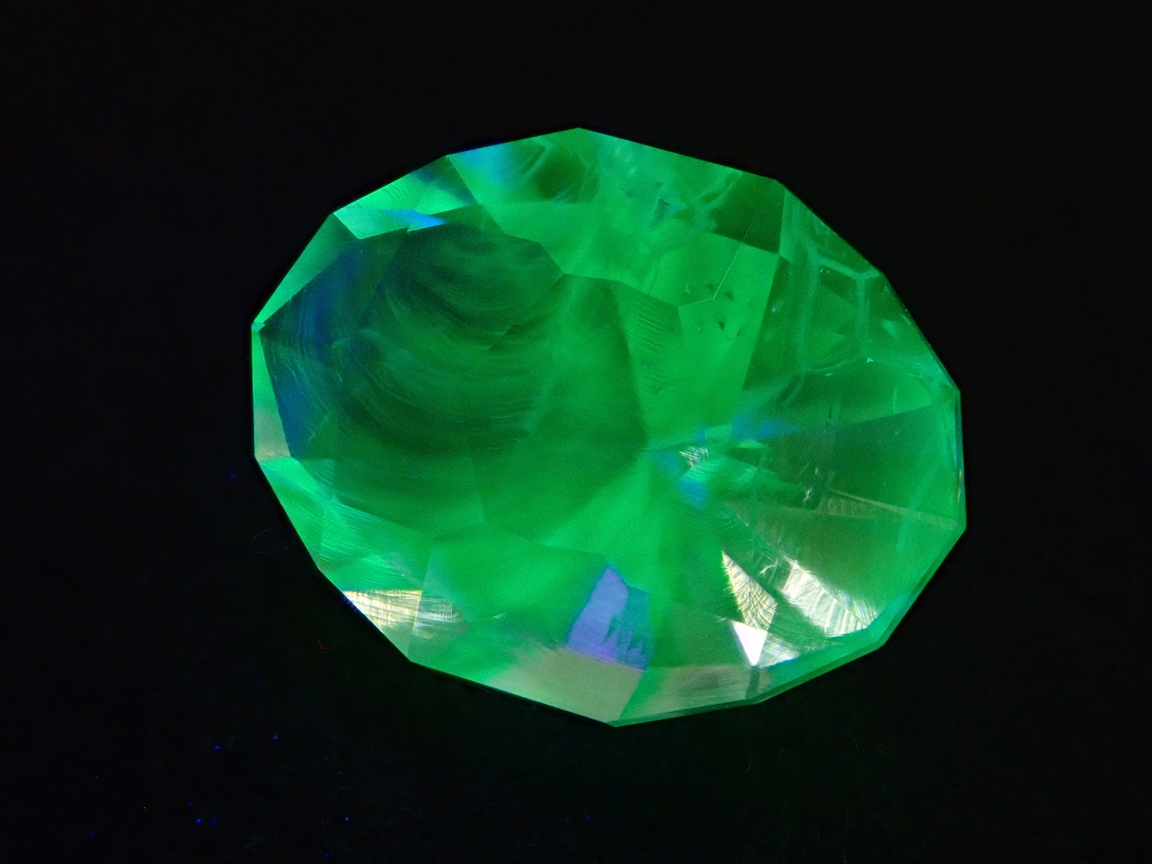 透明蛋白石在黑光下會發出薄荷綠的螢光。它是一種罕見的寶石。顧名思義,它在礦物學上屬於蛋白石家族,但它不呈現遊彩。請使用黑光燈欣賞螢光。