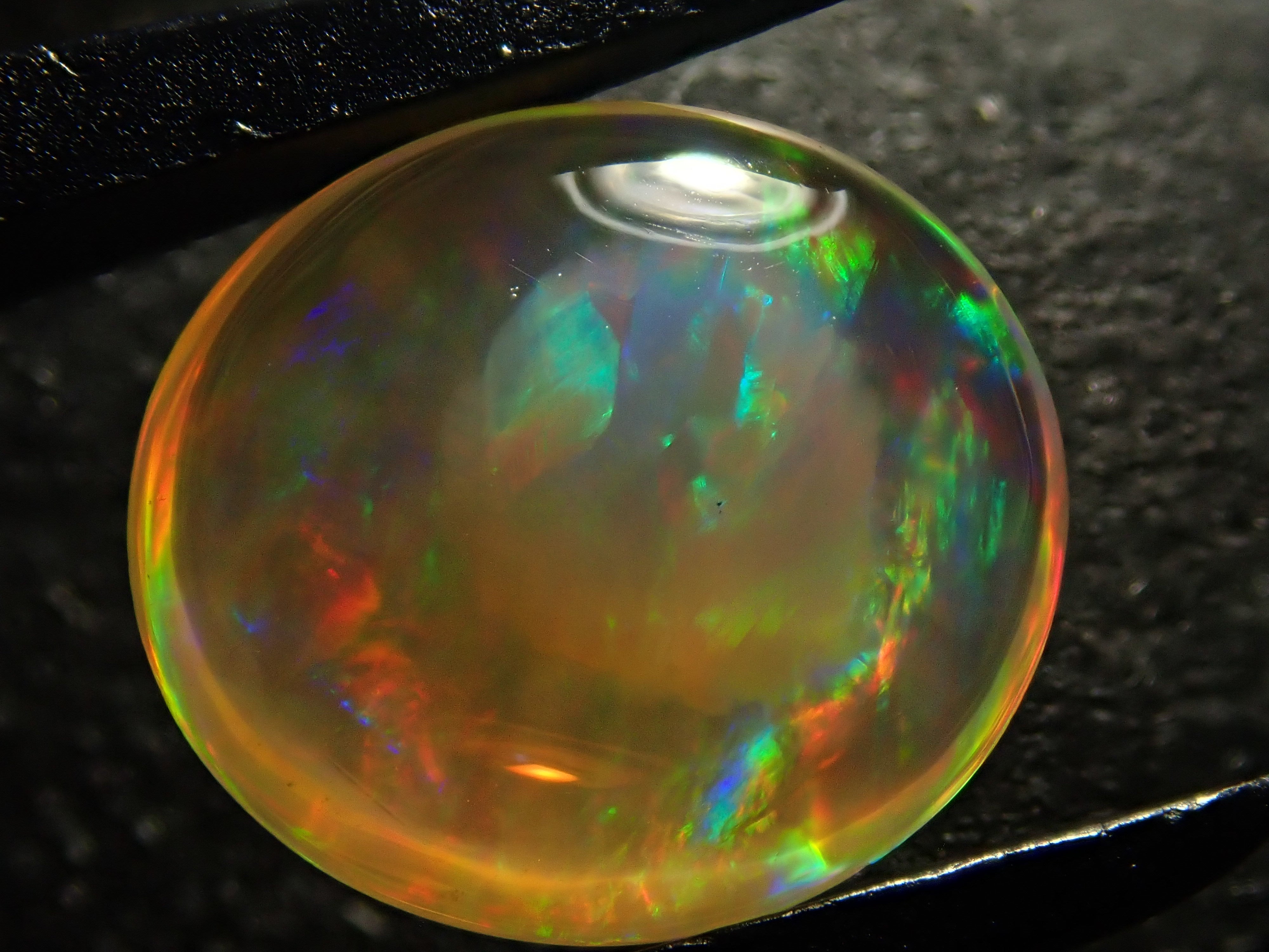 自古羅馬時代以來,蛋白石就廣受歡迎。火蛋白石是一種以紅色至橙色為底色的蛋白石,形狀像「火」。這張照片是用筆型電筒拍攝的。
