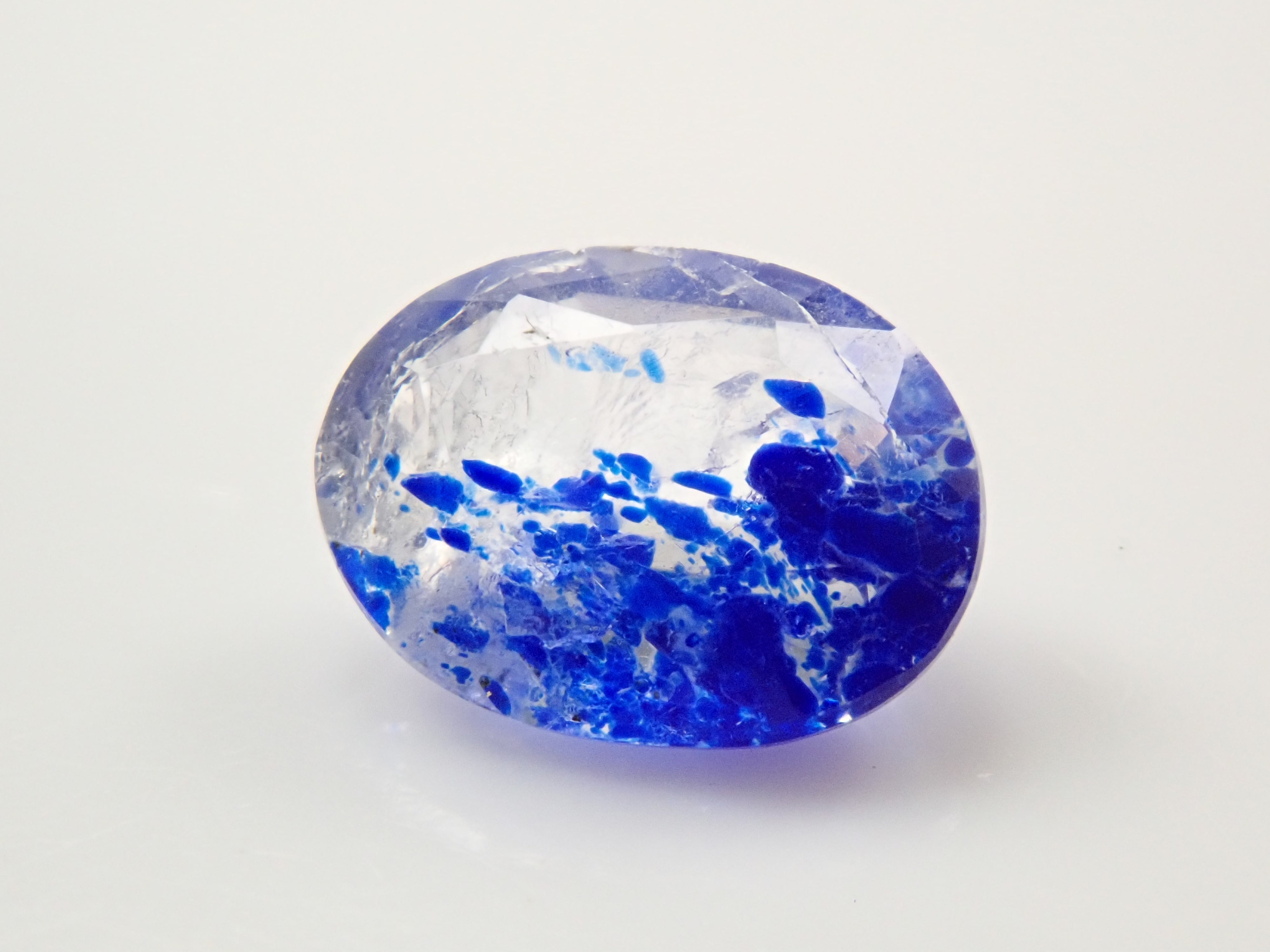 天然方鈉石。顧名思義,它擁有清爽的透明度和如融化的冰塊般柔和的光澤。此外,還有一種淡藍色的方鈉石,名副其實地被稱為「蘇打」。這是一種光是看著就讓人口渴的寶石。這是一種內部含有青金石的方鈉石。