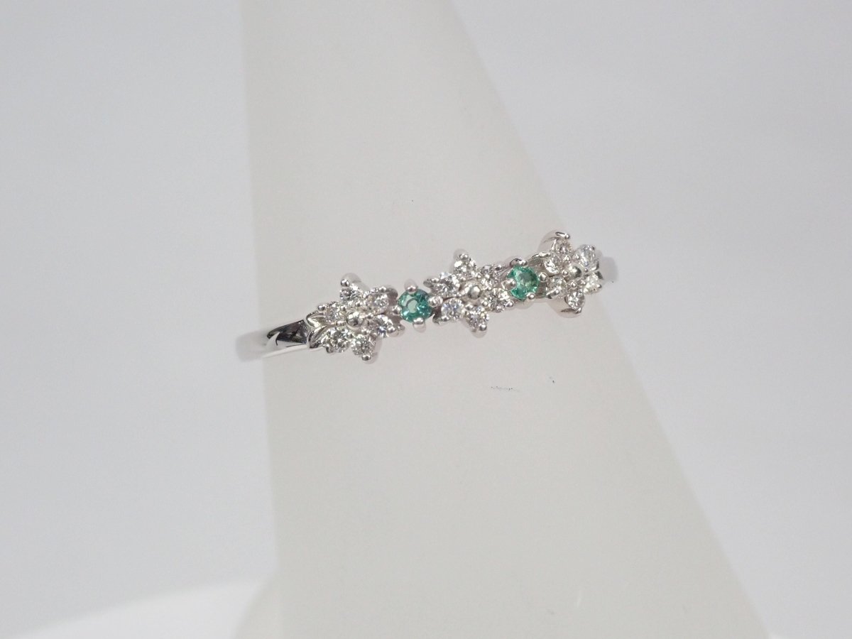閃閃發光的鑽石就像花朵一樣,可愛極了。鑲嵌在鑽石花朵之間的祖母綠將祖母綠的顏色襯托得更美麗。它既有可愛又有美麗。
