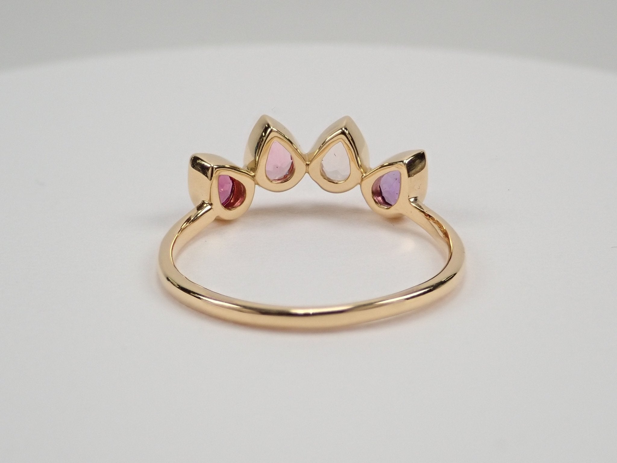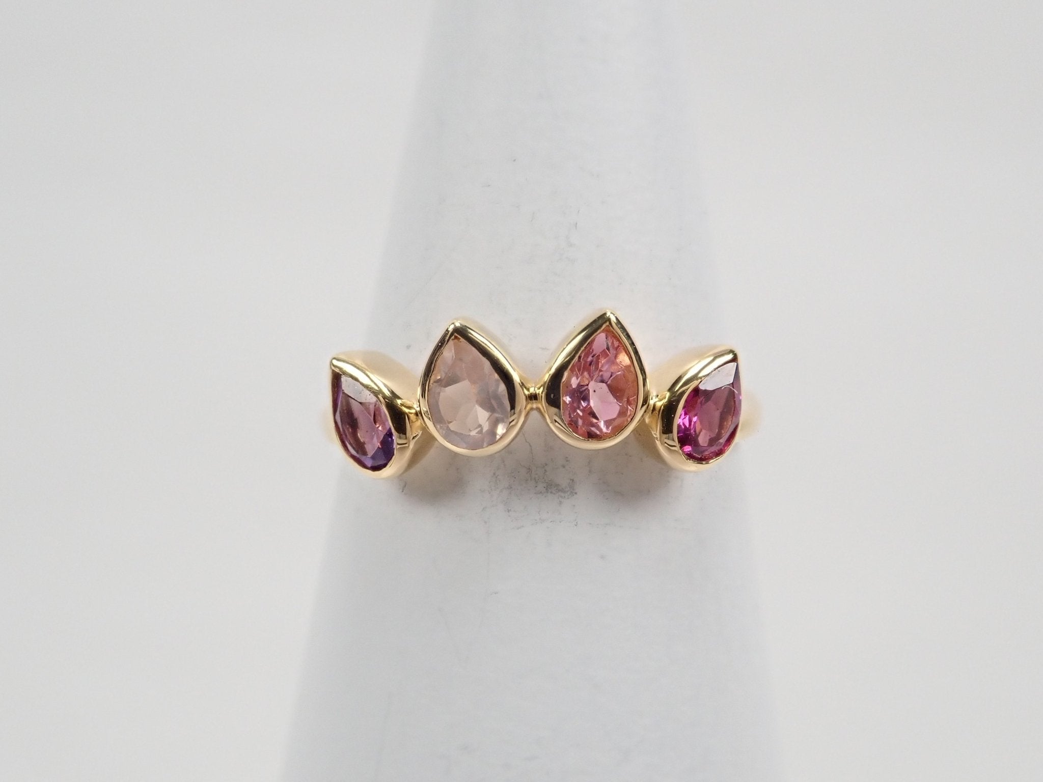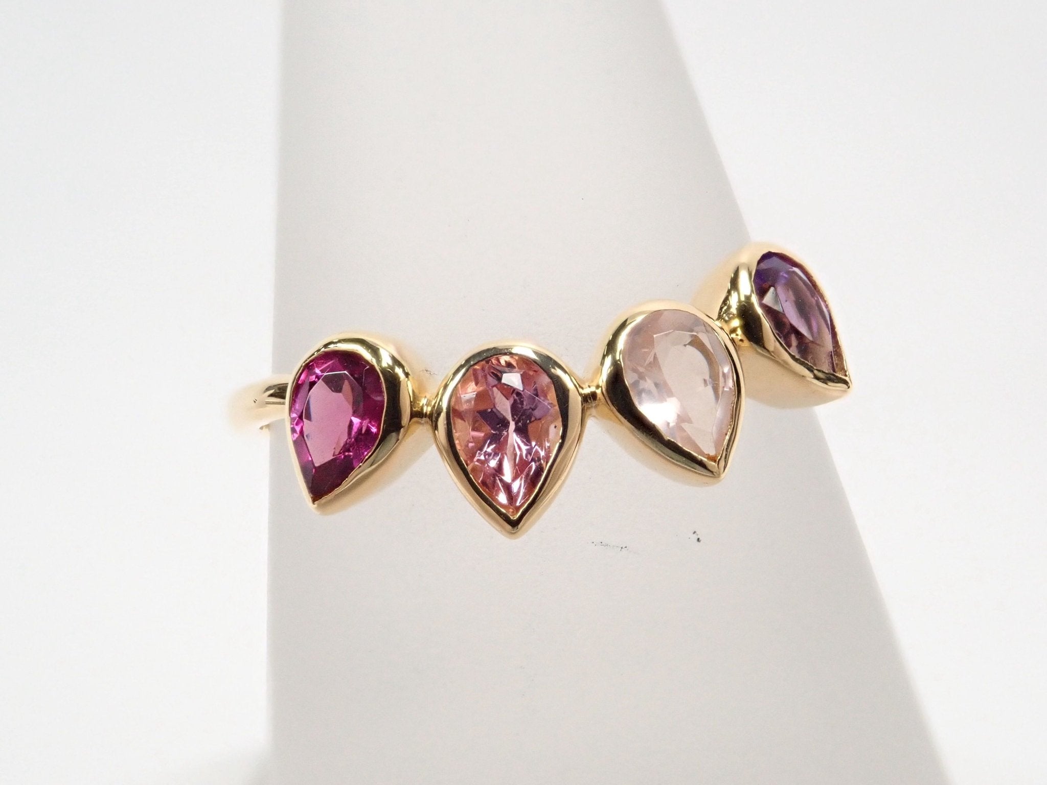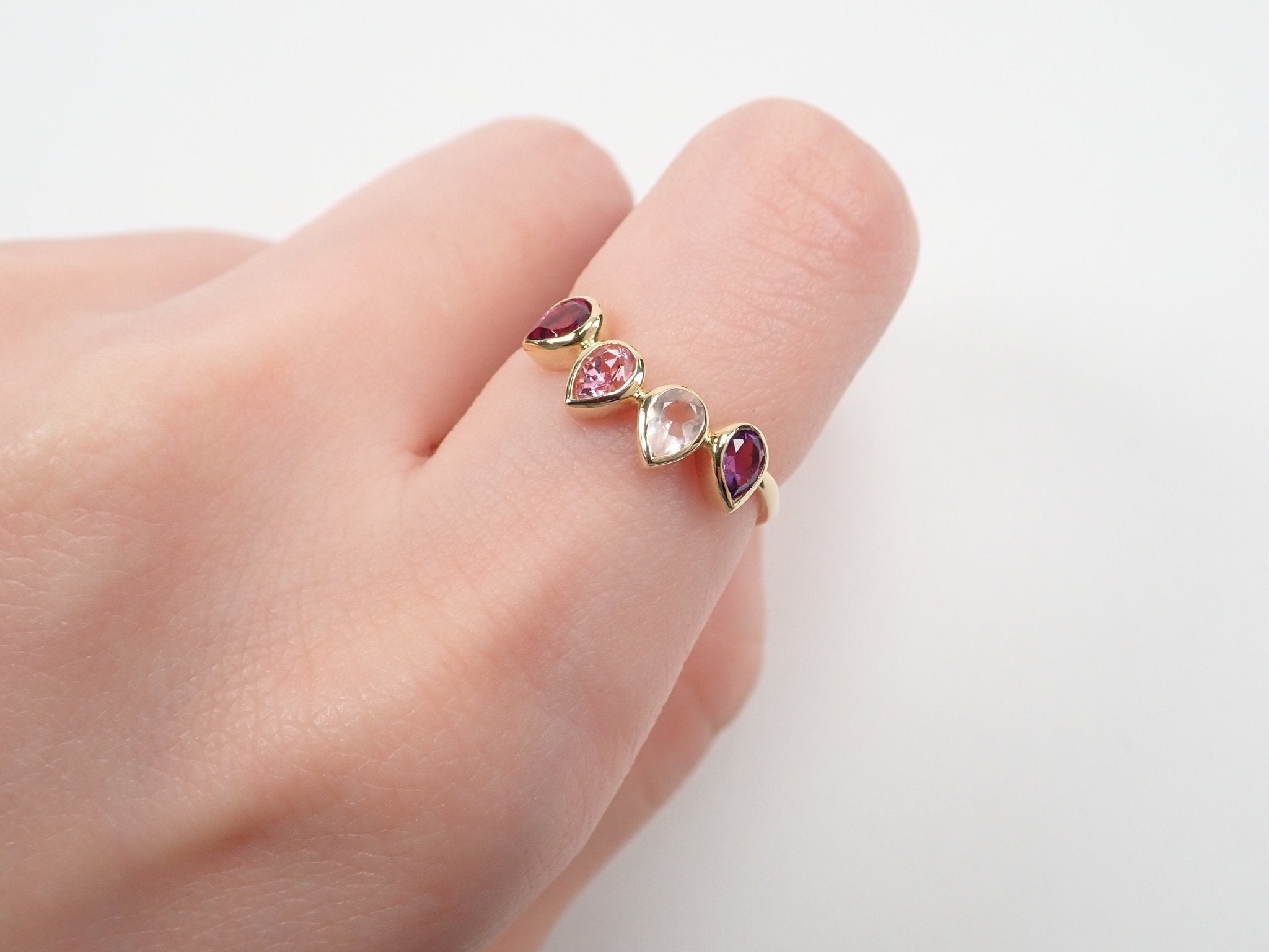 設計奢華的戒指,整個手指周圍鑲嵌著粉紅色寶石。水滴形的珠寶既美麗又可愛,每次戴在手指上都會讓人感覺很舒服。這四種寶石分別是紅榴石、粉紅碧璽、薔薇石英和紫水晶。