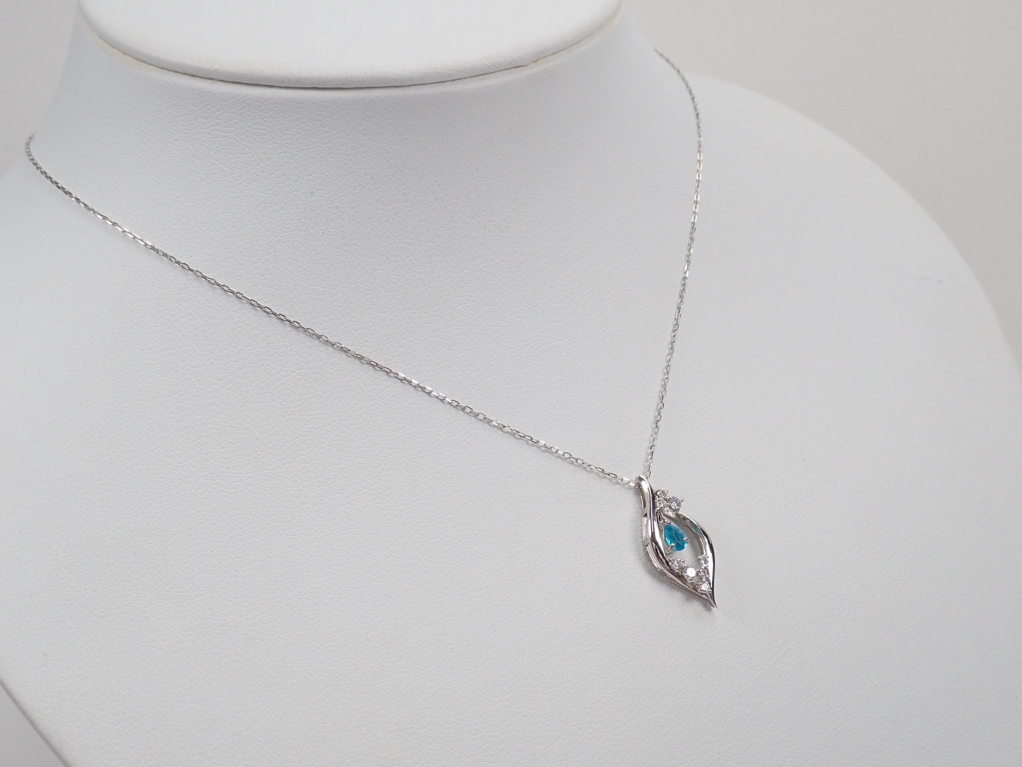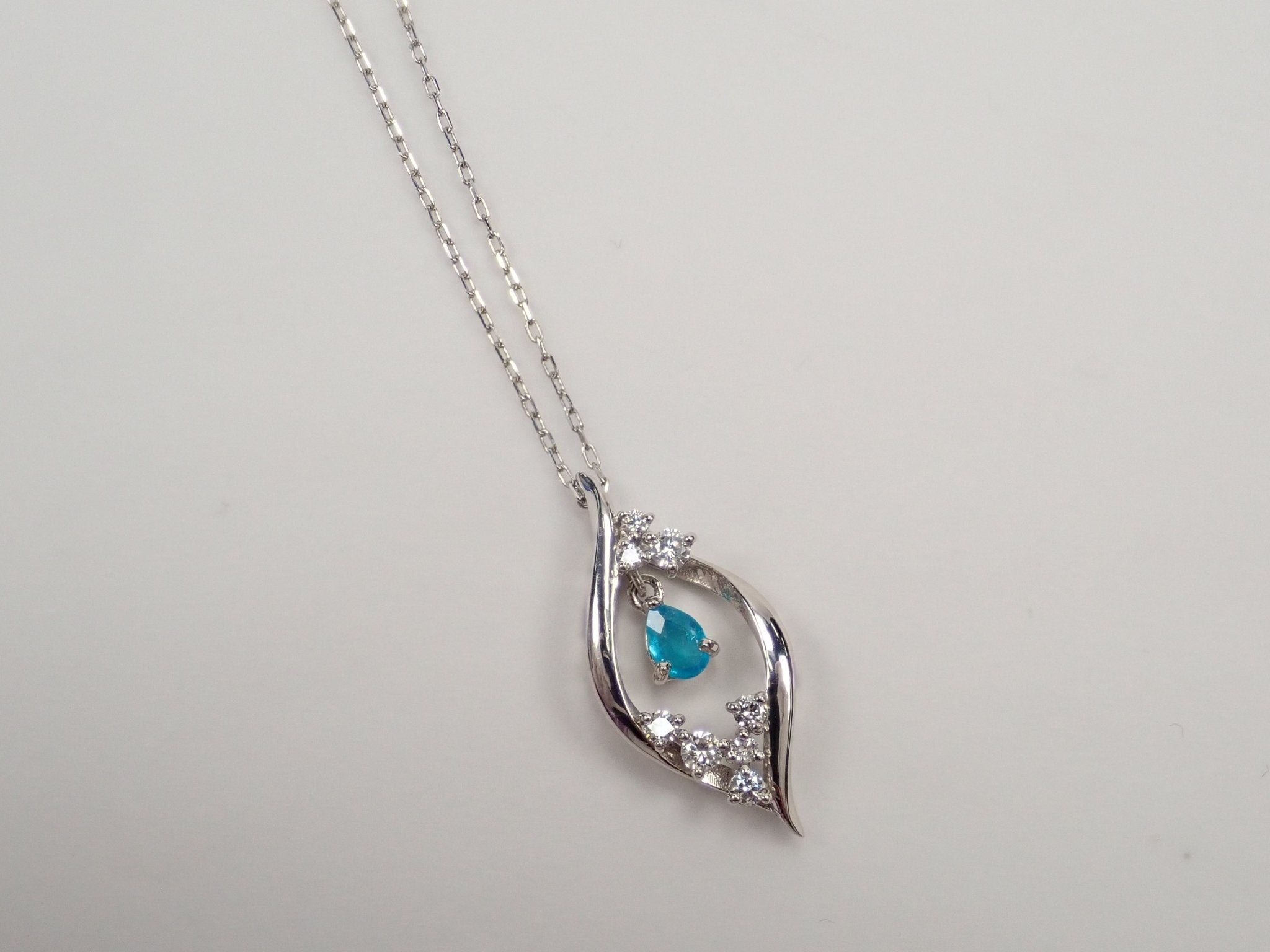 來自巴西的帕拉伊巴碧璽具有迷人的藍色,讓人想起熱帶海洋。白金框架和鑽石閃耀著白色光芒,就像從白濱看到的美麗海洋一樣!這條項鍊散發著優雅和清新的氣息。