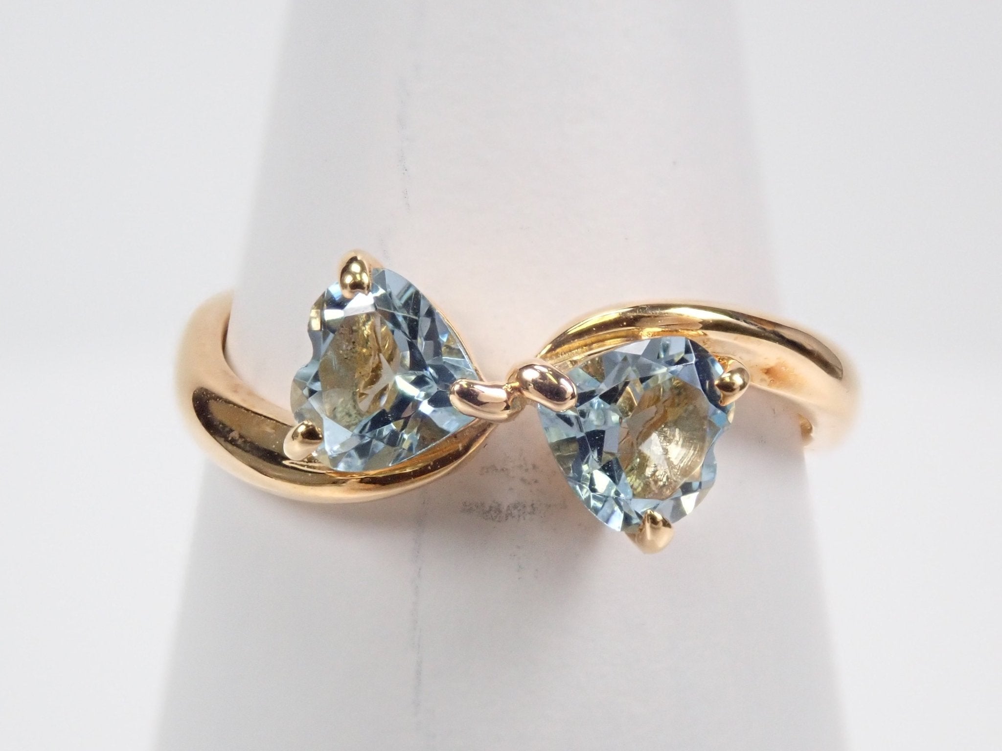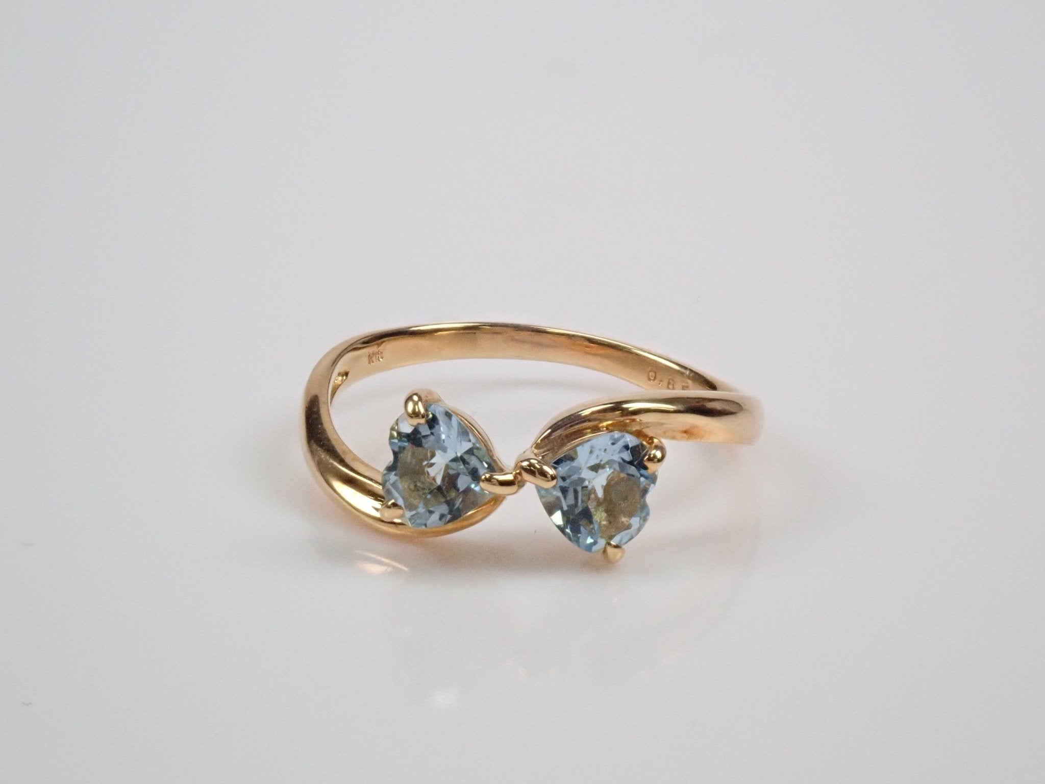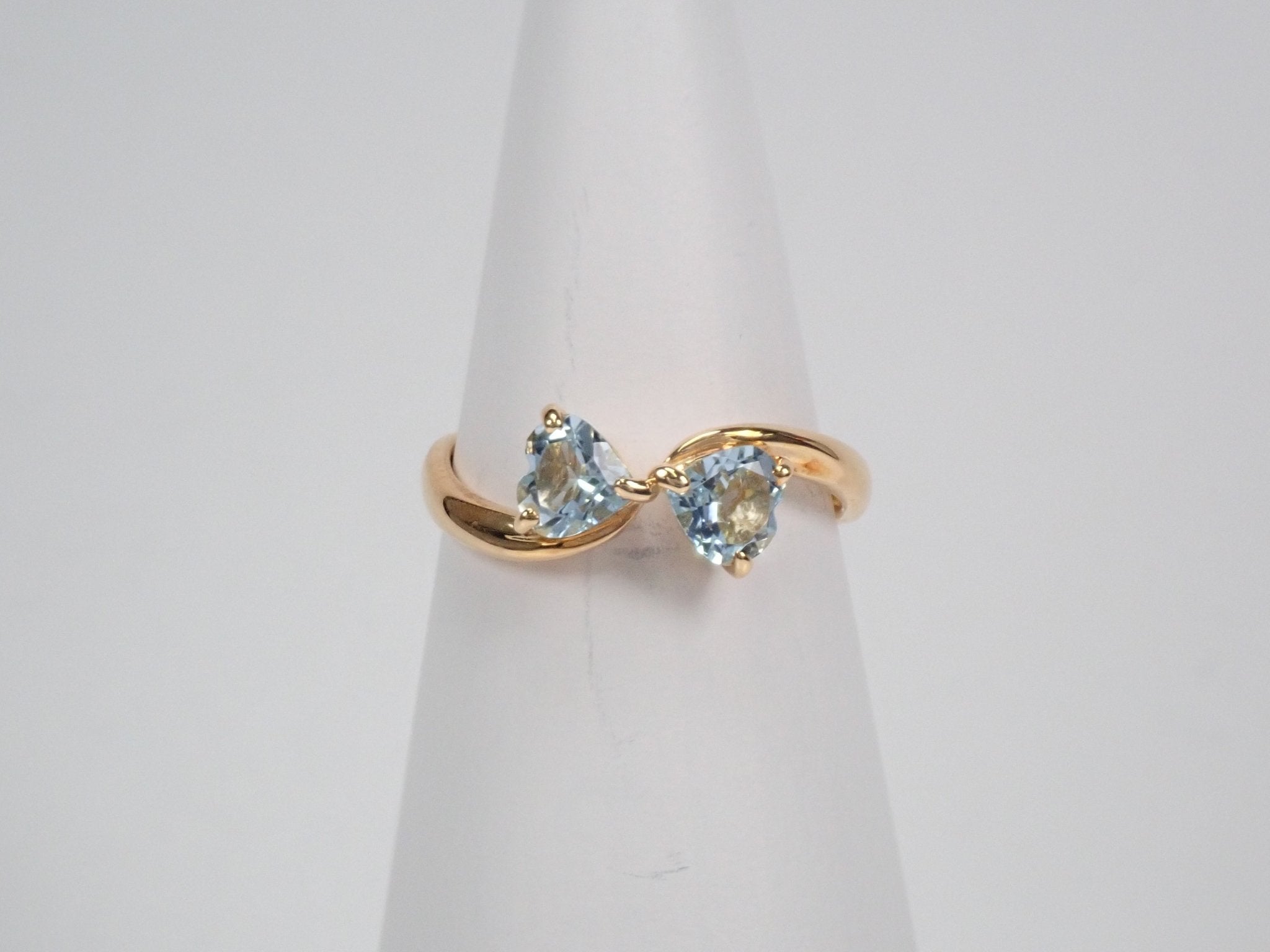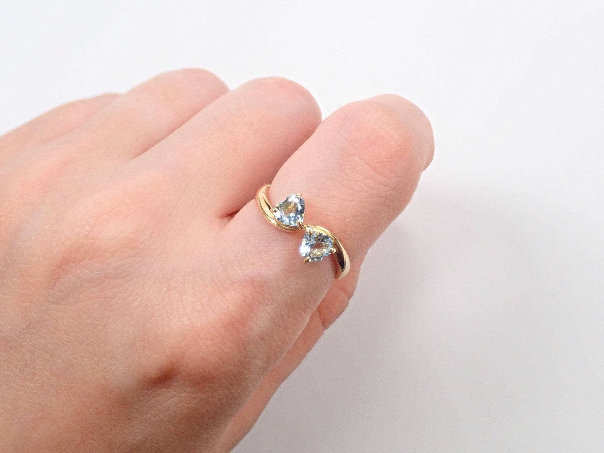 海藍寶石呈現冷淡藍色,類似蘇打水。仔細一看,S曲線臂上的兩顆寶石是心型的!俏皮的設計和心形的珠寶,光是看著就讓人心動。