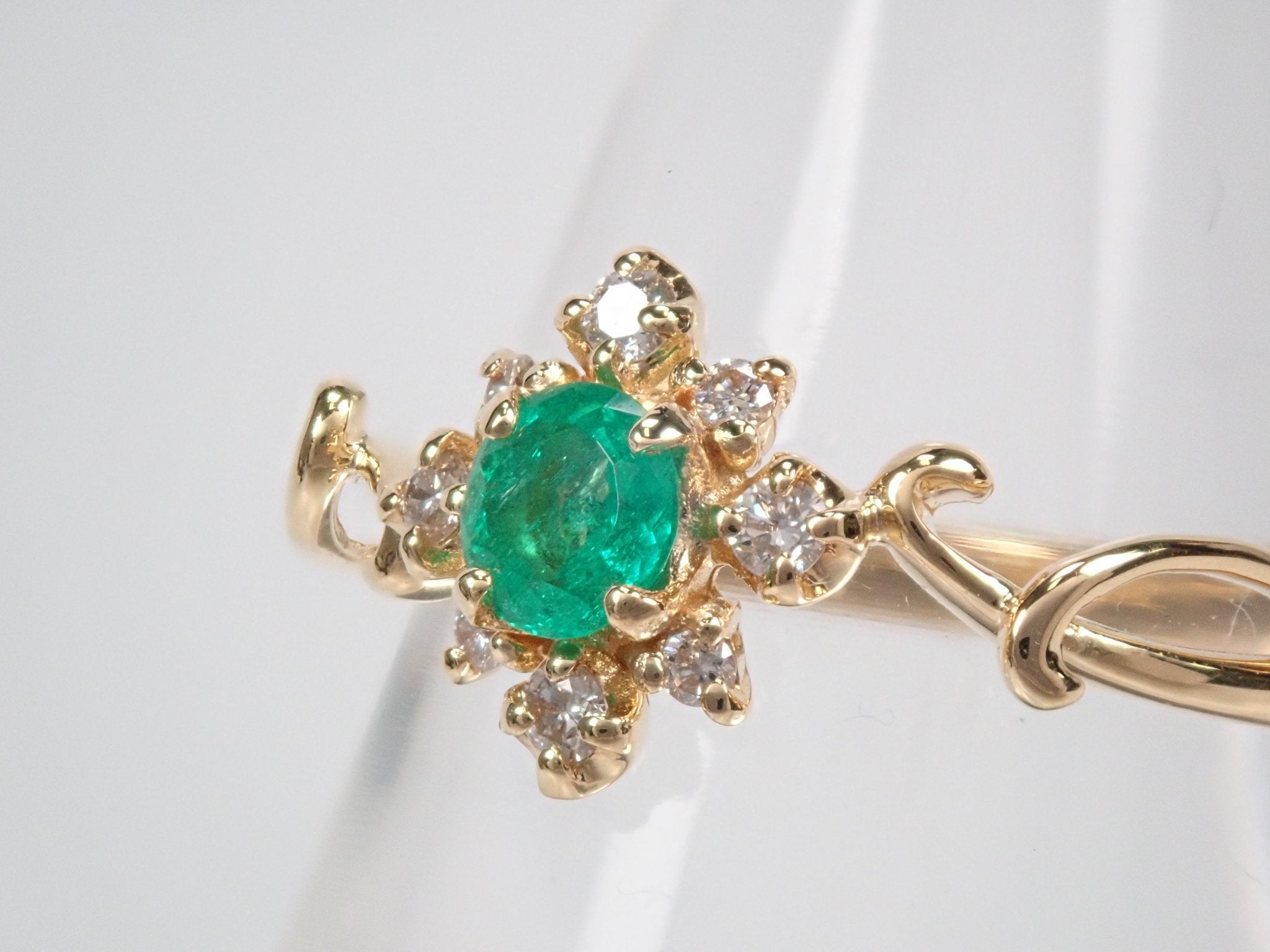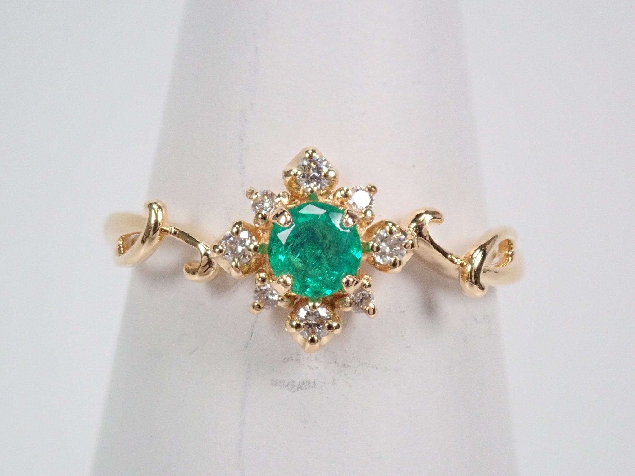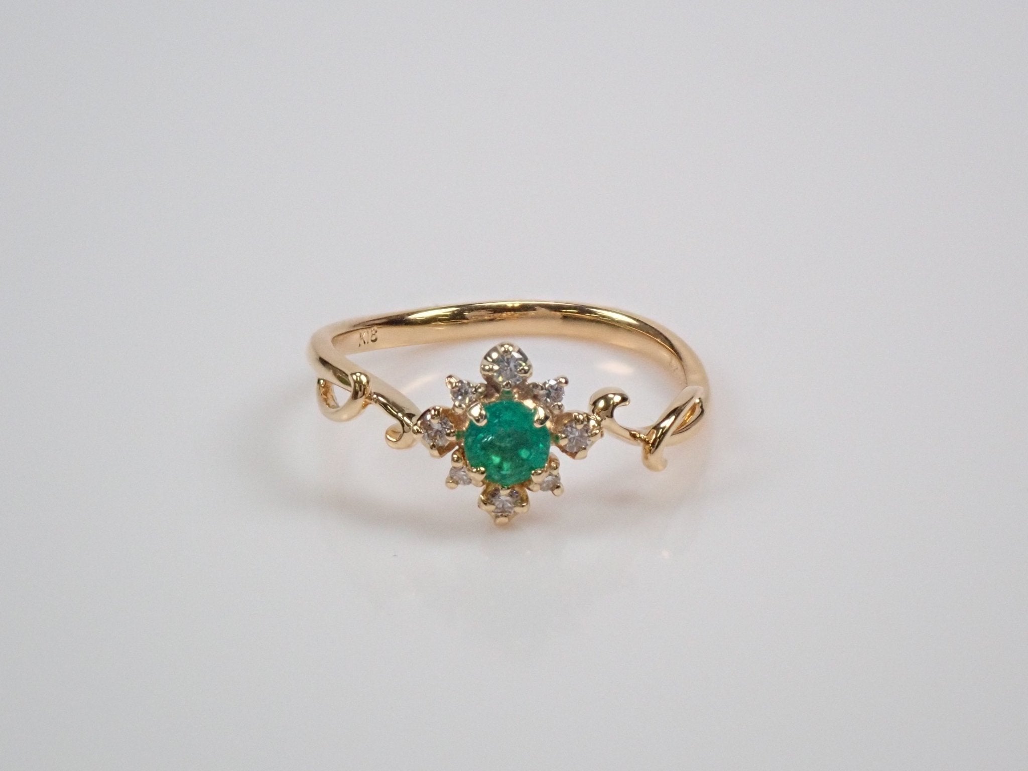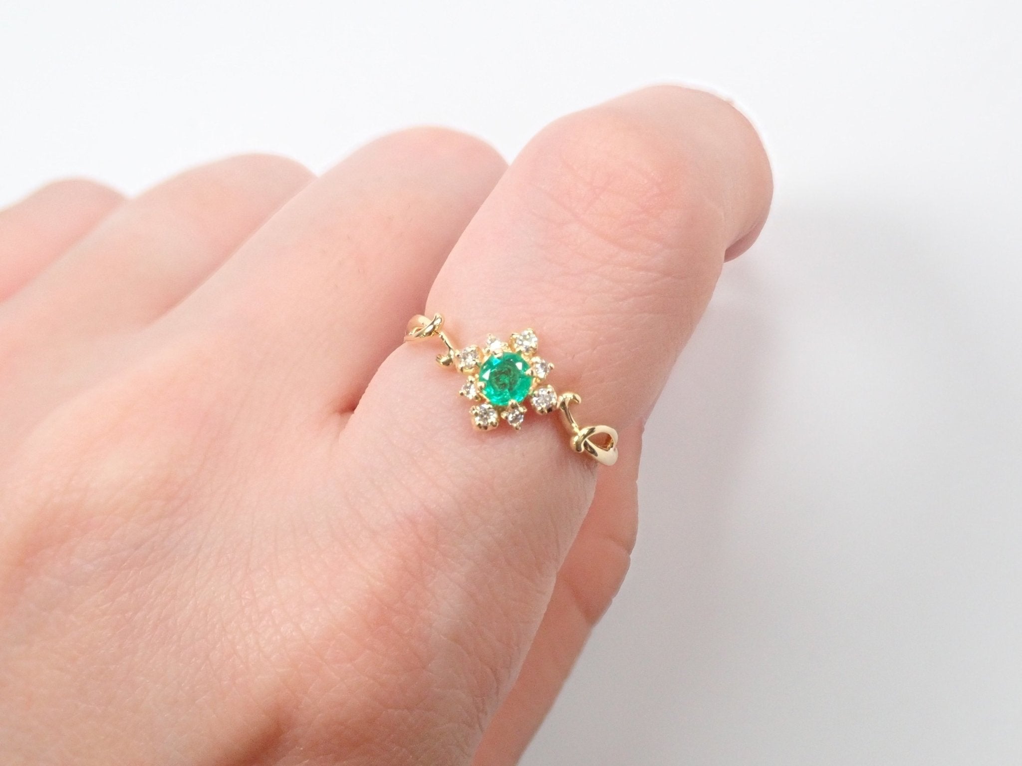 祖母綠具有令人印象深刻的深綠色,神秘得無法用言語來形容。鑽石增添了一絲魅力,手臂上的蔓藤花紋圖案給人溫柔精緻的印象。俏皮的設計不僅適用於正式場合,也適用於休閒場合。