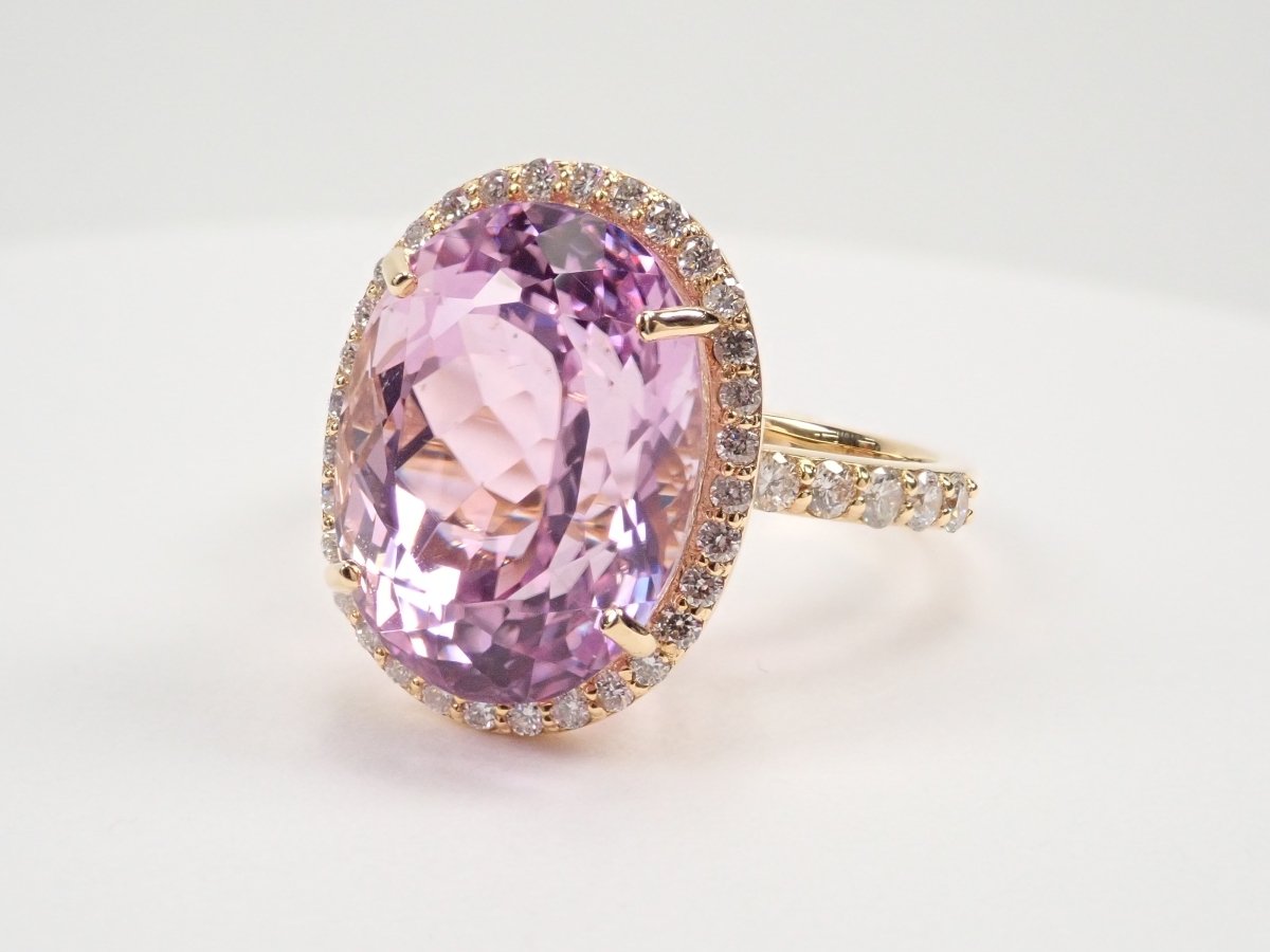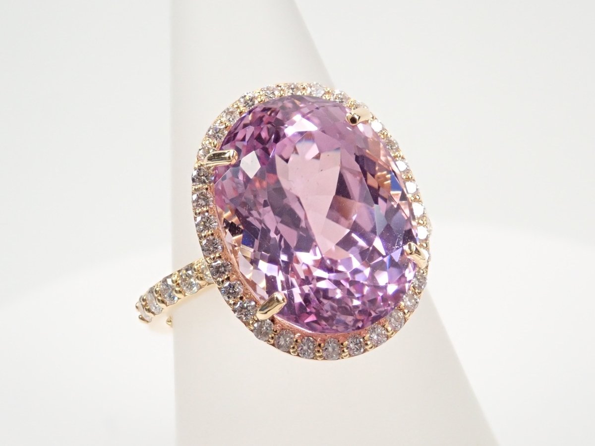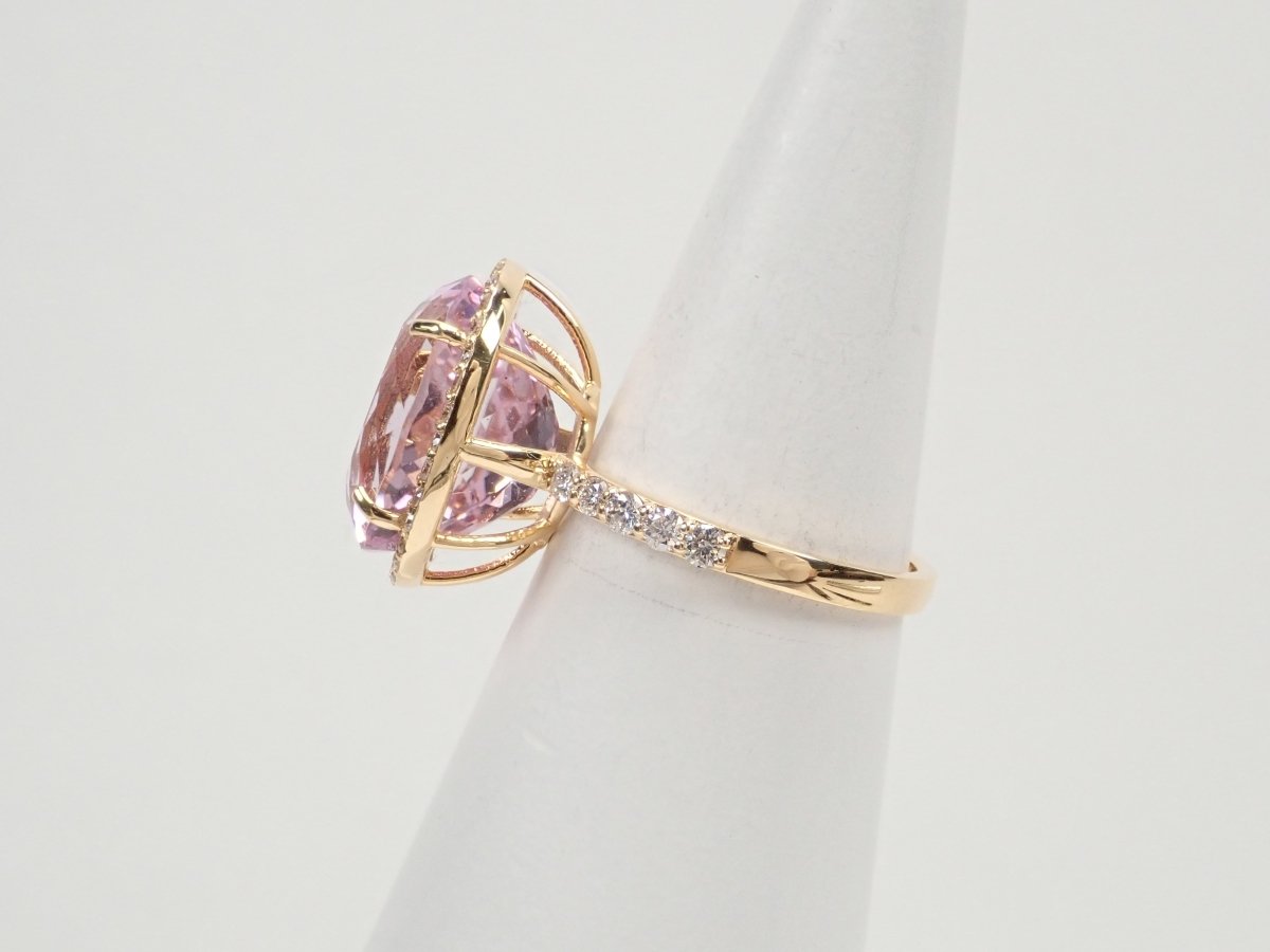 鋰紫玉具有透明的透明度和光澤的光澤,非常美麗。鑽石被精緻地包圍,閃閃發光,凸顯紫鋰輝石的淡粉色。其柔和的粉紅色,讓人看到時似乎有一種溫柔的感覺。