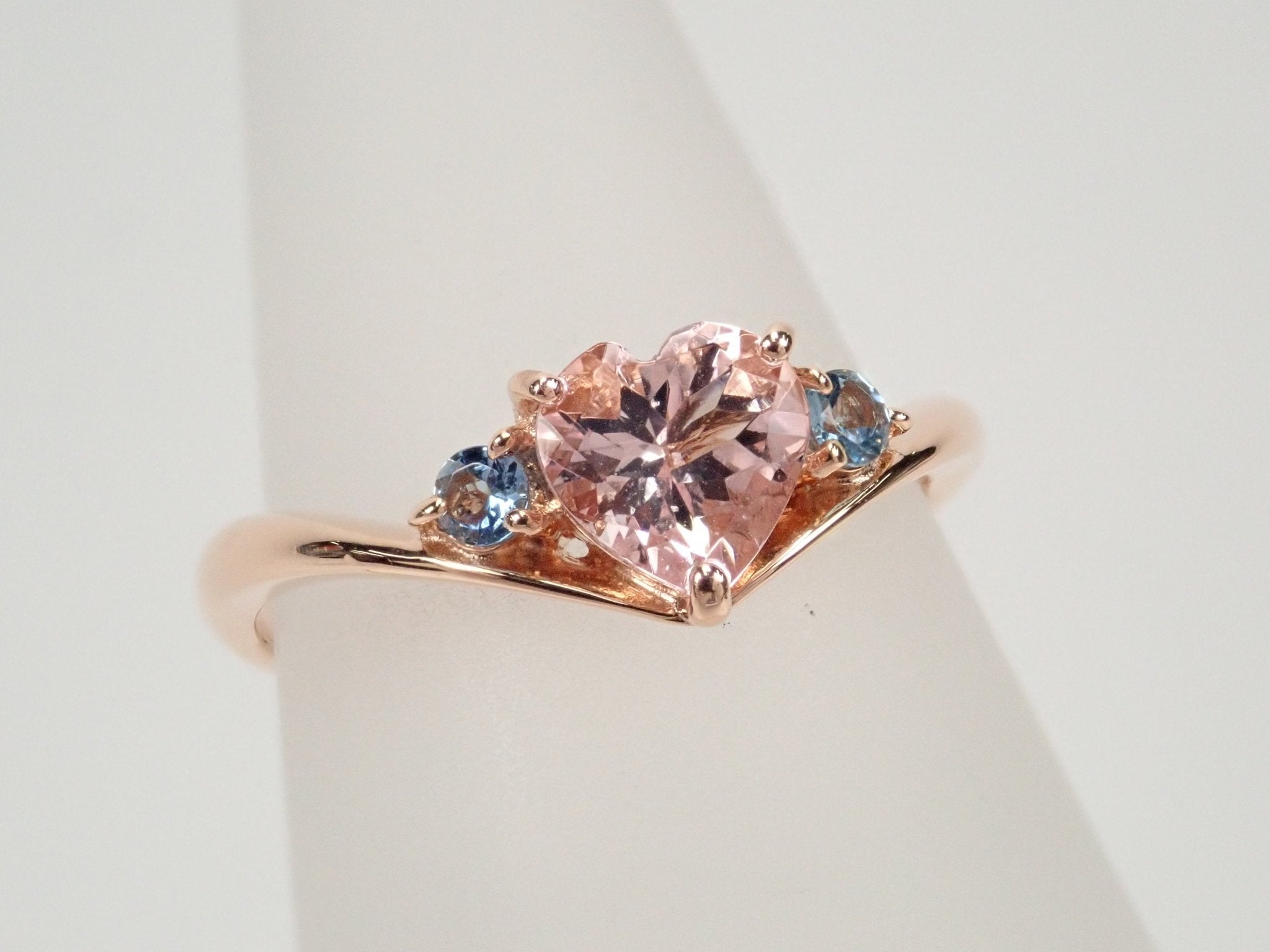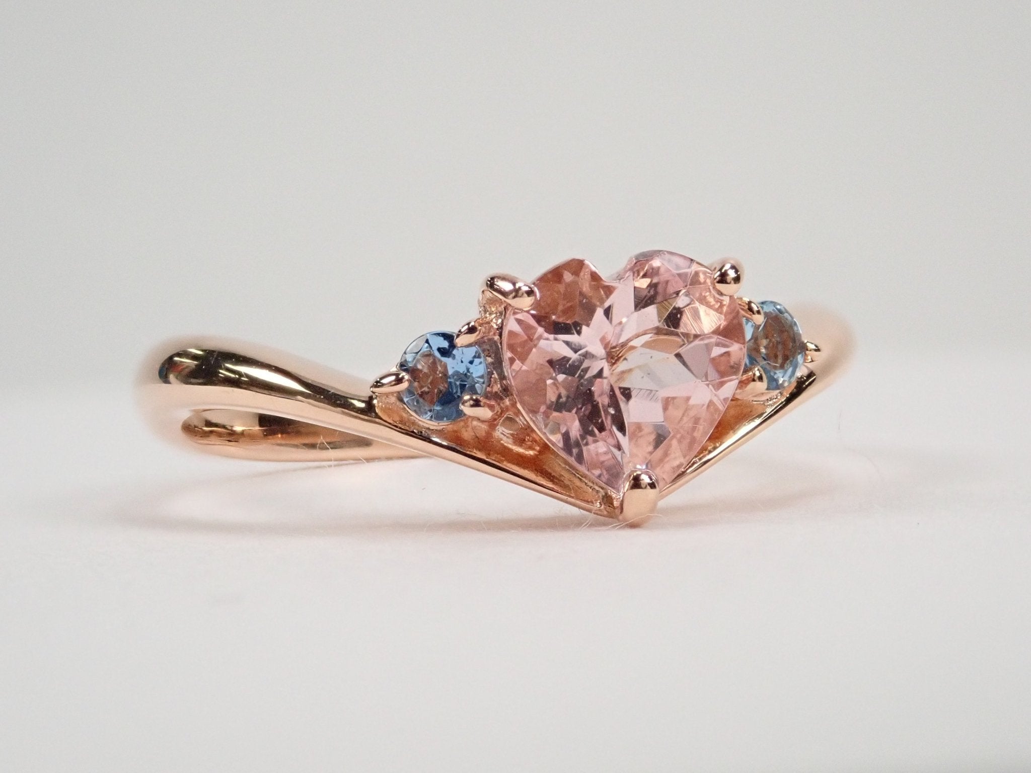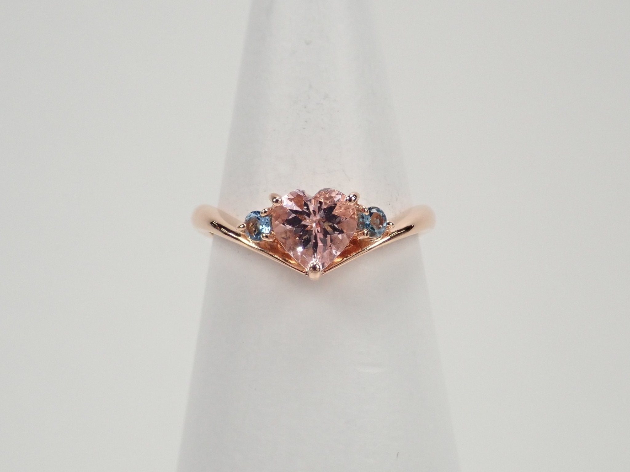 摩根石具有迷人的光芒和光澤。兩面均塗上海藍寶石,凸顯摩根石的粉紅色。可愛的顏色讓戴在手指上時感覺平靜又溫柔。
