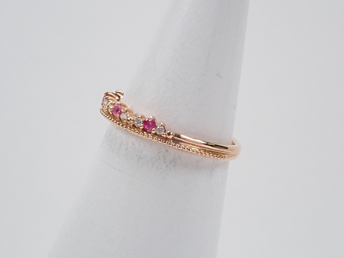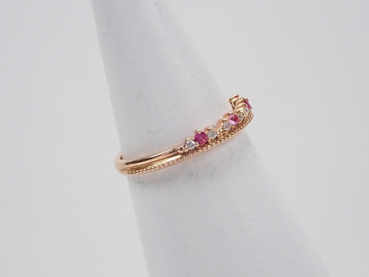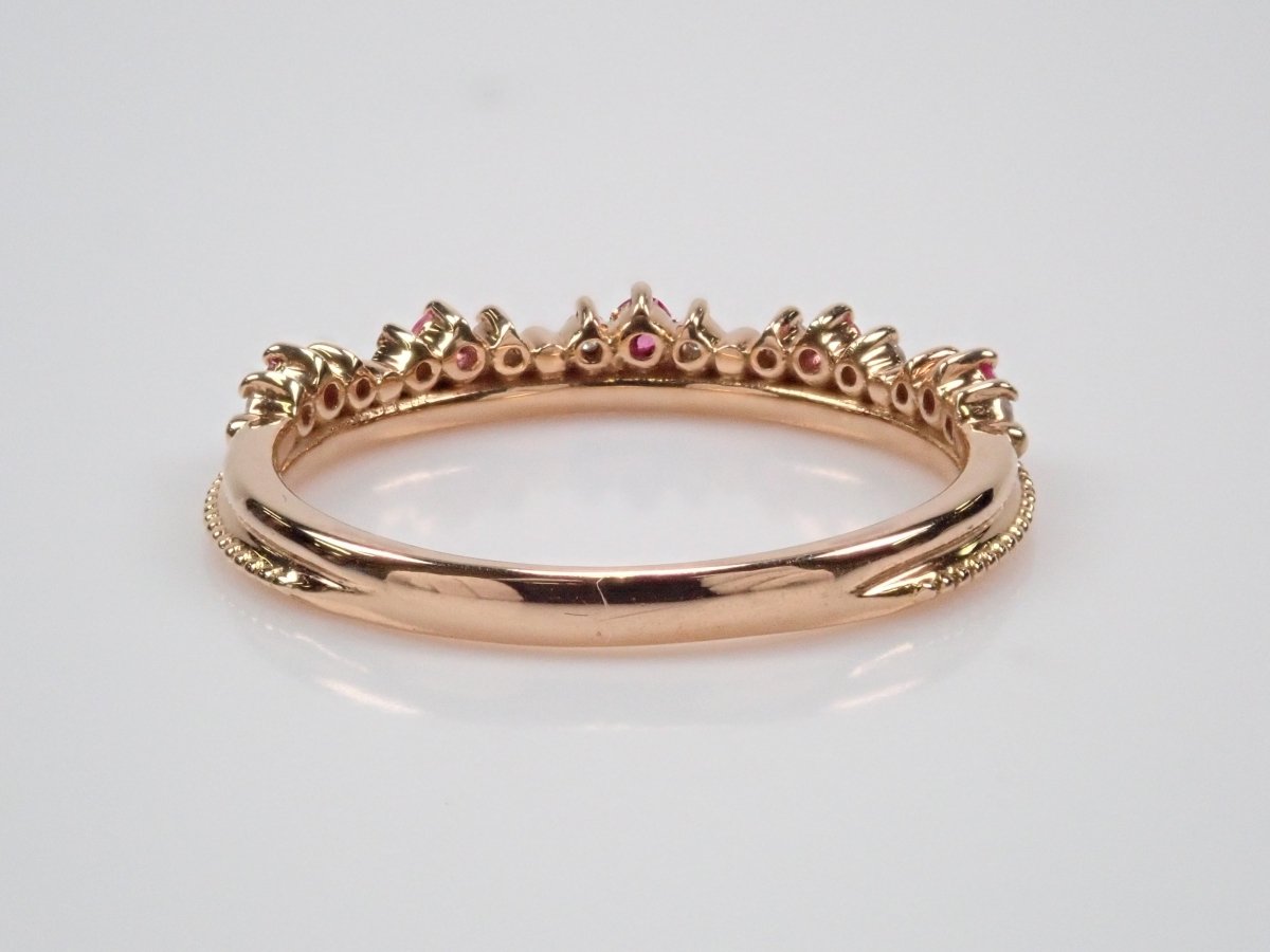 紅寶石以其熱情的紅色吸引著我們。它一排鑲嵌著粉紅色藍寶石和鑽石,顏色漸變美麗。鋸狀設計可支撐珠寶,使其看起來像真正的王冠。